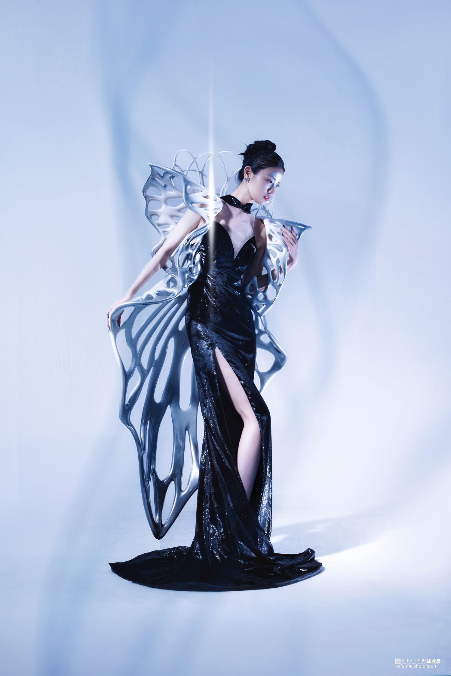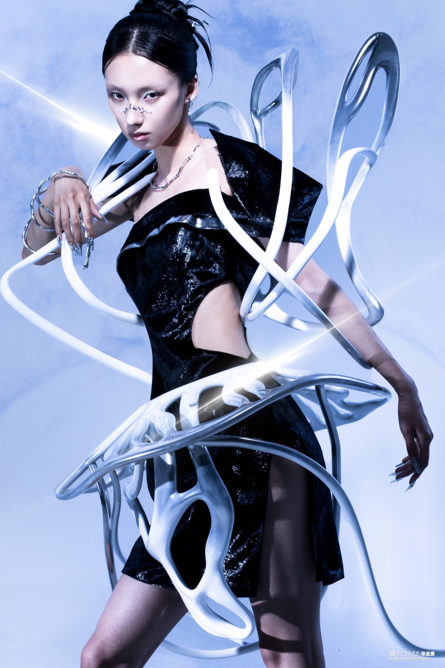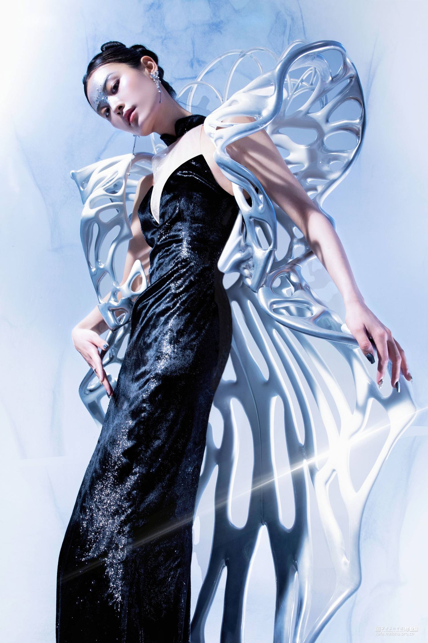 未来回响(“TOMORROW”)系列创意女装以旗袍作为廓形基础,保留剪裁、领型等个性鲜明的中国风要素特征,借助3D打印新型科技,以解构重组的设计手法表现“赛博朋克”风格。黑与银的色彩碰撞展现传统文化深沉厚重与未来世界神秘未知的碰撞。核心思想在于强调科技作为现代化技术手段,需利用其优势对传统文化进行保护与发扬,体现技术研究的意义与价值。