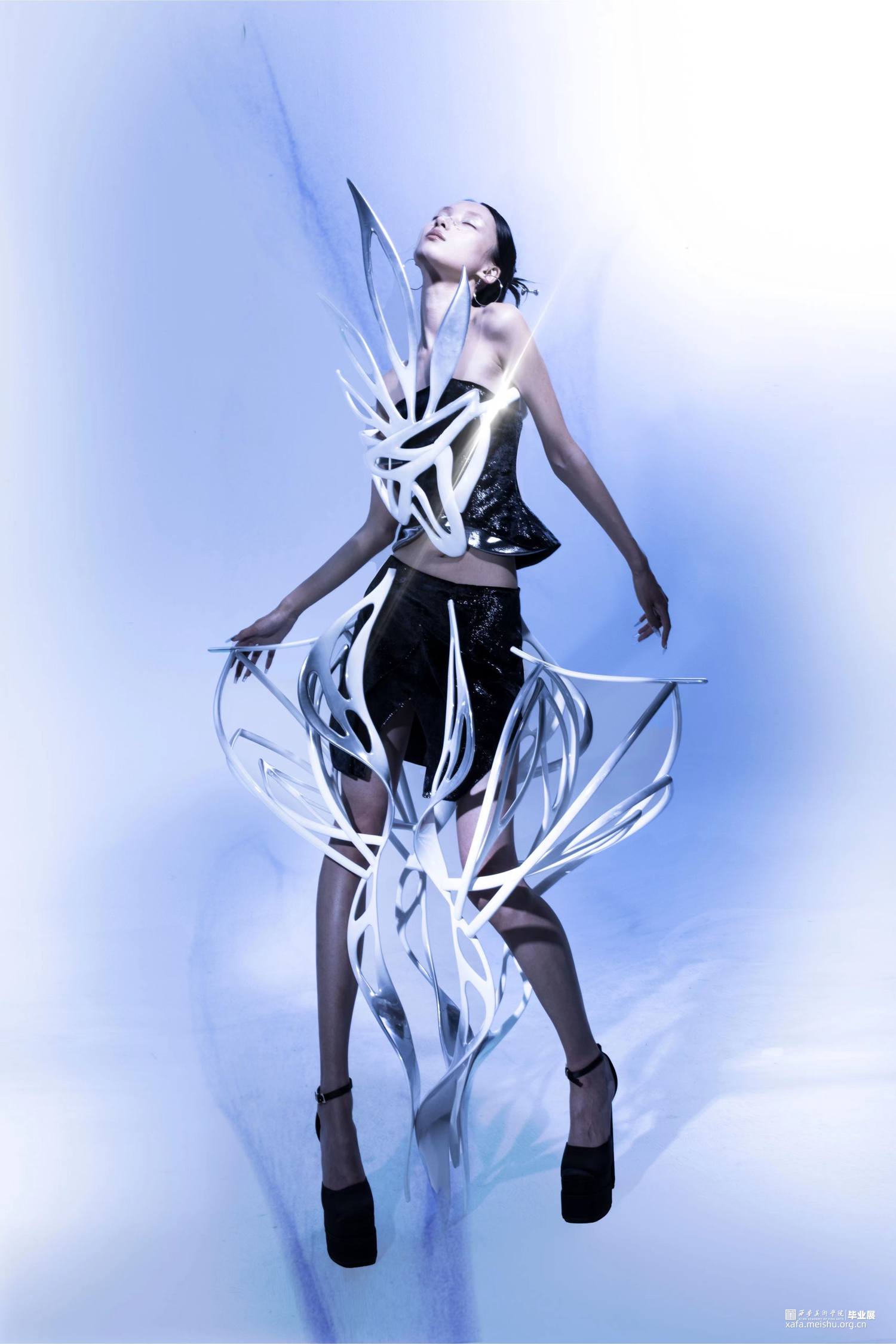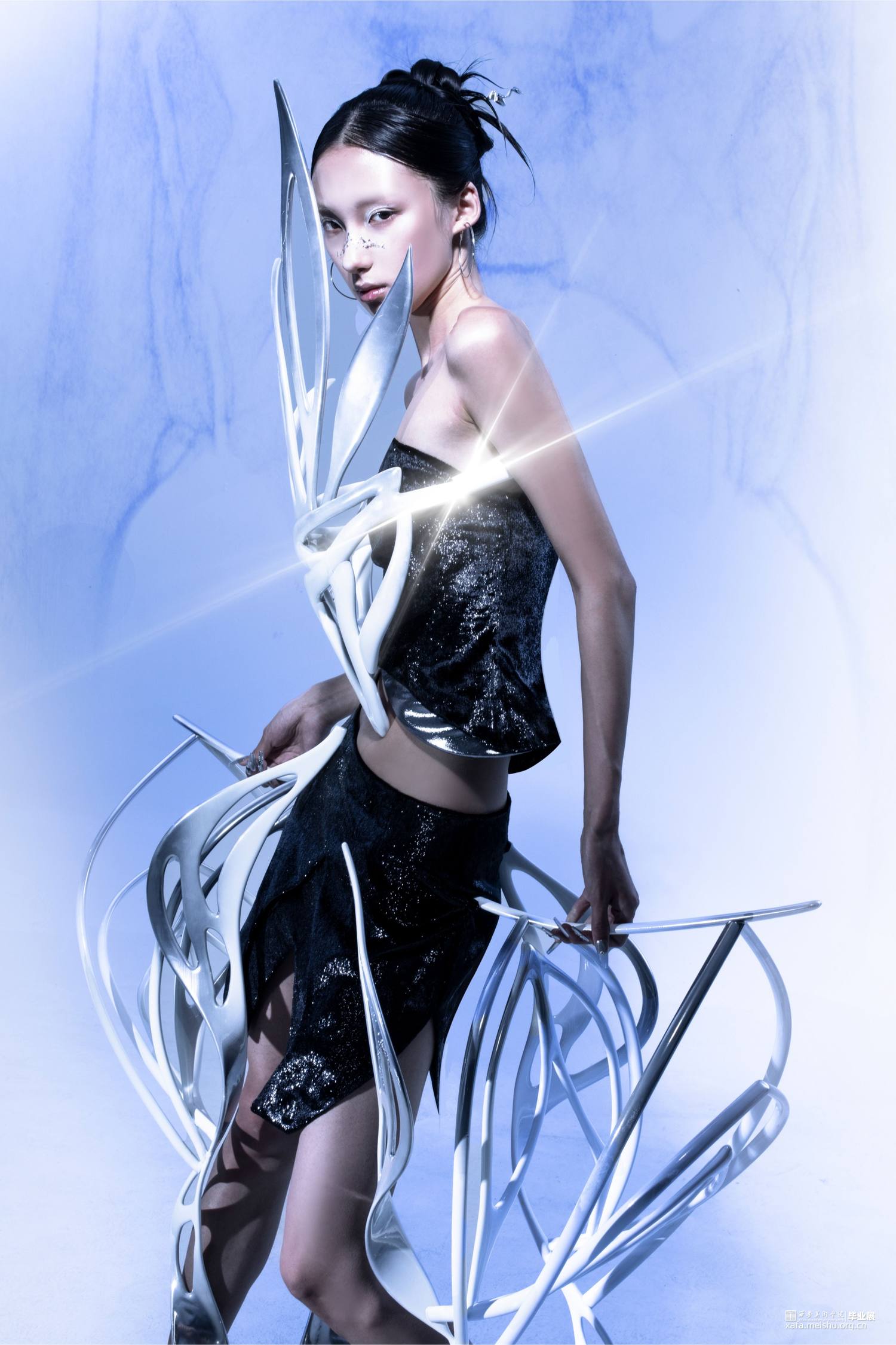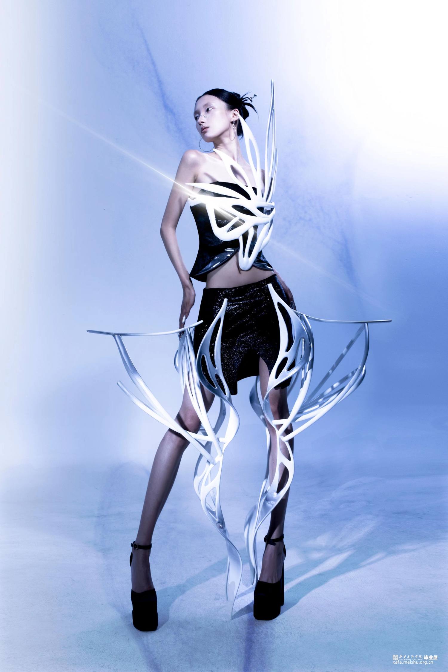 未来回响(“TOMORROW”)系列创意女装以旗袍作为廓形基础,保留剪裁、领型等个性鲜明的中国风要素特征,借助3D打印新型科技,以解构重组的设计手法表现“赛博朋克”风格。黑与银的色彩碰撞展现传统文化深沉厚重与未来世界神秘未知的碰撞。核心思想在于强调科技作为现代化技术手段,需利用其优势对传统文化进行保护与发扬,体现技术研究的意义与价值。