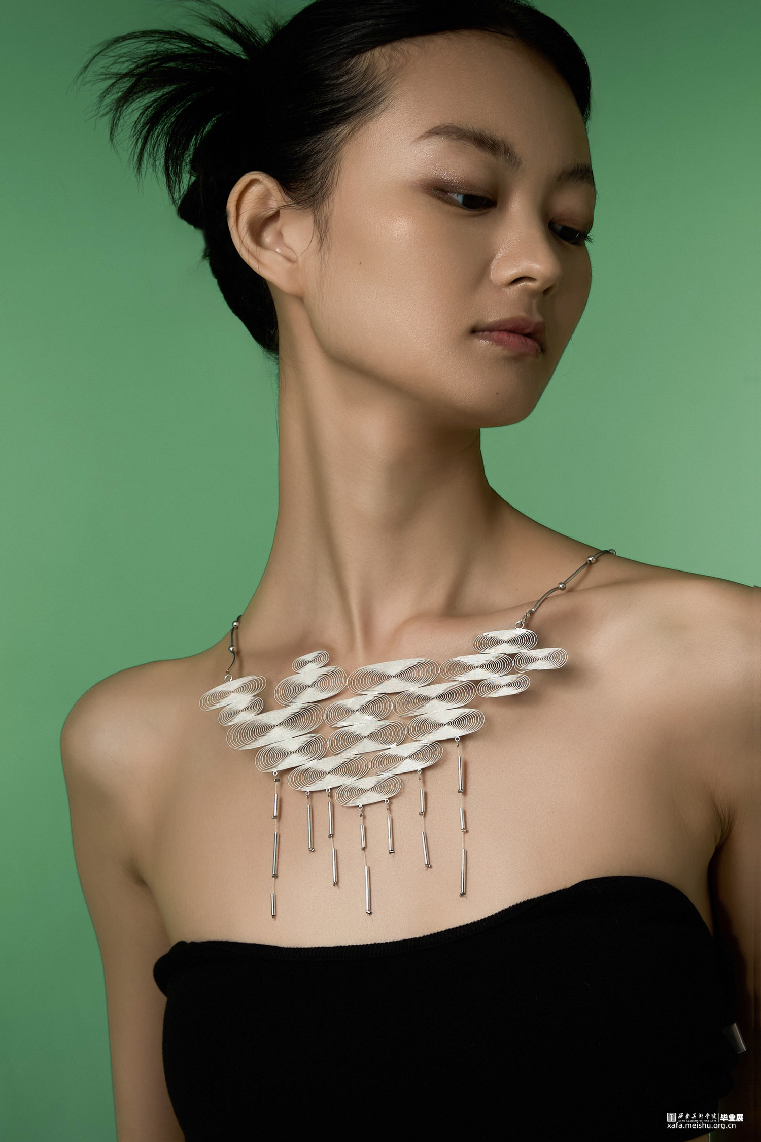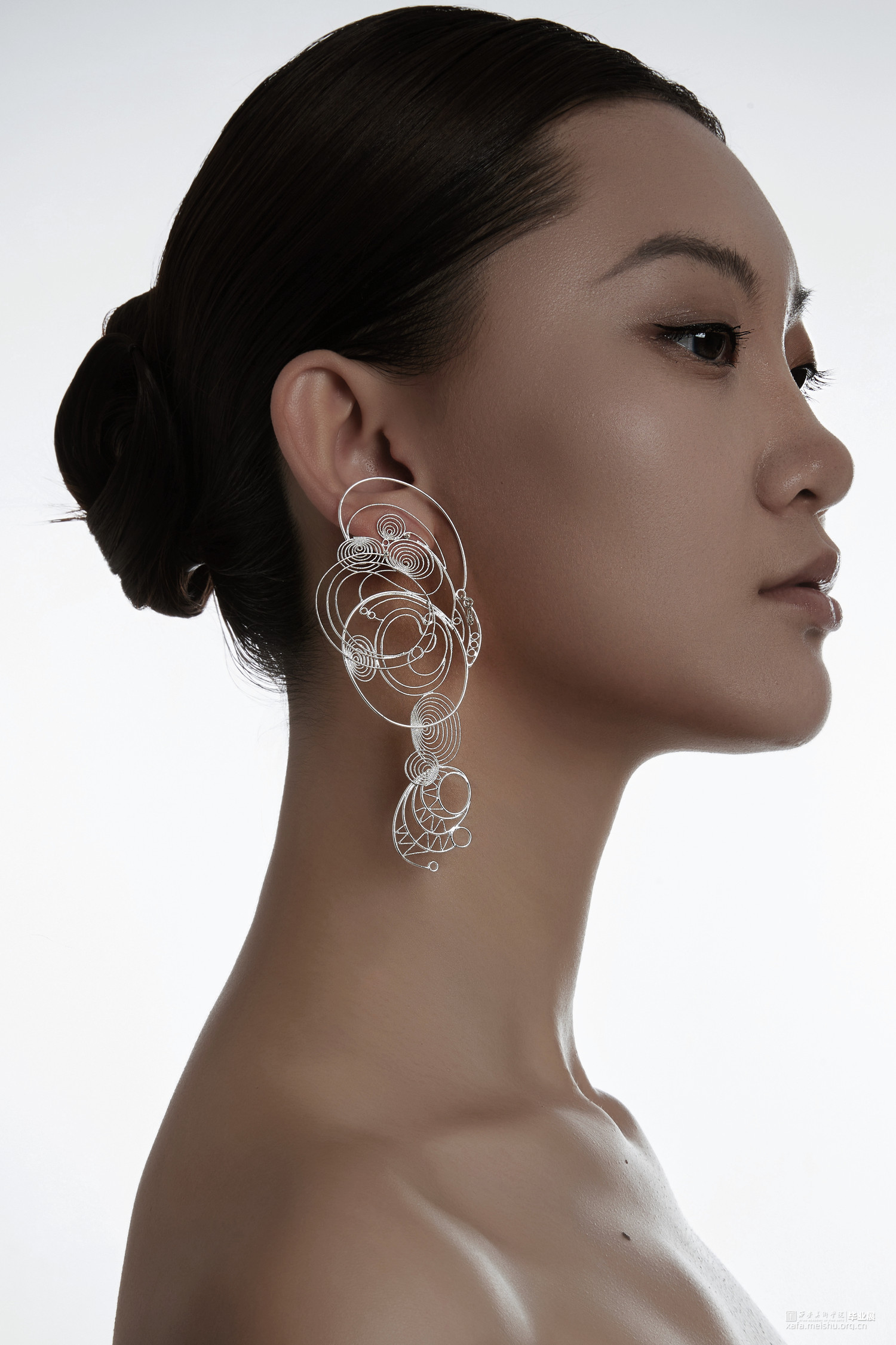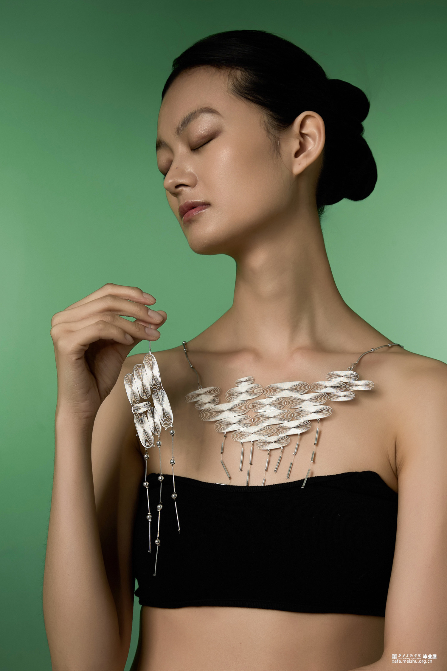 一圈圈银丝像在雨里泛起的波波涟漪,涟漪的褶皱,微风吹起的褶皱。在层次与渐进里,感知线条的节奏。作品灵感来源于涟漪,将雨落在水里产生的细微独特的波纹融入到首饰设计中。运用花丝工艺将圈圈涟漪展现出来,生出千丝万缕的联系。