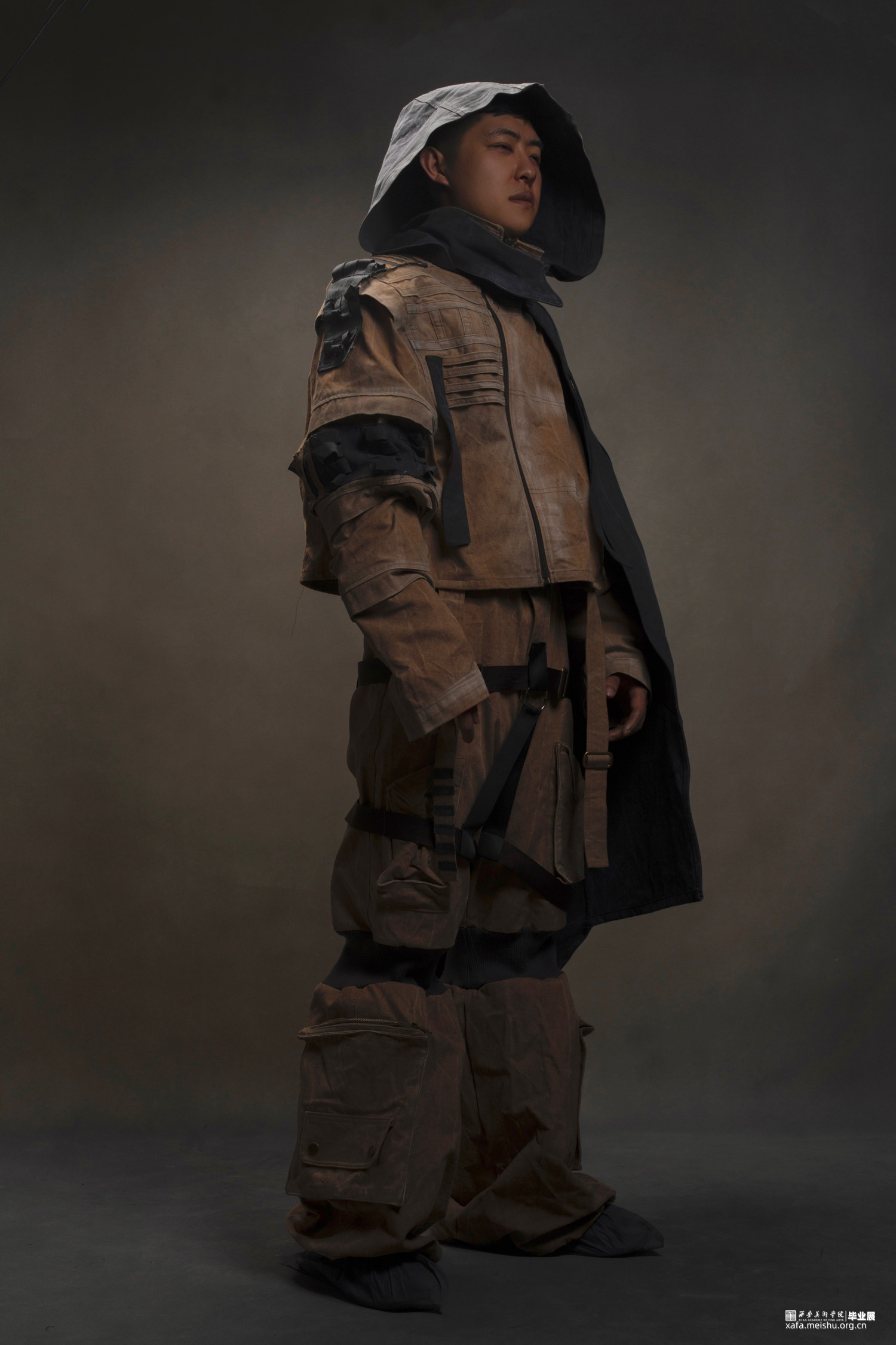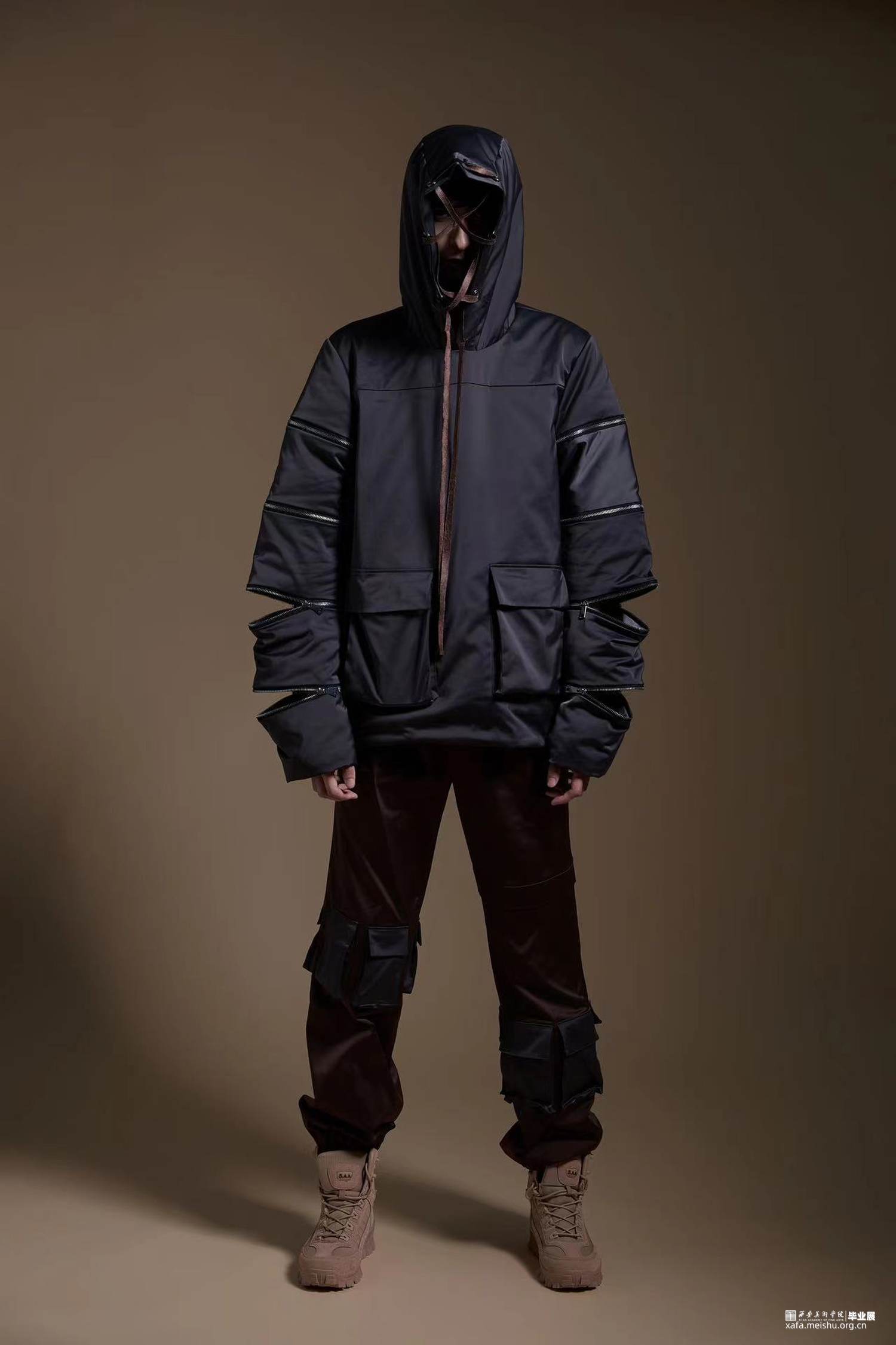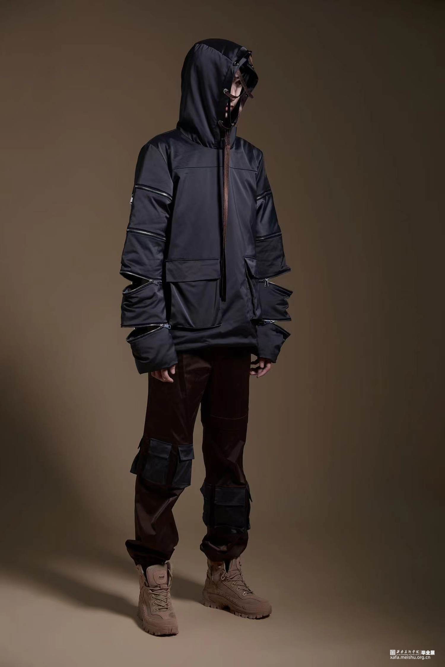 在毕业创作的过程中,本人围绕对羽绒面料的改造,融入机能风,让服装在末日条件下有更多的作用,运用聚酯纤维和做旧牛仔的拼接,大廓形和宽大的风格,多个拉链组合和口袋的多样变型,机能的装置来表达服装的创新设计,通过作品传达出末日生存下人们的服装结构与材质的变化。