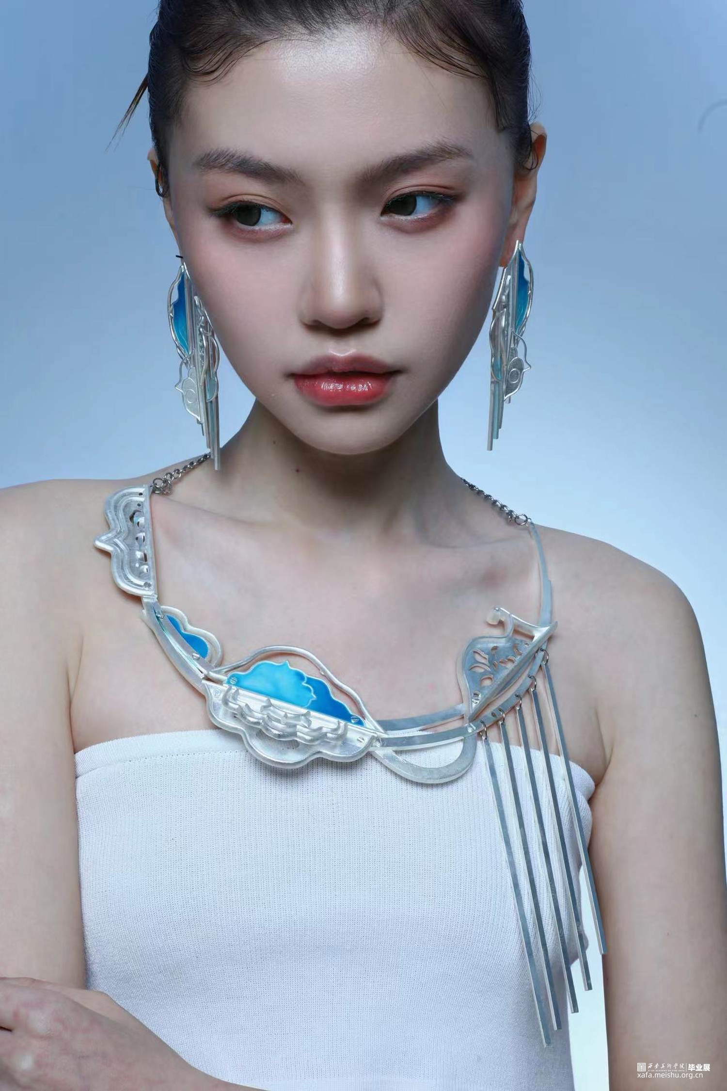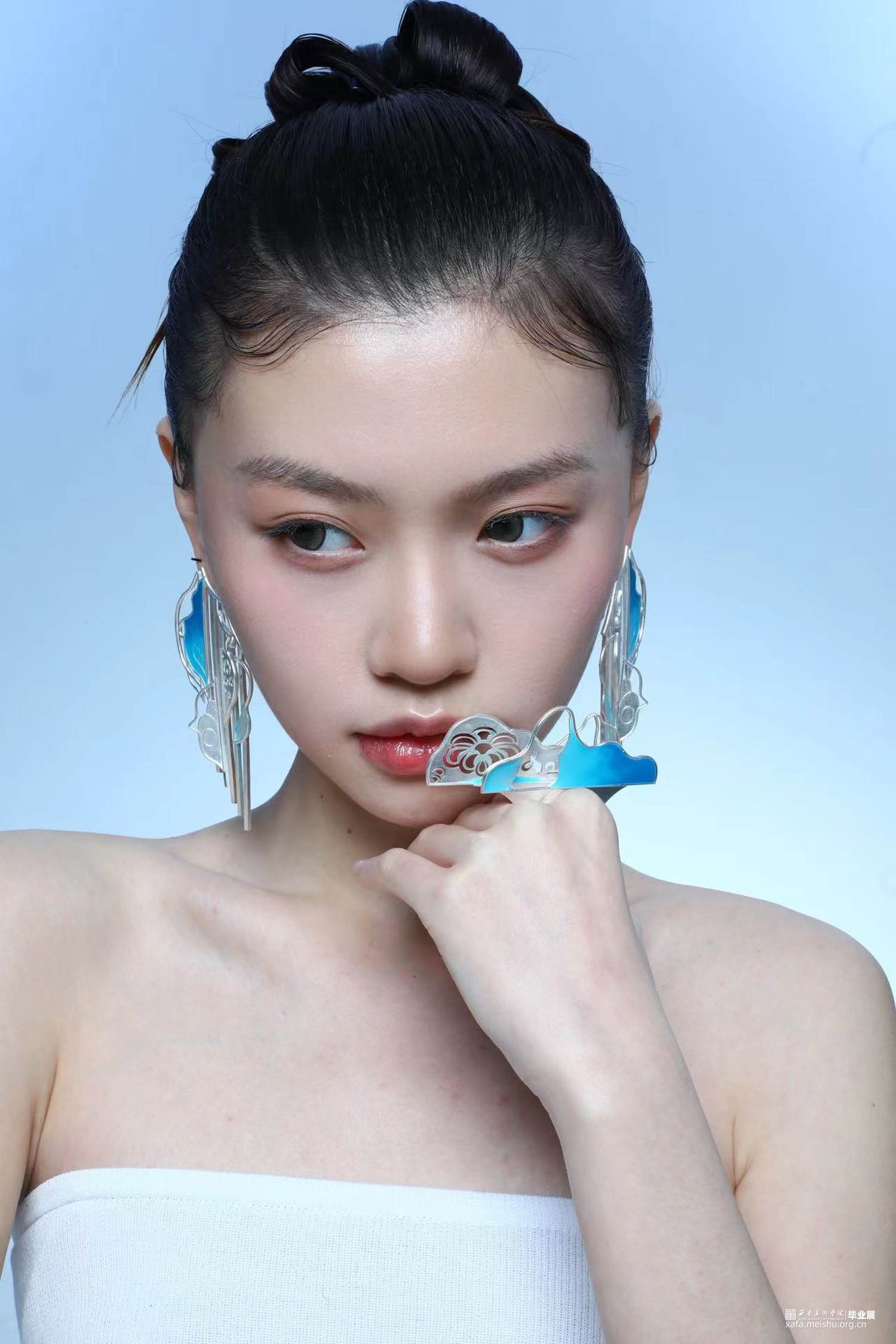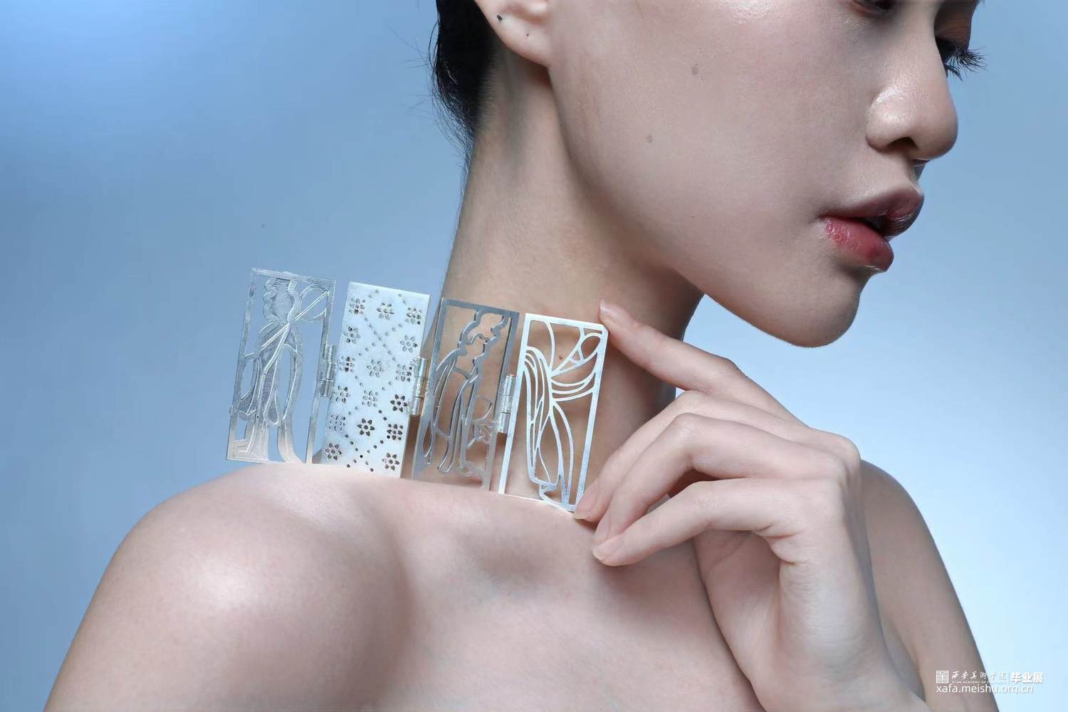 作者作品以唐代女性服饰为灵感来源,共八件作品,分为两个系列。第一系列主要运用了服饰的廓形以及图案花纹设计。着重体现了唐代女性服饰的设计感以及工艺的先进性。如镂空,錾刻工艺。第二系列主要体现了在经济文化高度繁荣的唐代下女性的审美特征,如服色彩图案的愈见丰富,对于饰品搭配的重视,以及倾向于欣赏丰满的体态。