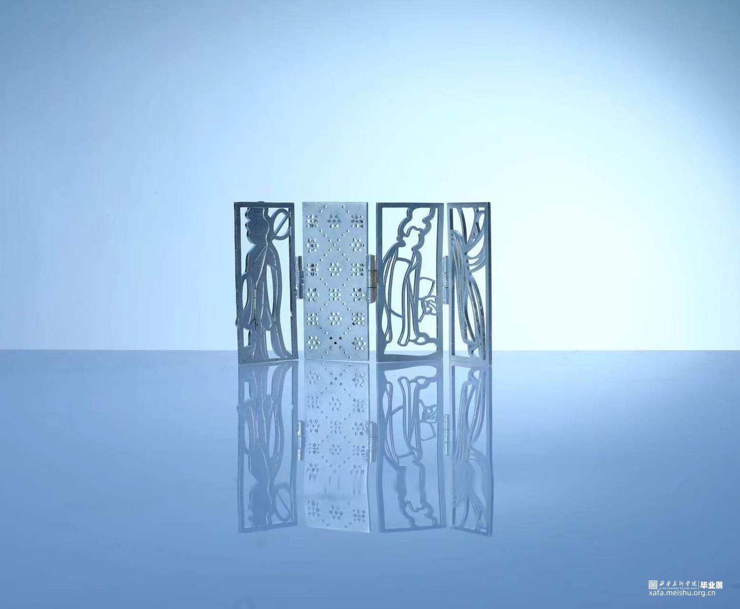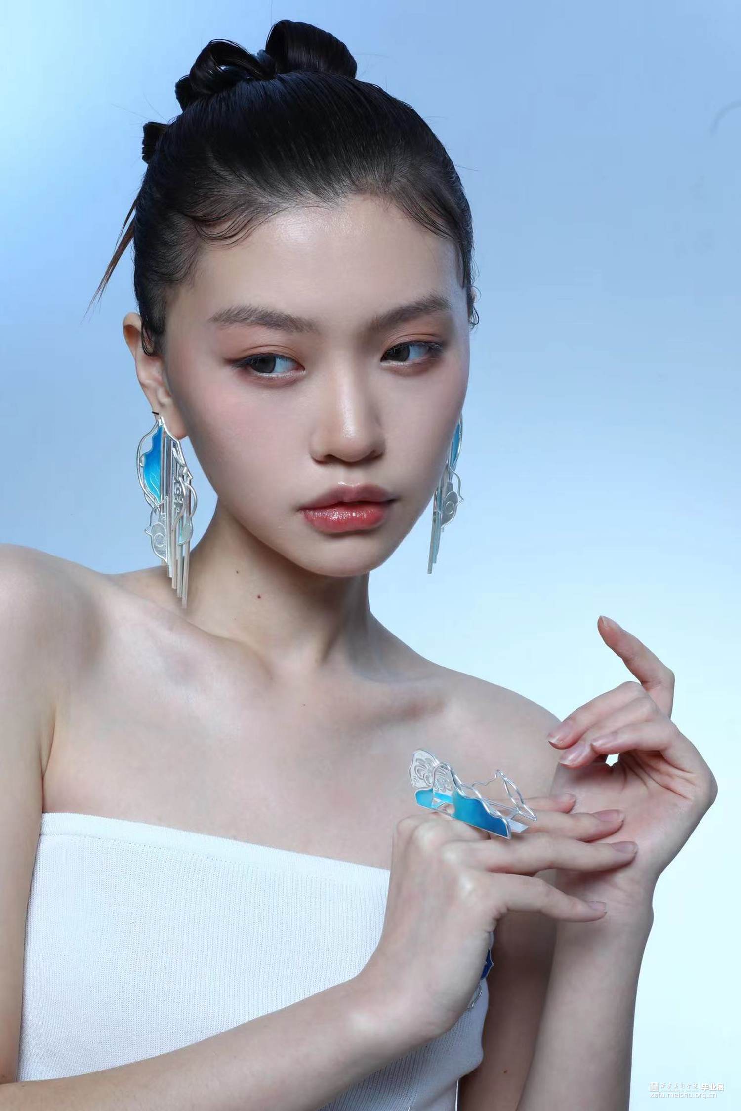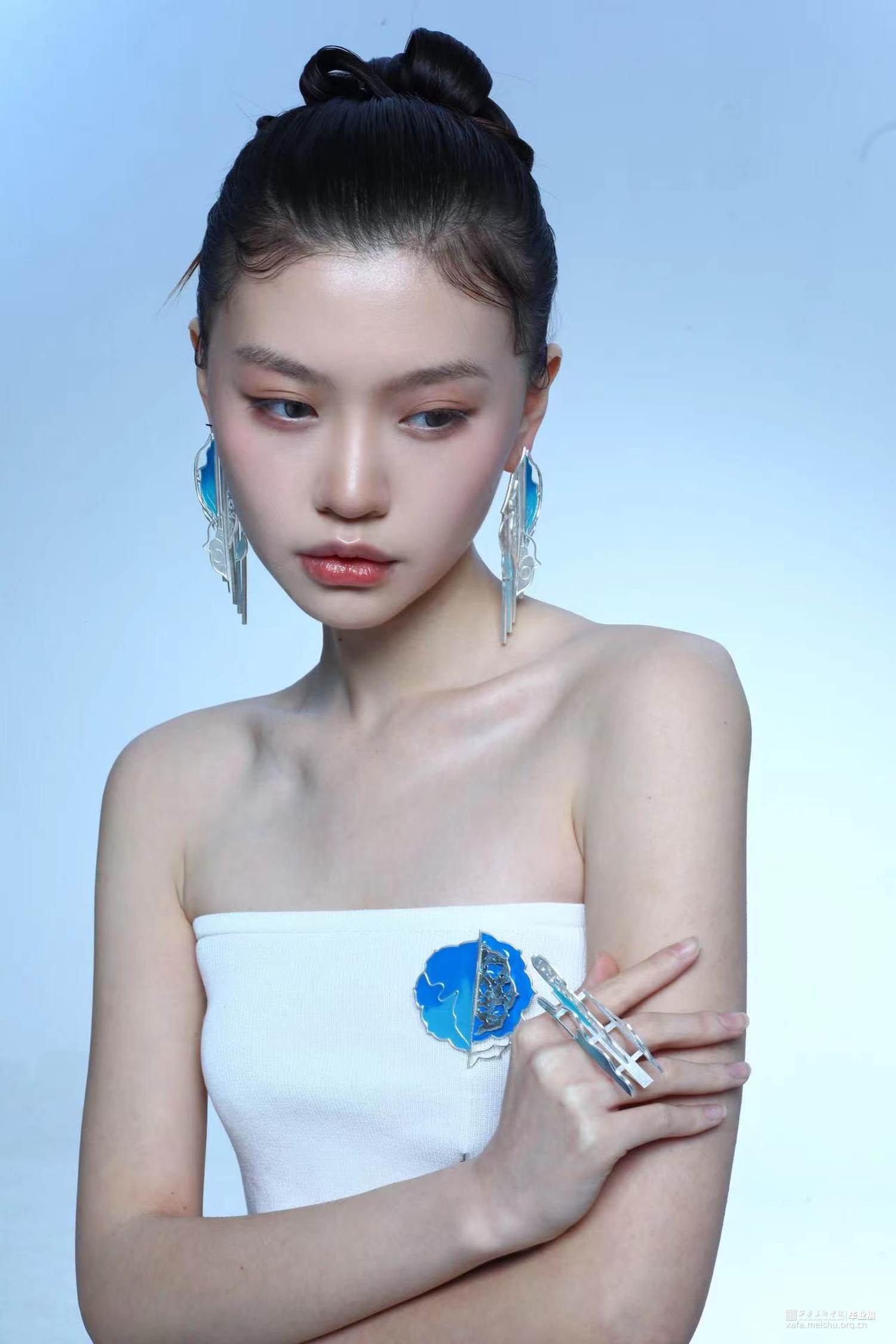 作者作品以唐代女性服饰为灵感来源,共八件作品,分为两个系列。第一系列主要运用了服饰的廓形以及图案花纹设计。着重体现了唐代女性服饰的设计感以及工艺的先进性。如镂空,錾刻工艺。第二系列主要体现了在经济文化高度繁荣的唐代下女性的审美特征,如服色彩图案的愈见丰富,对于饰品搭配的重视,以及倾向于欣赏丰满的体态。