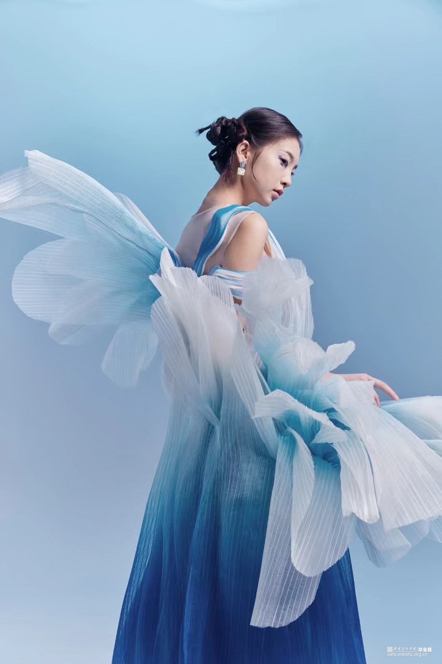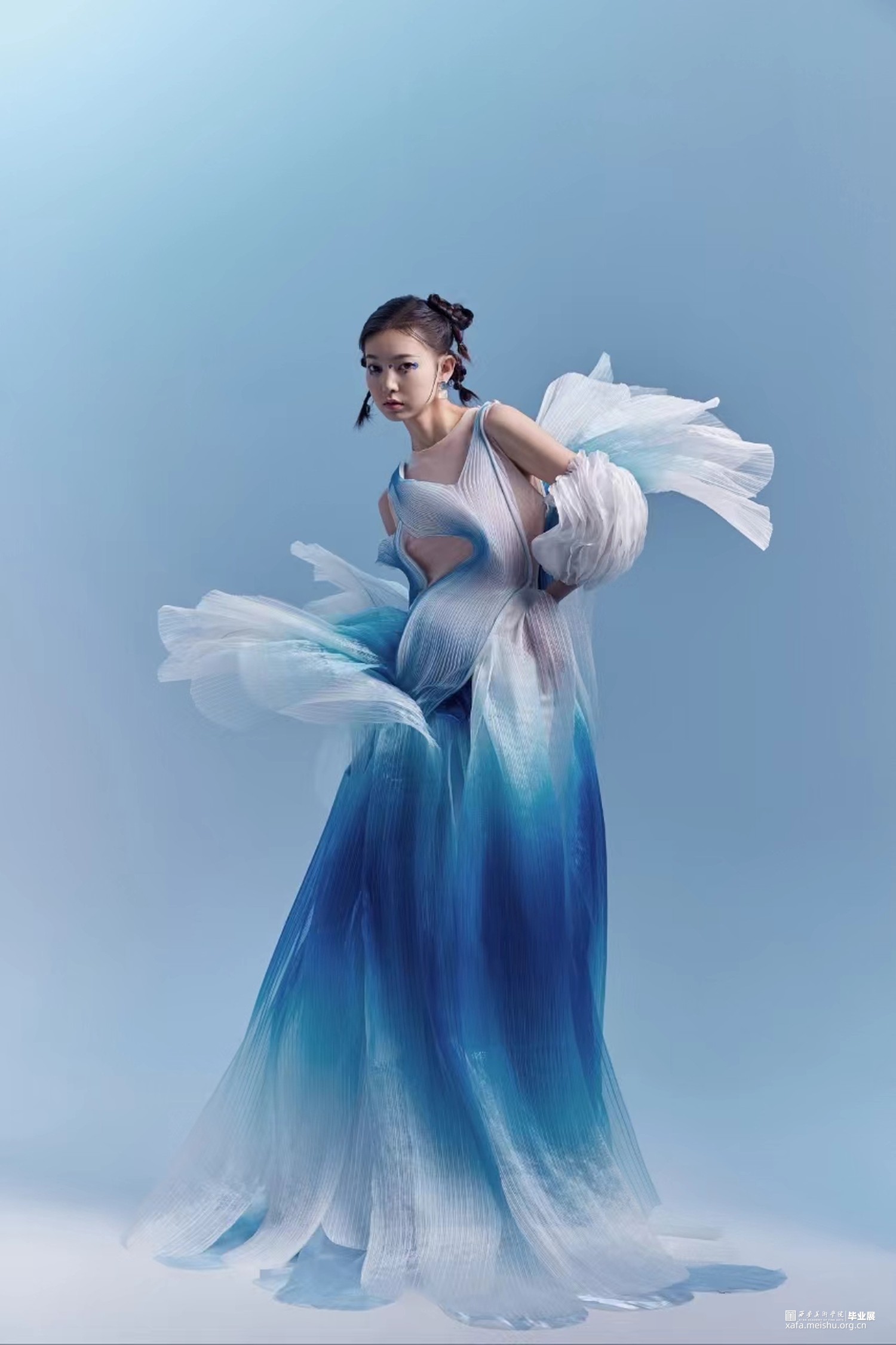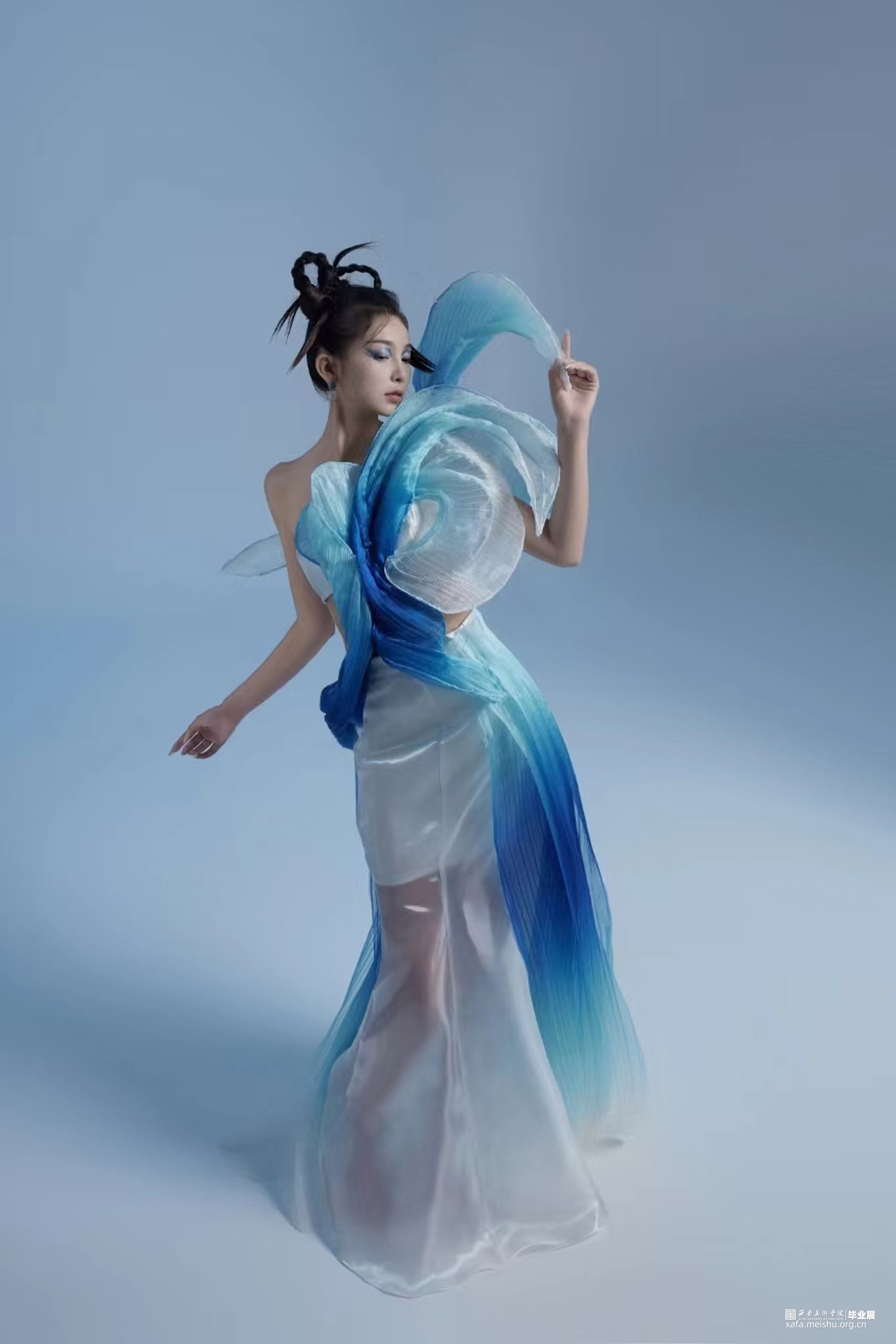 作品灵感来自于荷兰纸造艺术家Peter Gentenaar的纸艺雕塑,在设计过程中通过不断的寻找与观察,通过不同手法将自然纹理和礼服相结合,寻找人与自然的平衡共荣。