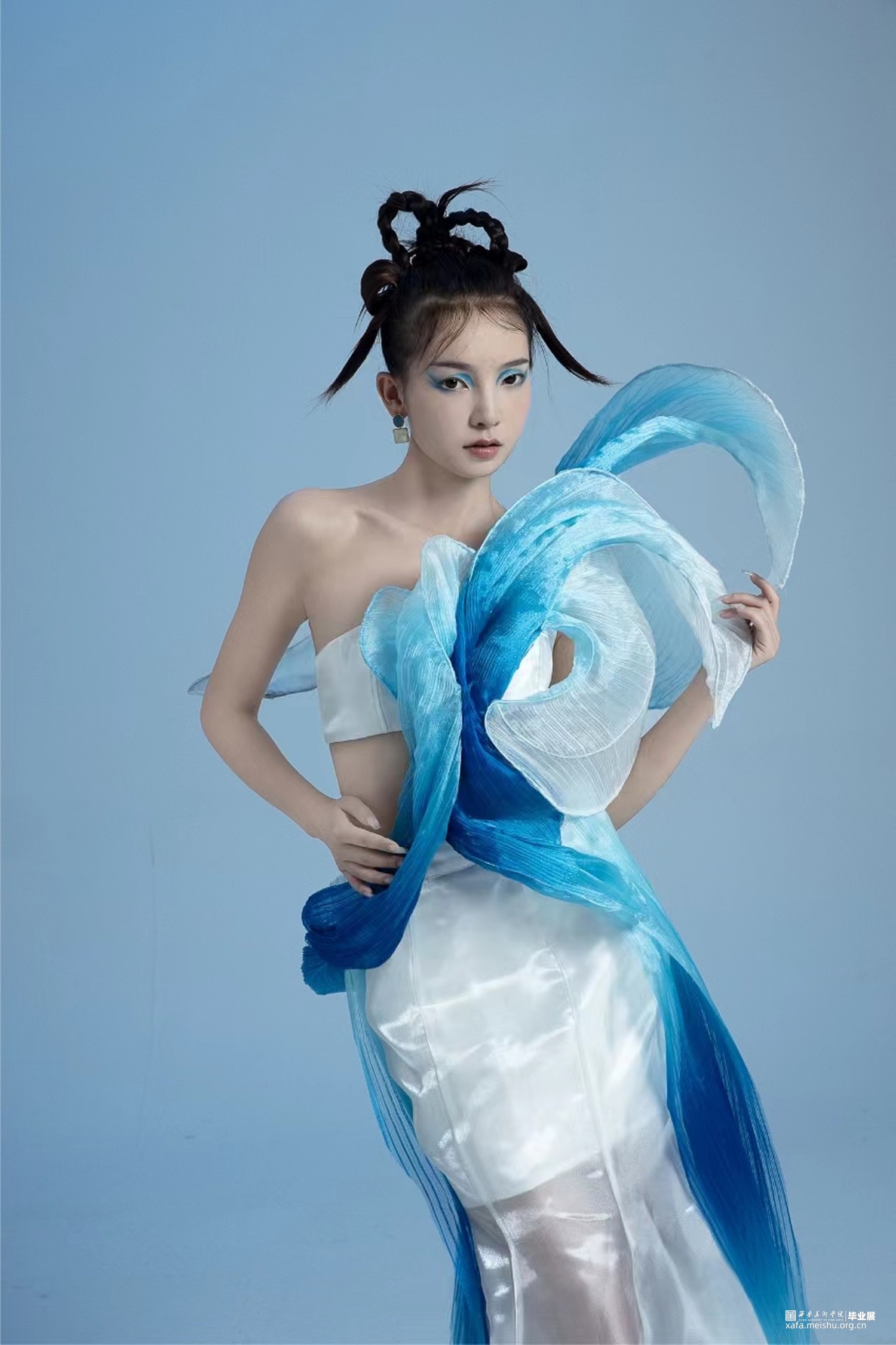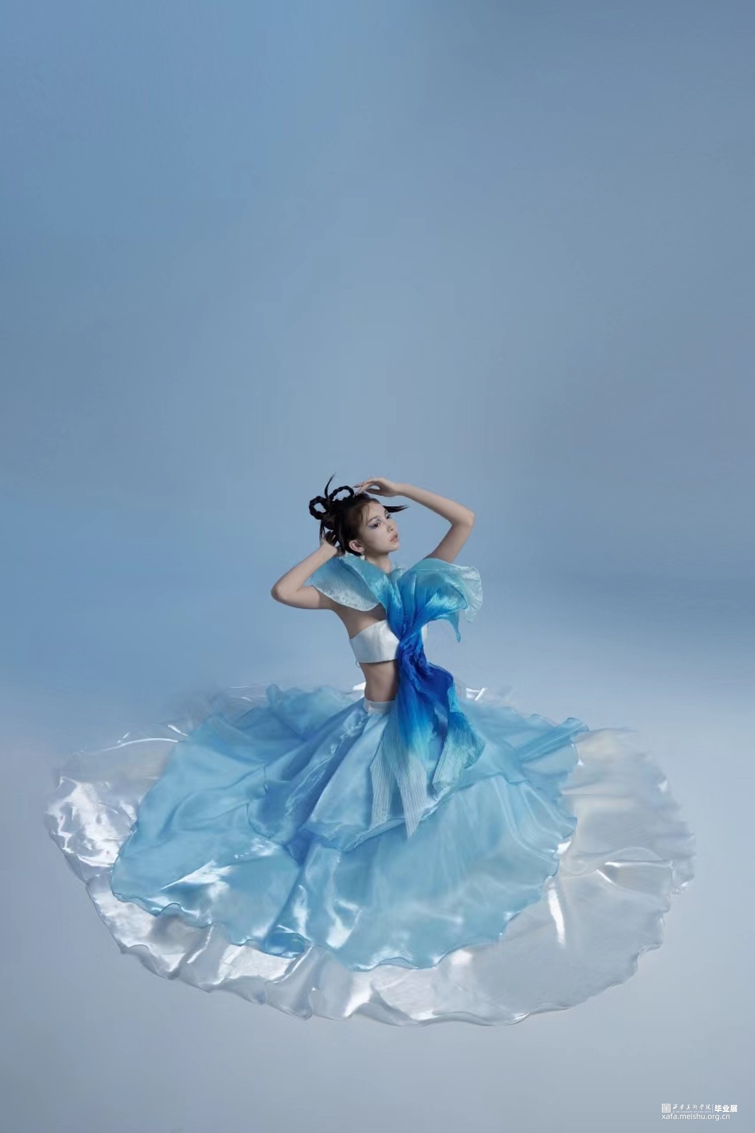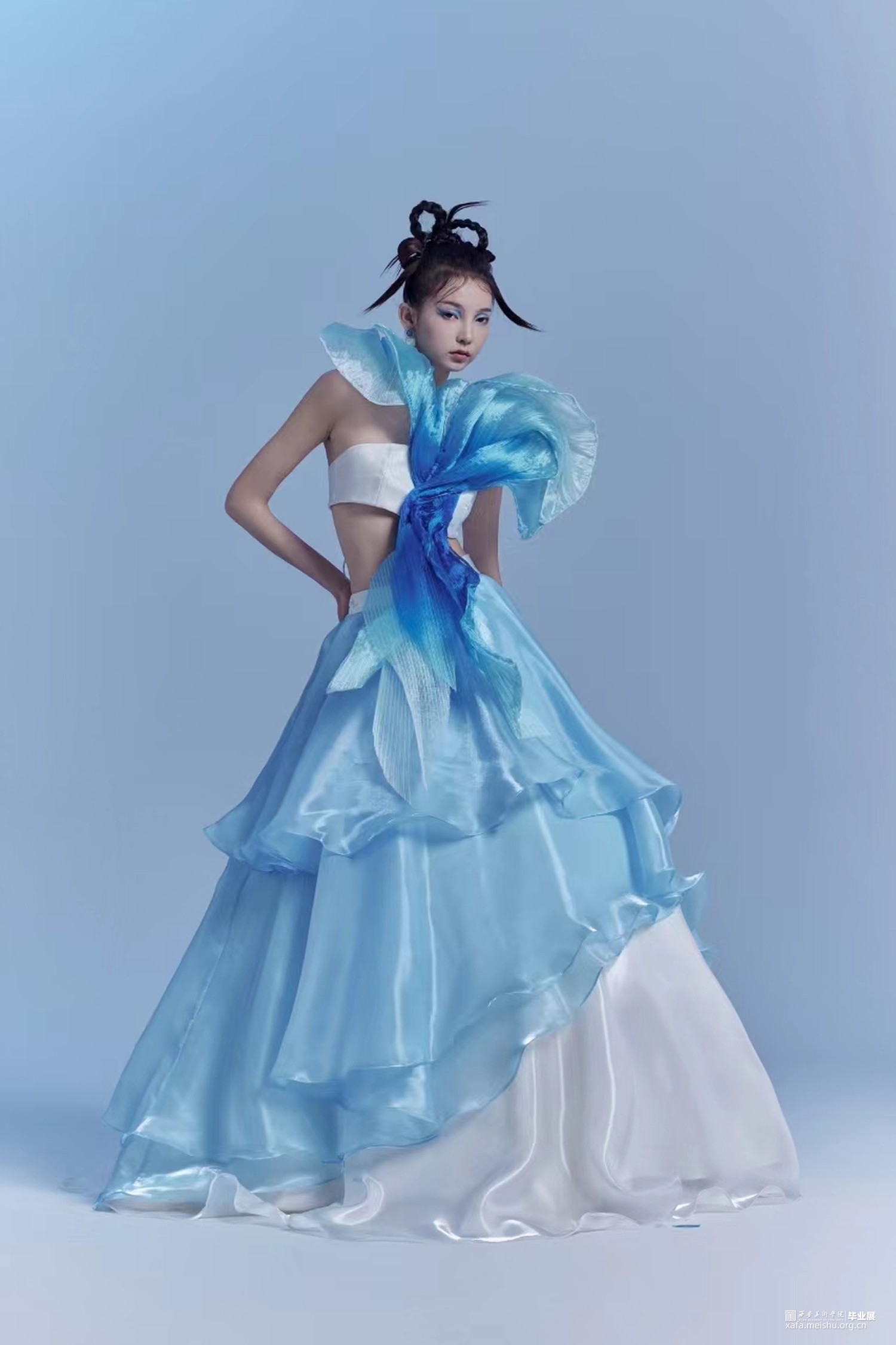 作品灵感来自于荷兰纸造艺术家Peter Gentenaar的纸艺雕塑,在设计过程中通过不断的寻找与观察,通过不同手法将自然纹理和礼服相结合,寻找人与自然的平衡共荣。