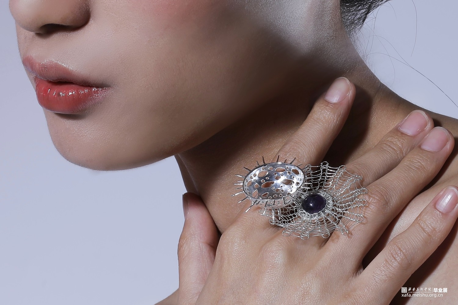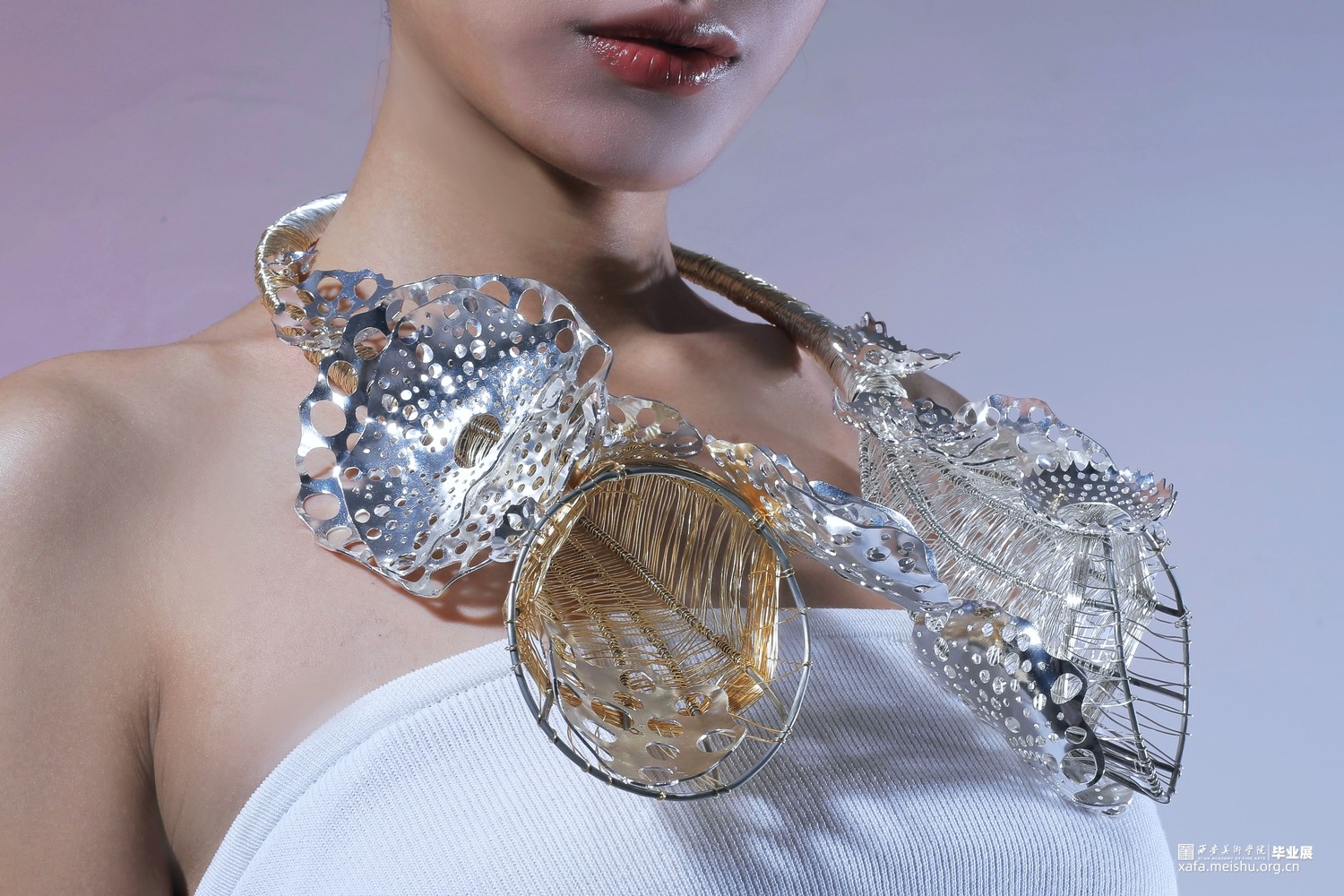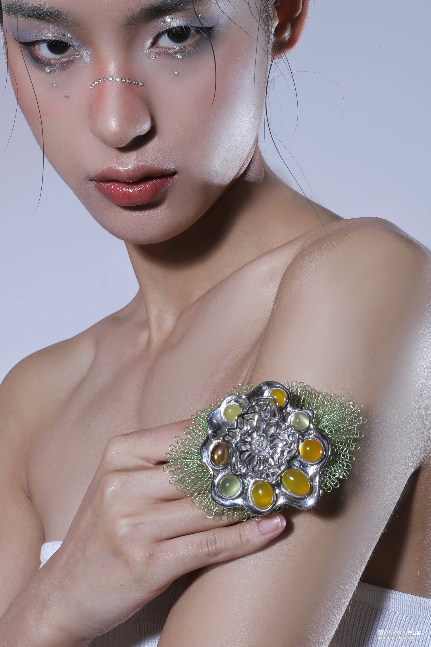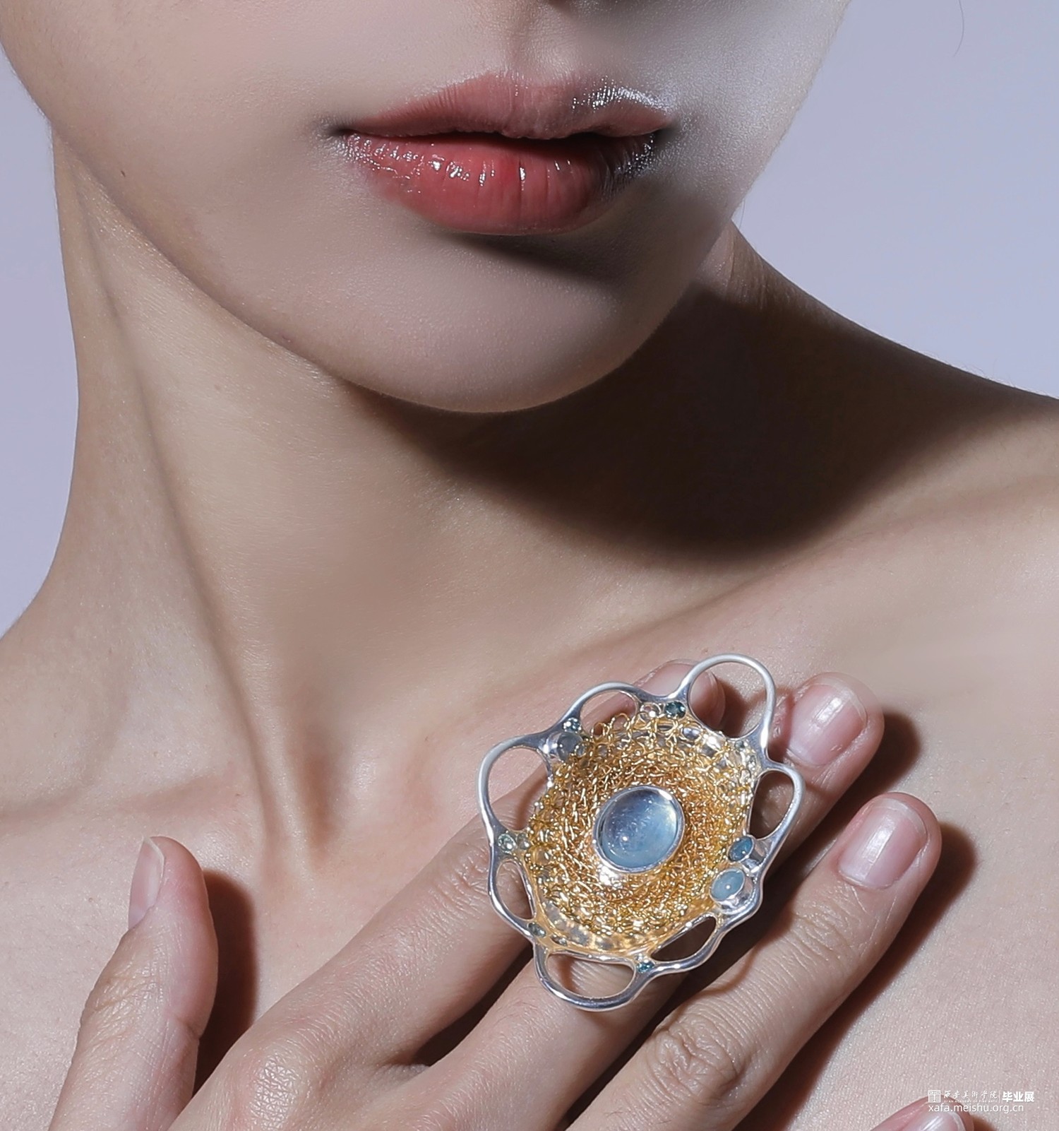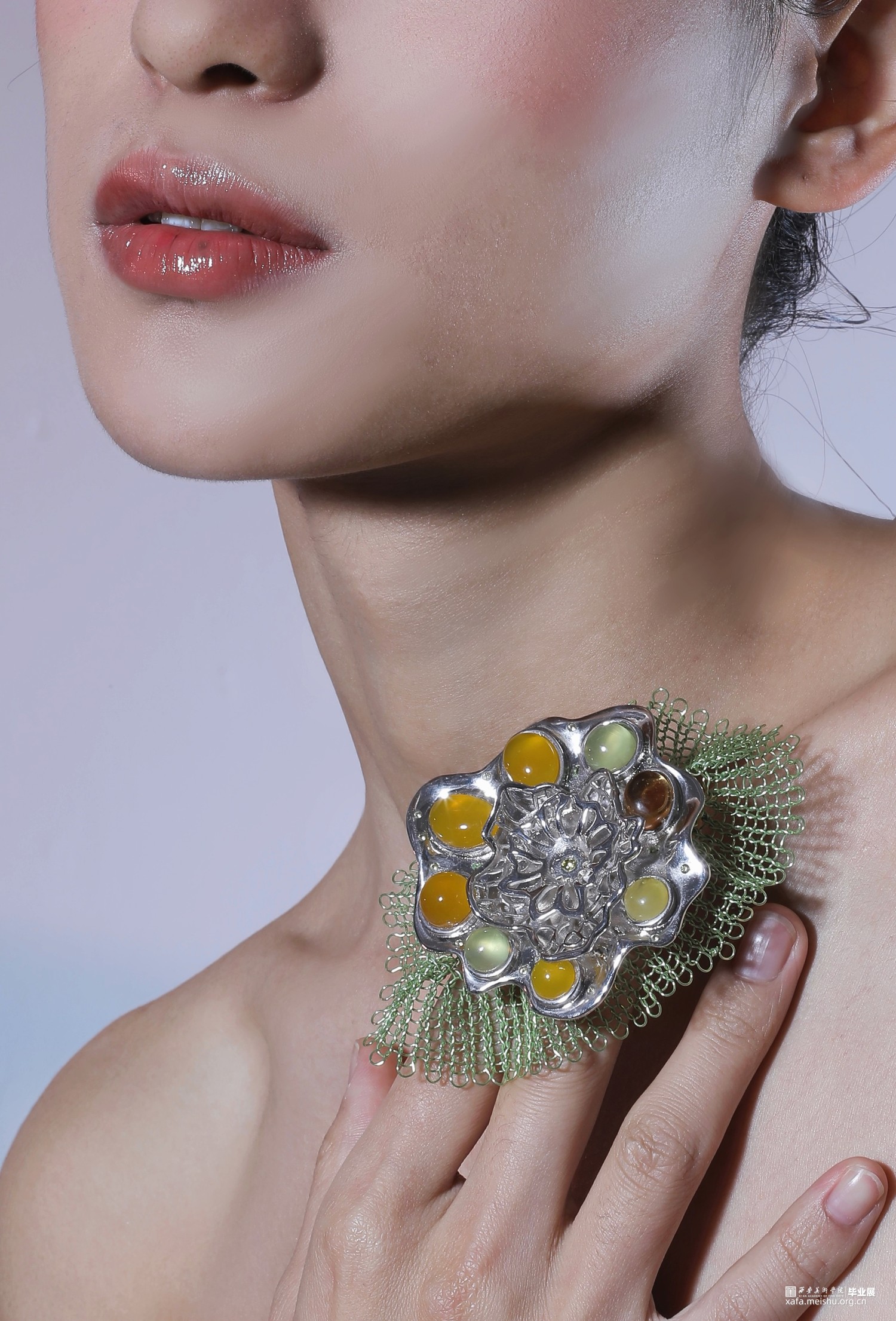 借鉴手工编织、古法藤编的工艺方法,通过参考传统编织知识,结合现当代编织艺术家的编织艺术品引发灵感,在创作过程中以细胞作为主要切入点,进行发散联想,深入探寻如何用钩针编织方法去体现细胞的各异形态。用当代首饰的思维思想与传统的编制方法进行新的结合,呈现出不同的形式造型,给人们对于传统编织不同的视觉呈现。