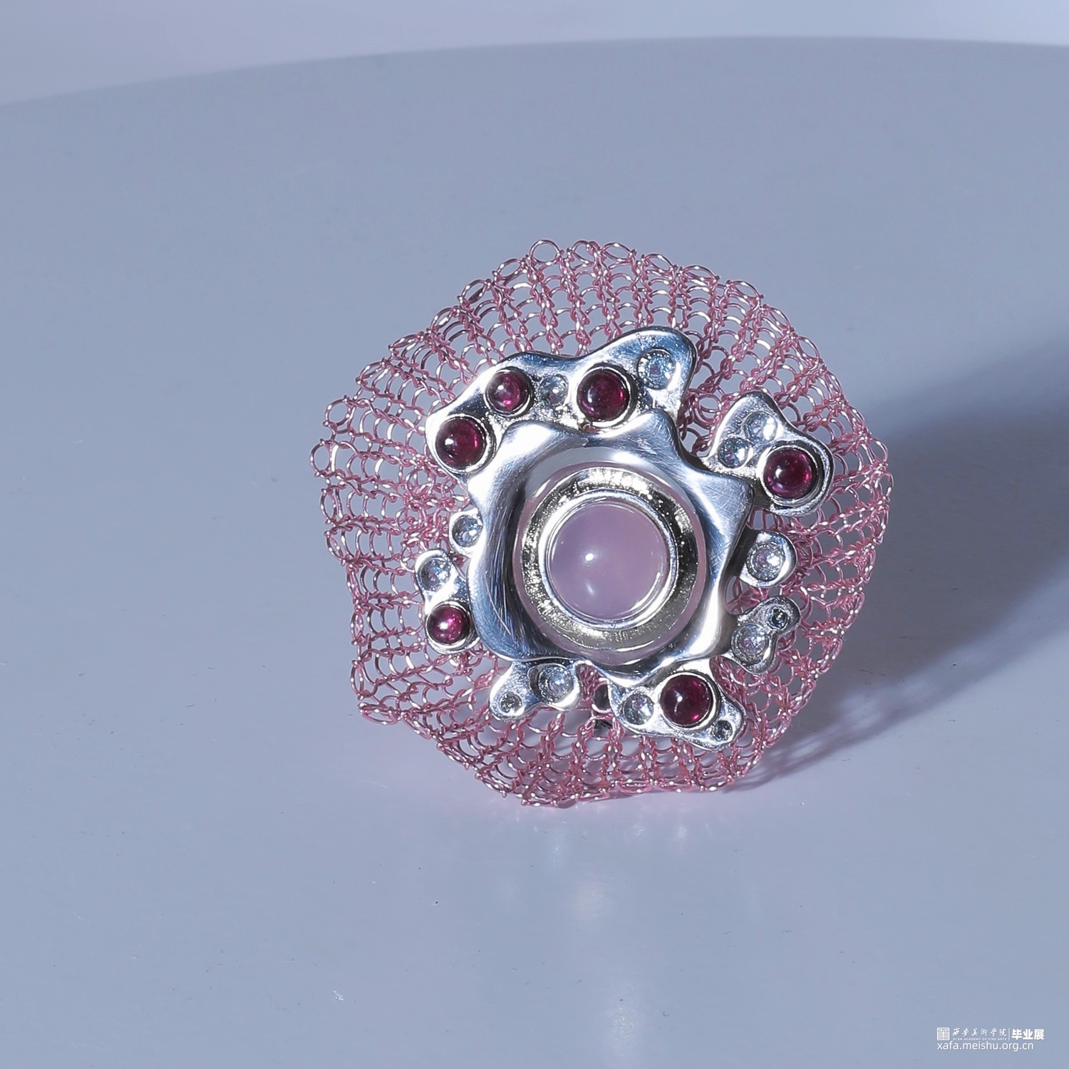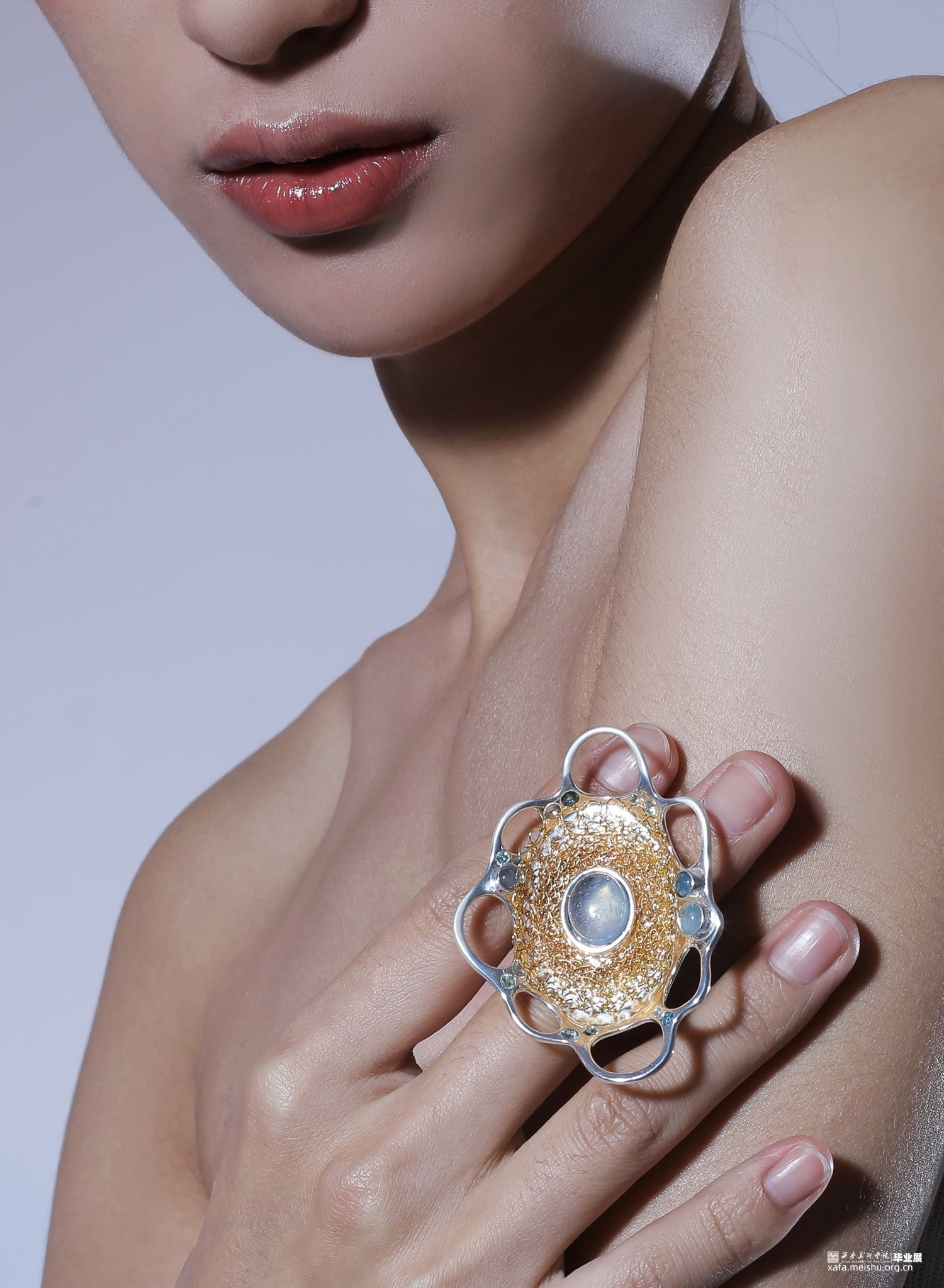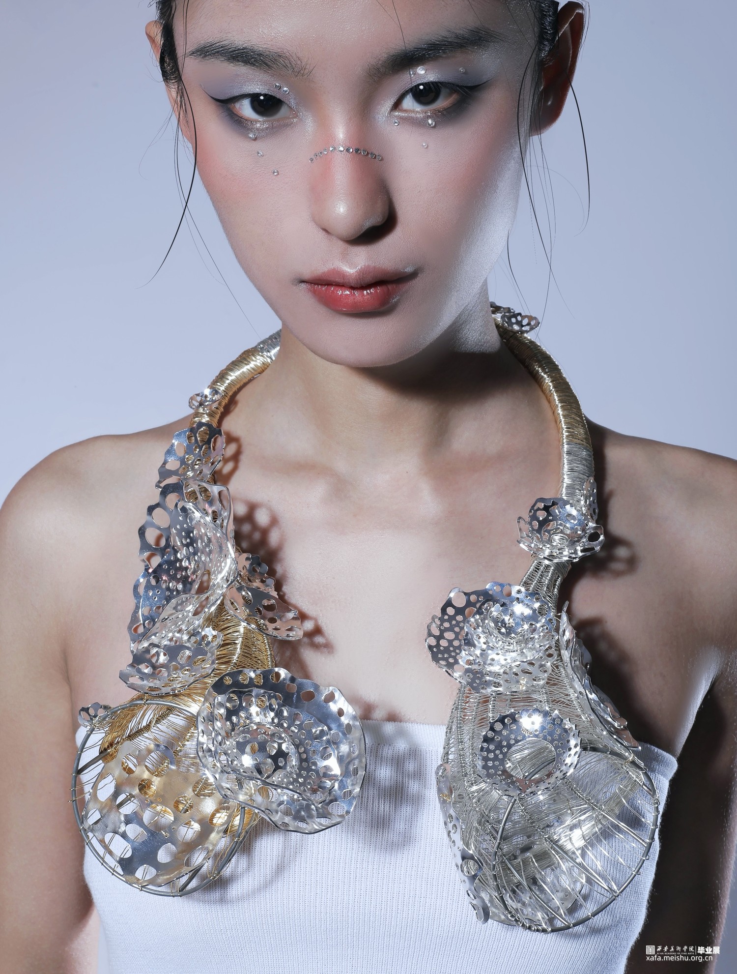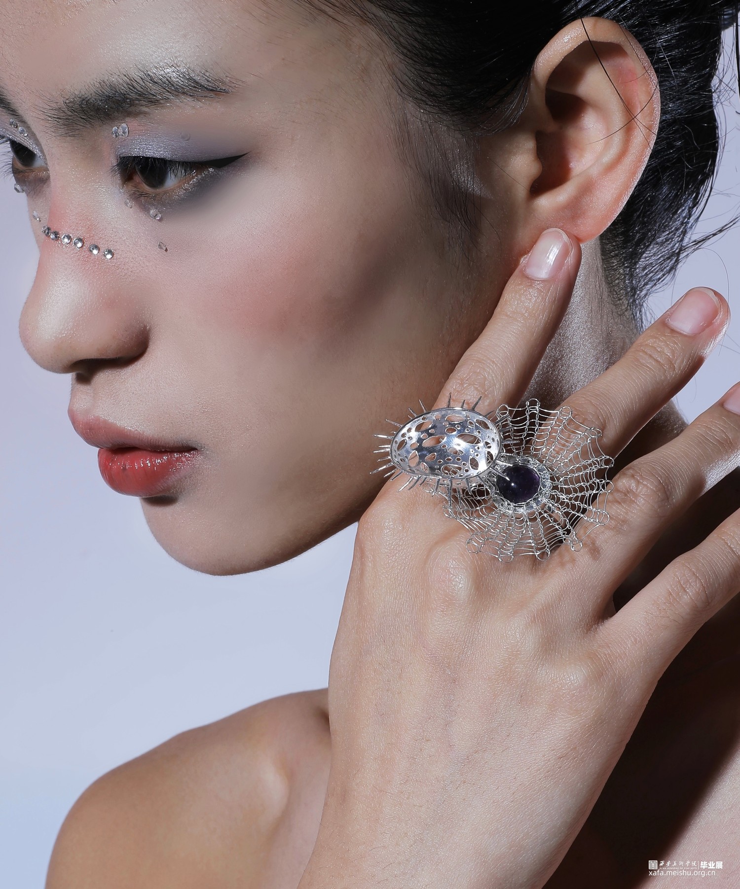 借鉴手工编织、古法藤编的工艺方法,通过参考传统编织知识,结合现当代编织艺术家的编织艺术品引发灵感,在创作过程中以细胞作为主要切入点,进行发散联想,深入探寻如何用钩针编织方法去体现细胞的各异形态。用当代首饰的思维思想与传统的编制方法进行新的结合,呈现出不同的形式造型,给人们对于传统编织不同的视觉呈现。