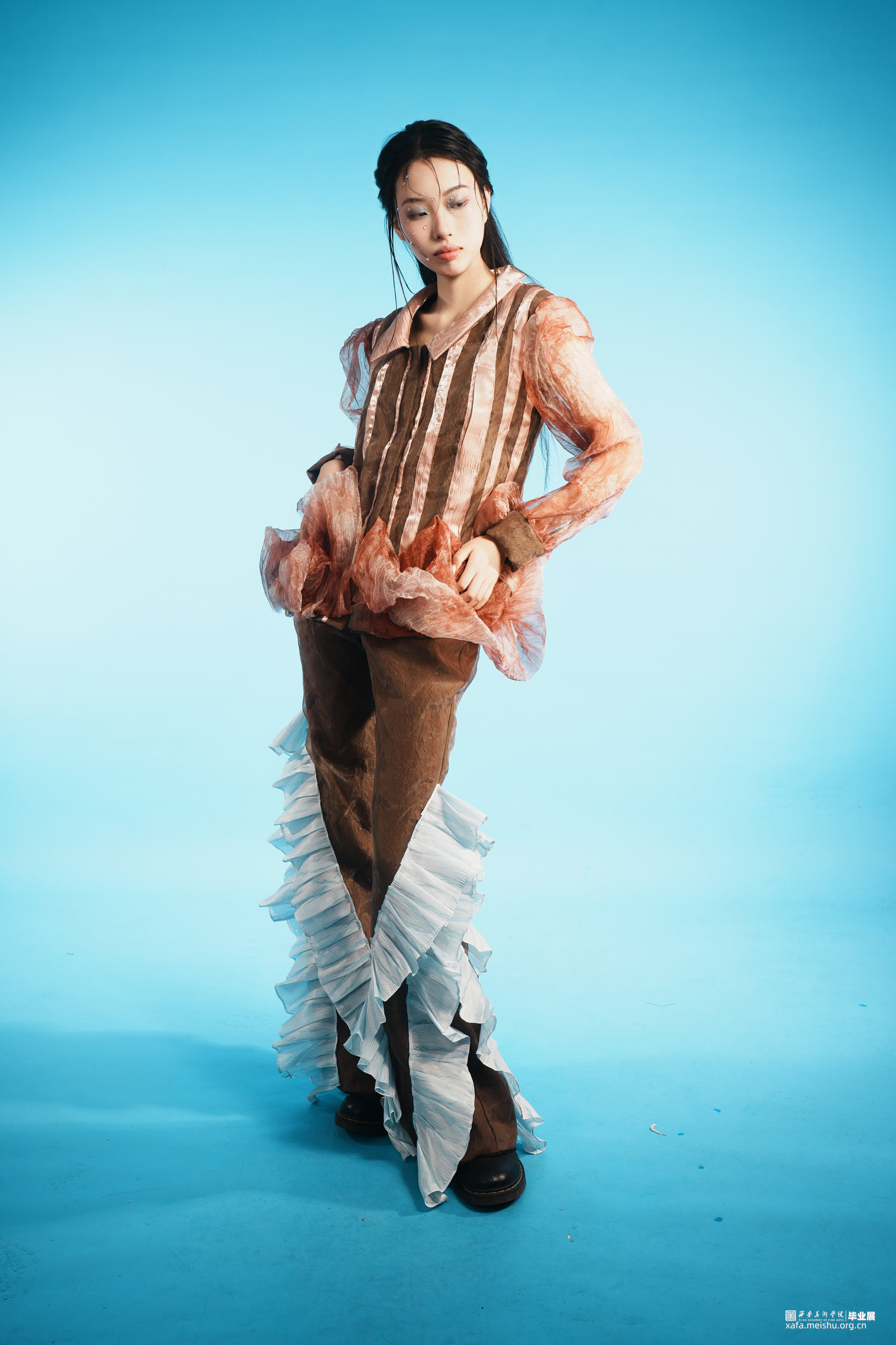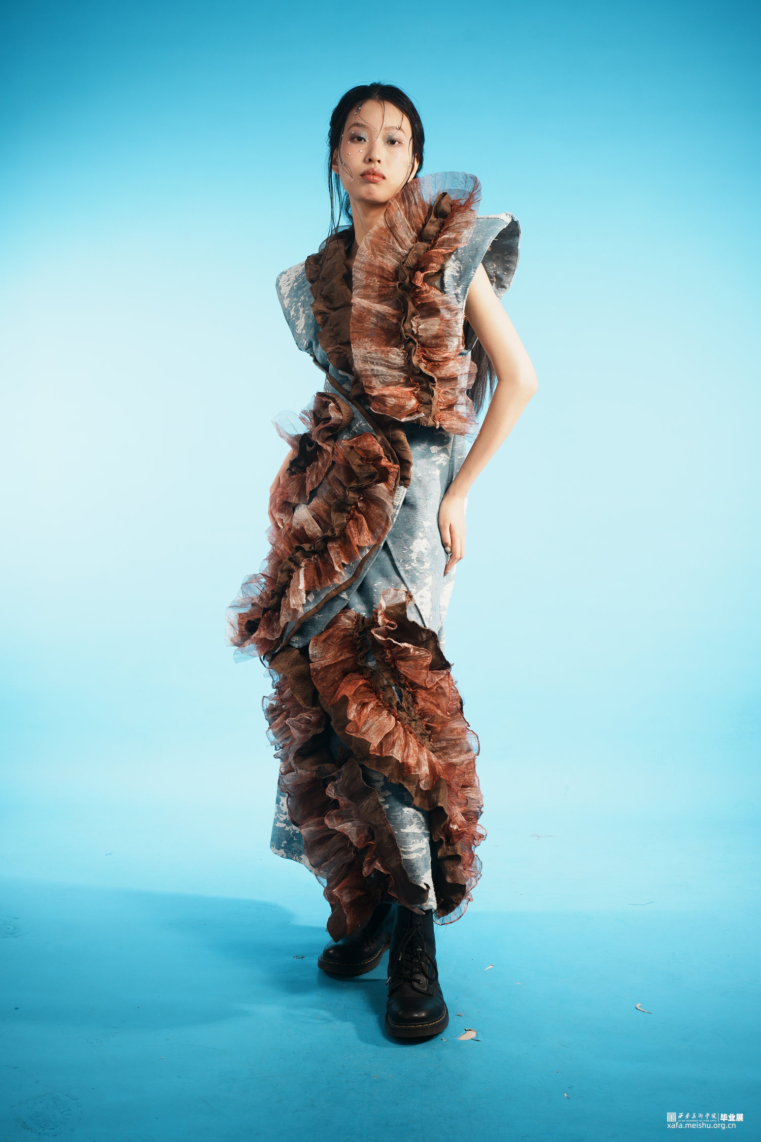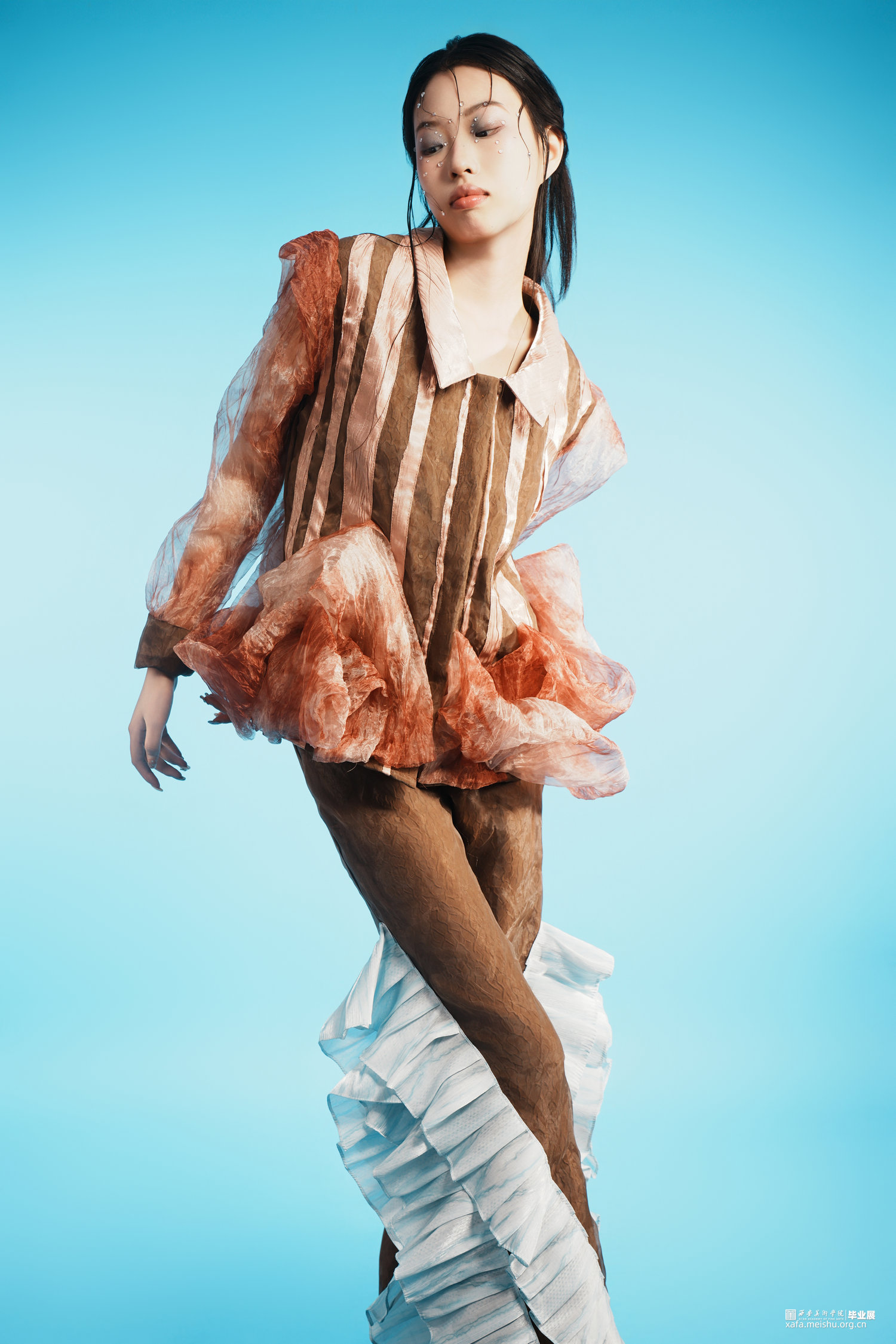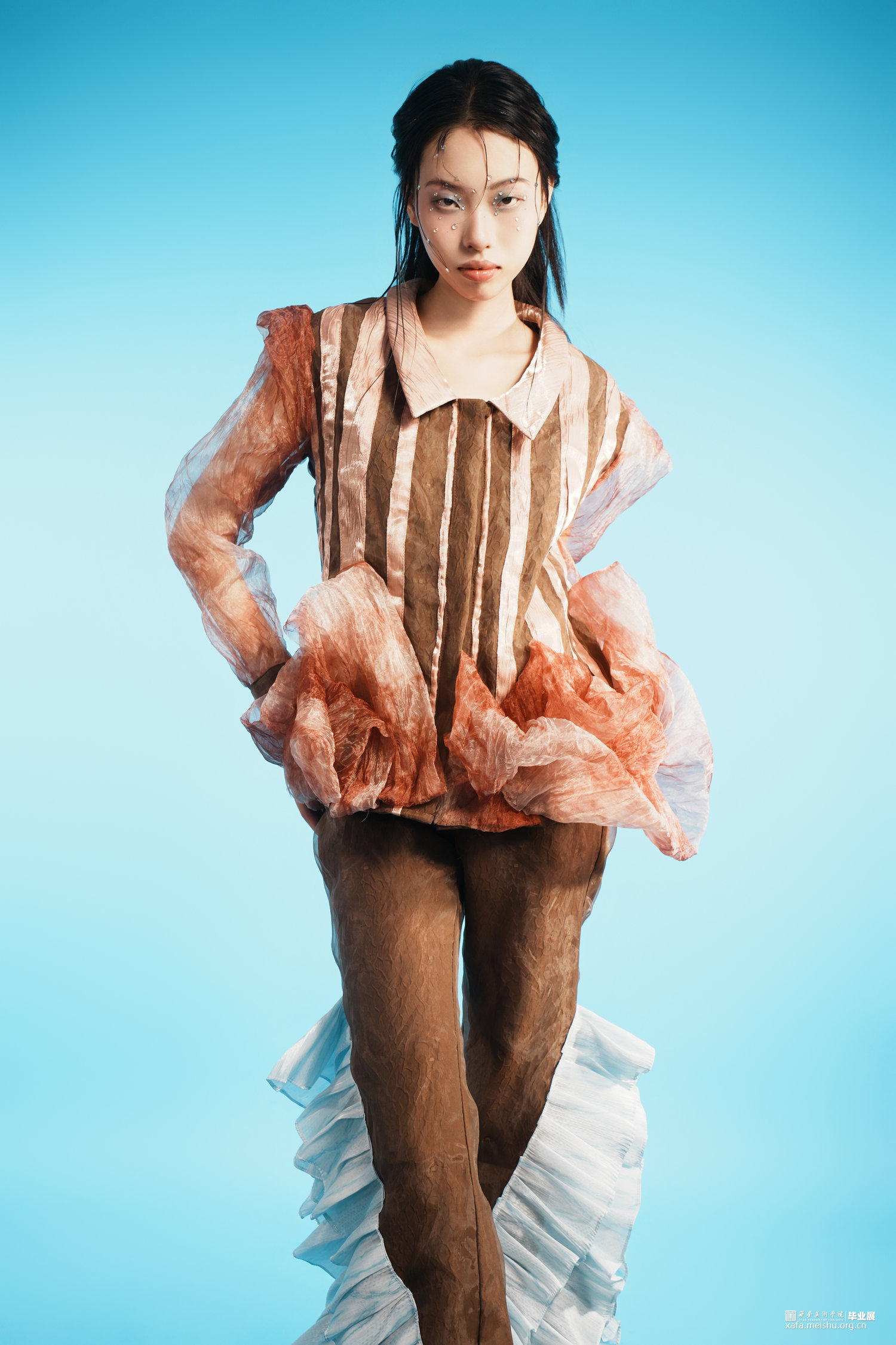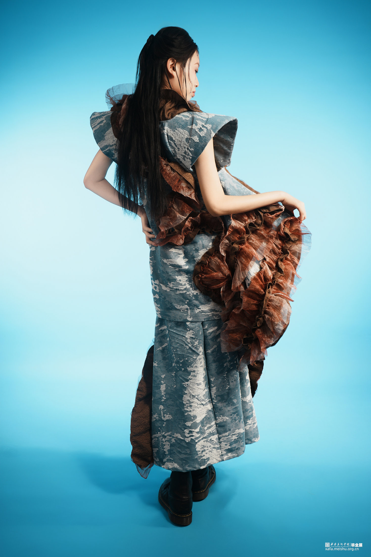 表达人与自然共生的生活理念,在原有基础上进行裁剪、廓形并再设计。借鉴曲线图形,通过硬朗且富有张力的结构、版型,构建起服装和自然结构之间的形态,通过发掘山水地貌中不同的形态、结构、功能等方面为研究方向和被撑开的结构展现多种地貌状态形成一系列服装创新思路,色彩上选用了大自然的颜色作为主体,表达一种人与自然和谐相处的理念。自然色系和山水图案正在成为产品设计领域的热门趋势。自然色系以其蓝色和棕色为主调,传递出宁静和广阔的感觉,而山水波纹形态图案通过流动的线条和不同形态赋予产品生动和灵动的特质。这一趋势为服装产品带来了沉浸感和与自然的联系,同时展现出时尚风格和独特魅力。拥抱大海山川,感受自然之美,这正是自然色系和山水波纹图案在服装产品中所传递的核心理念。自然色系和山水图案正在成为产品设计领域的热门趋势。自然色系以其蓝色和棕色为主调,传递出宁静和广阔的感觉,而山水波纹形态图案通过流动的线条和不同形态赋予产品生动和灵动的特质。这一趋势为服装产品带来了沉浸感和与自然的联系,同时展现出时尚风格和独特魅力。拥抱大海山川,感受自然之美,这正是自然色系和山水波纹图案在服装产品中所传递的核心理念。
