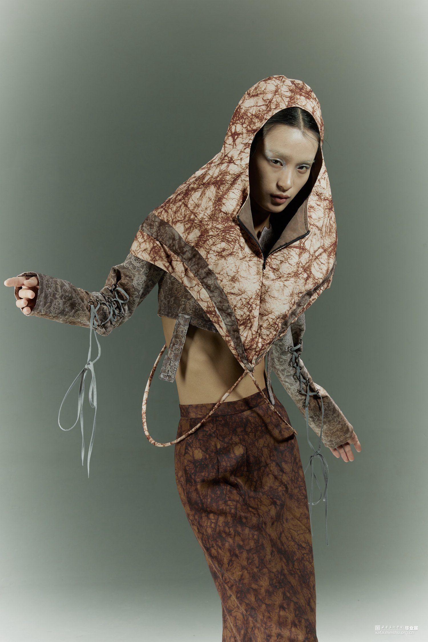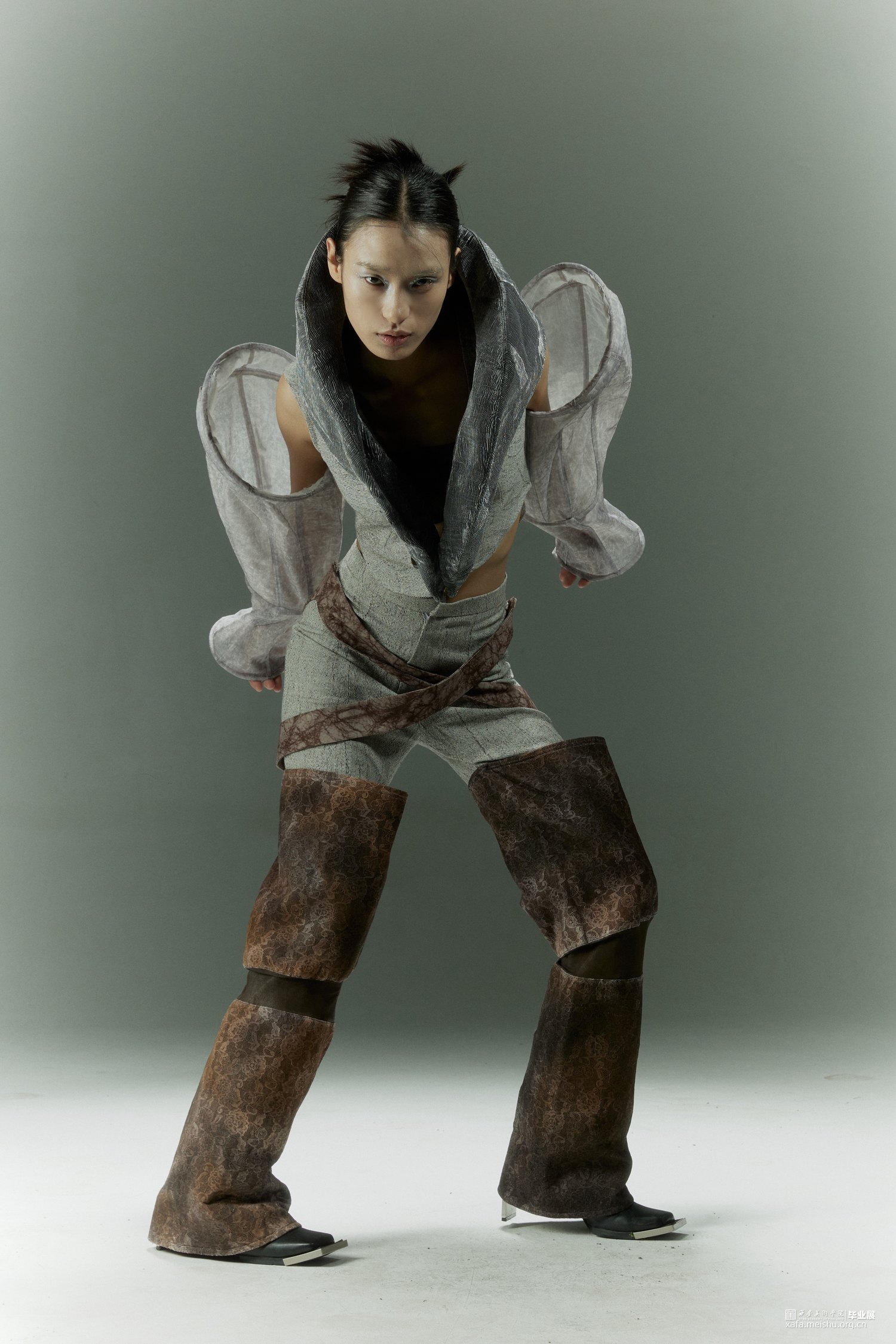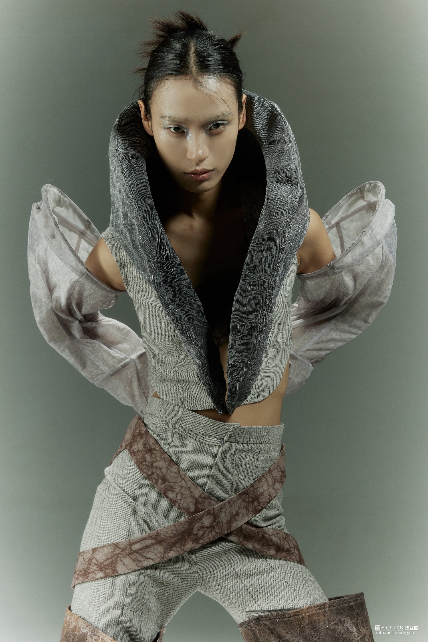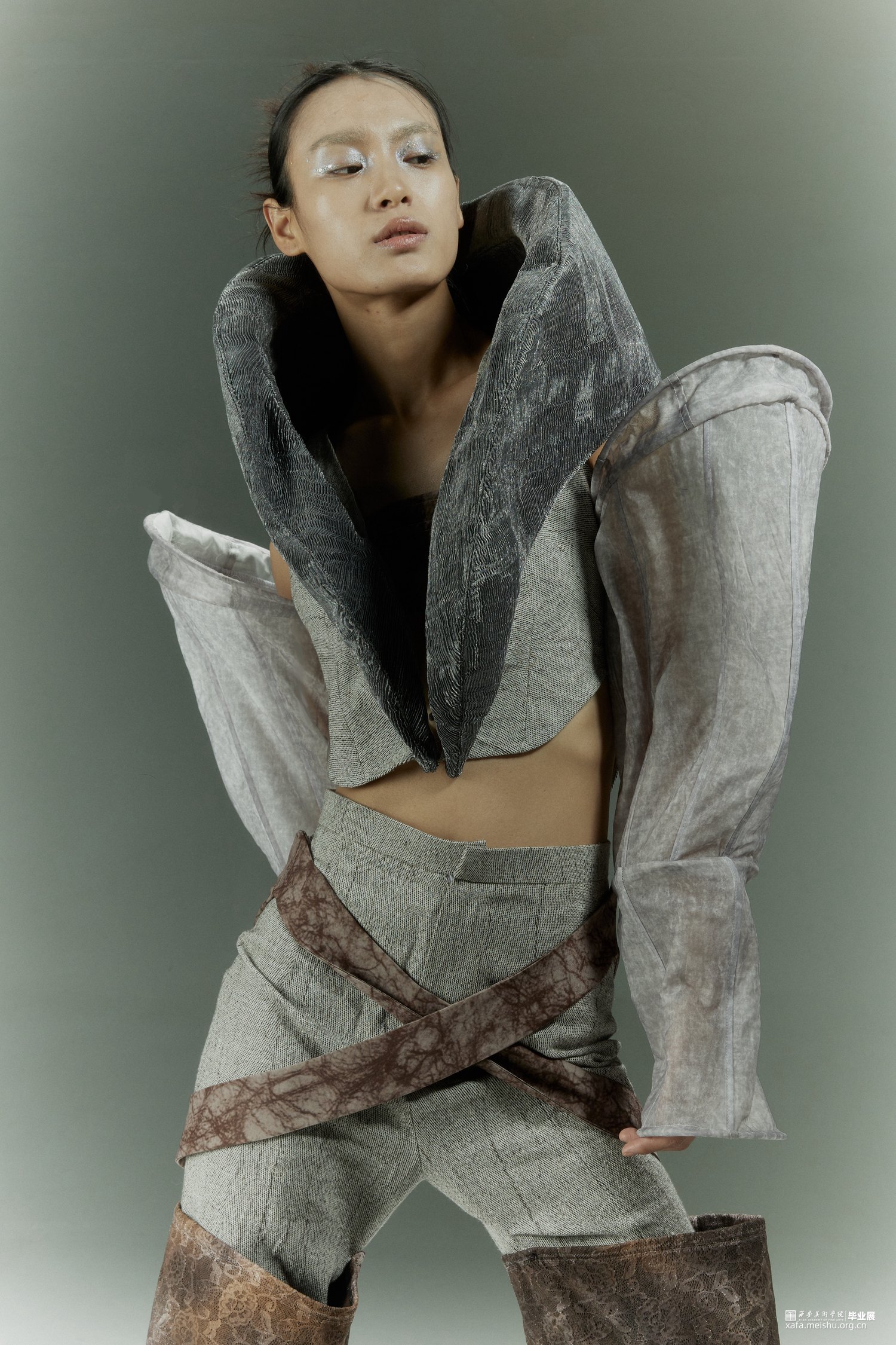 在设计的过程中引入光绘这一方式,研究人们在日常生活中努力奔赴梦想时的状态以及心理,记录下大家对“靠岸”的看法和态度,深入探讨当代的人们如何面对生活中的困难与挑战,积极的或是消极的,提取大量关键词。从而把这种状态通过肢体语言表达出来,因为肢体语言是表达自己的一种方式,是一种无声的语言。在研究时让模特通过肢体语言展现一系列关键词的状态,利用光绘摄影的方式转化为可视化的图像,运用到服装廓形当中。