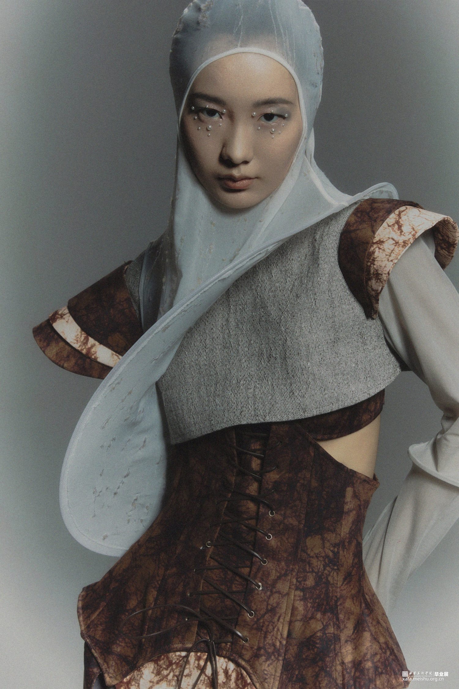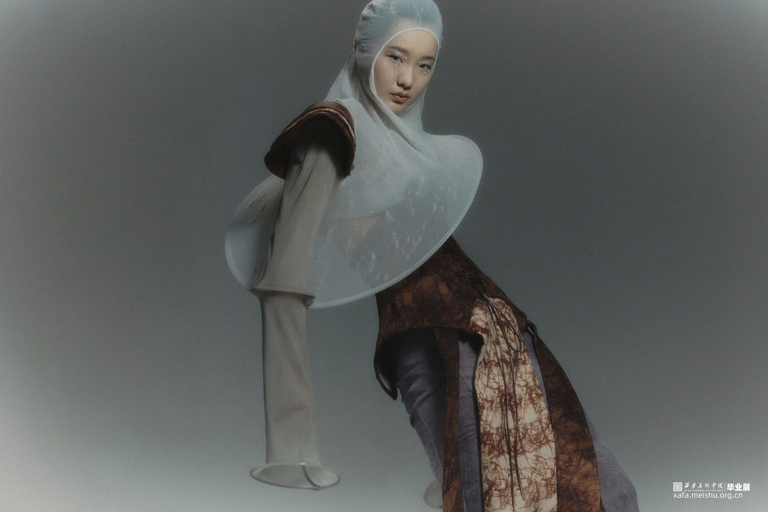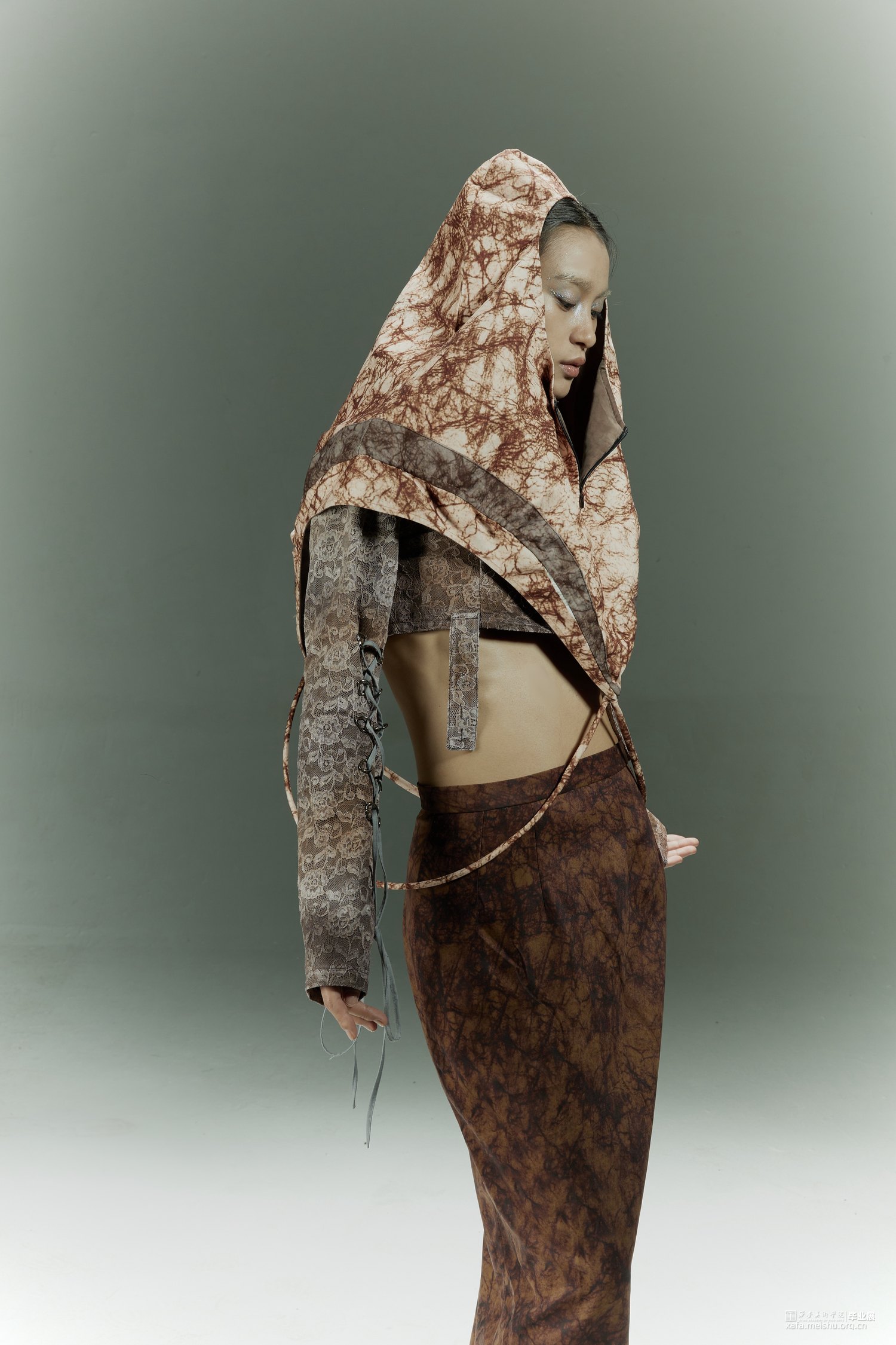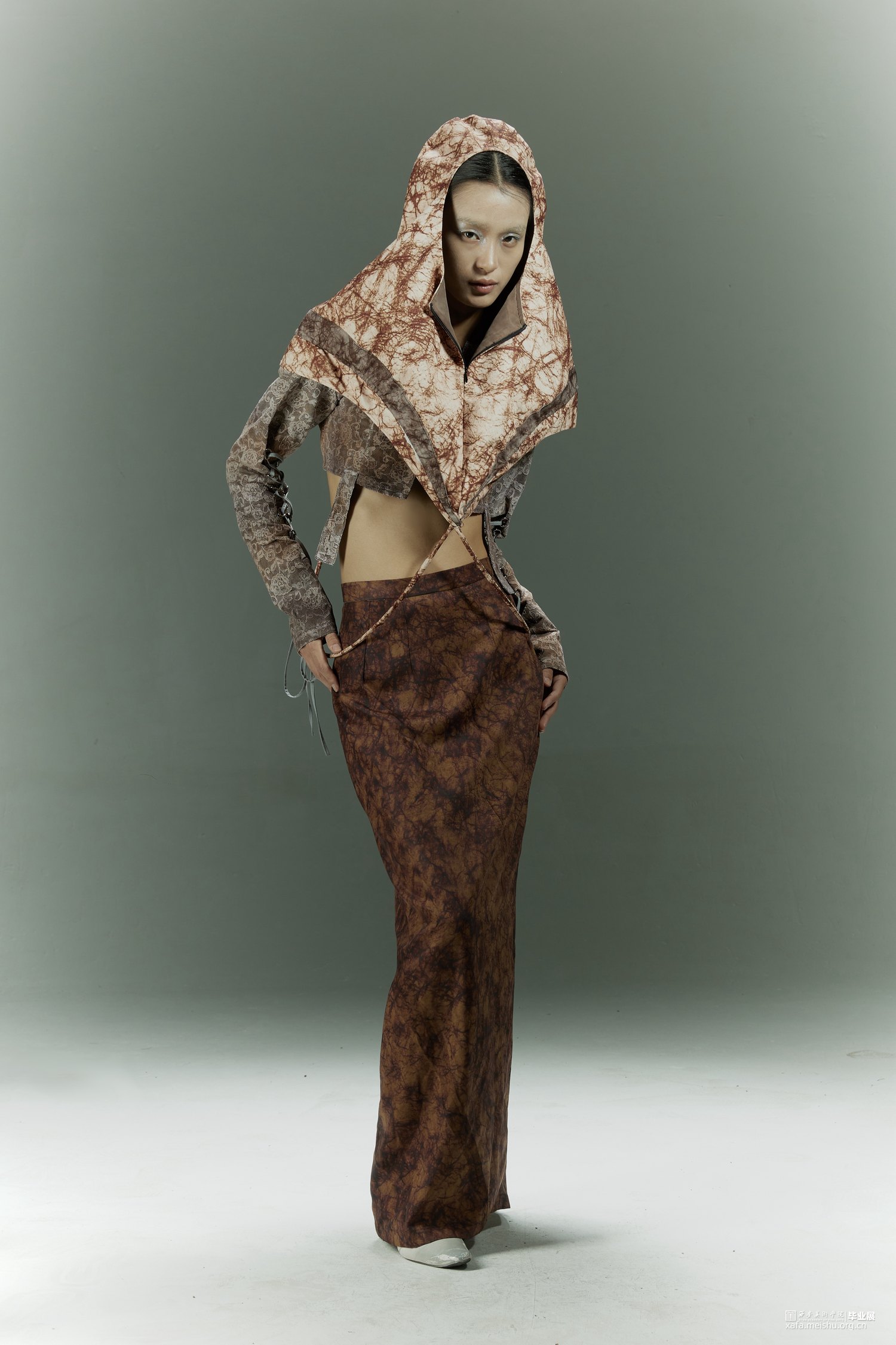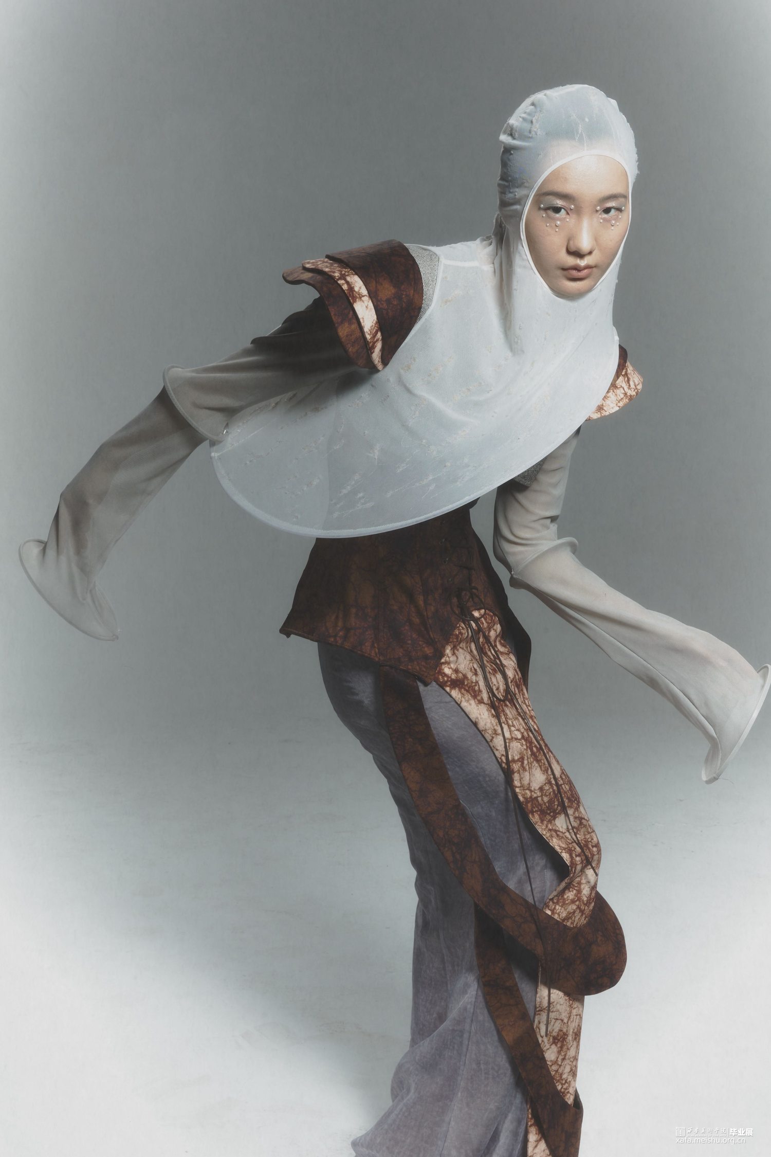 在设计的过程中引入光绘这一方式,研究人们在日常生活中努力奔赴梦想时的状态以及心理,记录下大家对“靠岸”的看法和态度,深入探讨当代的人们如何面对生活中的困难与挑战,积极的或是消极的,提取大量关键词。从而把这种状态通过肢体语言表达出来,因为肢体语言是表达自己的一种方式,是一种无声的语言。在研究时让模特通过肢体语言展现一系列关键词的状态,利用光绘摄影的方式转化为可视化的图像,运用到服装廓形当中。