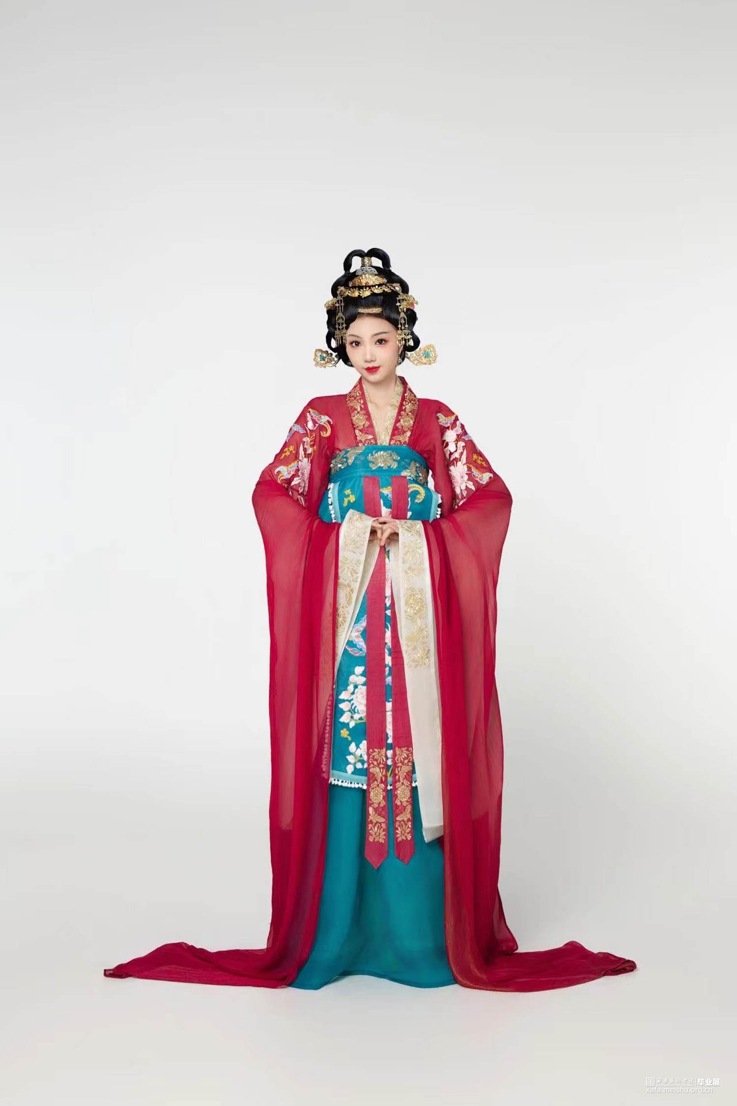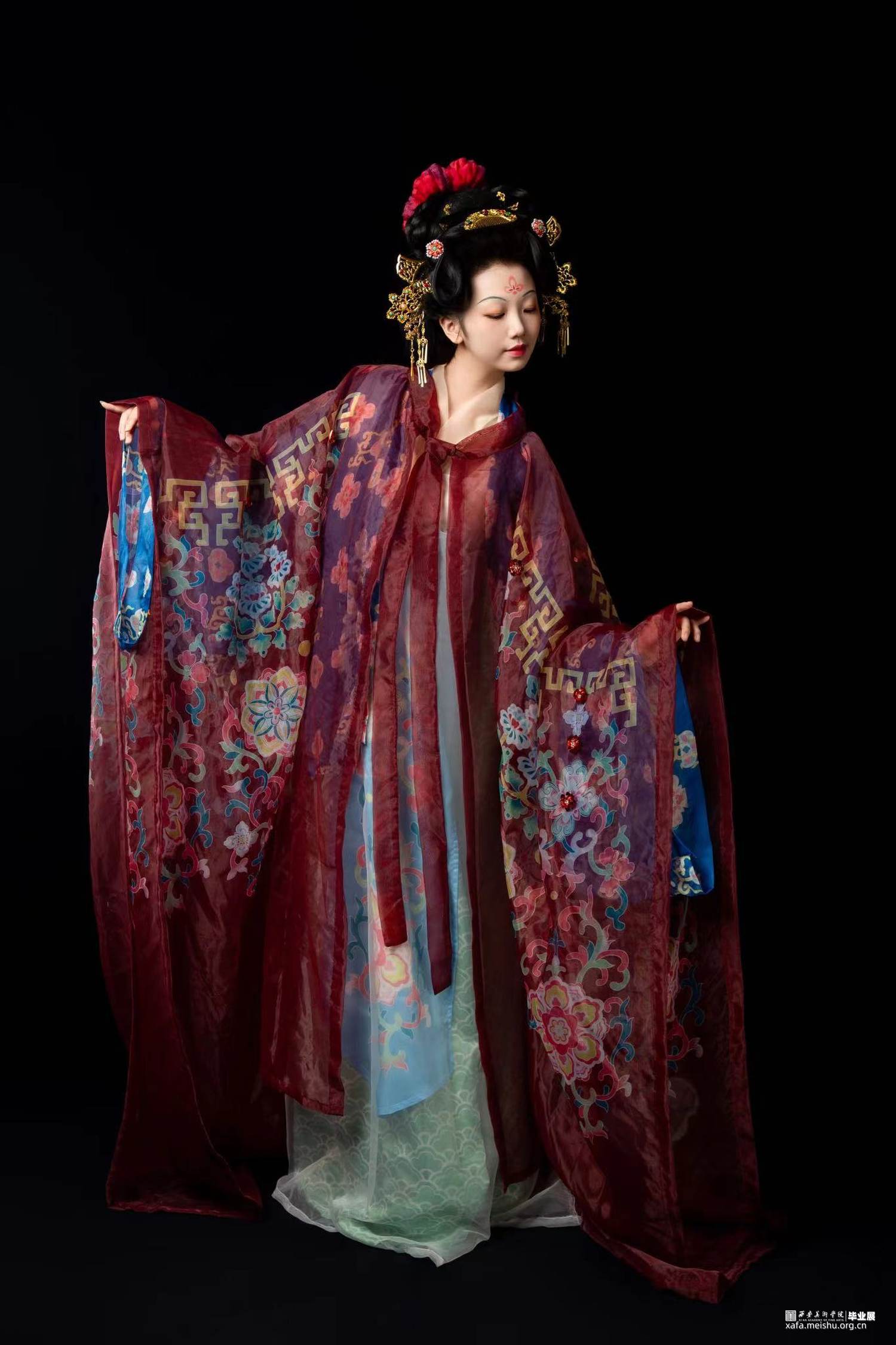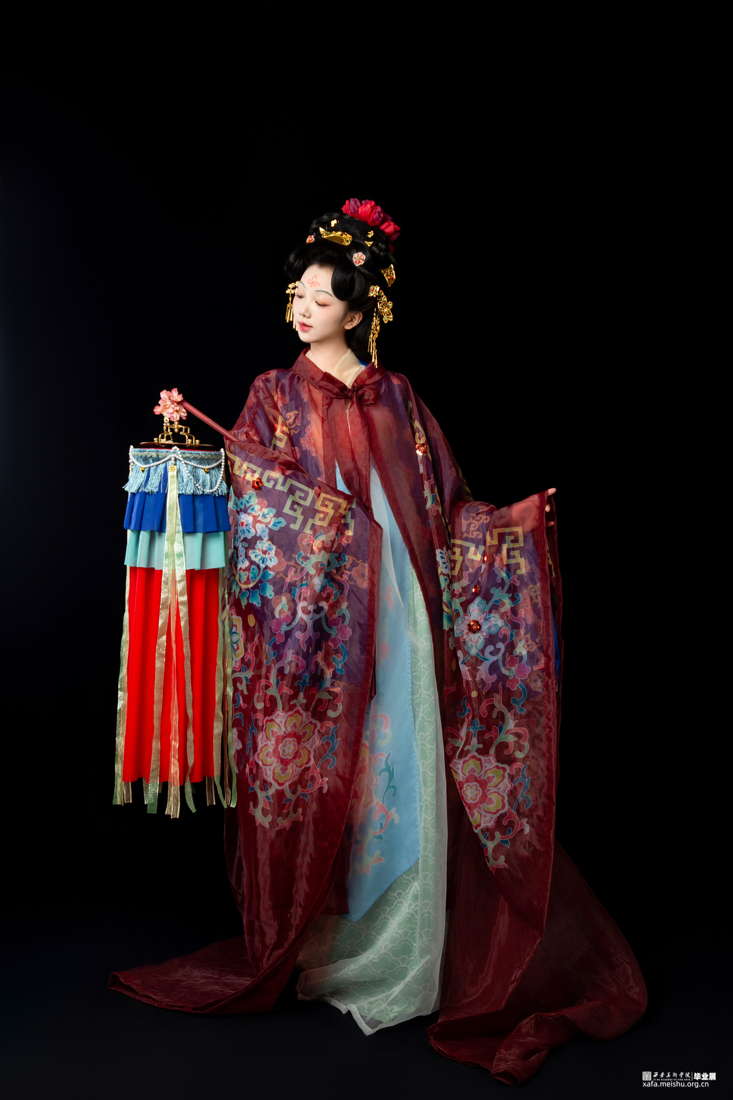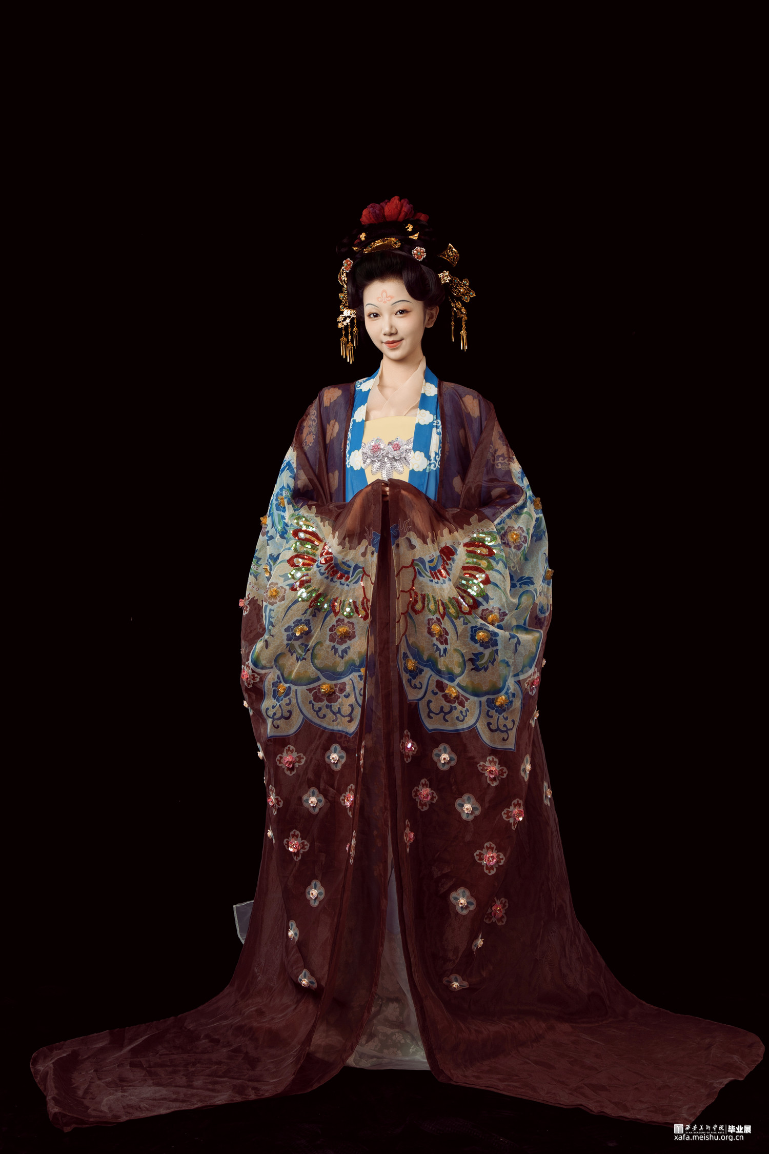唐代妇女服饰,以众多的款式,艳丽的色调,典雅华美的风格,成为唐文化的重要标志。根据唐代女性婚礼服饰进行复原,形制借鉴唐代敦煌壁供养人壁画、皇后袆衣、贵族女子、史料记载及画卷等,有牡丹纹、宝相花、团花纹、海棠花及蝴蝶等纹样,通过刺绣、珠片刺绣、印花工艺展现唐代女性的“钗钿礼衣”,热烈喜庆。