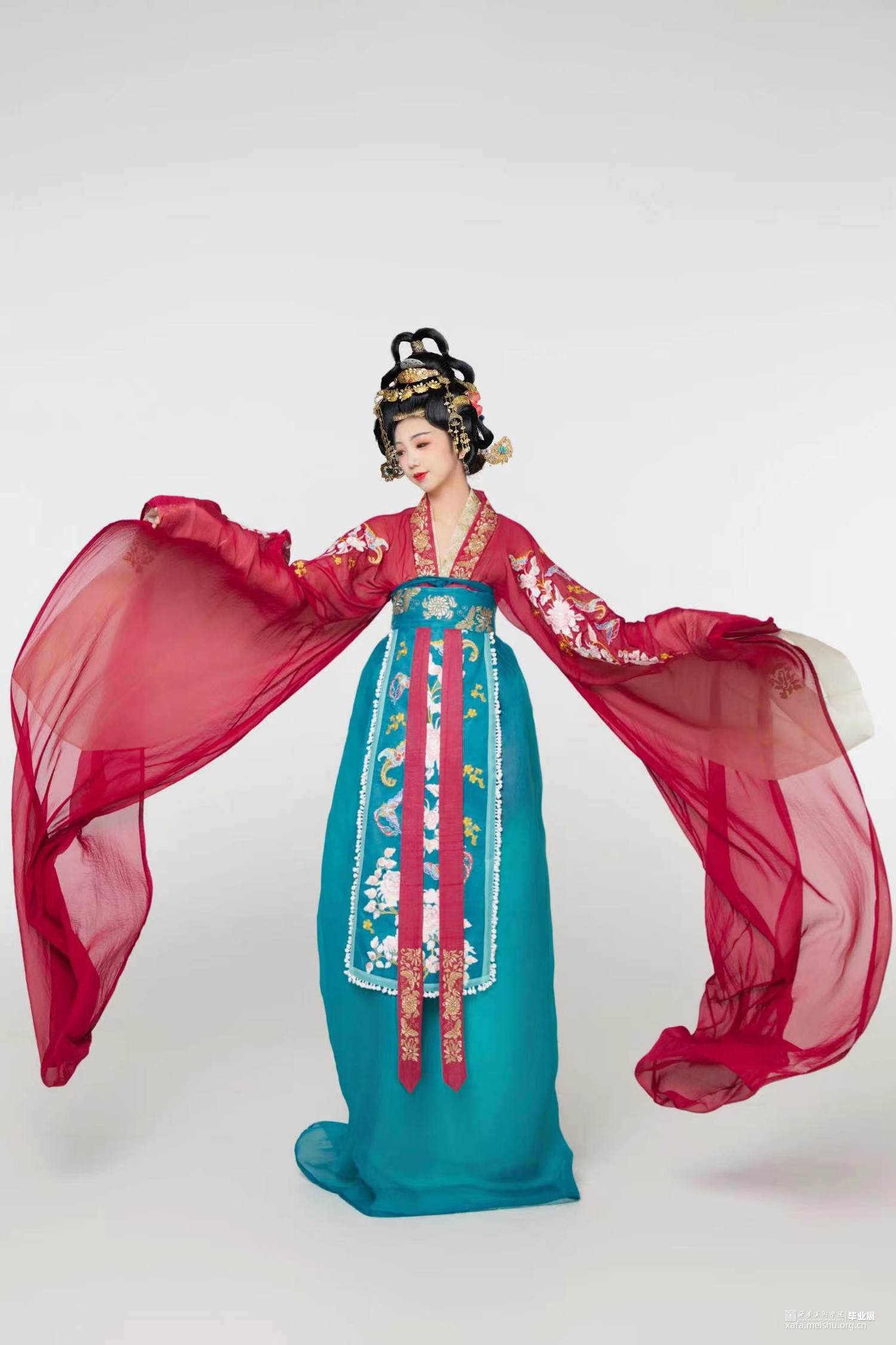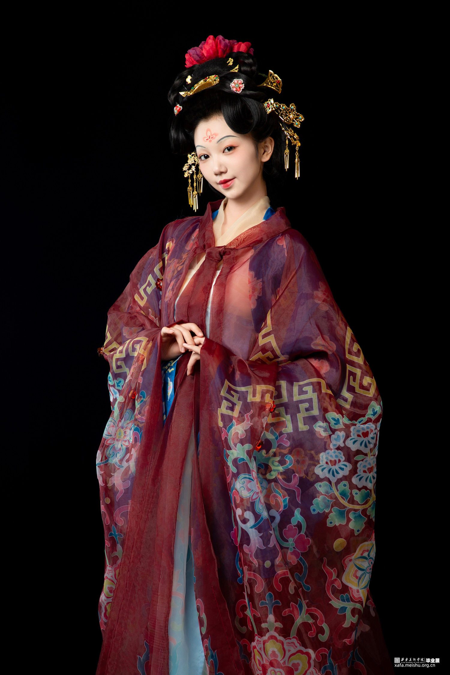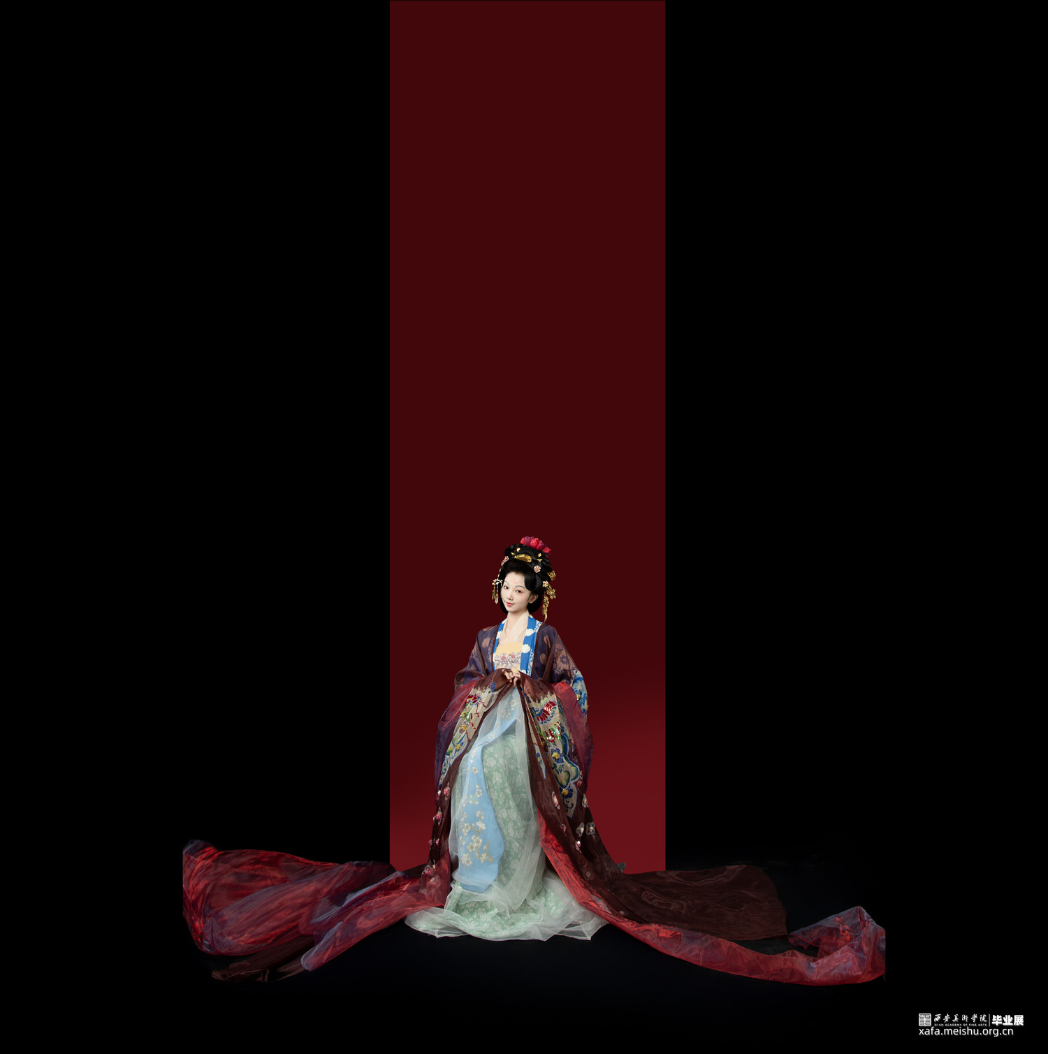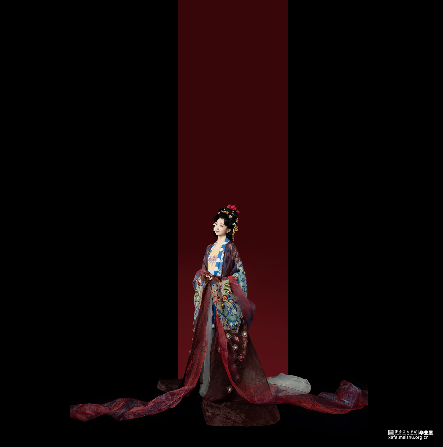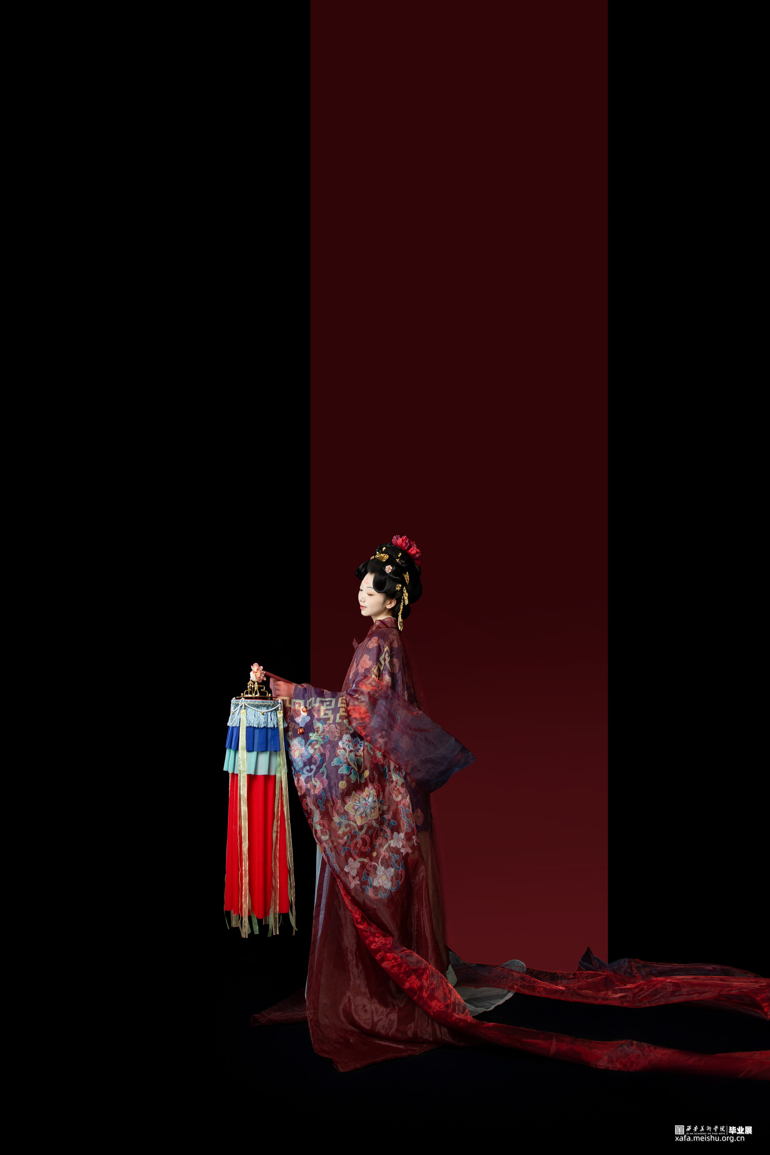 唐代妇女服饰,以众多的款式,艳丽的色调,典雅华美的风格,成为唐文化的重要标志。根据唐代女性婚礼服饰进行复原,形制借鉴唐代敦煌壁供养人壁画、皇后袆衣、贵族女子、史料记载及画卷等,有牡丹纹、宝相花、团花纹、海棠花及蝴蝶等纹样,通过刺绣、珠片刺绣、印花工艺展现唐代女性的“钗钿礼衣”,热烈喜庆。