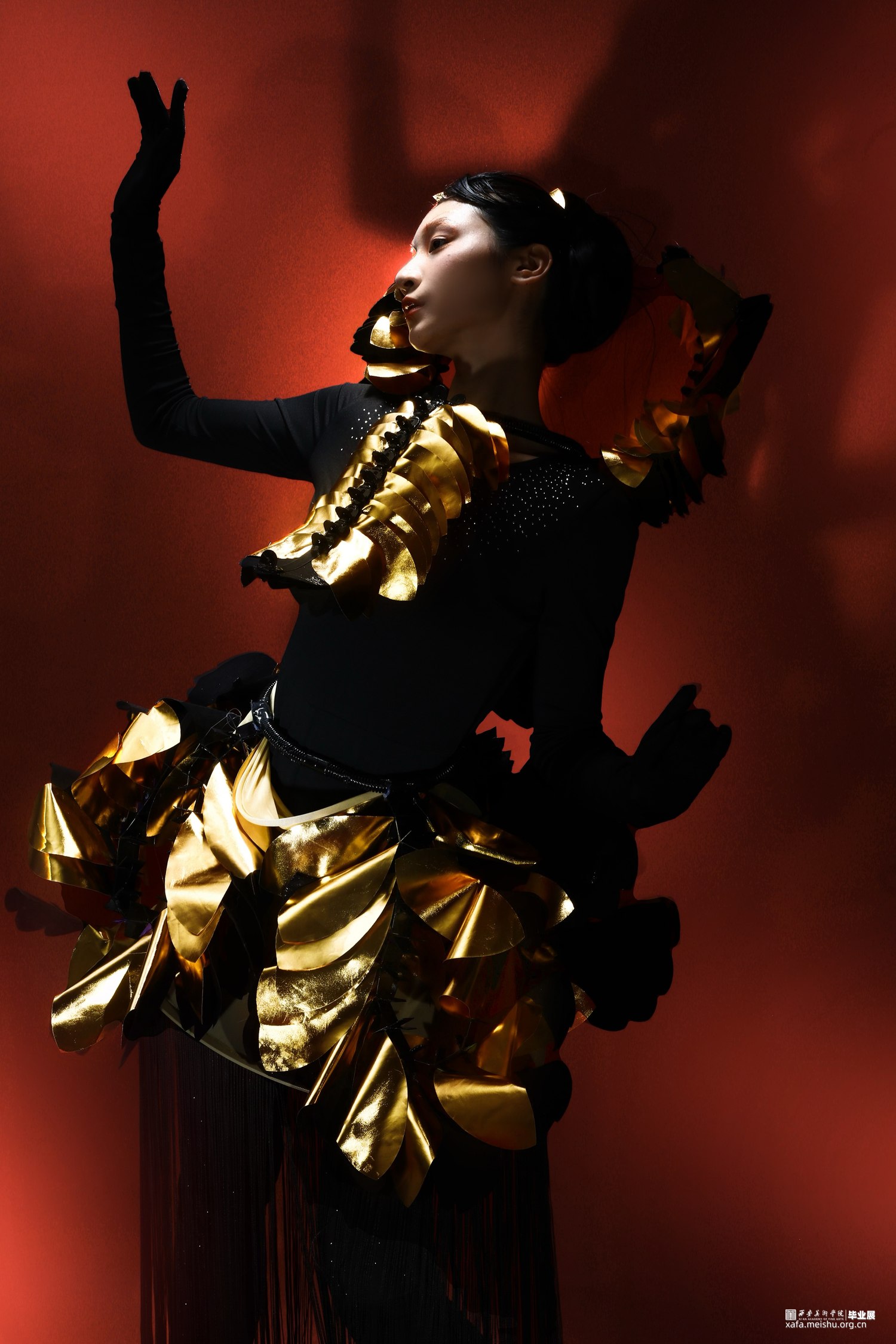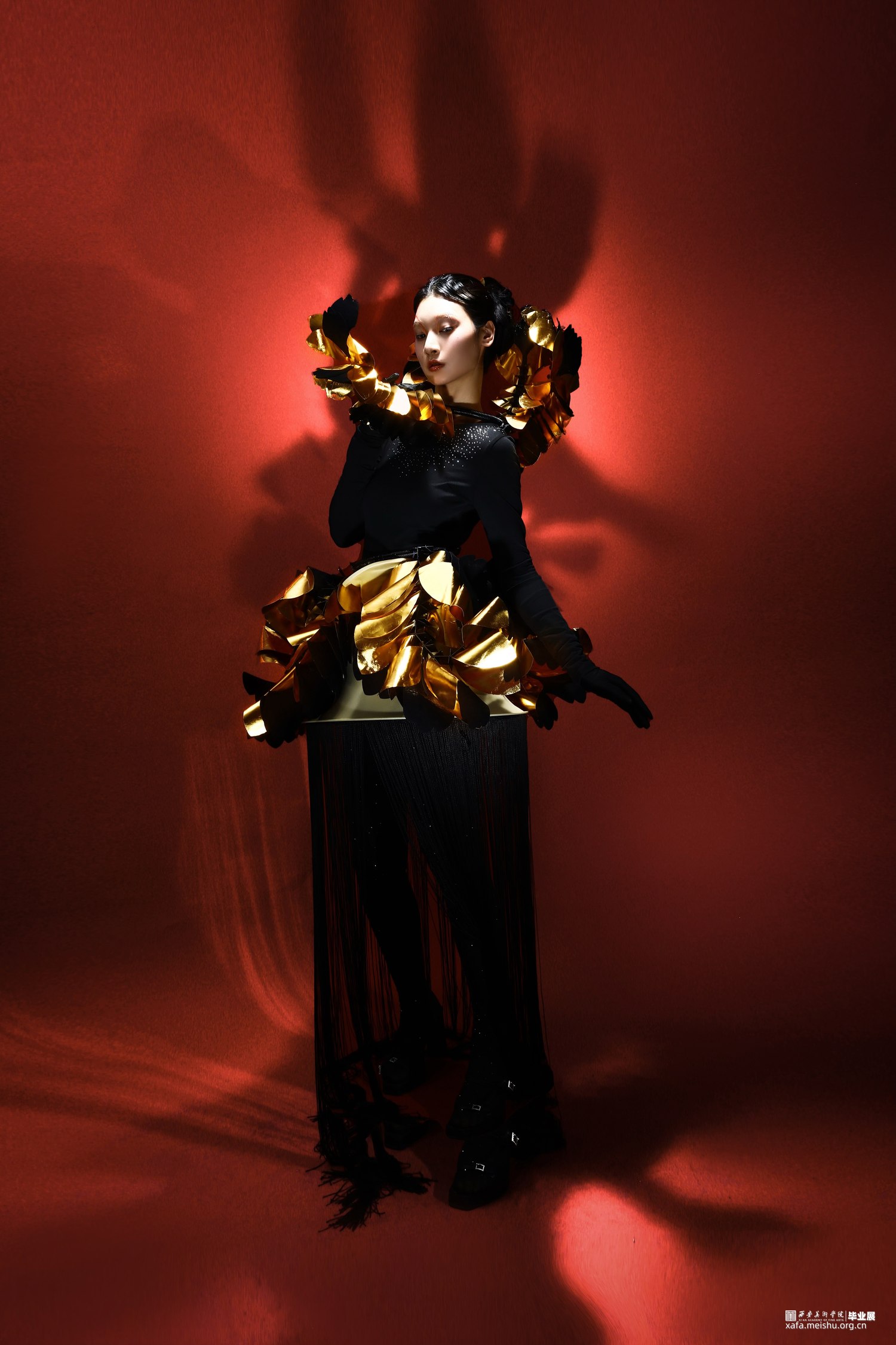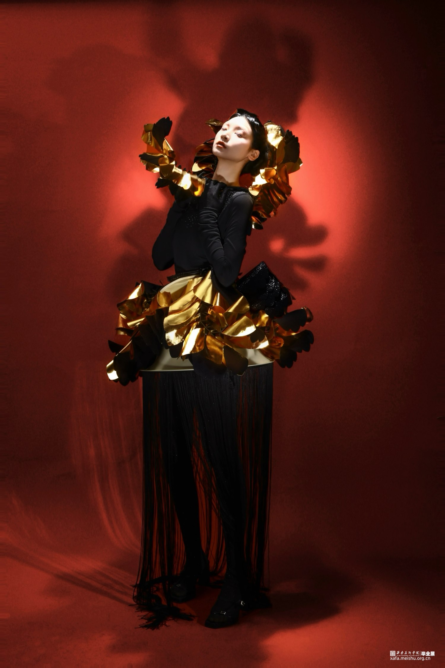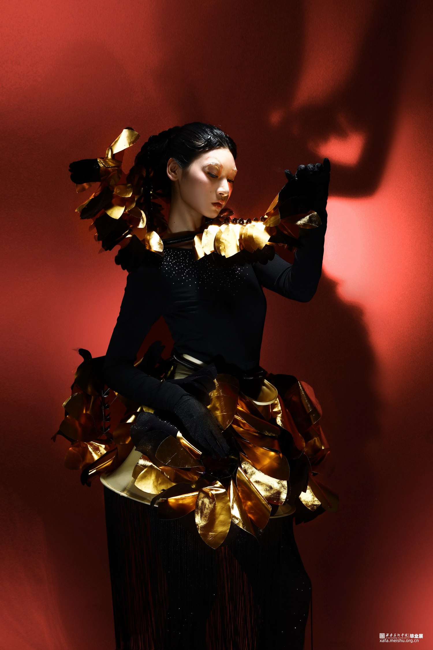 这款设计以花瓣为主要灵感,通过机动装置让片状的结构可以自由张合,如同花朵绽放一般。花瓣的开合象征着个体在面对外界批评时,勇敢迎接挑战、绽放真实自我的过程。黑色的基底象征着外界的批评与质疑,而金色的花瓣则代表着每次绽放时展现出的勇气与光芒。层叠的金色片状亦如同铠甲,保护着内心的脆弱,同时也展现了面对批评时的无畏姿态。两者形成强烈的视觉对比,传递出无畏的精神和力量。