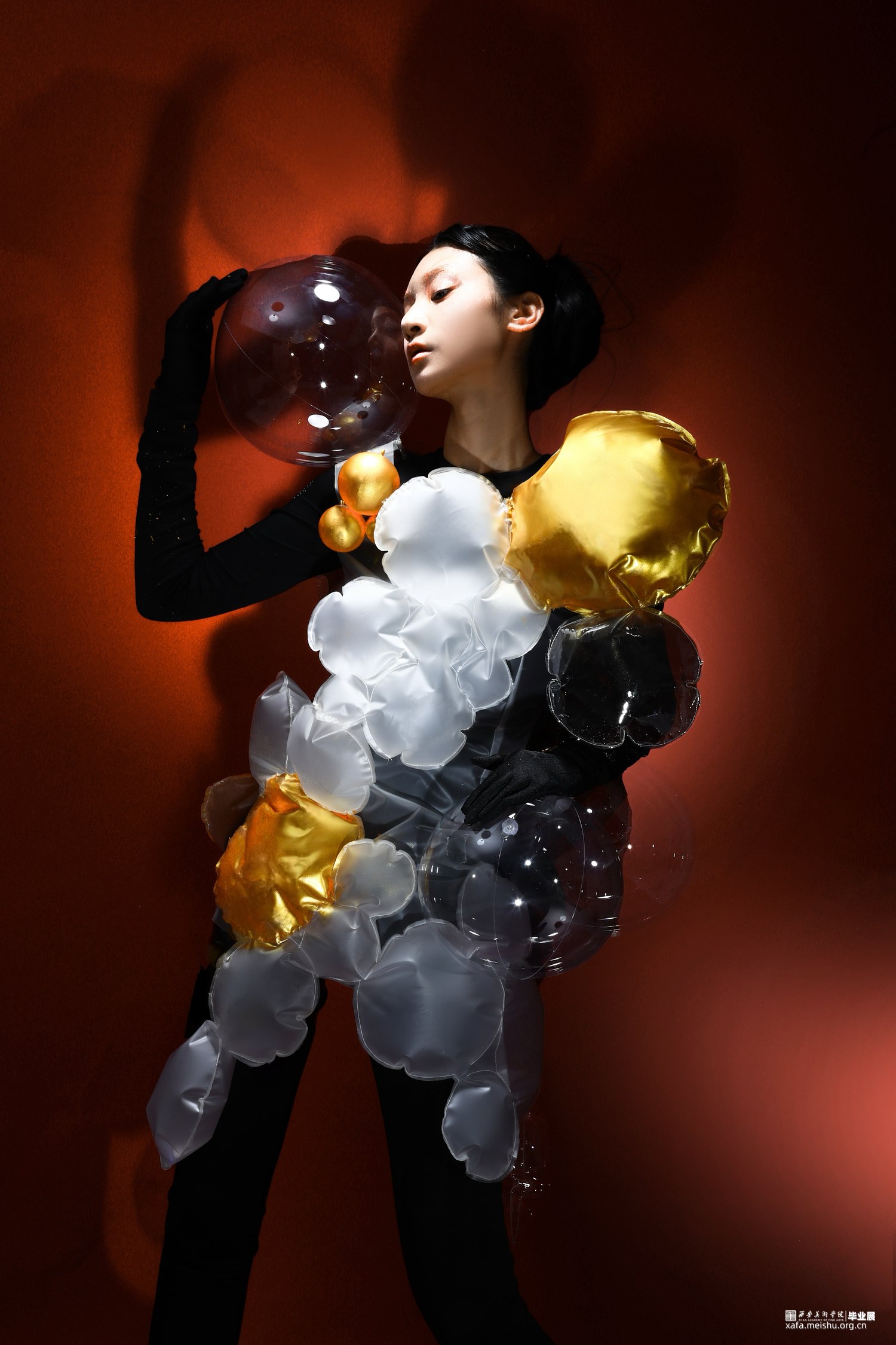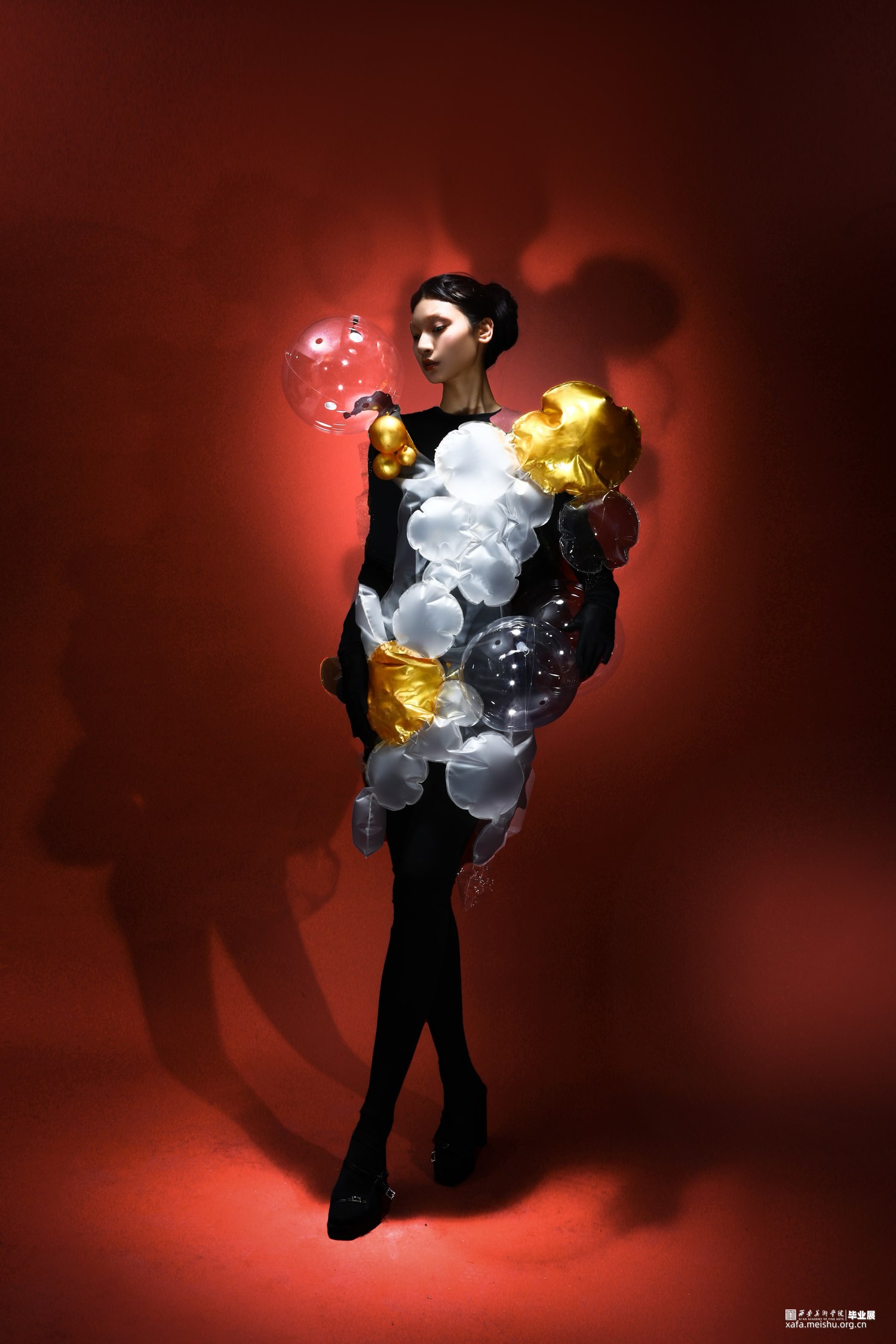 这款设计利用气囊作为主要装置,气囊如呼吸般收缩膨胀,仿佛在进行有节奏的呼吸。黑色的基底象征着外界的批评与质疑,透明的气球象征着纯净和珍贵的勇气,轻盈且充满幻想,而金色气囊则代表了自我接纳后内心的光芒。气囊的律动不仅展现了生命的韵律,更象征着在面对外界压力时,个体不断调节自我、保持内心平衡和真实的过程。