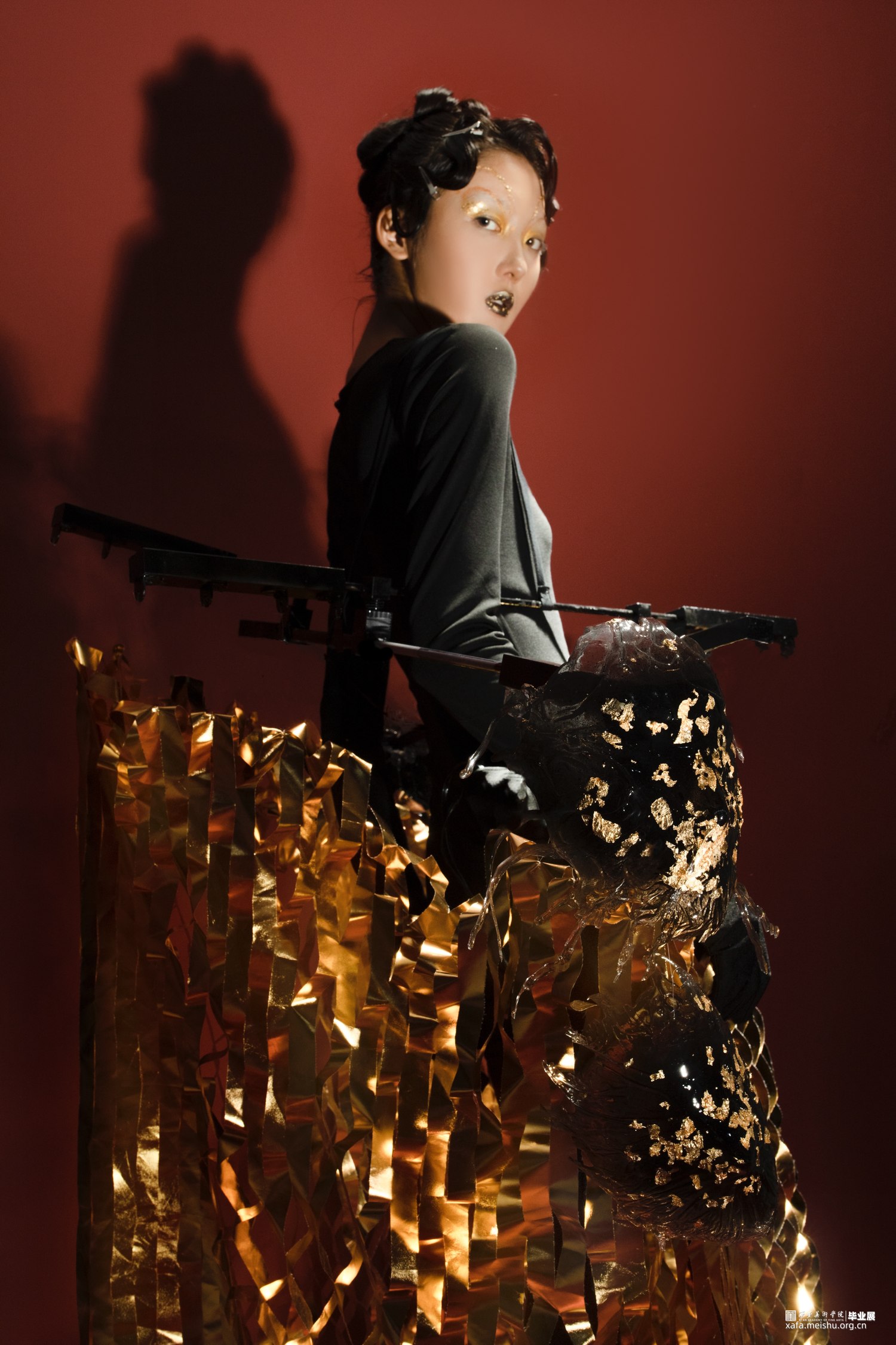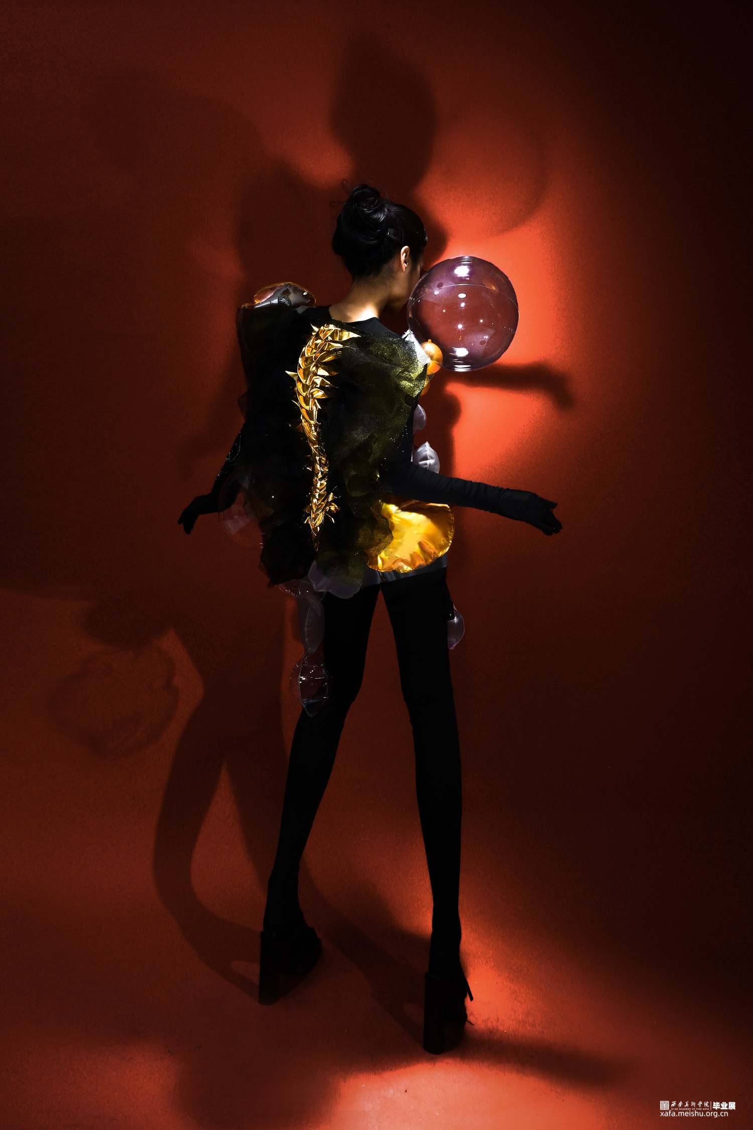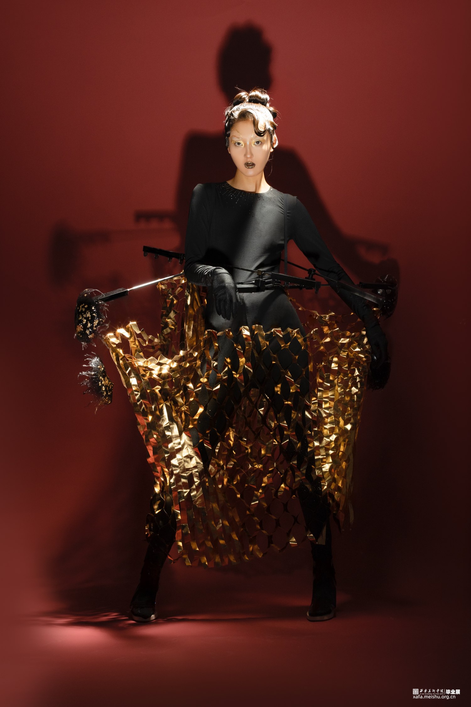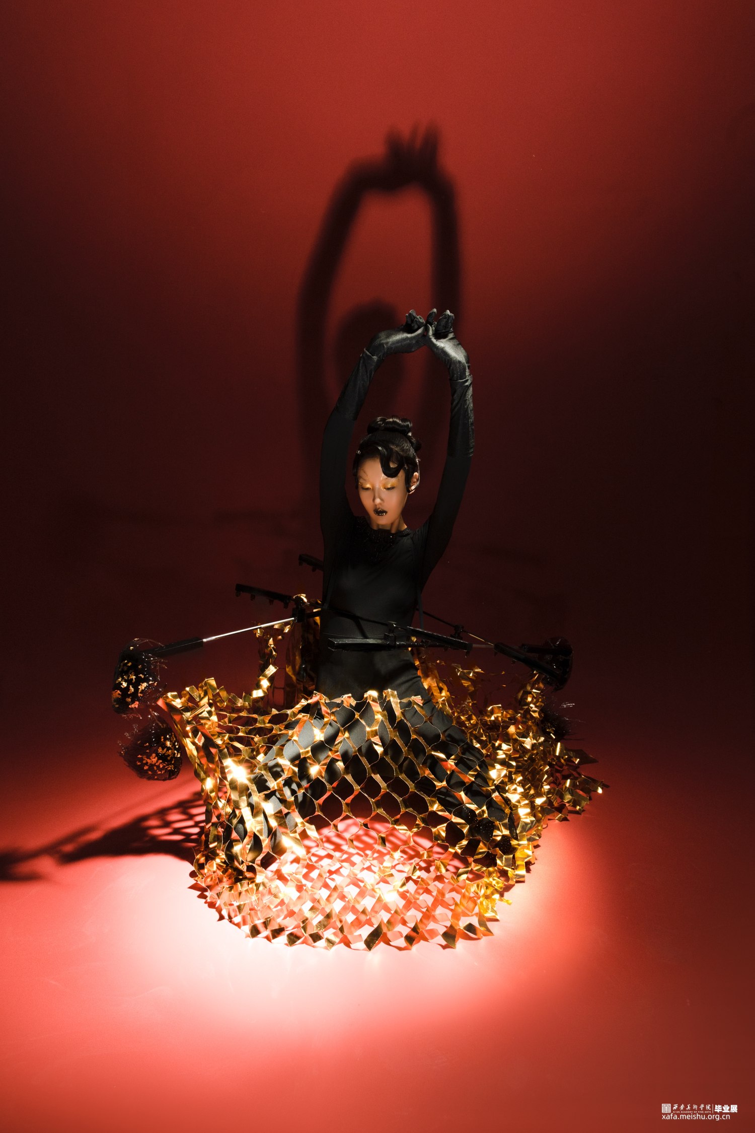 这款设计使用丝杆作为主要装置,并通过丝杆的伸缩运动使网眼大小进行不断变化。网状结构开合所产生的黑色漏洞代表外界复杂多变的社会关系与批评,而金色线条则象征自我内心的坚韧和光辉。随着丝杆的运作,网眼在不断变化,象征着个体在与外界接触和交织过程中,如何保持自我、不断调整以适应外界的挑战和变化。