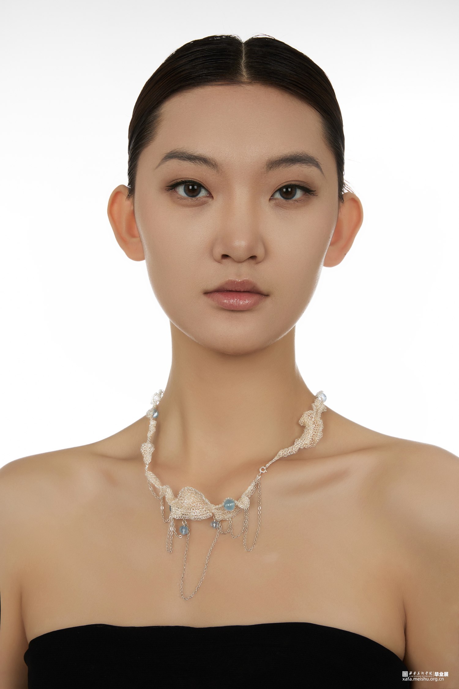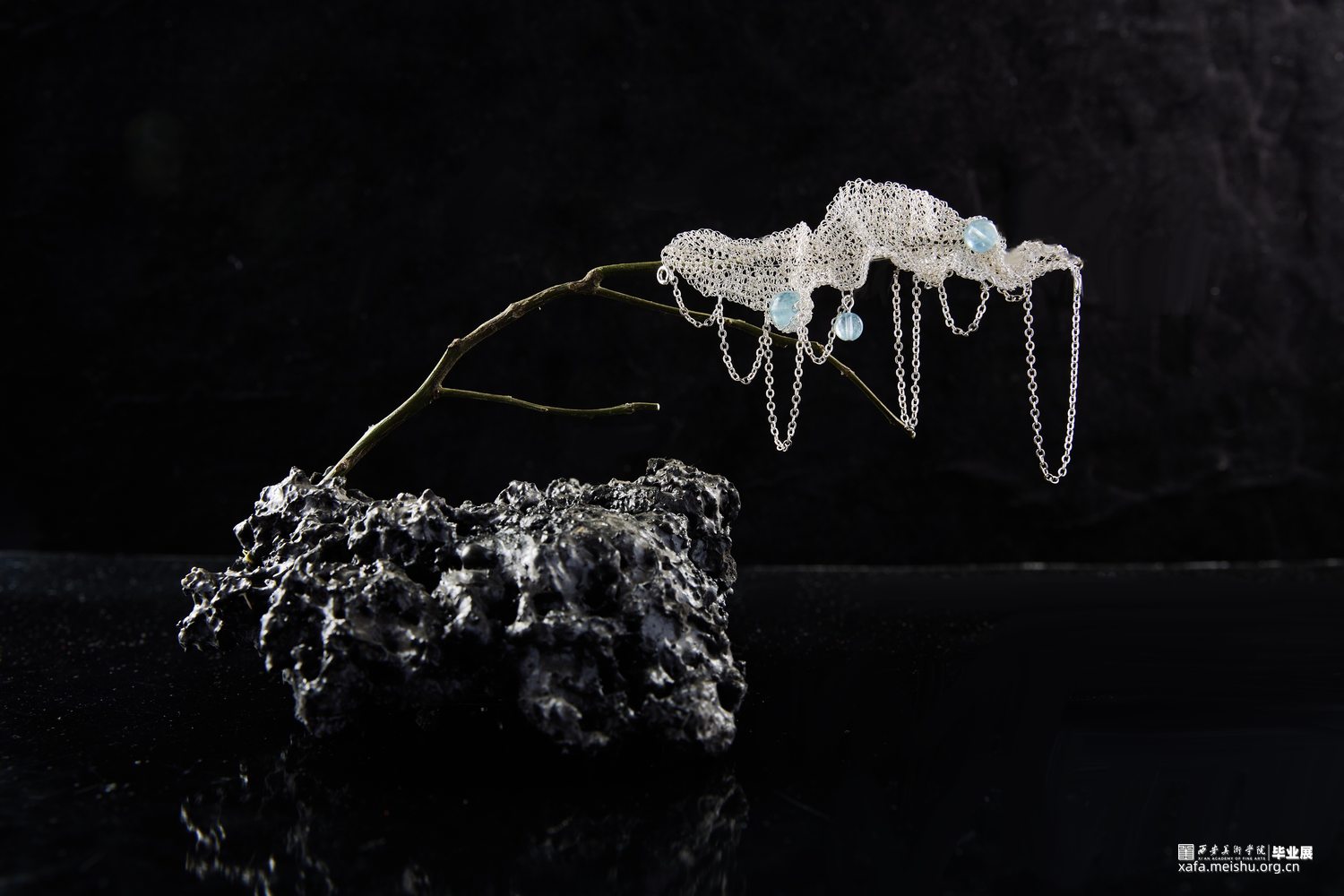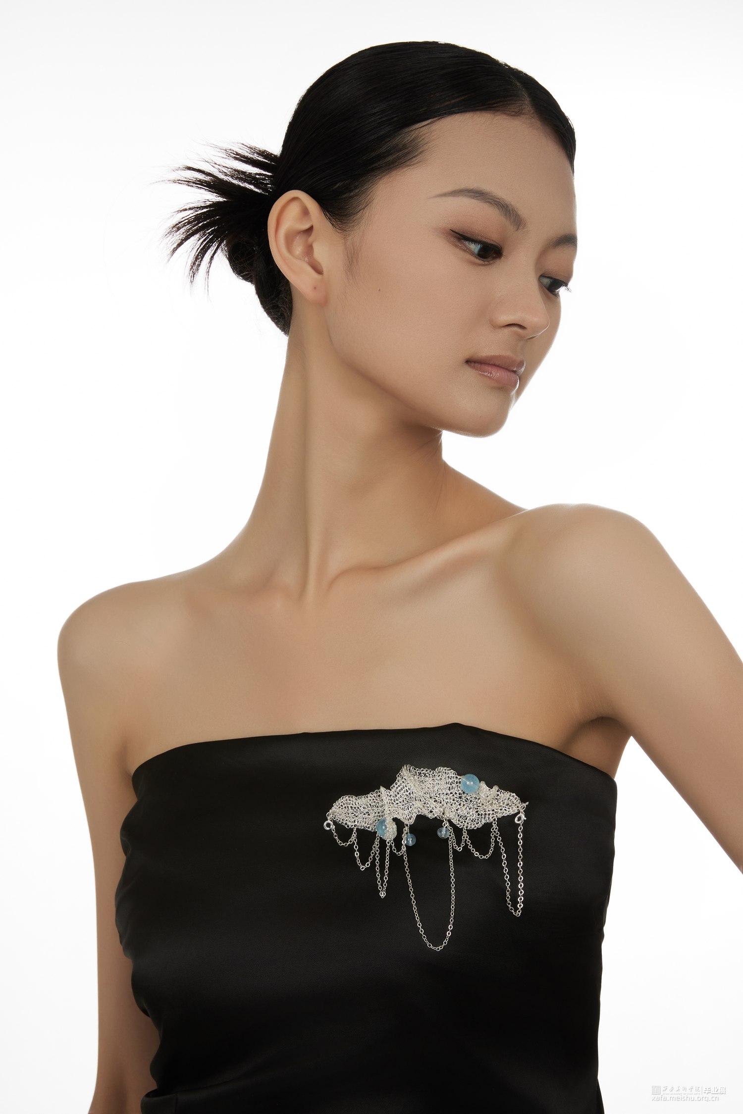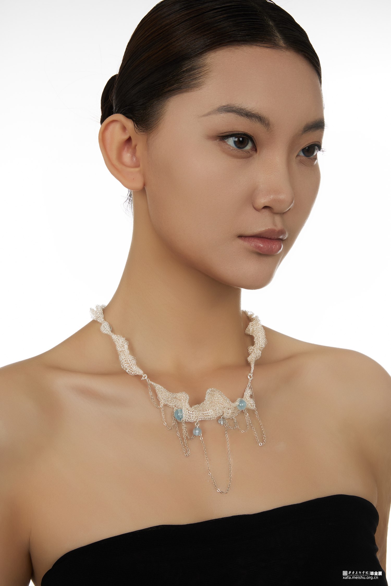 作品以徂(cú)川这一意象作为灵感。徂川意为流水,亦比喻流逝的岁月。出自诗人李白的《月夜江行寄崔员外宗之》一诗:“归路方浩浩,徂川去悠悠。”设计则通过金属编织工艺来体现水的流动感,结合透色和水蓝色的综合材料体现水流的通透,结构上使用金属丝包裹住透色珠子来表达时间可以静止,心中所念所想的时光得以留存。