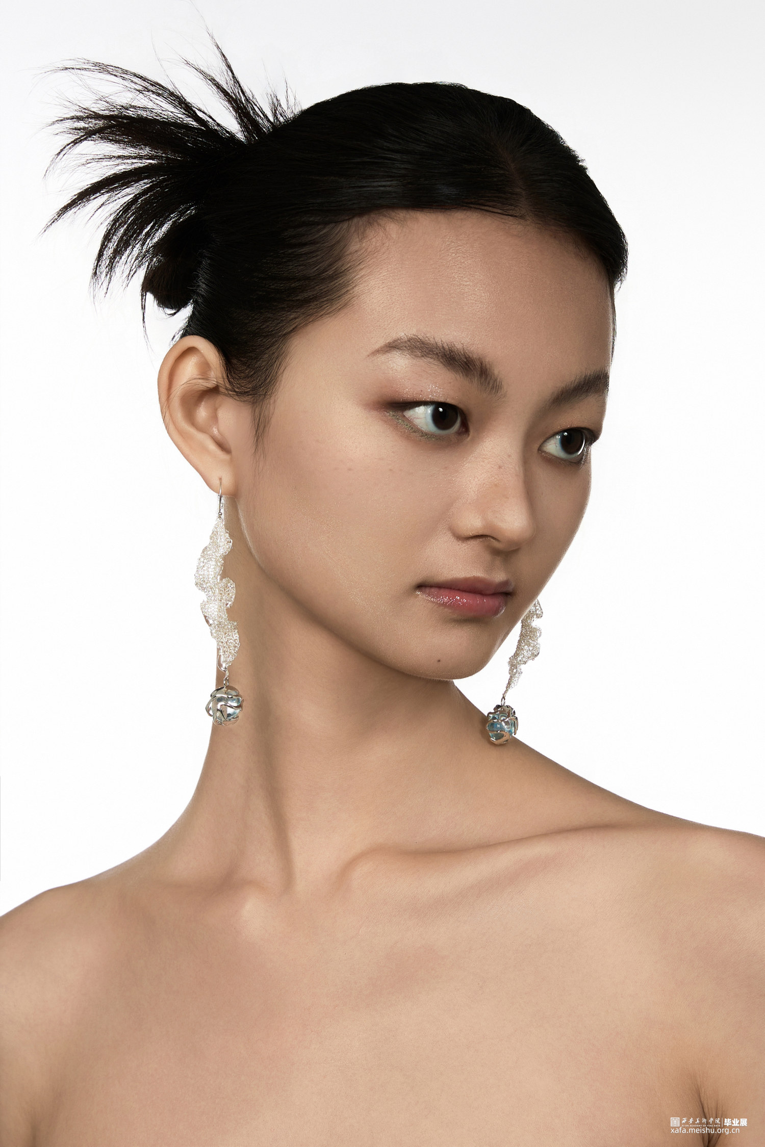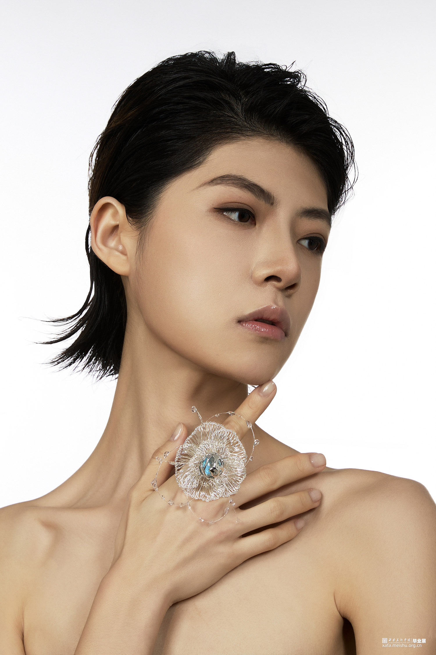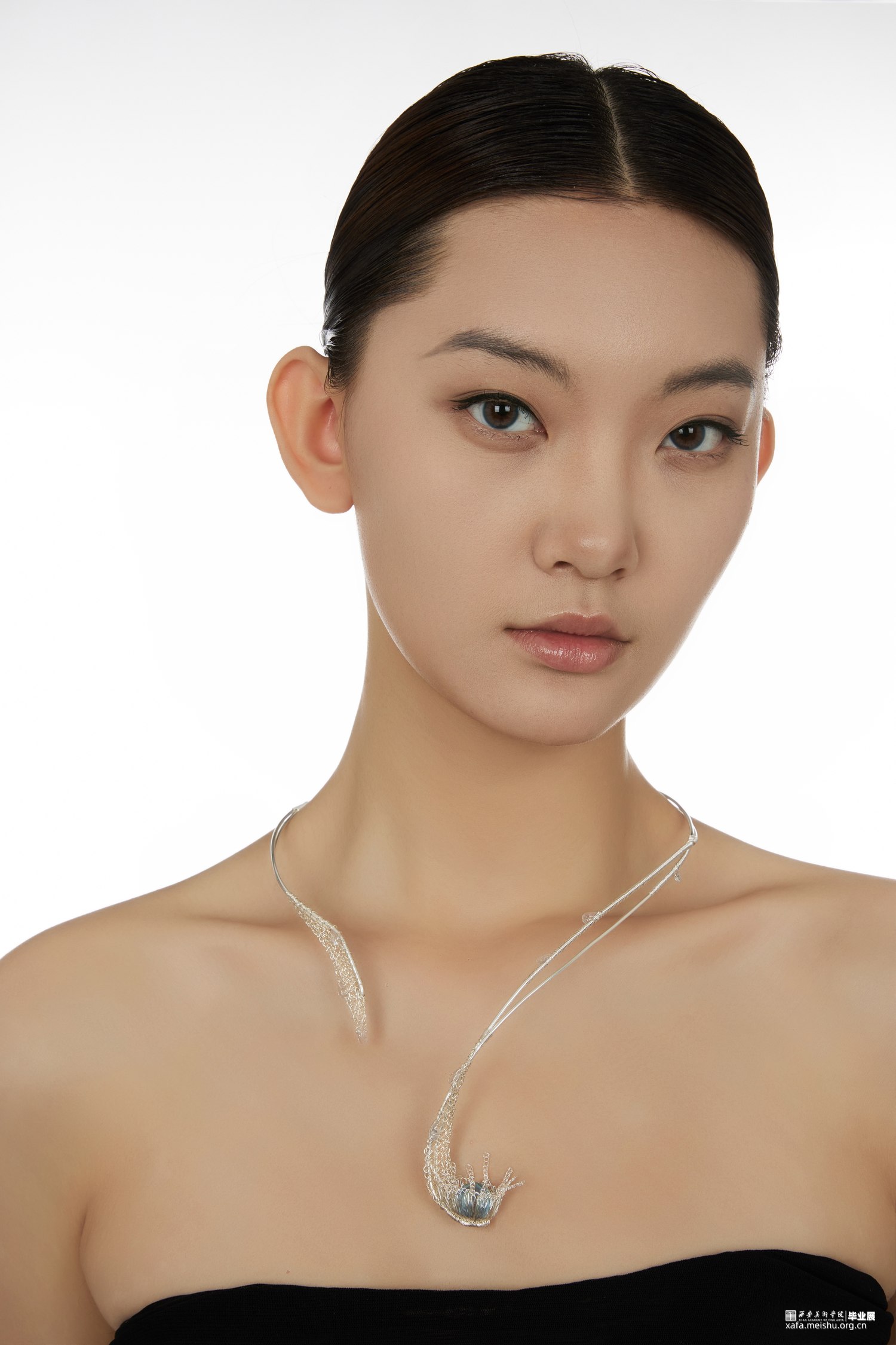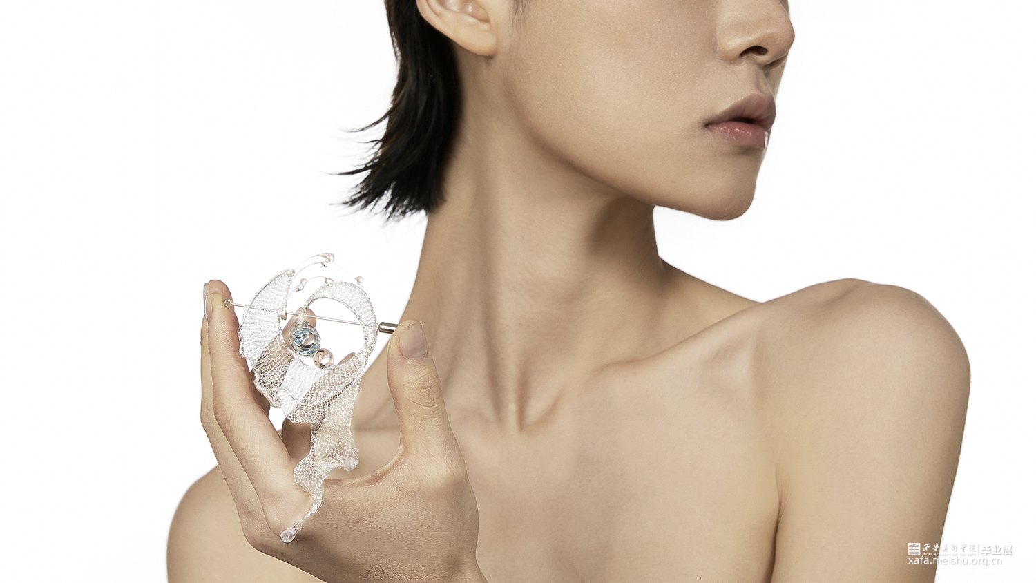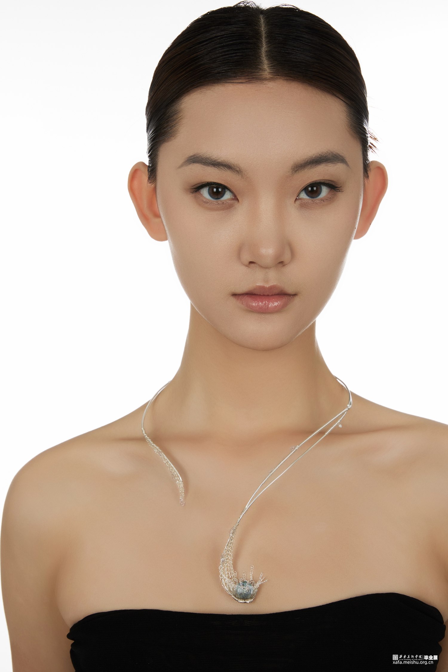 作品以徂(cú)川这一意象作为灵感。徂川意为流水,亦比喻流逝的岁月。出自诗人李白的《月夜江行寄崔员外宗之》一诗:“归路方浩浩,徂川去悠悠。”设计则通过金属编织工艺来体现水的流动感,结合透色和水蓝色的综合材料体现水流的通透,结构上使用金属丝包裹住透色珠子来表达时间可以静止,心中所念所想的时光得以留存。