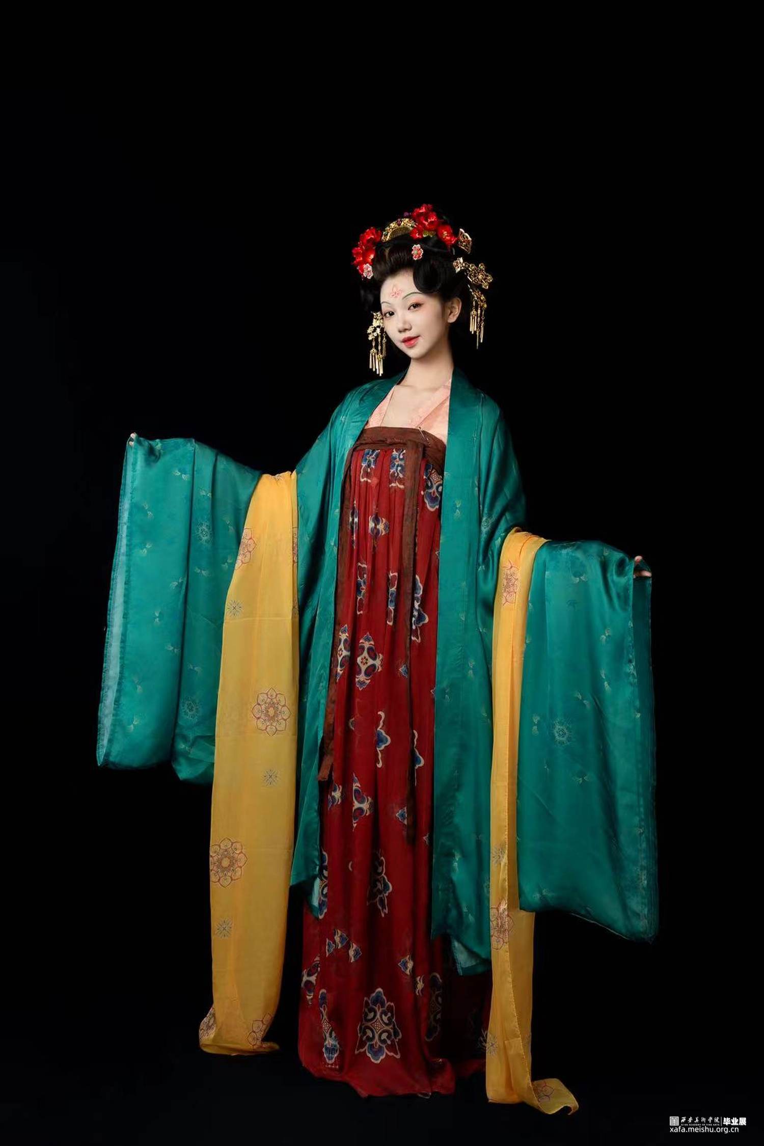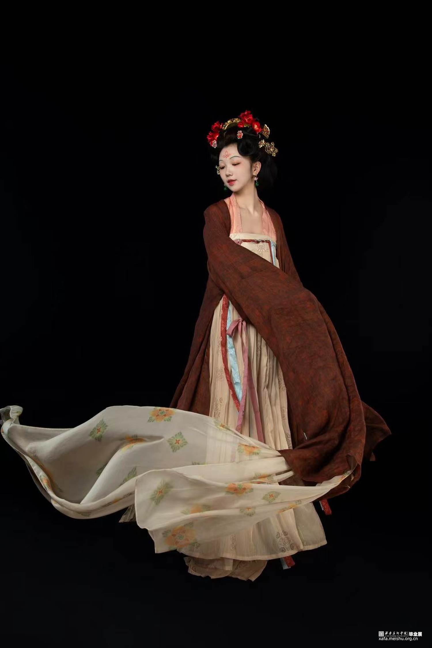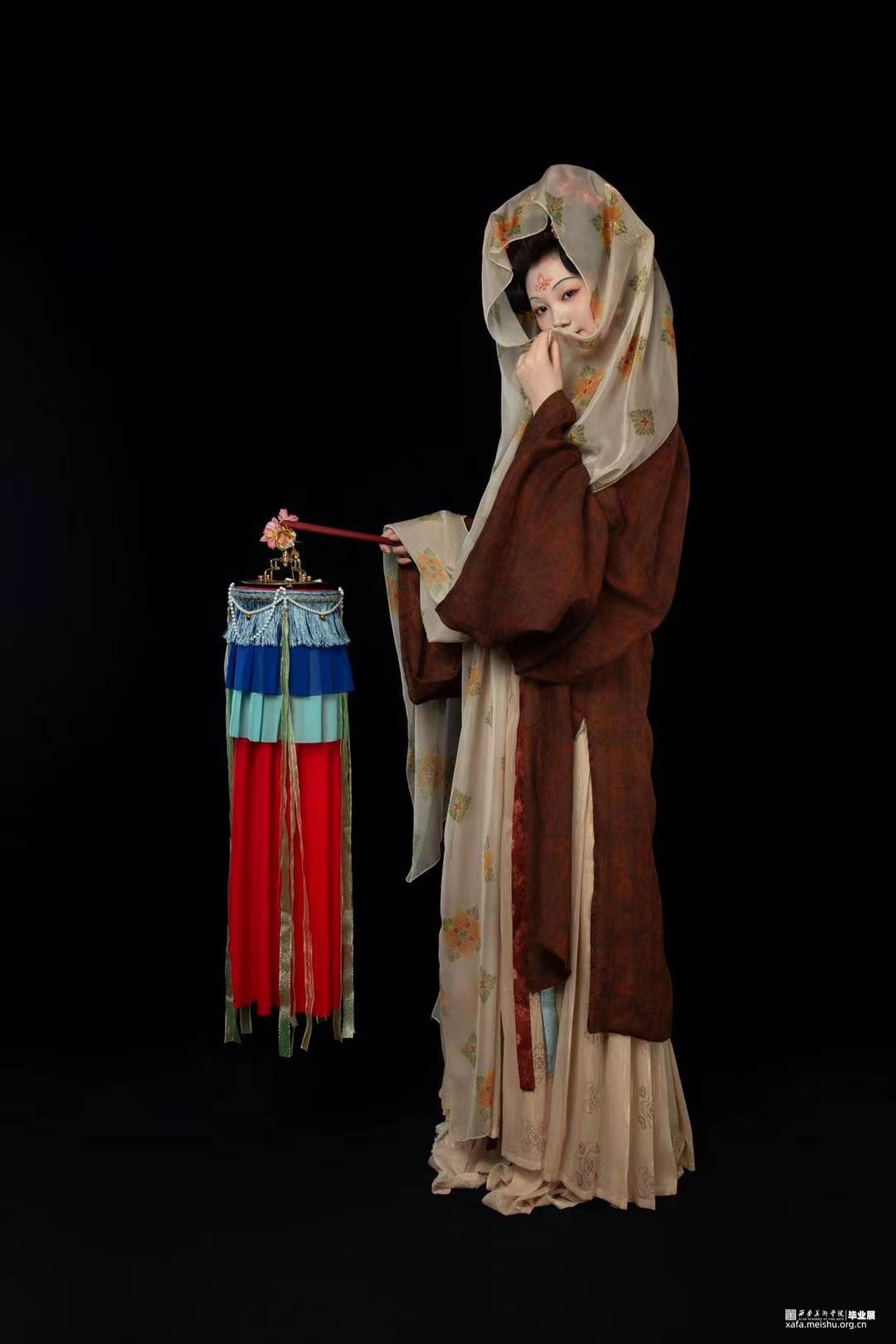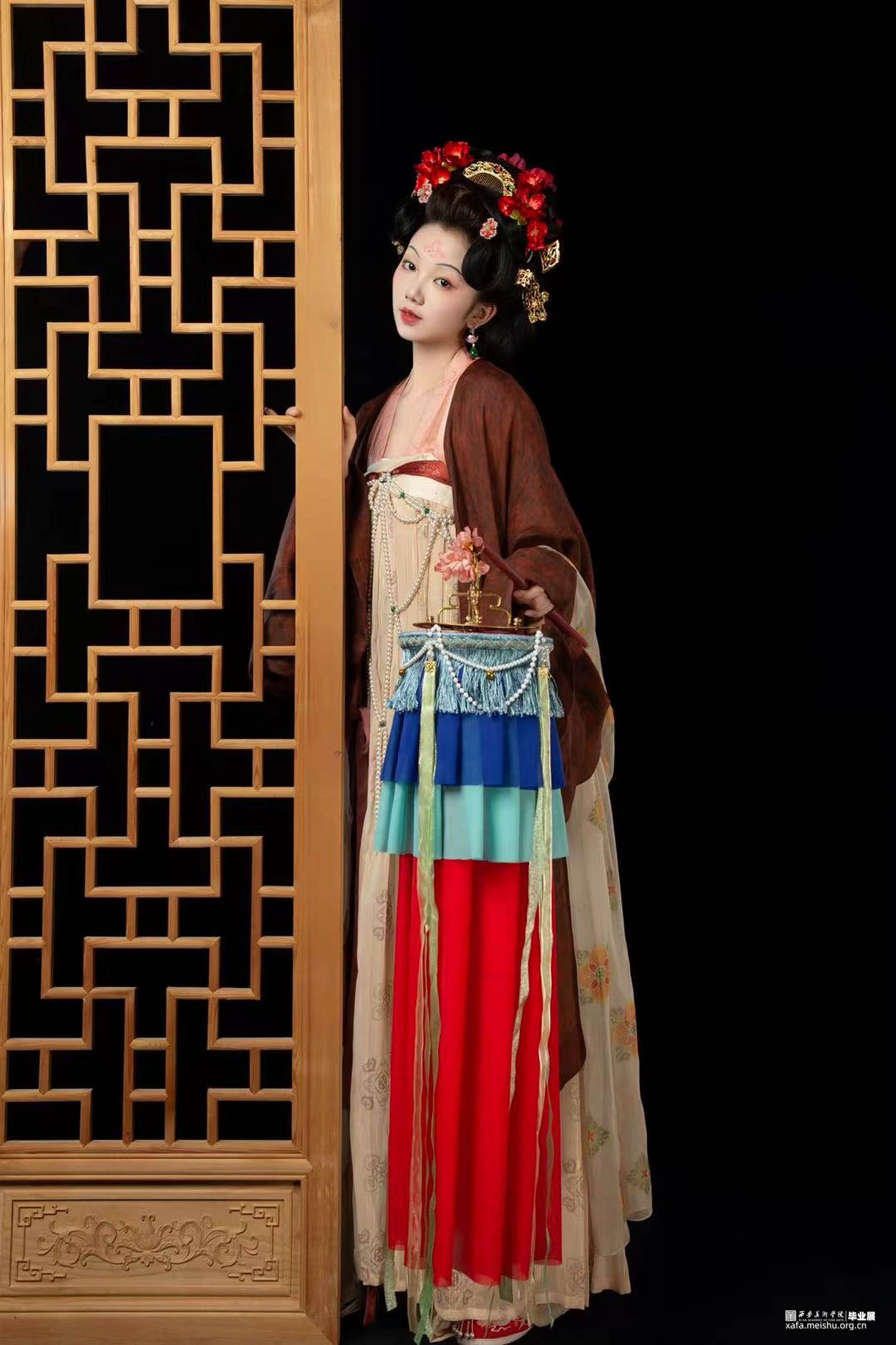 结合史料及敦煌壁画,推测复原唐代婚礼服饰作品。三套作品以贵族、平民为不同视角展现了唐朝人丰富的审美趣味。面料花纹采用了唐代经典的大团花、宝相花等图案,面料则采用了苎麻香云纱及天丝雪纺模仿画中柔软飘逸的质感,头饰方面采用了手工绒花及复原头冠展现不同婚礼审美,而模特手中的绛纱灯则是盛行于明清,始于唐朝的婚礼饰品。