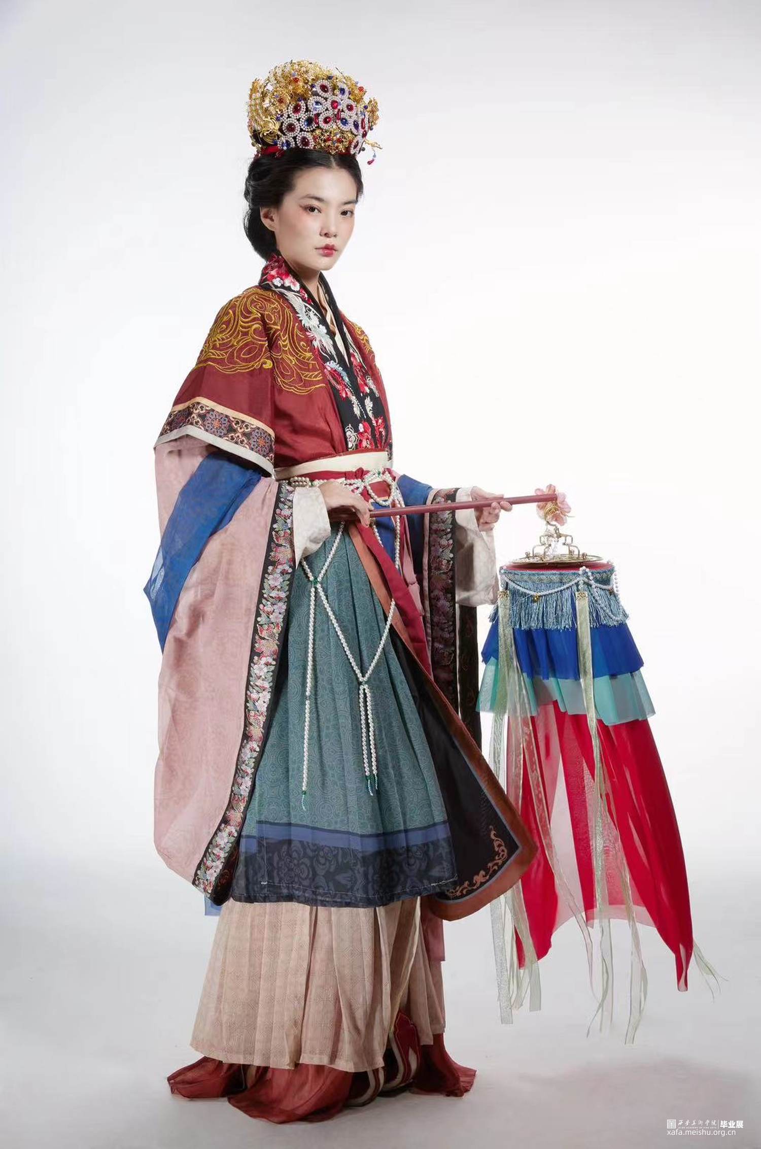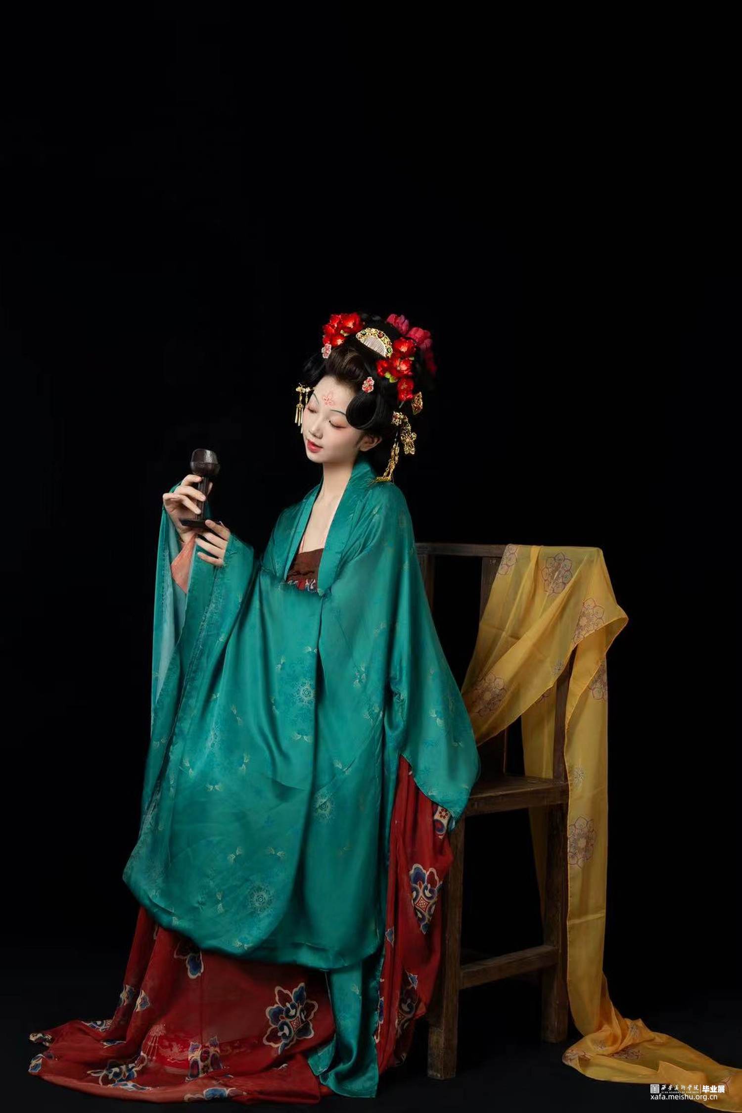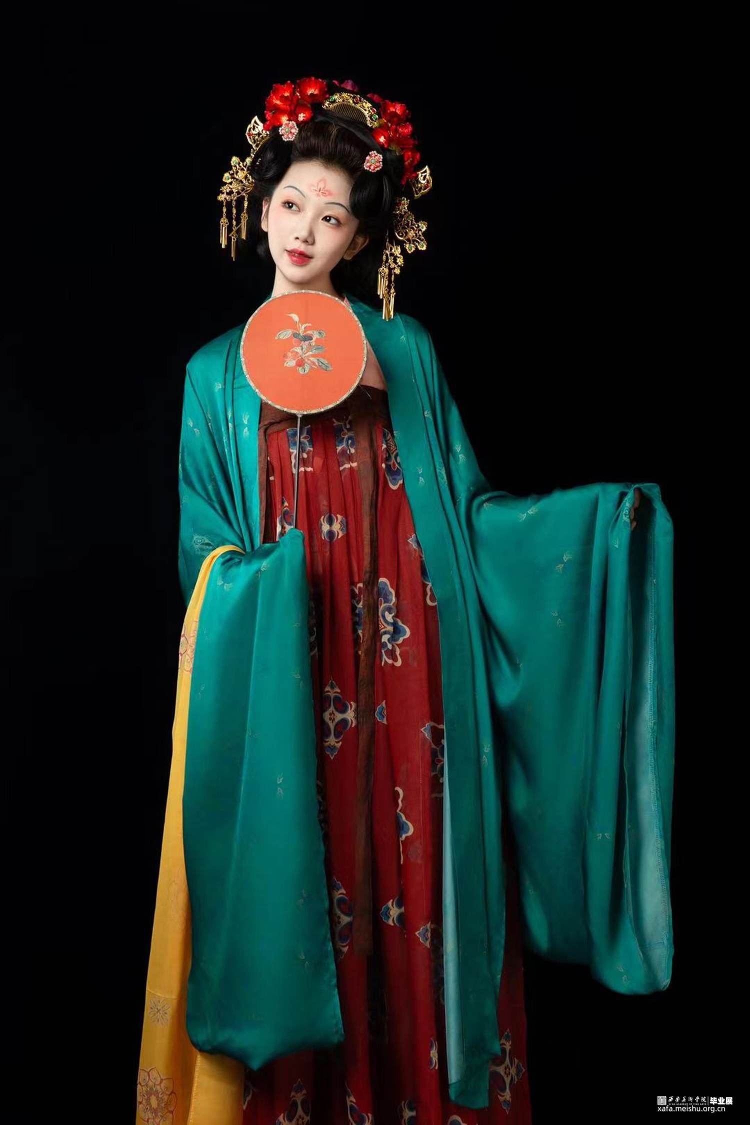 结合史料及敦煌壁画,推测复原唐代婚礼服饰作品。三套作品以贵族、平民为不同视角展现了唐朝人丰富的审美趣味。面料花纹采用了唐代经典的大团花、宝相花等图案,面料则采用了苎麻香云纱及天丝雪纺模仿画中柔软飘逸的质感,头饰方面采用了手工绒花及复原头冠展现不同婚礼审美,而模特手中的绛纱灯则是盛行于明清,始于唐朝的婚礼饰品。