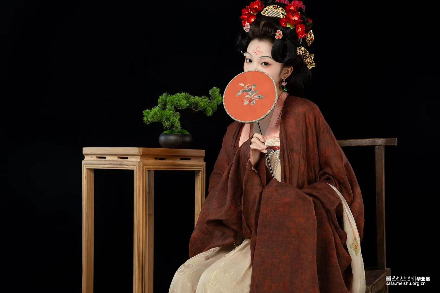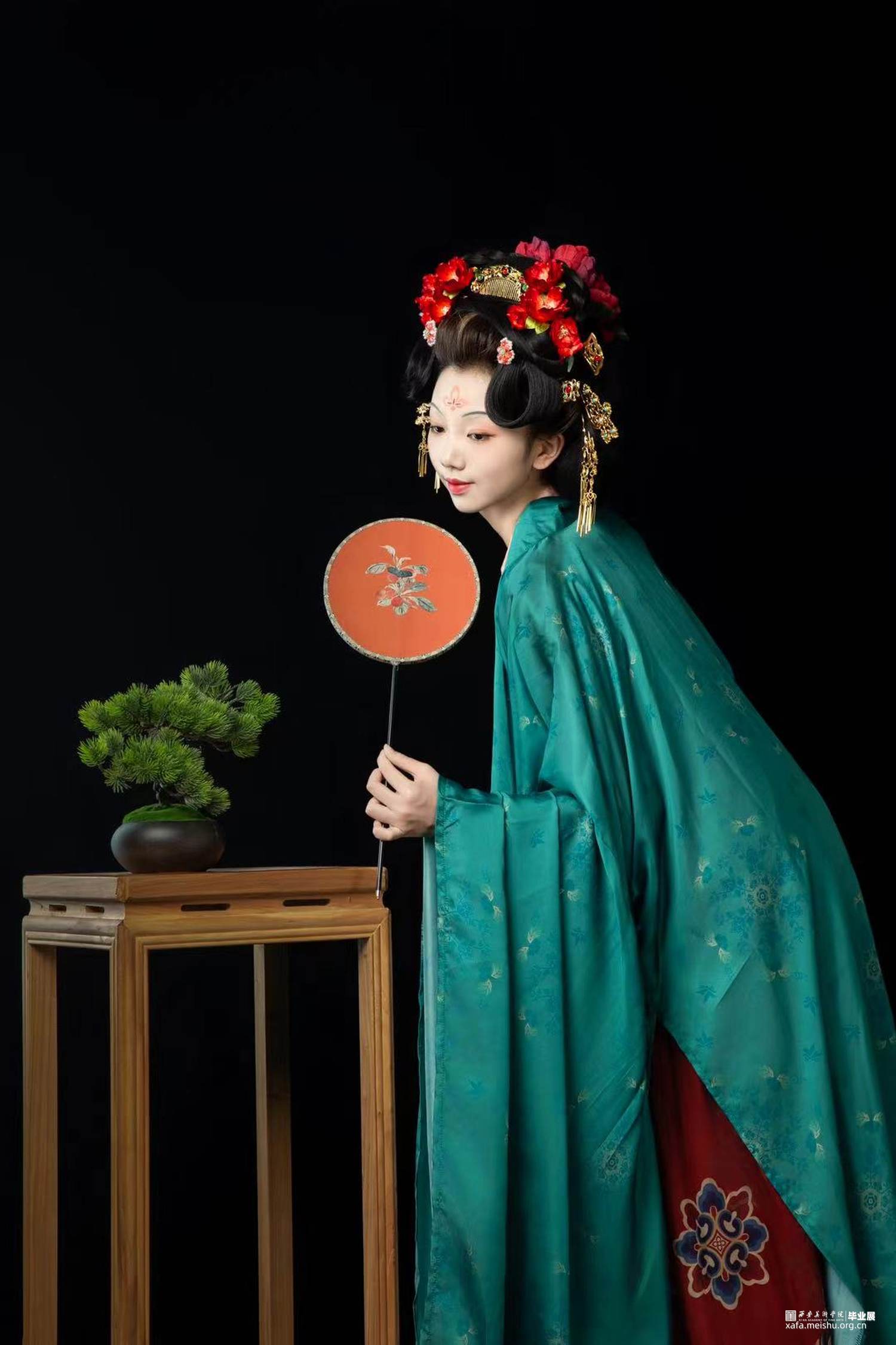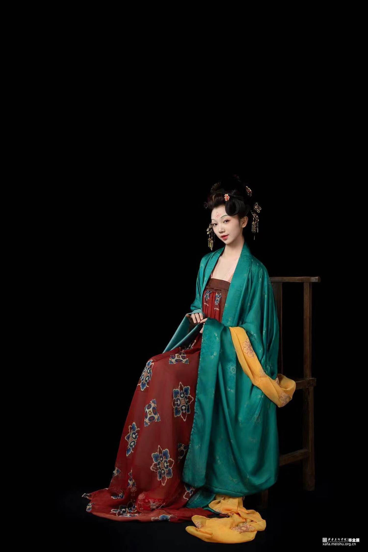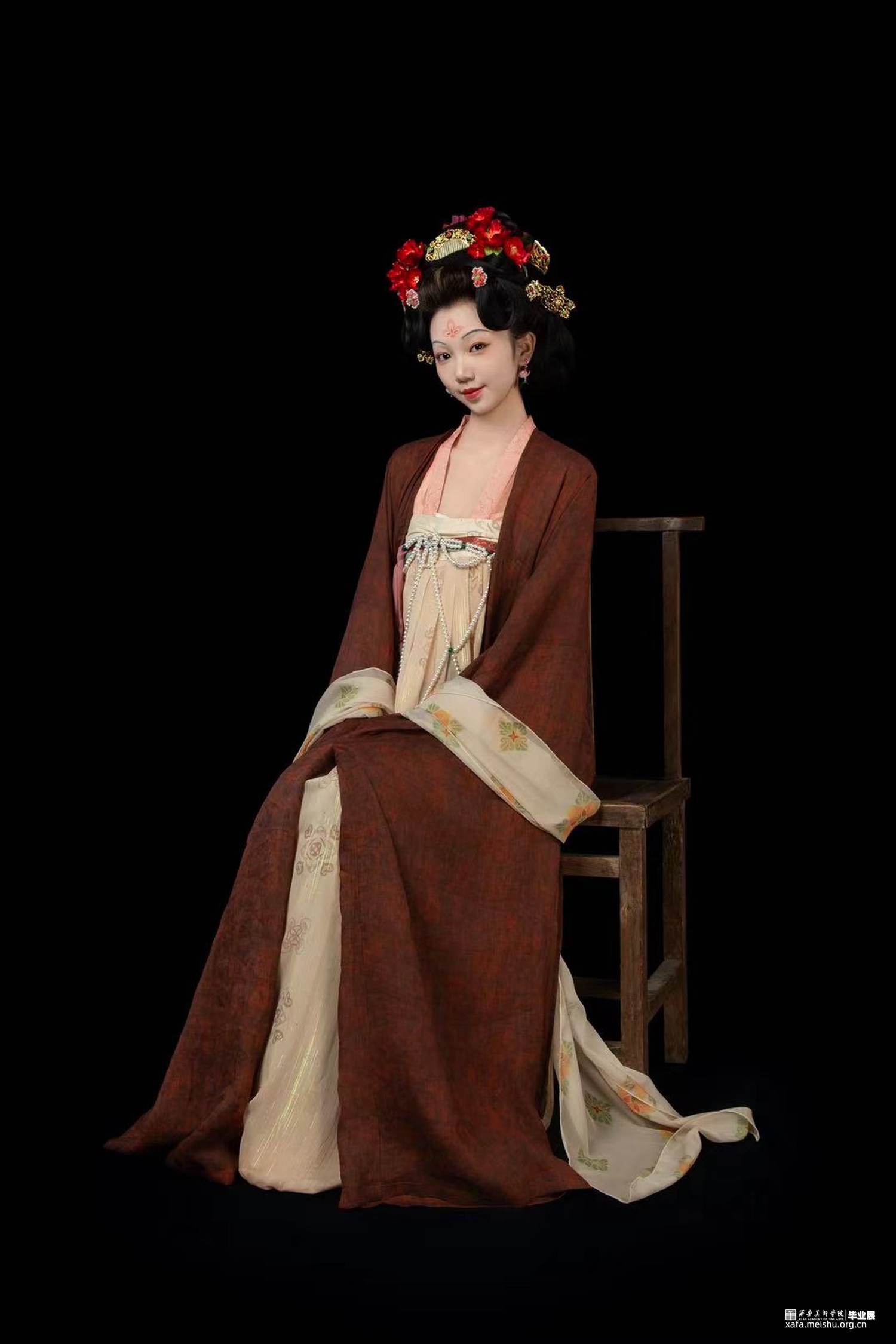 结合史料及敦煌壁画,推测复原唐代婚礼服饰作品。三套作品以贵族、平民为不同视角展现了唐朝人丰富的审美趣味。面料花纹采用了唐代经典的大团花、宝相花等图案,面料则采用了苎麻香云纱及天丝雪纺模仿画中柔软飘逸的质感,头饰方面采用了手工绒花及复原头冠展现不同婚礼审美,而模特手中的绛纱灯则是盛行于明清,始于唐朝的婚礼饰品。