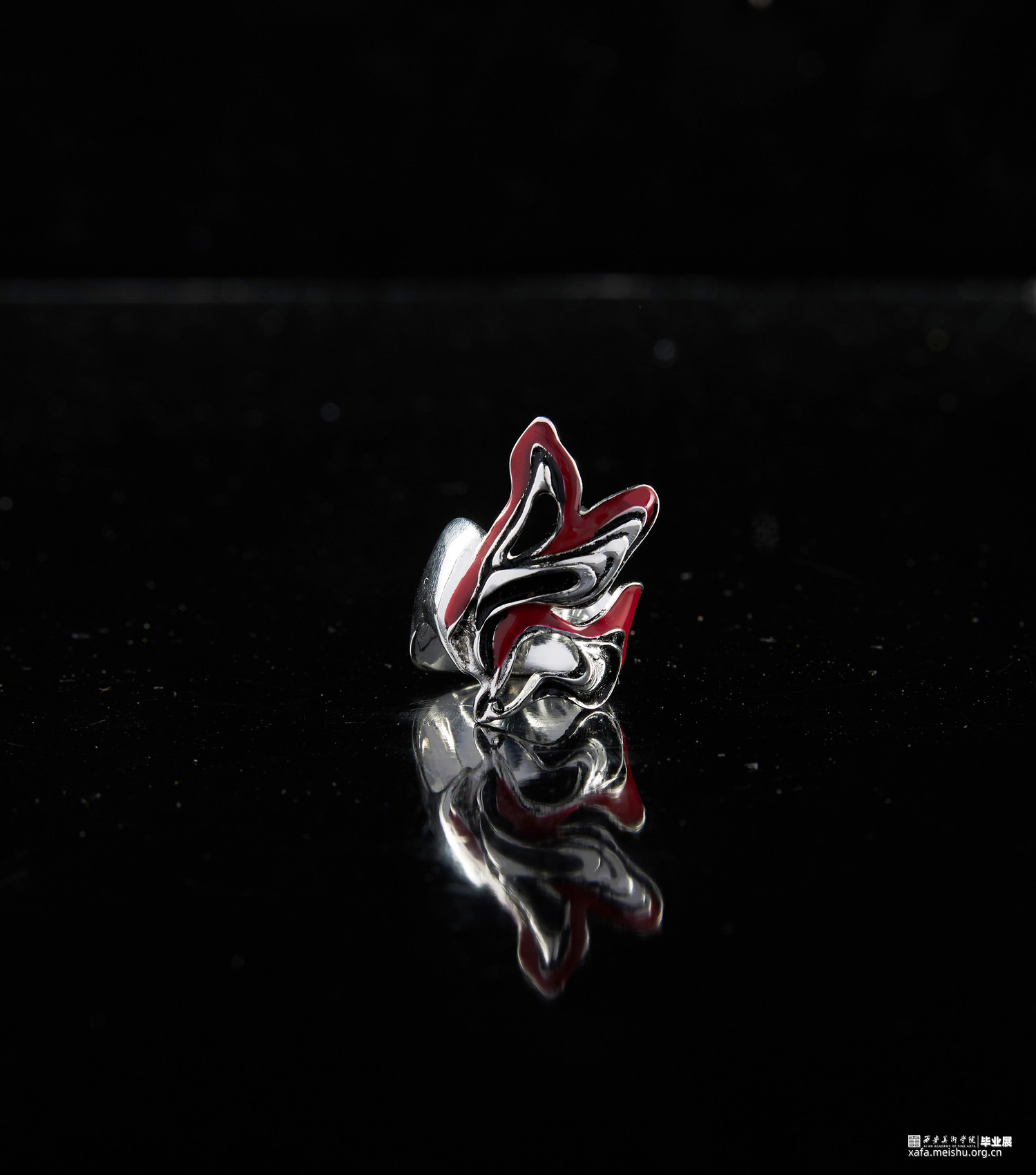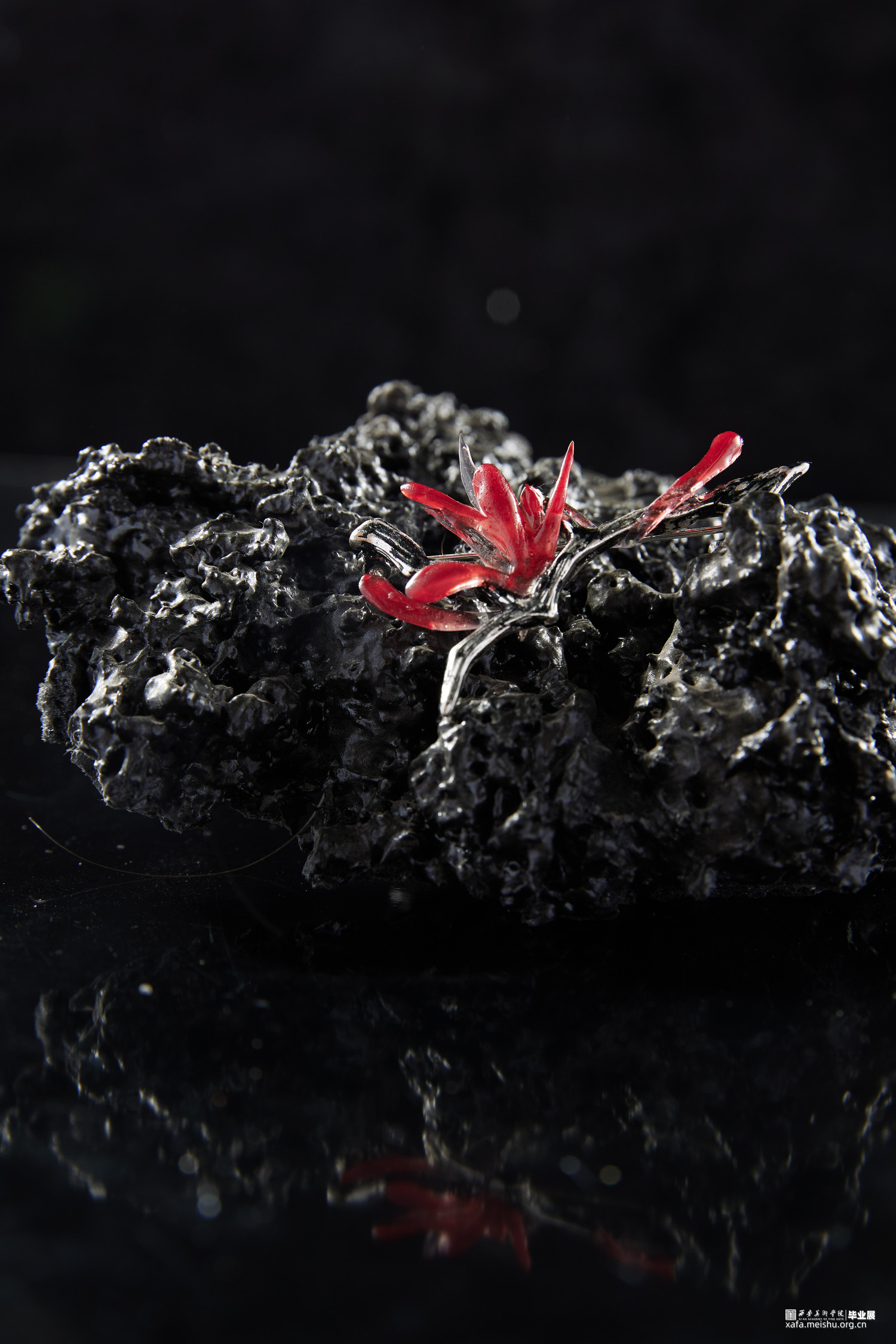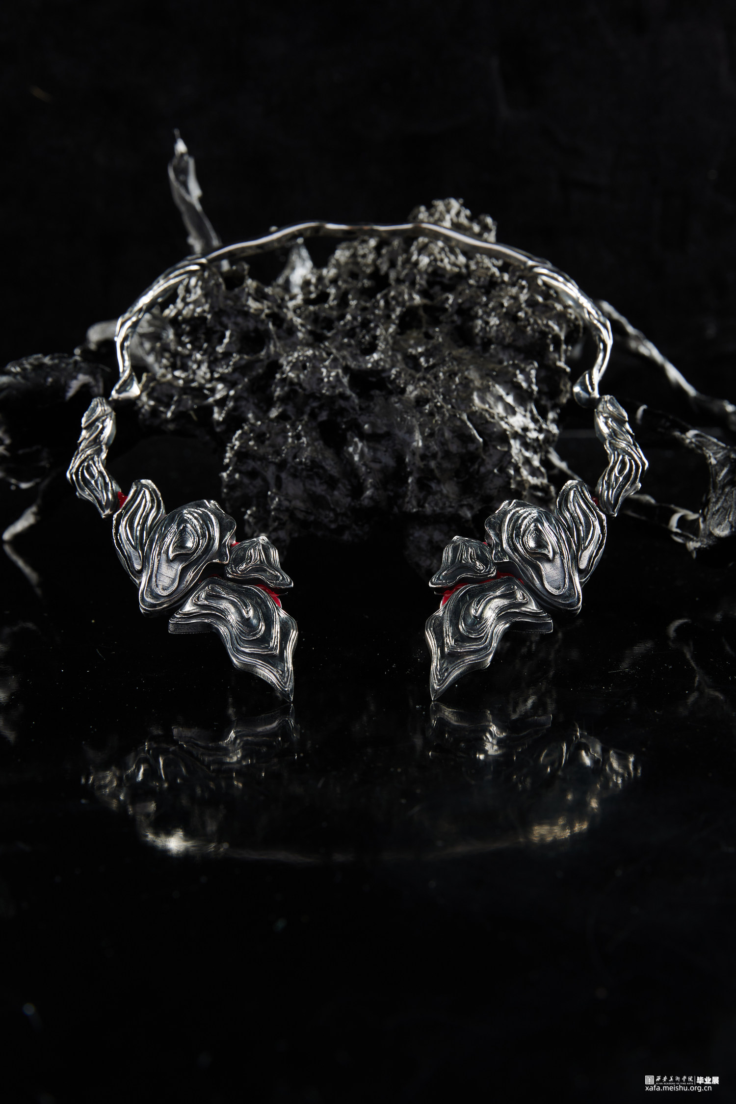岩浆火种是塑造地球生态环境以及人类文明的奠基,选择岩浆与火种与当代首饰结合设计是为了体现在远古文明开端时火种如何开辟人类文明开端使人类进入文明时代。结合首饰设计唤起人们对远古时代的原始崇拜,让人们对大自然保持敬畏之心,也是对当下过度砍伐以及过度开采矿石资源等一系列破坏生态环境的行为进行反思。灵感来源于火与岩浆,探究原始社会与火的密切联系,以及对自然的岩浆形状进行设计将其运用到首饰设计中去。采用金工切割工艺,以及树脂染色制作。3d打印蜡雕,再用失蜡法铸造。采用黑灰红三色为主基调,体现远古自然的宏伟神秘之美。