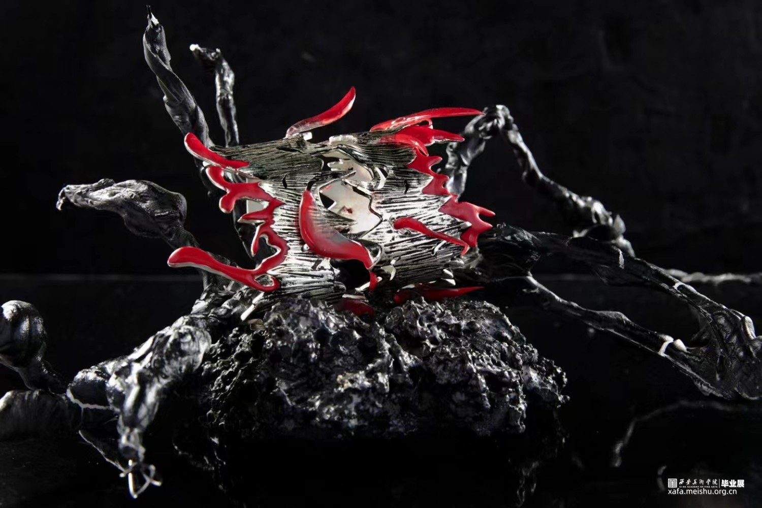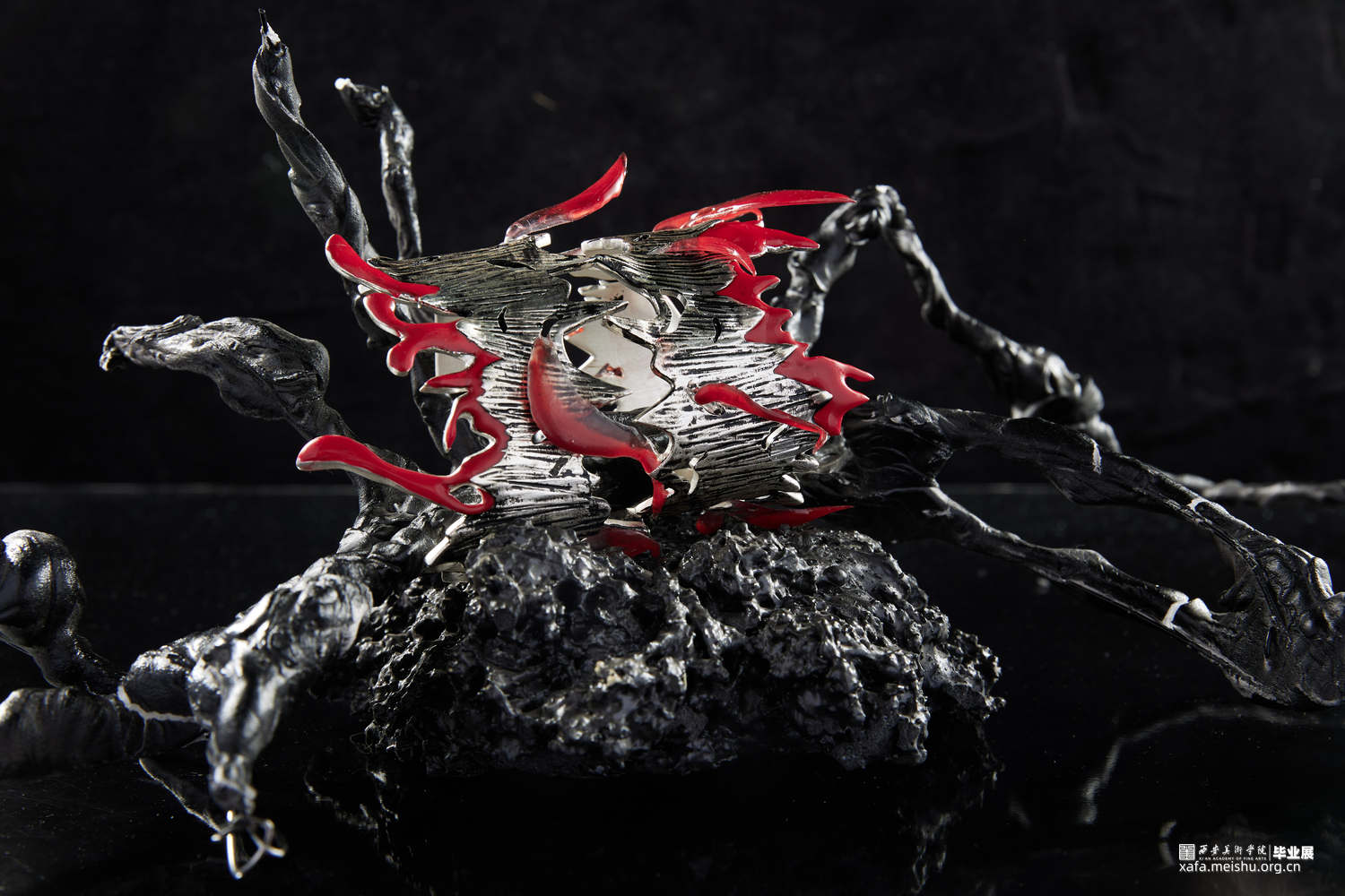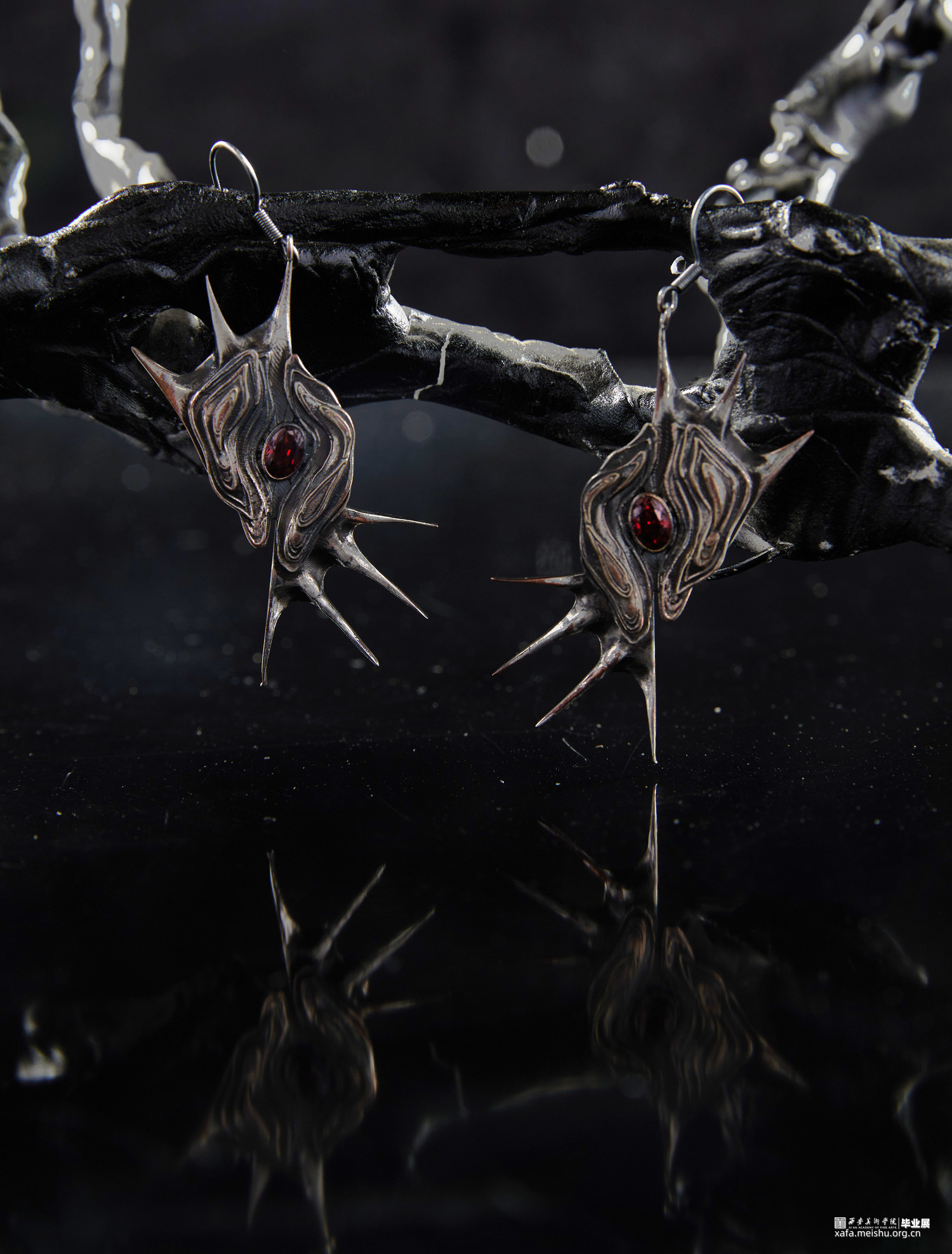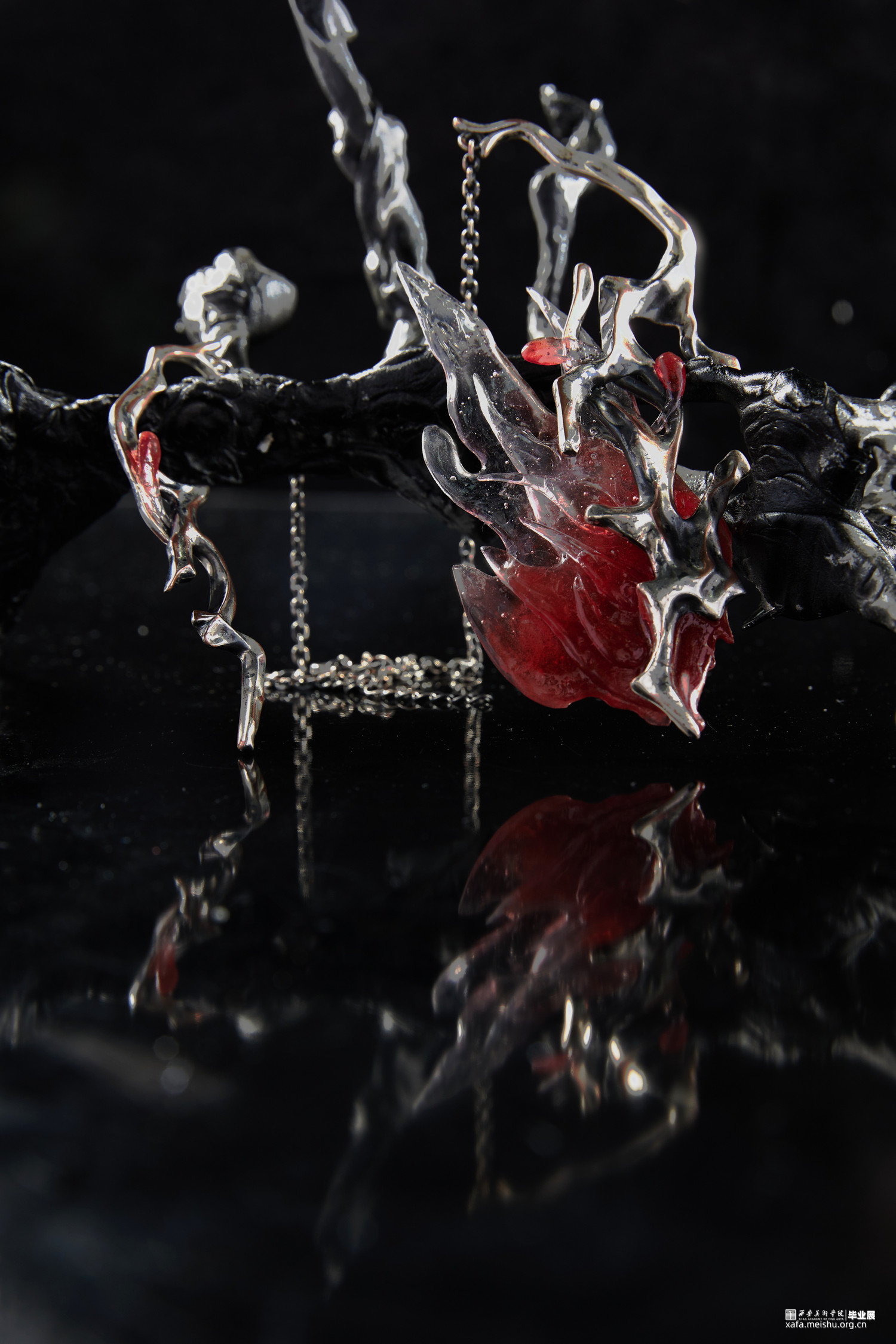 岩浆火种是塑造地球生态环境以及人类文明的奠基,选择岩浆与火种与当代首饰结合设计是为了体现在远古文明开端时火种如何开辟人类文明开端使人类进入文明时代。结合首饰设计唤起人们对远古时代的原始崇拜,让人们对大自然保持敬畏之心,也是对当下过度砍伐以及过度开采矿石资源等一系列破坏生态环境的行为进行反思。灵感来源于火与岩浆,探究原始社会与火的密切联系,以及对自然的岩浆形状进行设计将其运用到首饰设计中去。采用金工切割工艺,以及树脂染色制作。3d打印蜡雕,再用失蜡法铸造。采用黑灰红三色为主基调,体现远古自然的宏伟神秘之美。