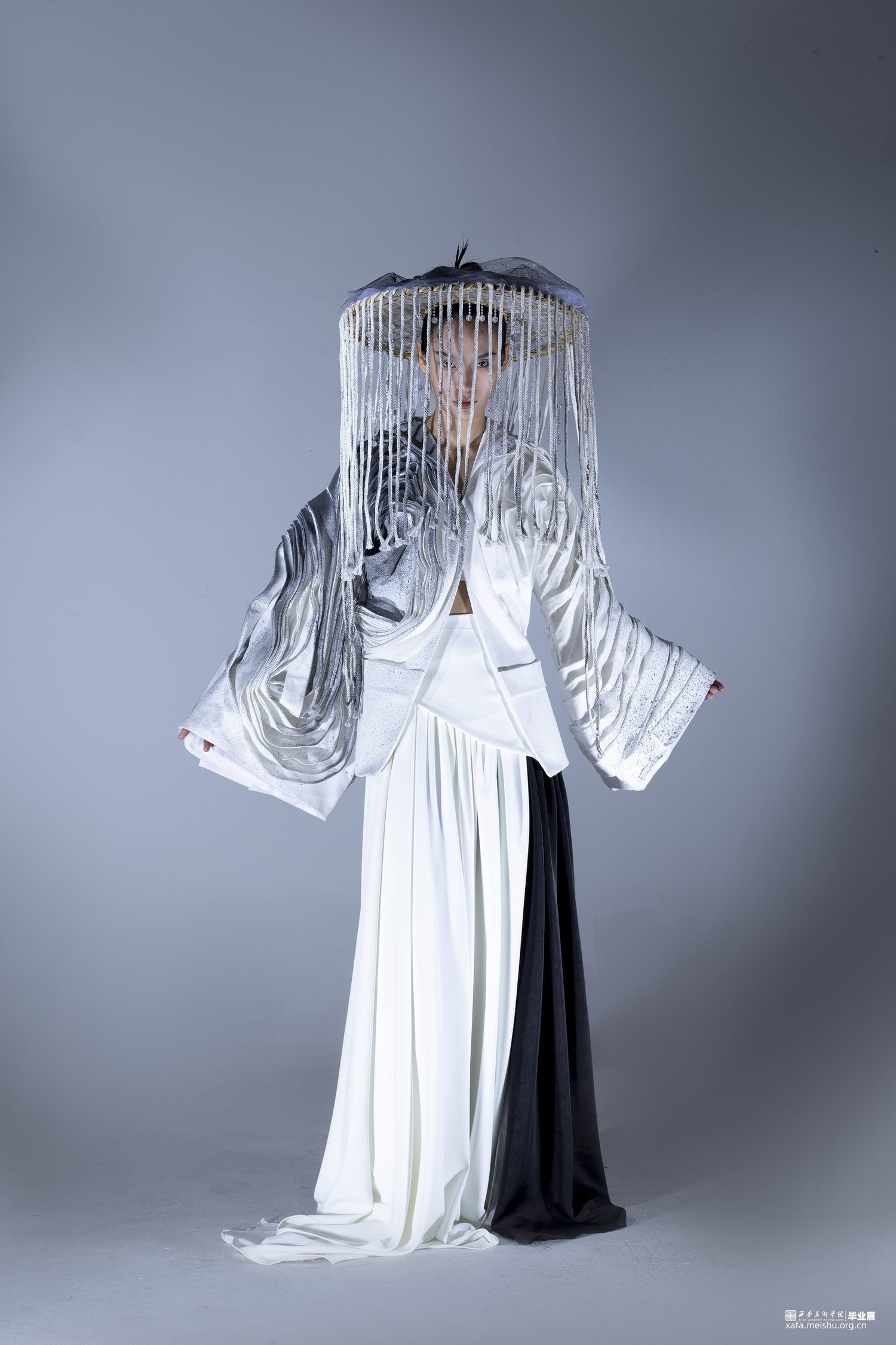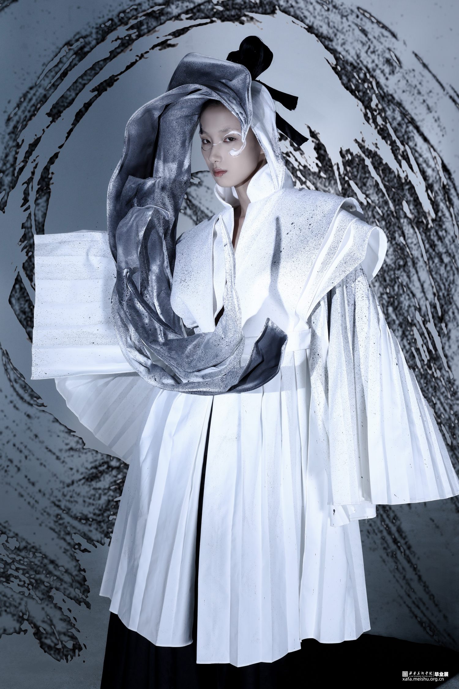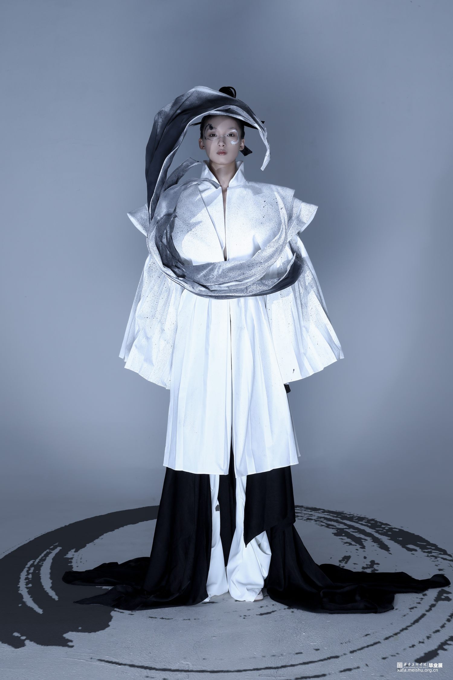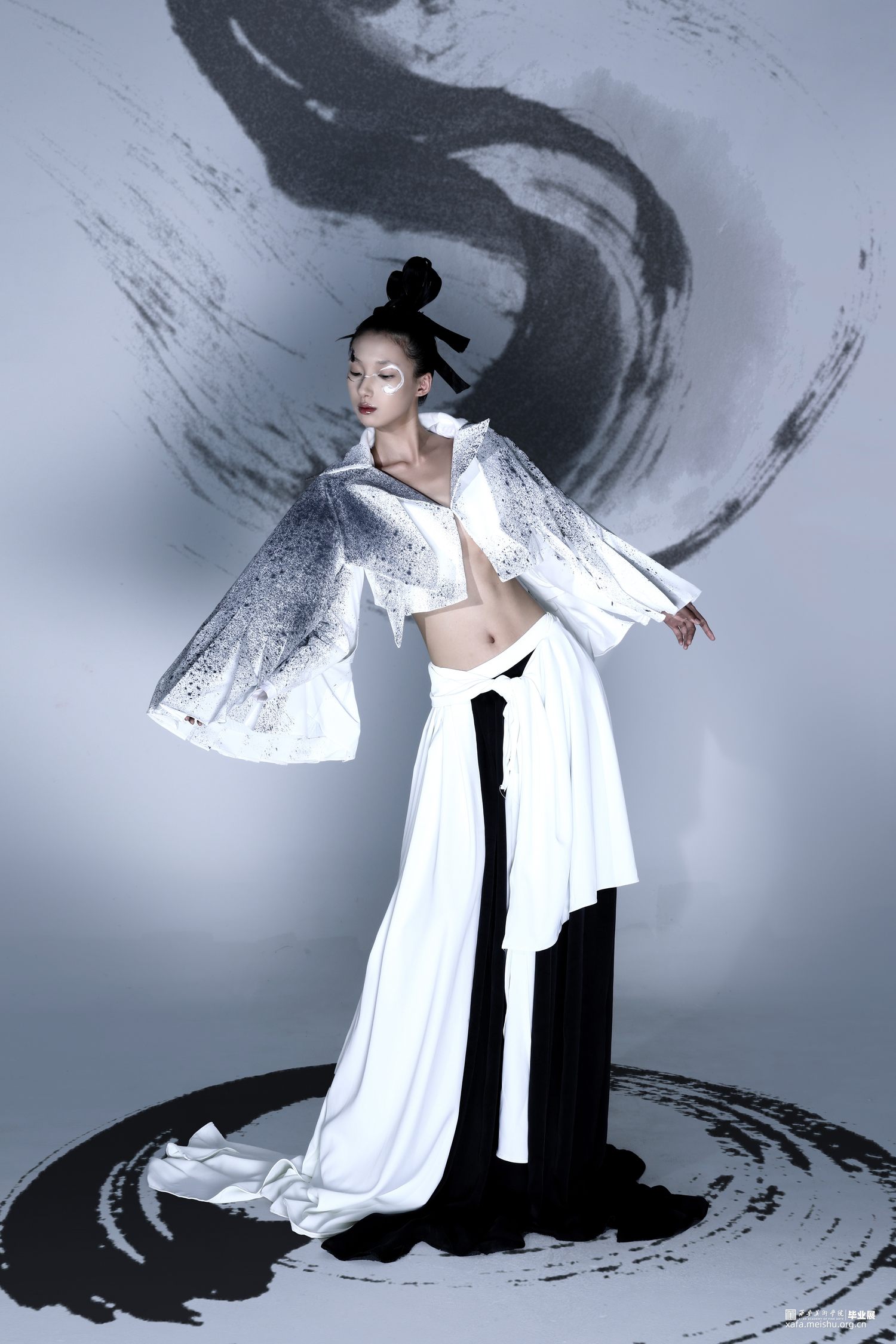 系列主题灵感选取《道德经》中描述的“道”:“人法地,地法天,天法道,道法自然”“道生一,一生二,二生三,三生万物”,老子笔下的“道”是产生万物的根源,是规律性的“道”…它无形、无极、无始无终,是一切事物的创生者和指导者。系列通过服装的表现形式将作者理解的虚无缥缈的“道”展现出来,“无为之裳”系列创意装采用打破、重组的解构理念,加入面料再造和图案设计的元素表现主题,以棉麻和绸缎面料为基础面料,突出款式和面料再造,色彩主要采用黑白灰,用喷墨染的形式对服装进行升华,将‘无形’的道在色彩上也展现出来,款式上结合道袍和现代休闲装的基本点,风格上力求打破陈规,注重设计的独特性和个性化。