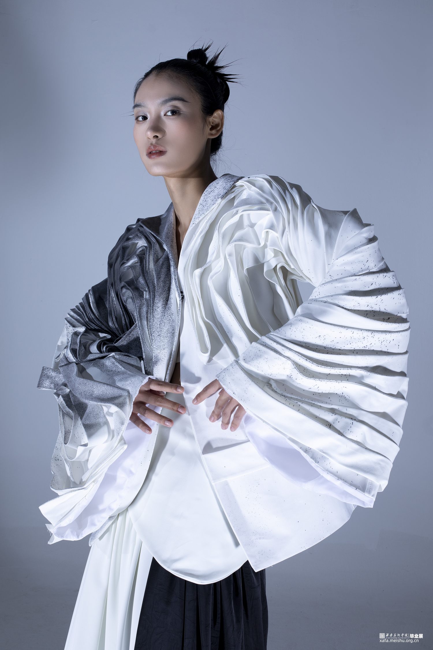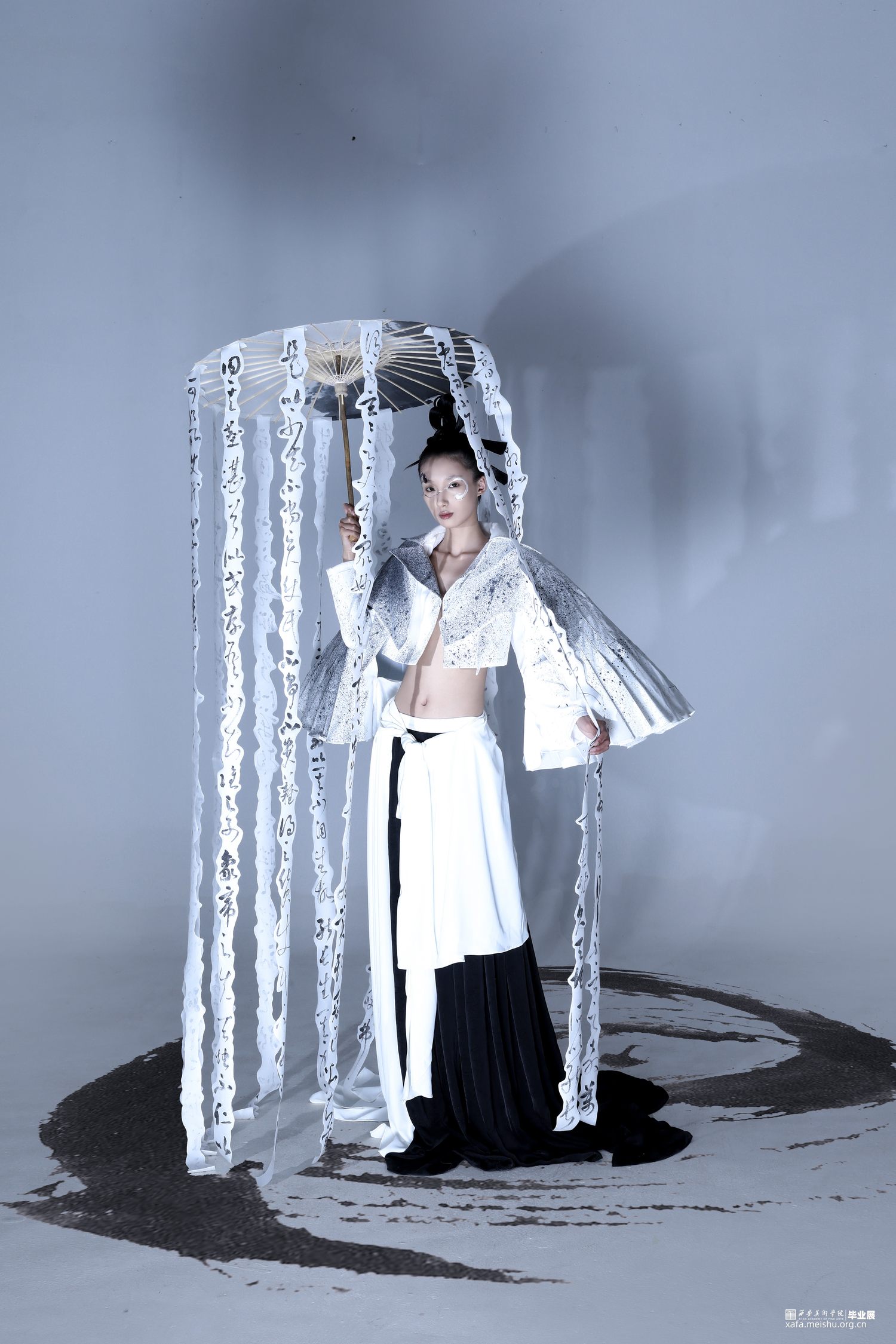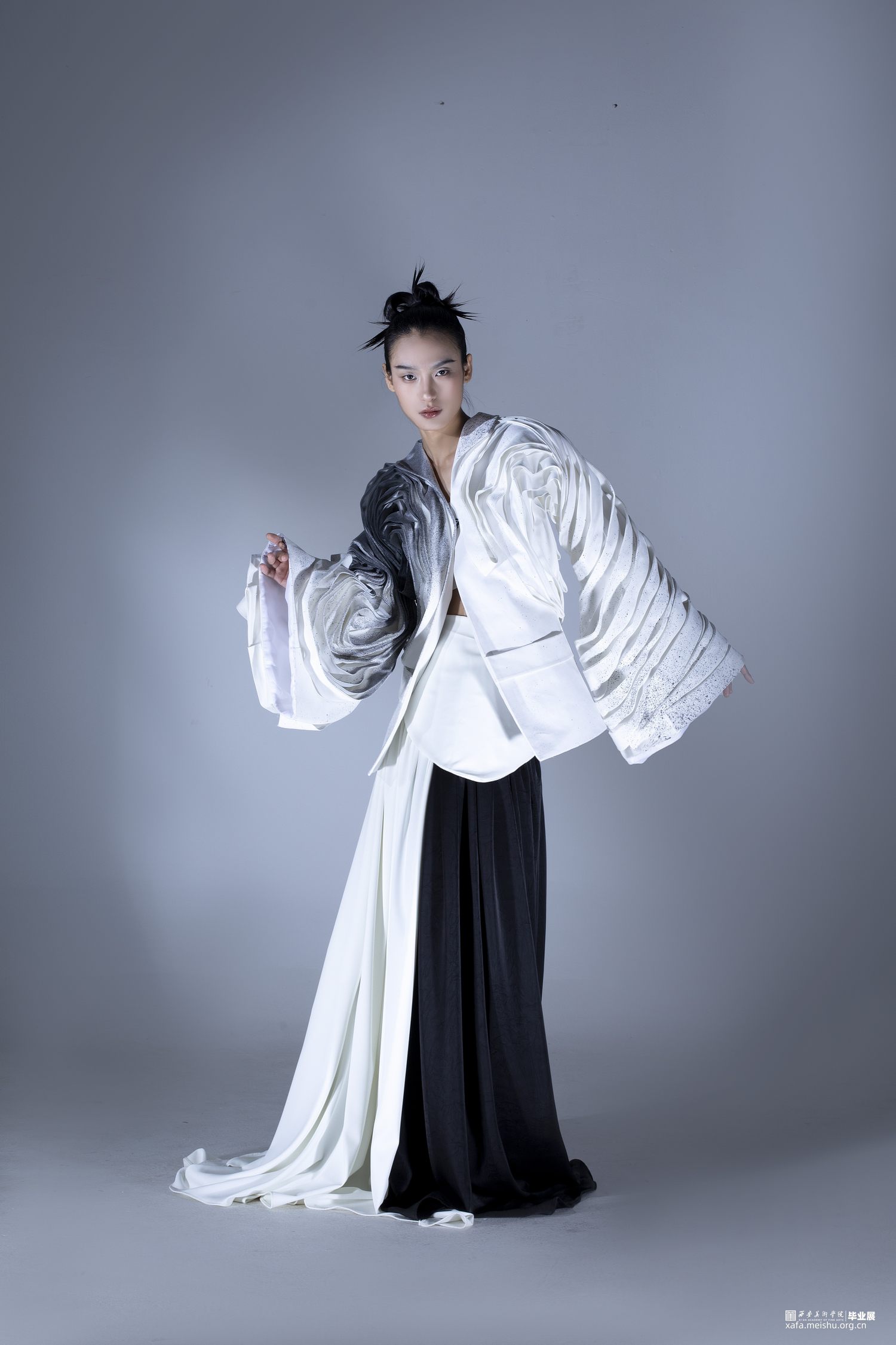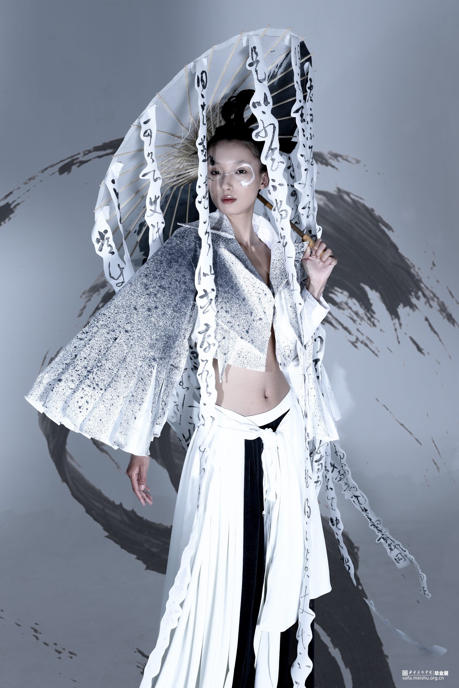 系列主题灵感选取《道德经》中描述的“道”:“人法地,地法天,天法道,道法自然”“道生一,一生二,二生三,三生万物”,老子笔下的“道”是产生万物的根源,是规律性的“道”…它无形、无极、无始无终,是一切事物的创生者和指导者。系列通过服装的表现形式将作者理解的虚无缥缈的“道”展现出来,“无为之裳”系列创意装采用打破、重组的解构理念,加入面料再造和图案设计的元素表现主题,以棉麻和绸缎面料为基础面料,突出款式和面料再造,色彩主要采用黑白灰,用喷墨染的形式对服装进行升华,将‘无形’的道在色彩上也展现出来,款式上结合道袍和现代休闲装的基本点,风格上力求打破陈规,注重设计的独特性和个性化。