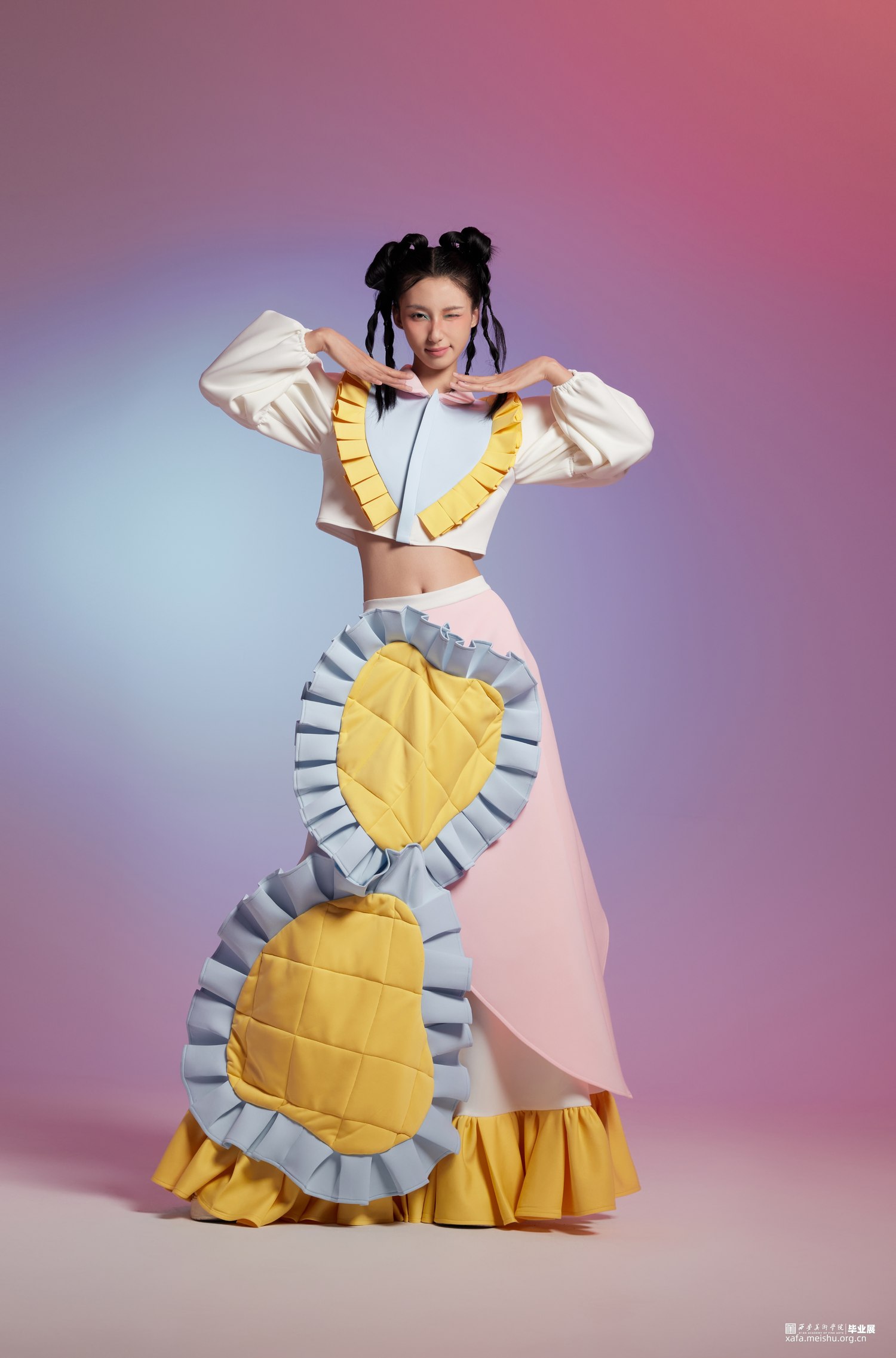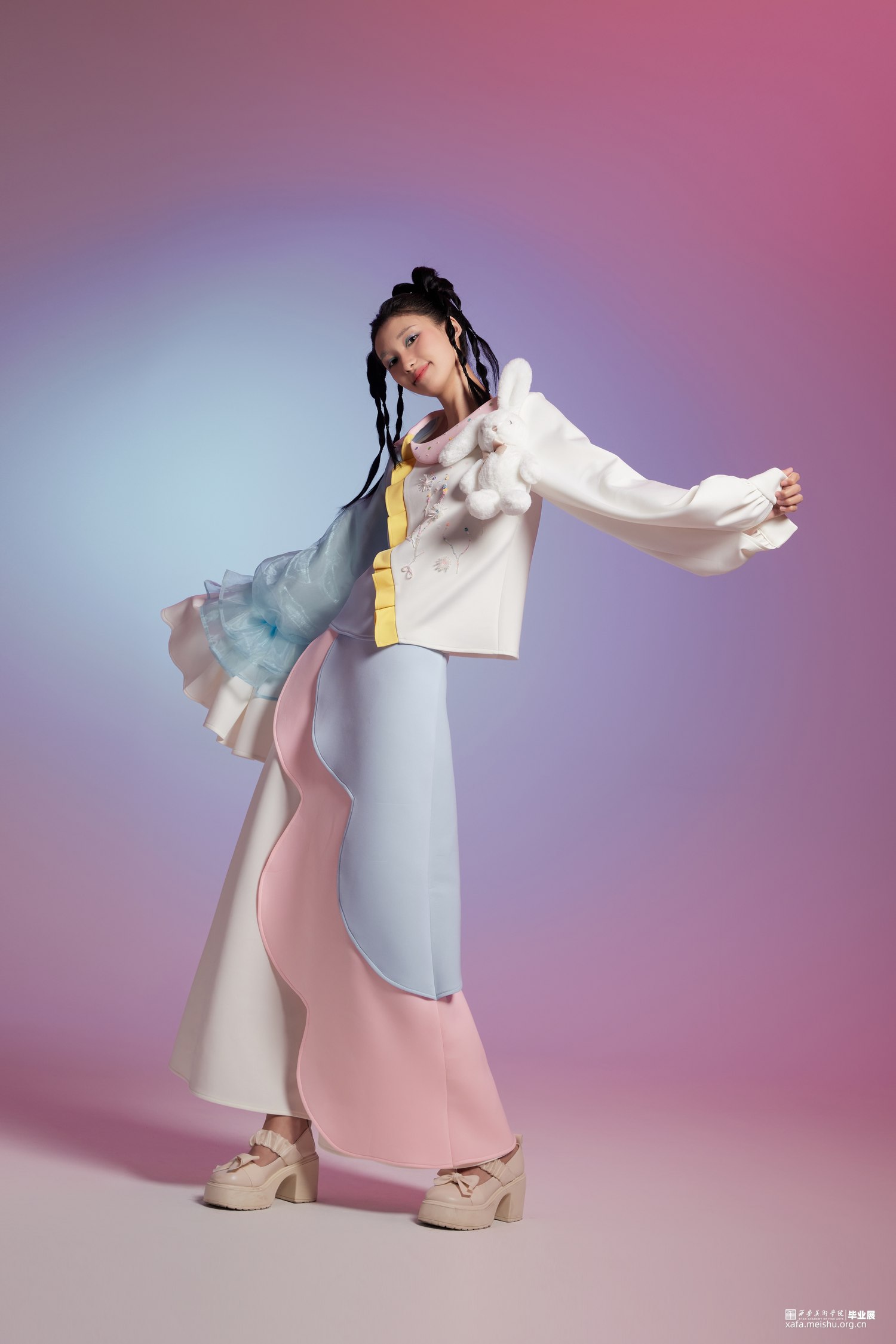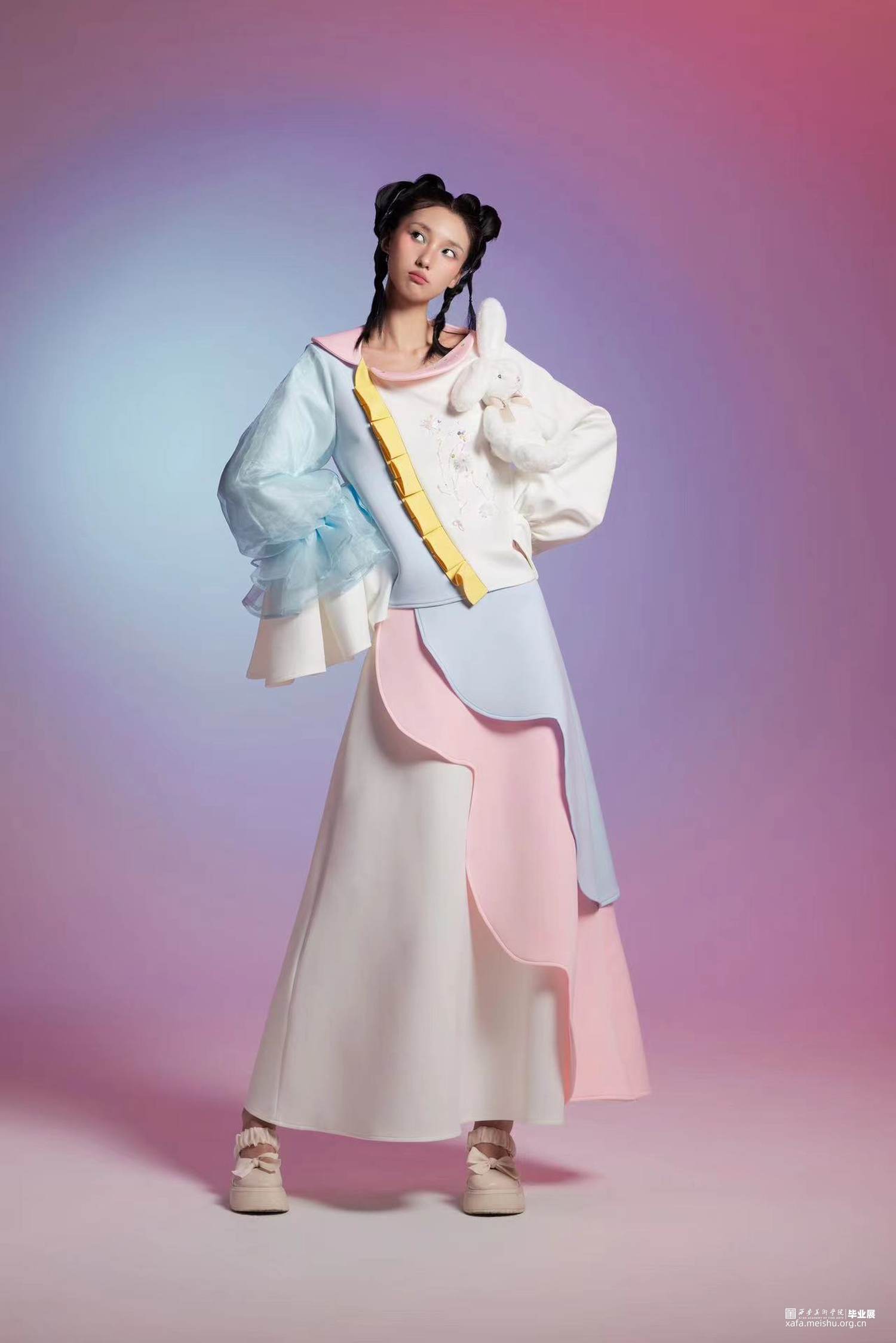 在创作这套服装设计作品时,设计理念始终围绕着“情感化服装”这一主题。尝试将情感元素与服装设计紧密结合,通过服装的色彩、材质、图案和形状等元素,传达出不同的情感信息,寻找并设计具有象征意义和情感价值的图像,传达出不同的情感信息,让穿着者能够感受到服装所传递的情感温度,在色彩上,选择了以浅蓝和淡粉为主色调,象征情感温柔与浪漫的气息。同时,我在裙摆和领口处用明亮的黄色点缀,为作品增添了一抹童真。这种色彩的运用使得其更加符合“织梦”这一主题,让人仿佛置身于一个梦幻的世界中。在面料上选择更加亲肤的太空棉面料,轻盈的质地同时保持柔软和薄型,哑光的光泽感使整体更加高级,触感饱满柔和,在部分面料上添加了柔光轻盈的丝绸面料,使其具有一种朦胧的视觉效果,仿佛是将情感轻轻织入其中,展现出“织梦”的梦幻感。将情感和故事融入作品中,实现与服装之间的情感链接。让人感受到服装的魅力和力量,让时尚成为传递情感和文化的桥梁。