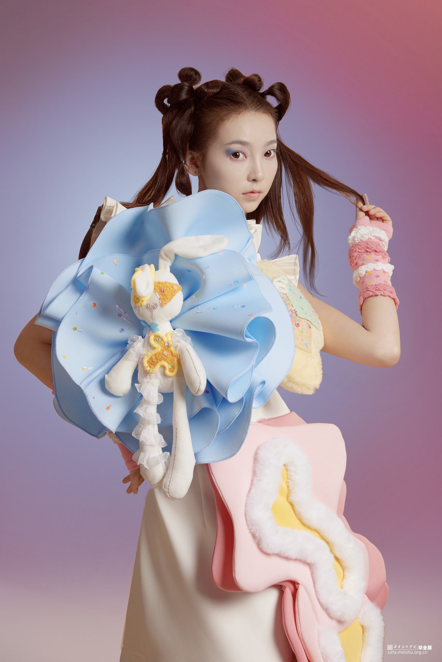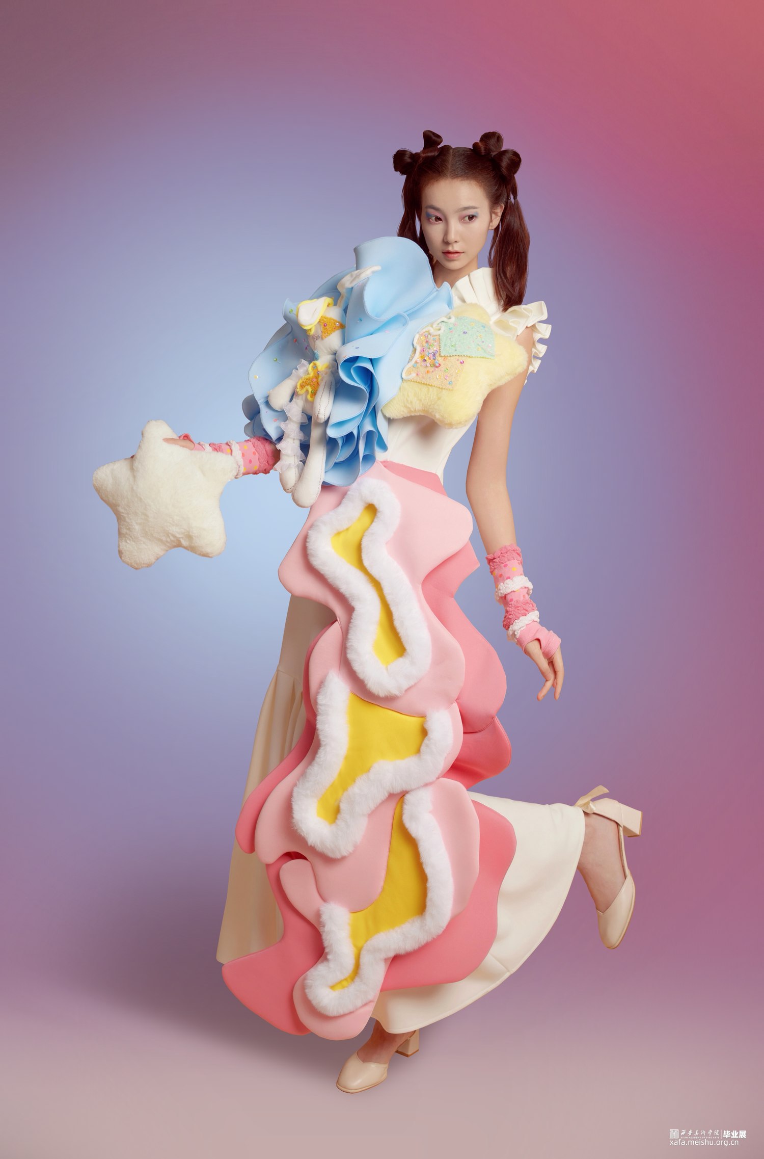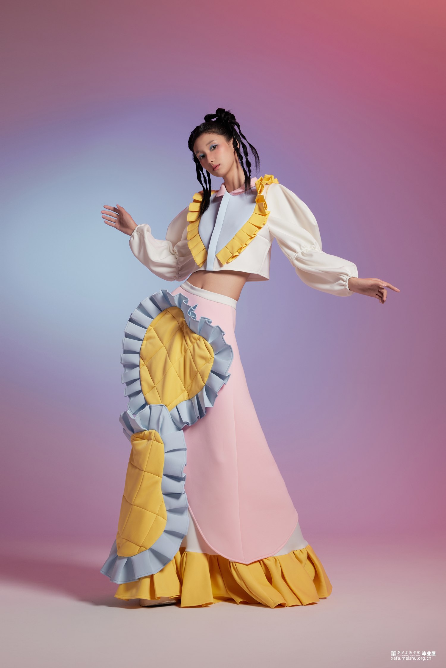 在创作这套服装设计作品时,设计理念始终围绕着“情感化服装”这一主题。尝试将情感元素与服装设计紧密结合,通过服装的色彩、材质、图案和形状等元素,传达出不同的情感信息,寻找并设计具有象征意义和情感价值的图像,传达出不同的情感信息,让穿着者能够感受到服装所传递的情感温度,在色彩上,选择了以浅蓝和淡粉为主色调,象征情感温柔与浪漫的气息。同时,我在裙摆和领口处用明亮的黄色点缀,为作品增添了一抹童真。这种色彩的运用使得其更加符合“织梦”这一主题,让人仿佛置身于一个梦幻的世界中。在面料上选择更加亲肤的太空棉面料,轻盈的质地同时保持柔软和薄型,哑光的光泽感使整体更加高级,触感饱满柔和,在部分面料上添加了柔光轻盈的丝绸面料,使其具有一种朦胧的视觉效果,仿佛是将情感轻轻织入其中,展现出“织梦”的梦幻感。将情感和故事融入作品中,实现与服装之间的情感链接。让人感受到服装的魅力和力量,让时尚成为传递情感和文化的桥梁。