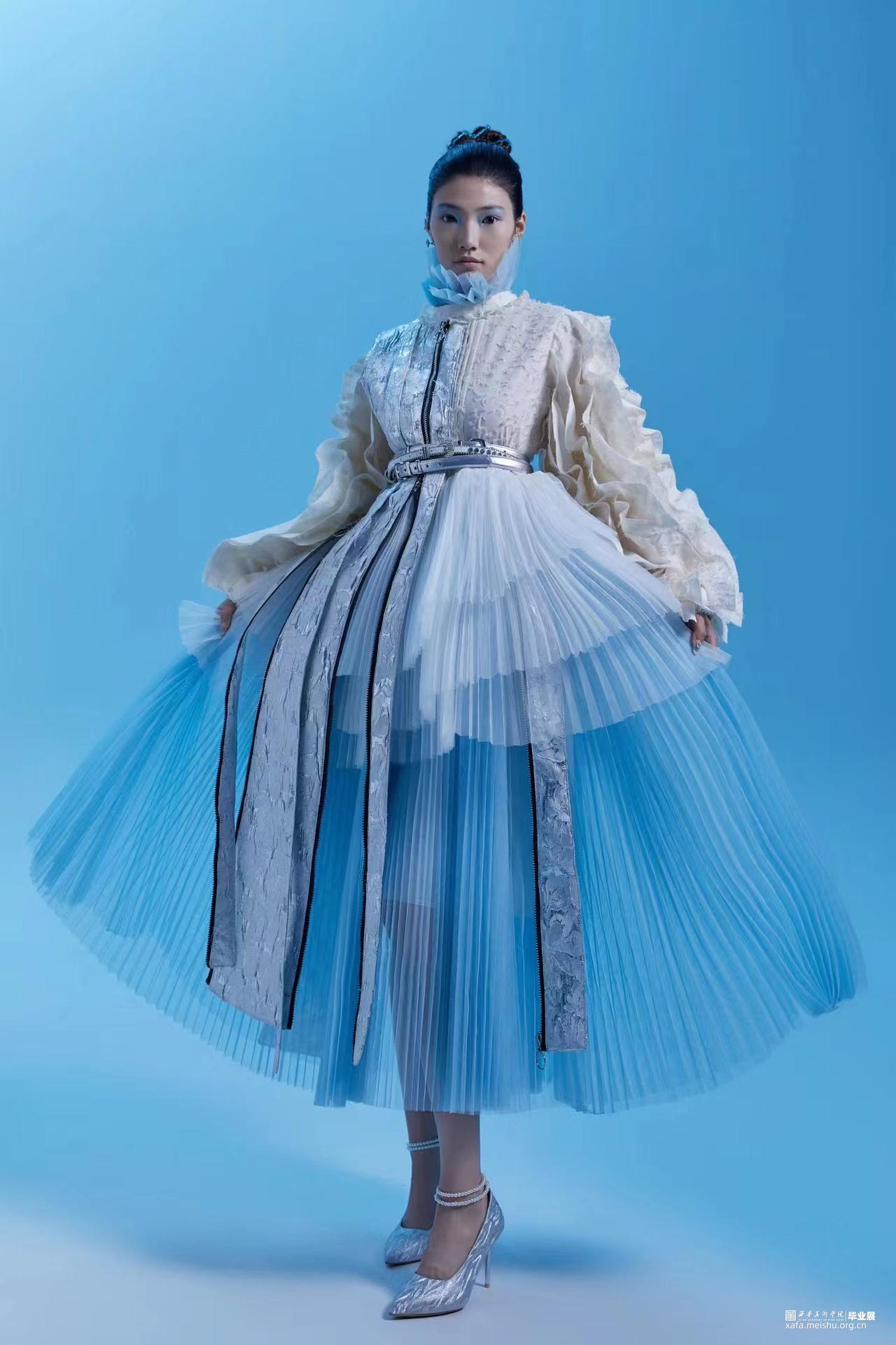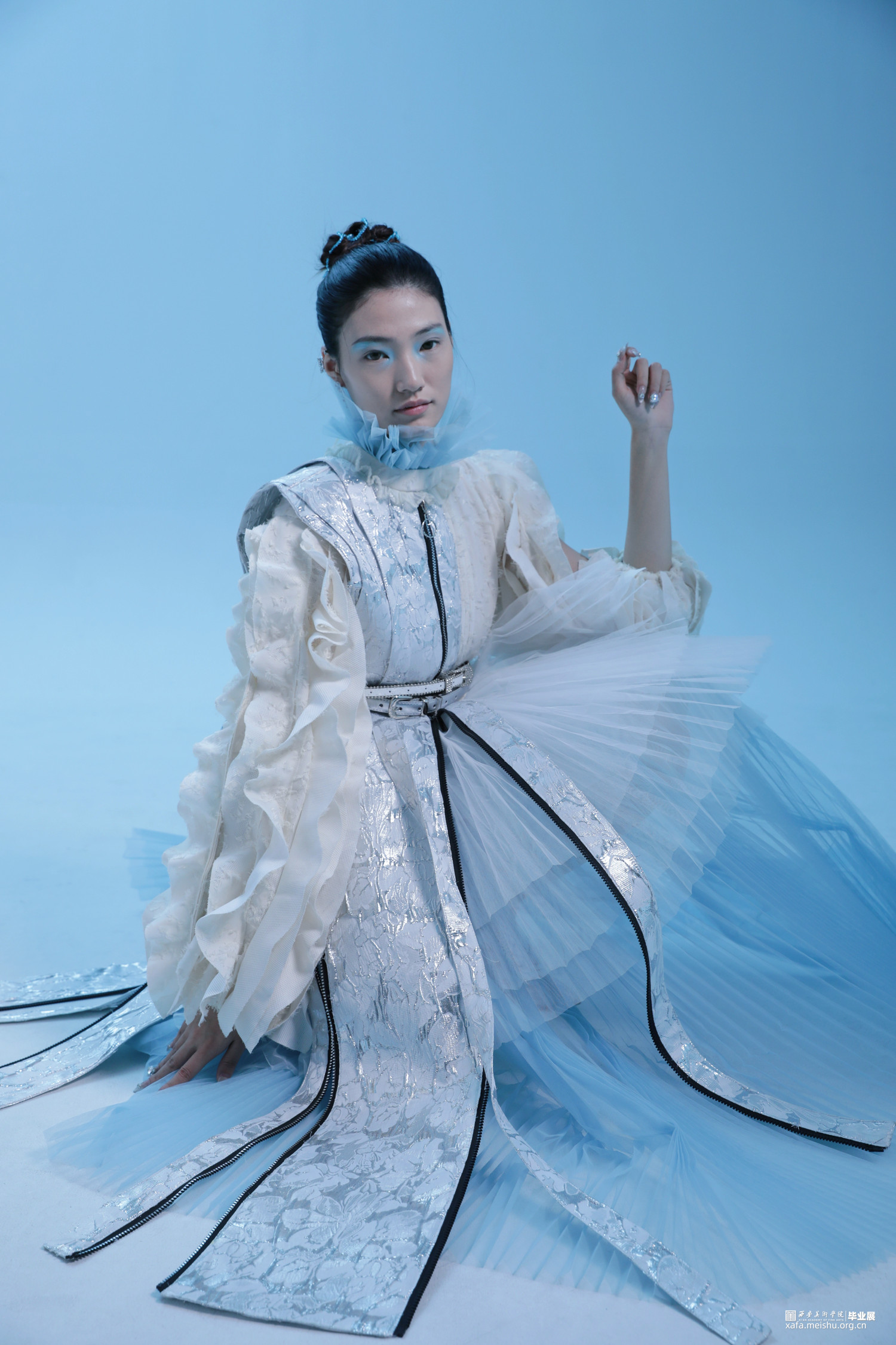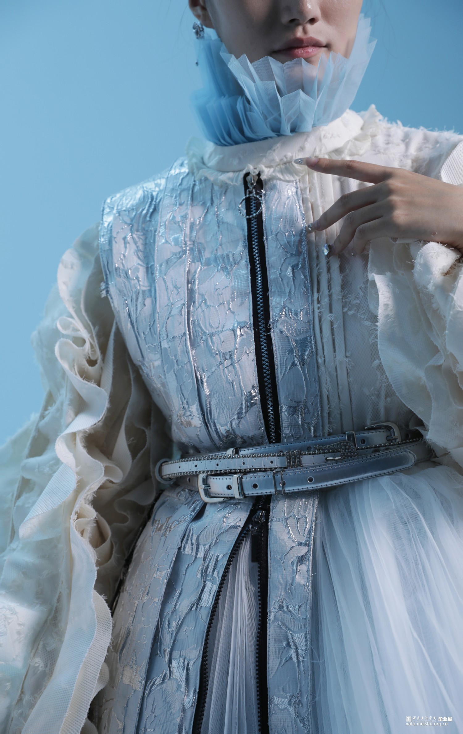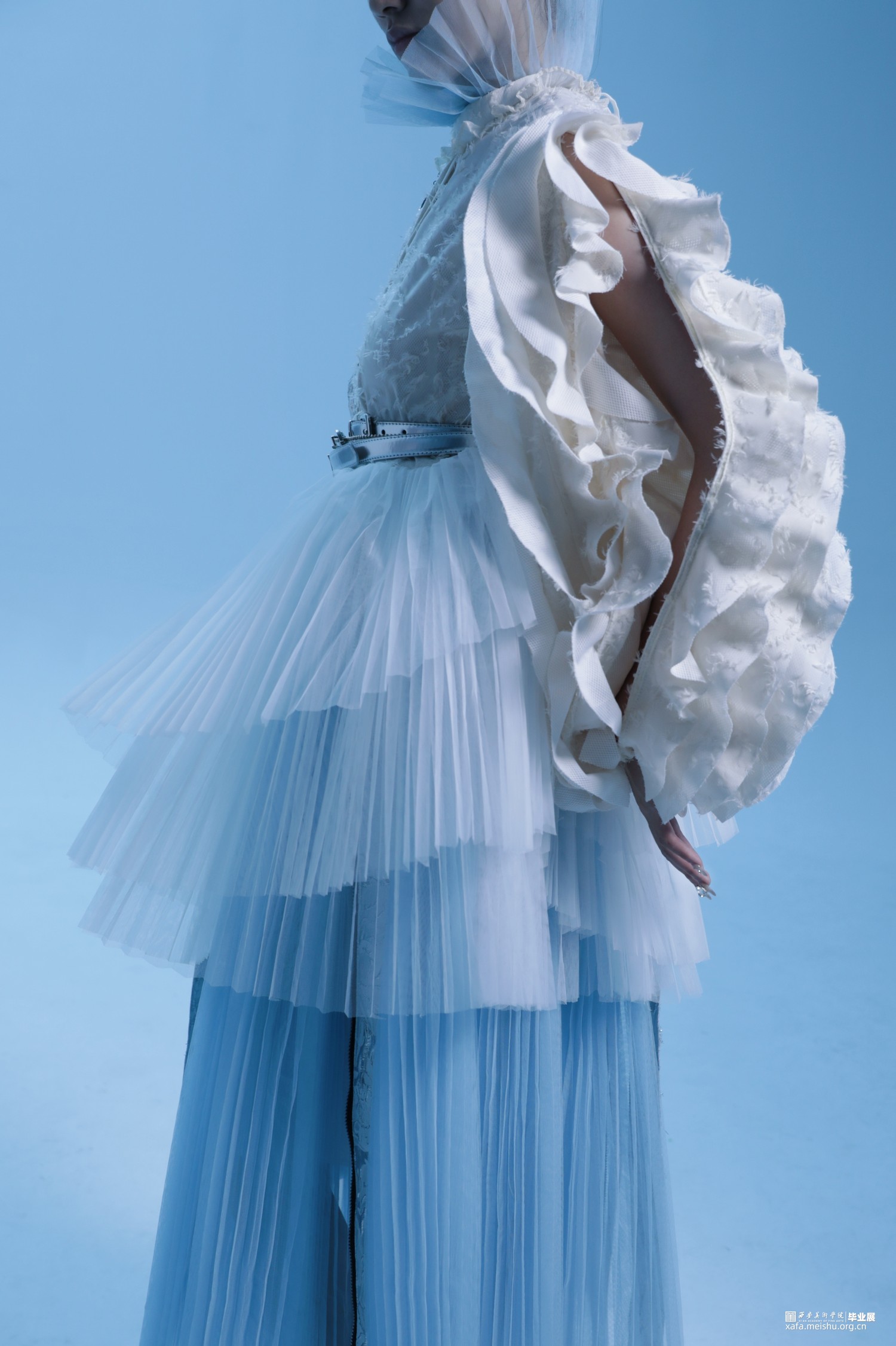 本人的毕业设计以“冰晶”为主题,冰晶是水汽在冰核上凝华增长而形成的固态水合物,外观既保留了冰的透明感,又结合了雪花等的造型。在毕业创作的过程中,本人围绕冰晶的造型展开设计,以不同材质的面料来表现冰与冰晶的视觉效果,可以是坚硬,可以是强势,也可以是美好,可以是透亮。运用不同面料肌理在现代时装中组合搭配的创新设计,通过作品传达出气质的表现不是单一的,可柔亦可刚的设计理念。现代社会中对于女性的定义有许多的指向性,比如“温柔贤惠”、“婉约大气”等,而薄纱材质柔软飘逸,因此经常与女性的“温柔”挂钩,纱材质的服装及制品也愈发广泛的为女性所用。同时当时的人们将皮衣应用在军队当中,制作成结实耐磨的军服,以抵御恶劣的天气。皮衣最早也是隶属于男装,随着女性的解放运动才逐渐出现在女性服饰当中。性别不该被一些名词轻易的定义,柔弱温婉不该是女性的定义,硬朗坚强也不该是男性的定义,服装亦是如此。硬朗的皮革也可以与柔软的薄纱搭配,不光是软硬程度的对比,皮革的光泽感带来的未来科技感与纱材质的安逸平稳感碰撞也能产生不同的效果。