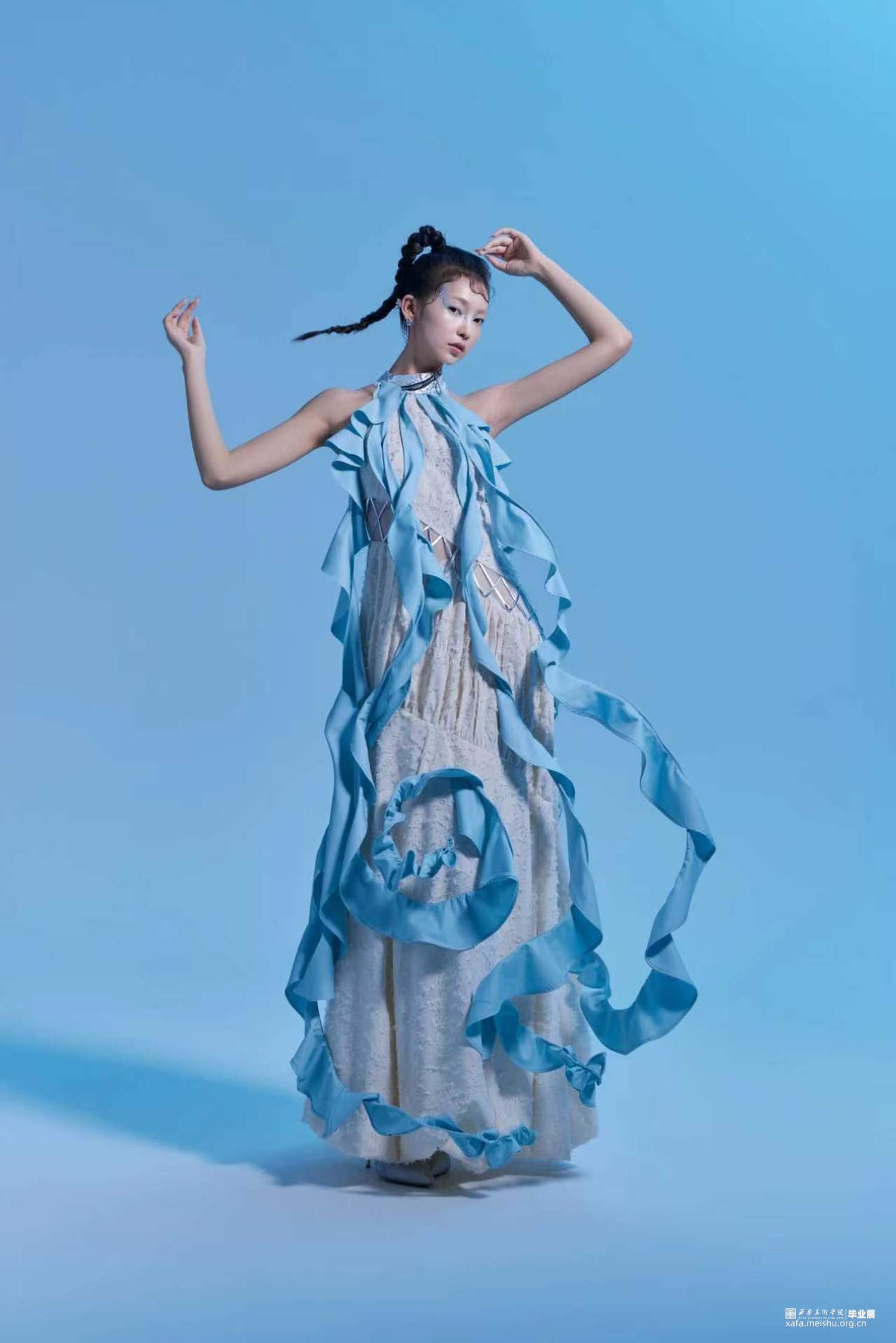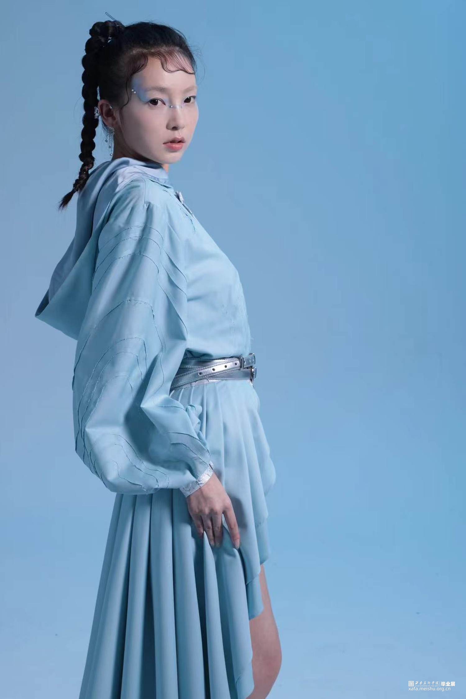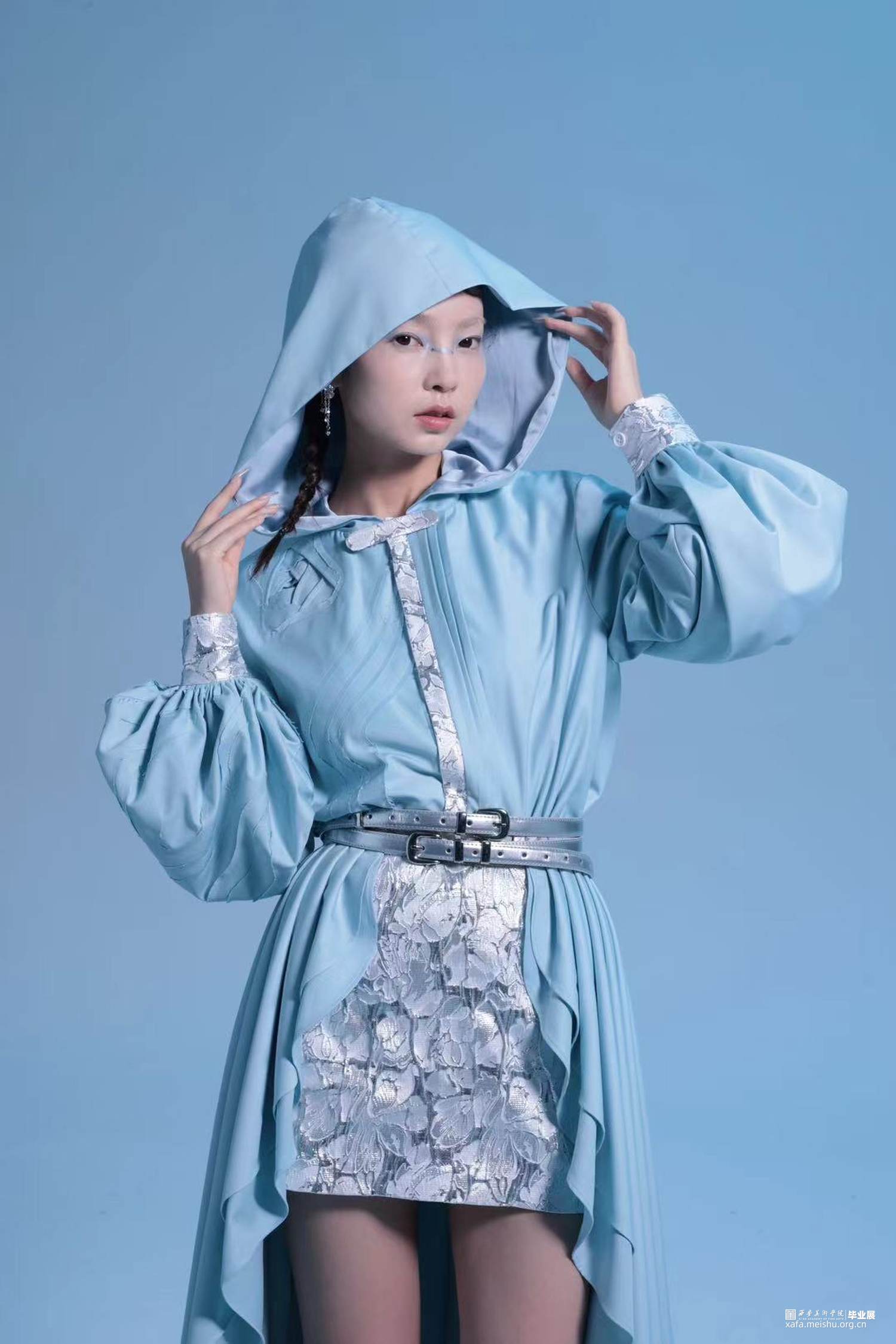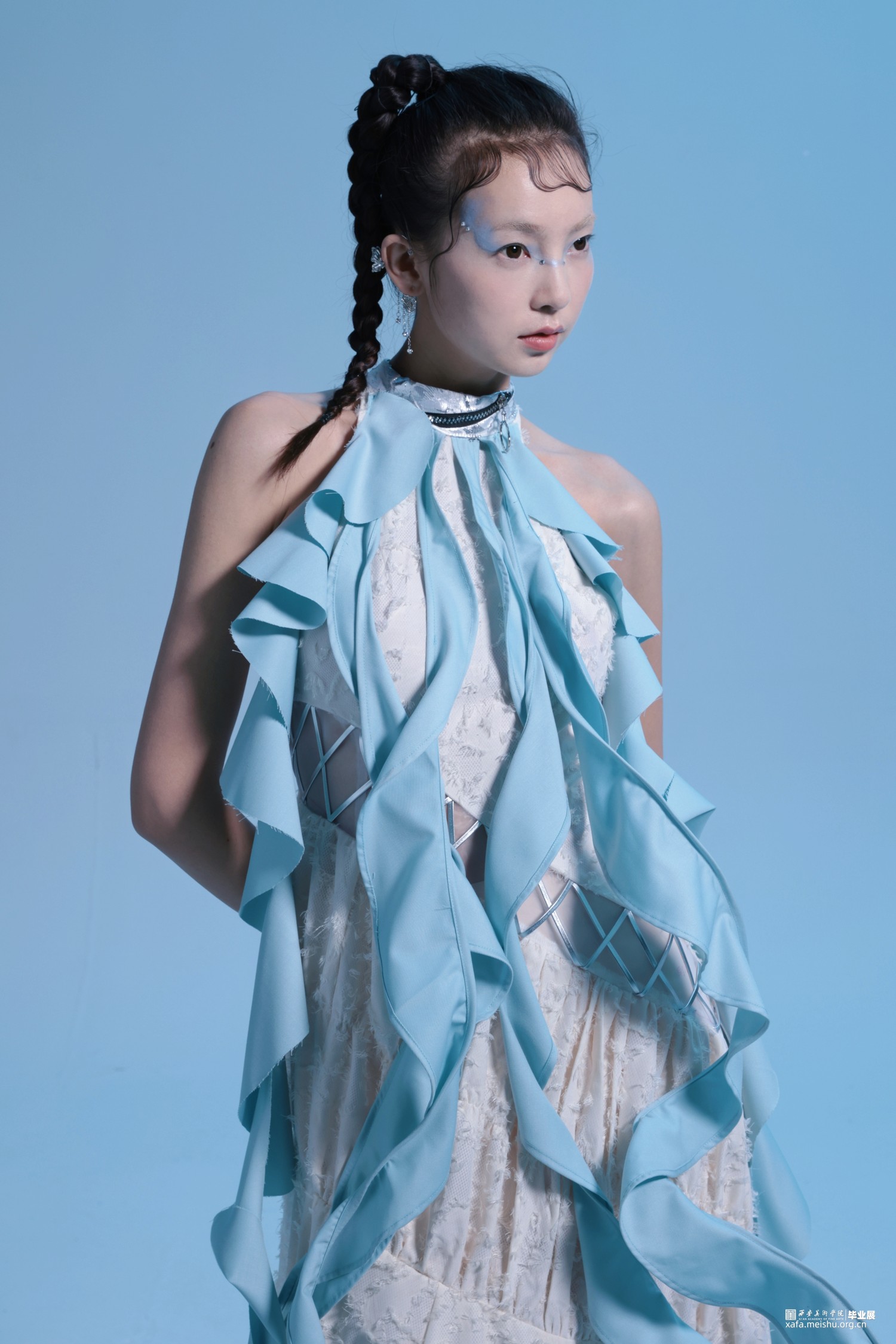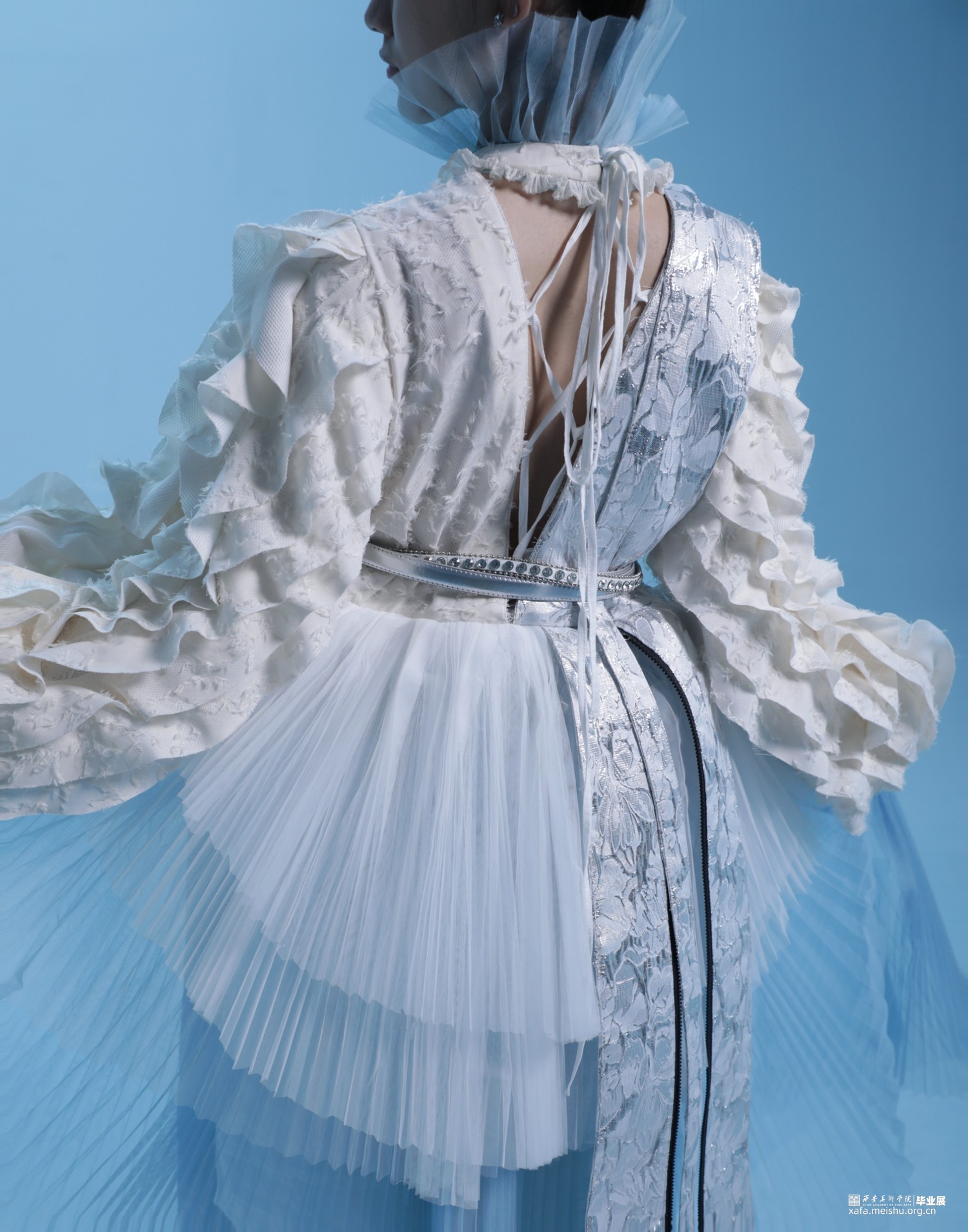 本人的毕业设计以“冰晶”为主题,冰晶是水汽在冰核上凝华增长而形成的固态水合物,外观既保留了冰的透明感,又结合了雪花等的造型。在毕业创作的过程中,本人围绕冰晶的造型展开设计,以不同材质的面料来表现冰与冰晶的视觉效果,可以是坚硬,可以是强势,也可以是美好,可以是透亮。运用不同面料肌理在现代时装中组合搭配的创新设计,通过作品传达出气质的表现不是单一的,可柔亦可刚的设计理念。现代社会中对于女性的定义有许多的指向性,比如“温柔贤惠”、“婉约大气”等,而薄纱材质柔软飘逸,因此经常与女性的“温柔”挂钩,纱材质的服装及制品也愈发广泛的为女性所用。同时当时的人们将皮衣应用在军队当中,制作成结实耐磨的军服,以抵御恶劣的天气。皮衣最早也是隶属于男装,随着女性的解放运动才逐渐出现在女性服饰当中。性别不该被一些名词轻易的定义,柔弱温婉不该是女性的定义,硬朗坚强也不该是男性的定义,服装亦是如此。硬朗的皮革也可以与柔软的薄纱搭配,不光是软硬程度的对比,皮革的光泽感带来的未来科技感与纱材质的安逸平稳感碰撞也能产生不同的效果。