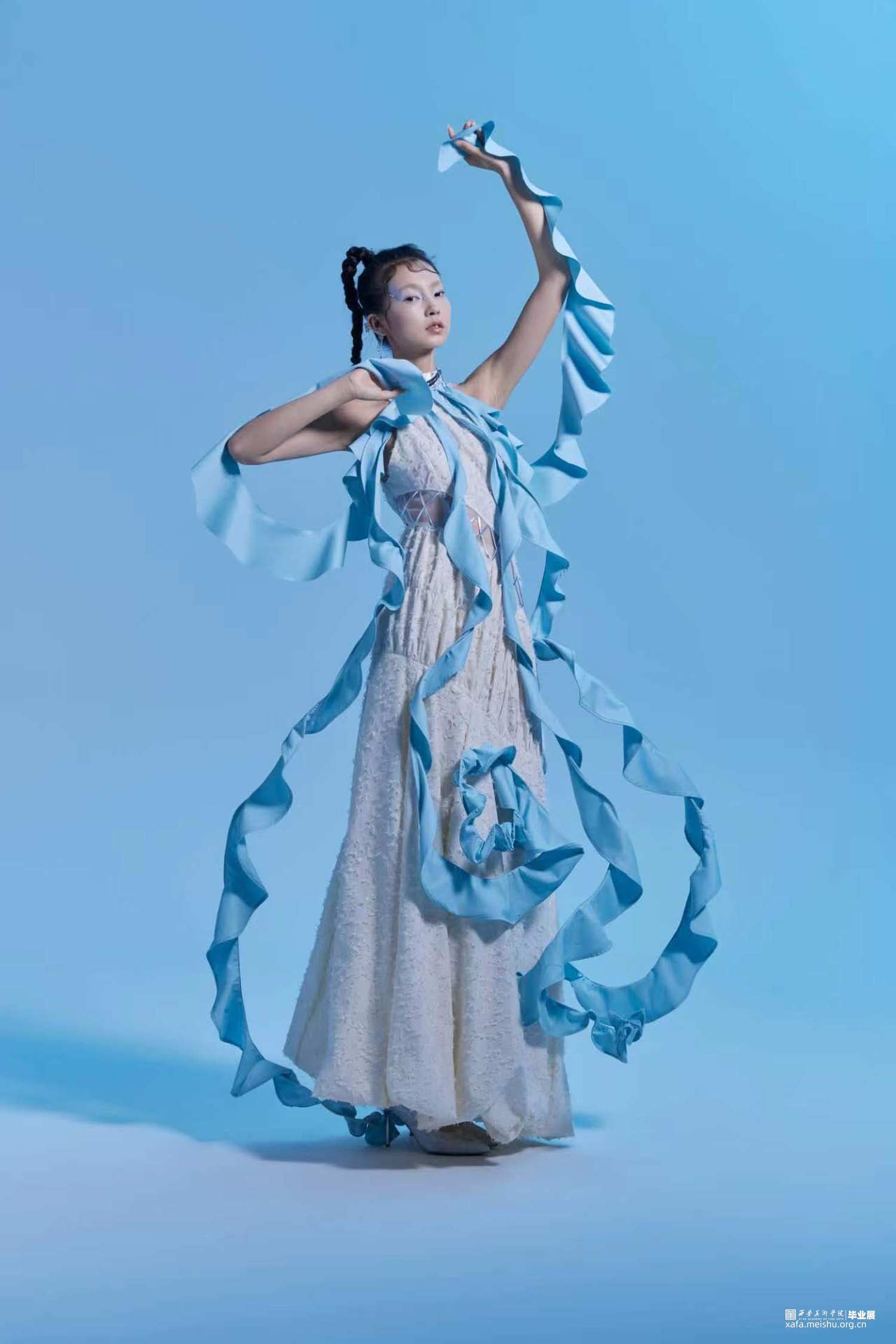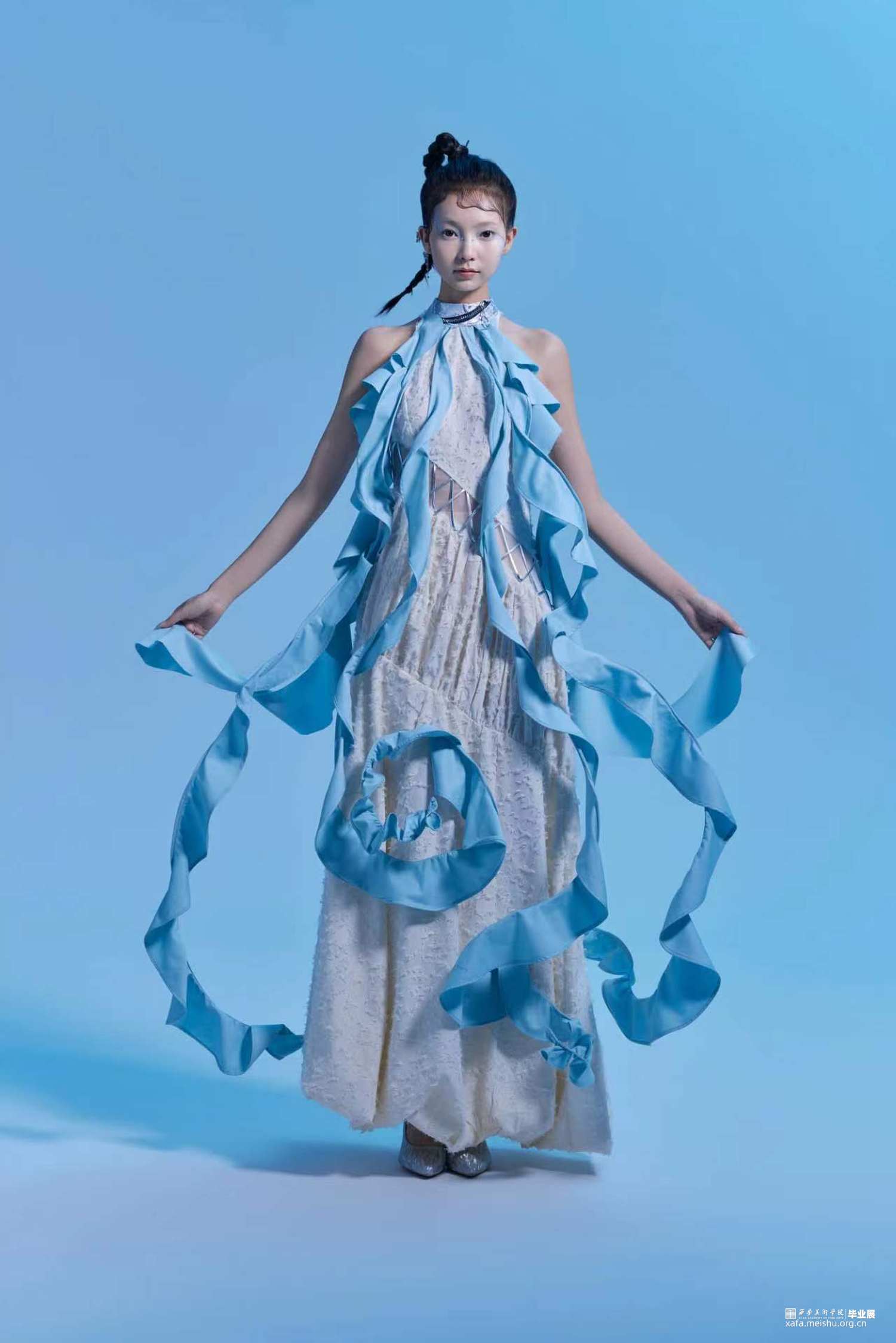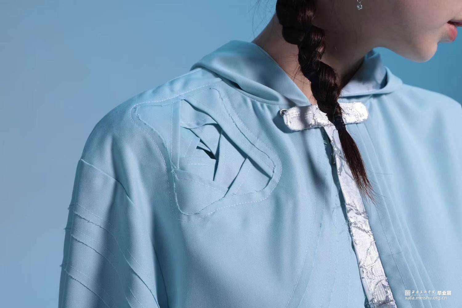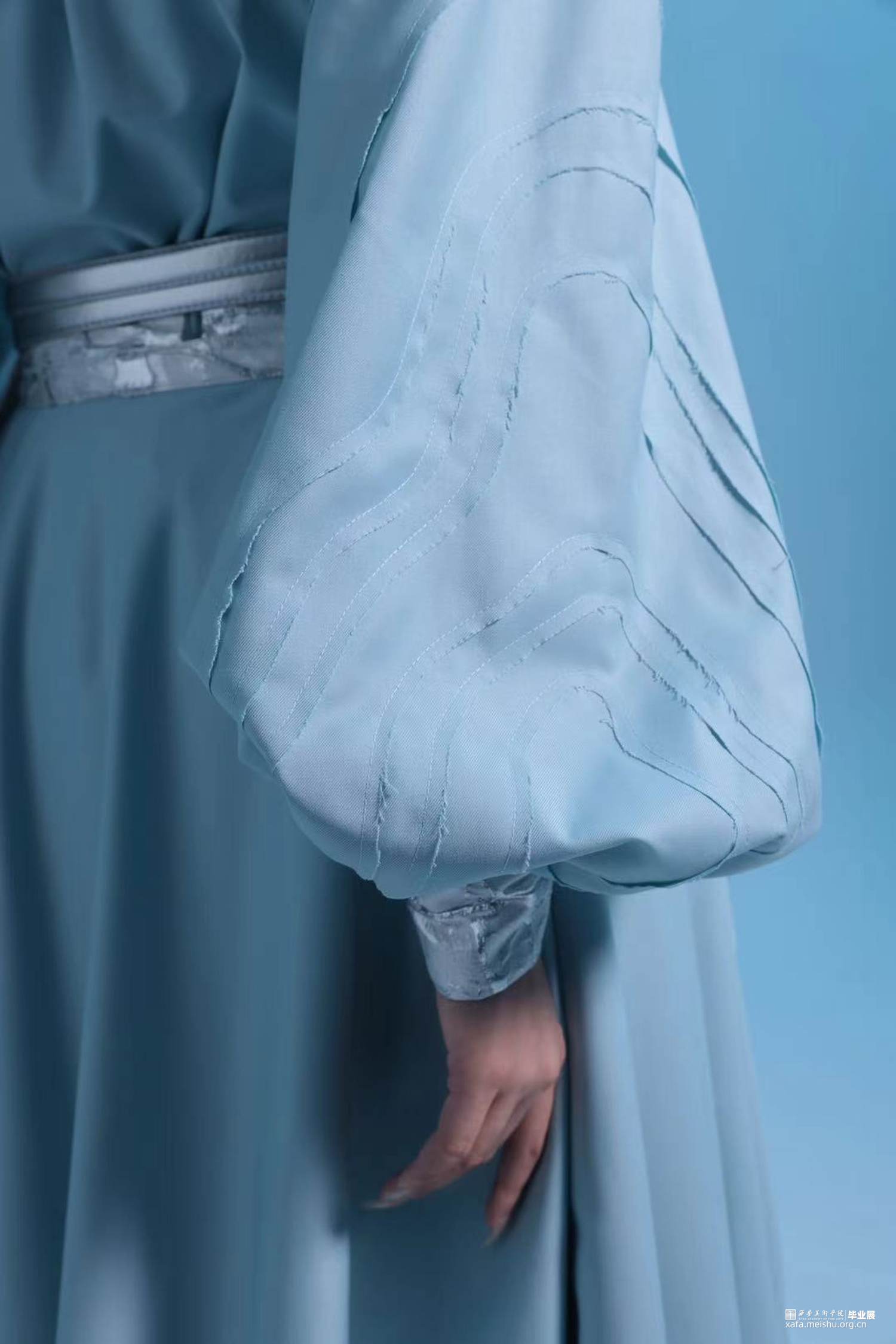 本人的毕业设计以“冰晶”为主题,冰晶是水汽在冰核上凝华增长而形成的固态水合物,外观既保留了冰的透明感,又结合了雪花等的造型。在毕业创作的过程中,本人围绕冰晶的造型展开设计,以不同材质的面料来表现冰与冰晶的视觉效果,可以是坚硬,可以是强势,也可以是美好,可以是透亮。运用不同面料肌理在现代时装中组合搭配的创新设计,通过作品传达出气质的表现不是单一的,可柔亦可刚的设计理念。现代社会中对于女性的定义有许多的指向性,比如“温柔贤惠”、“婉约大气”等,而薄纱材质柔软飘逸,因此经常与女性的“温柔”挂钩,纱材质的服装及制品也愈发广泛的为女性所用。同时当时的人们将皮衣应用在军队当中,制作成结实耐磨的军服,以抵御恶劣的天气。皮衣最早也是隶属于男装,随着女性的解放运动才逐渐出现在女性服饰当中。性别不该被一些名词轻易的定义,柔弱温婉不该是女性的定义,硬朗坚强也不该是男性的定义,服装亦是如此。硬朗的皮革也可以与柔软的薄纱搭配,不光是软硬程度的对比,皮革的光泽感带来的未来科技感与纱材质的安逸平稳感碰撞也能产生不同的效果。
