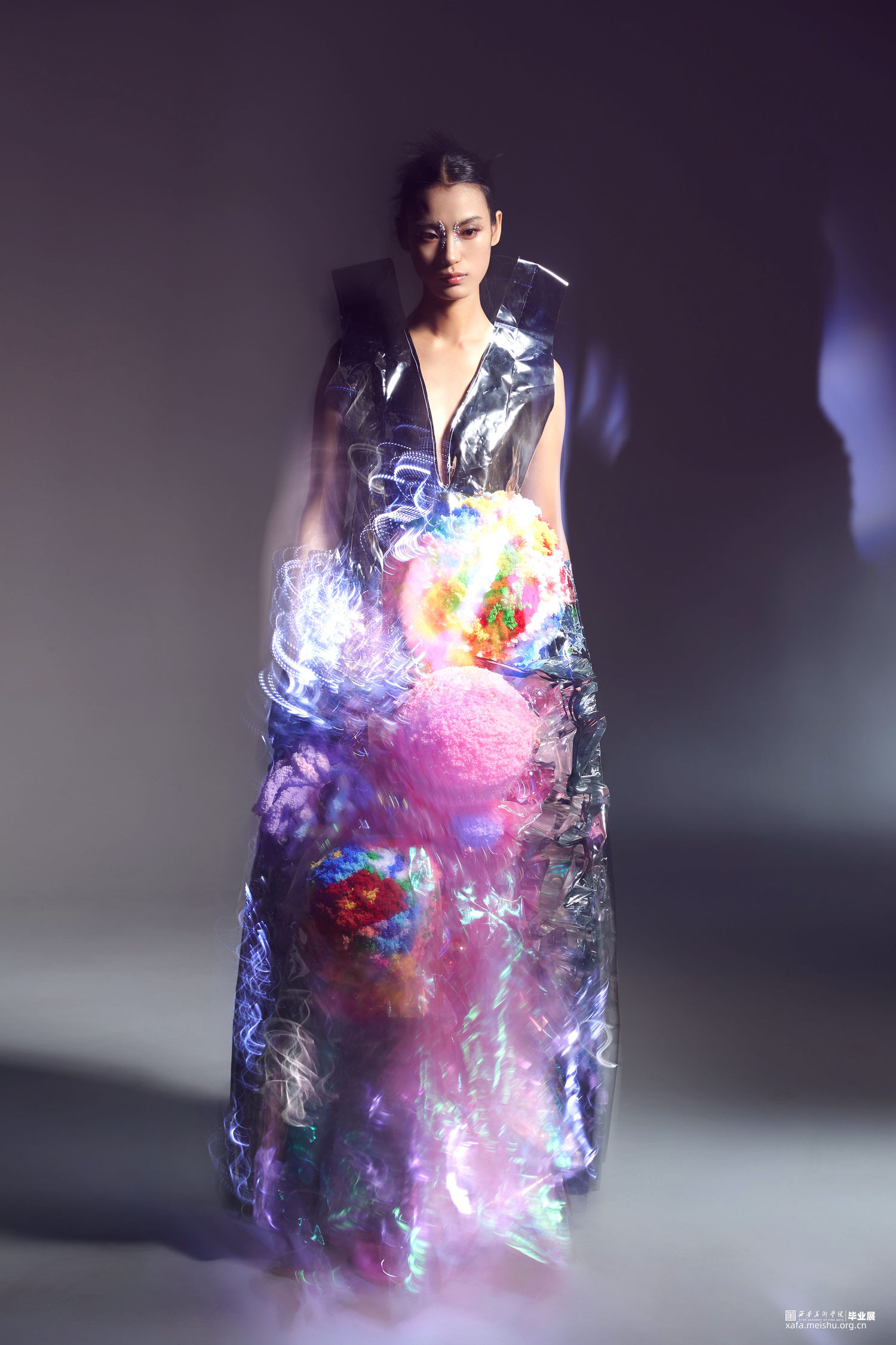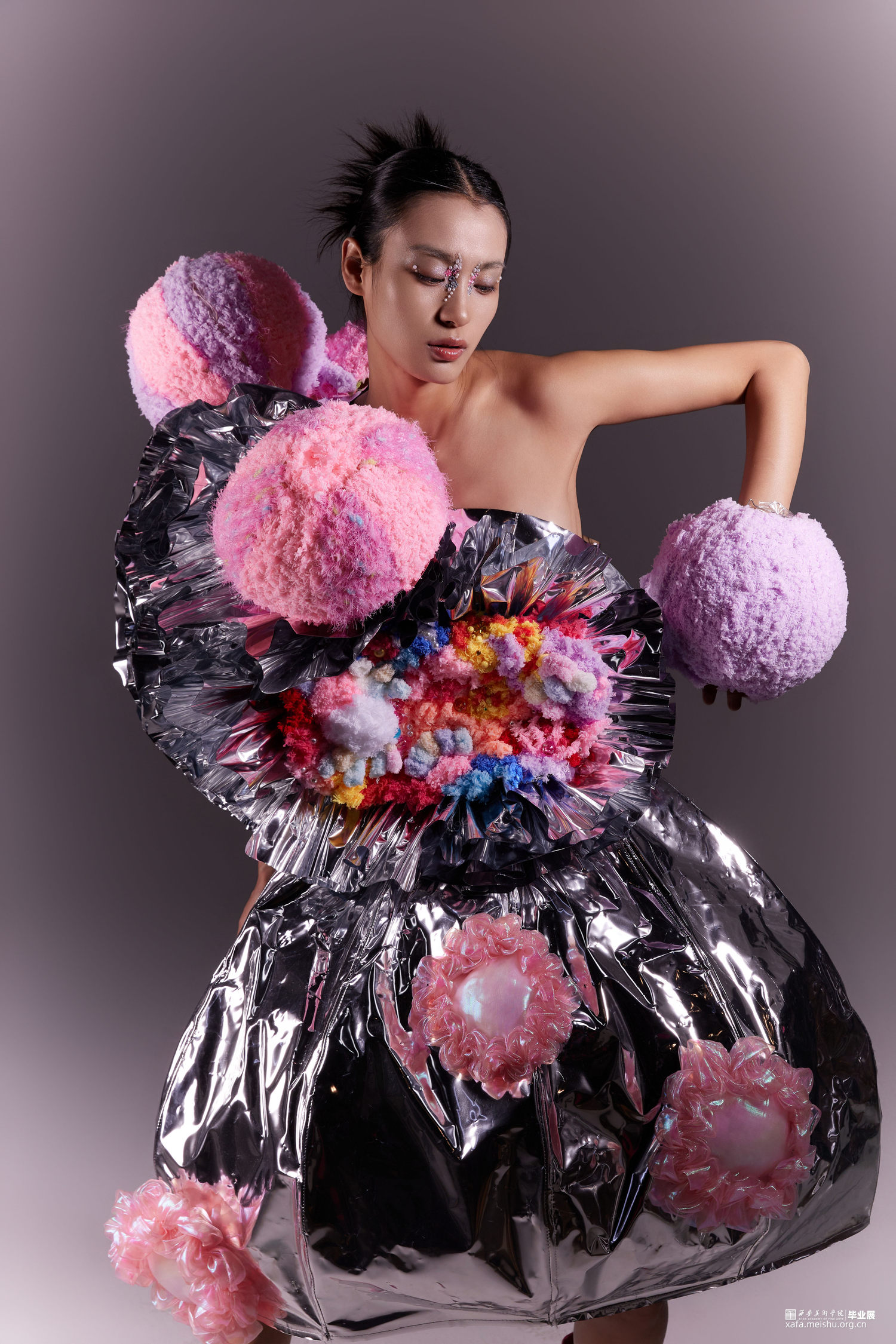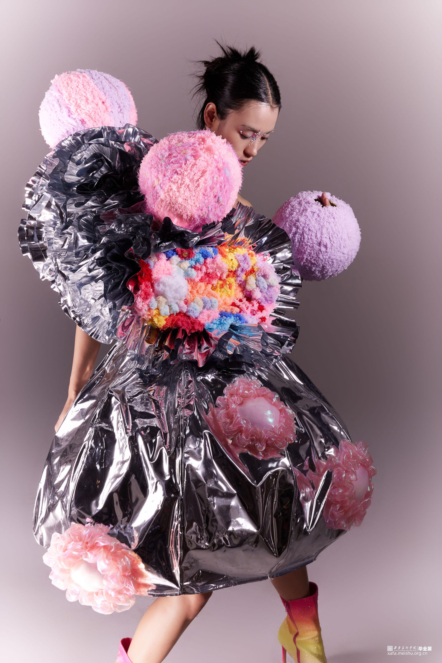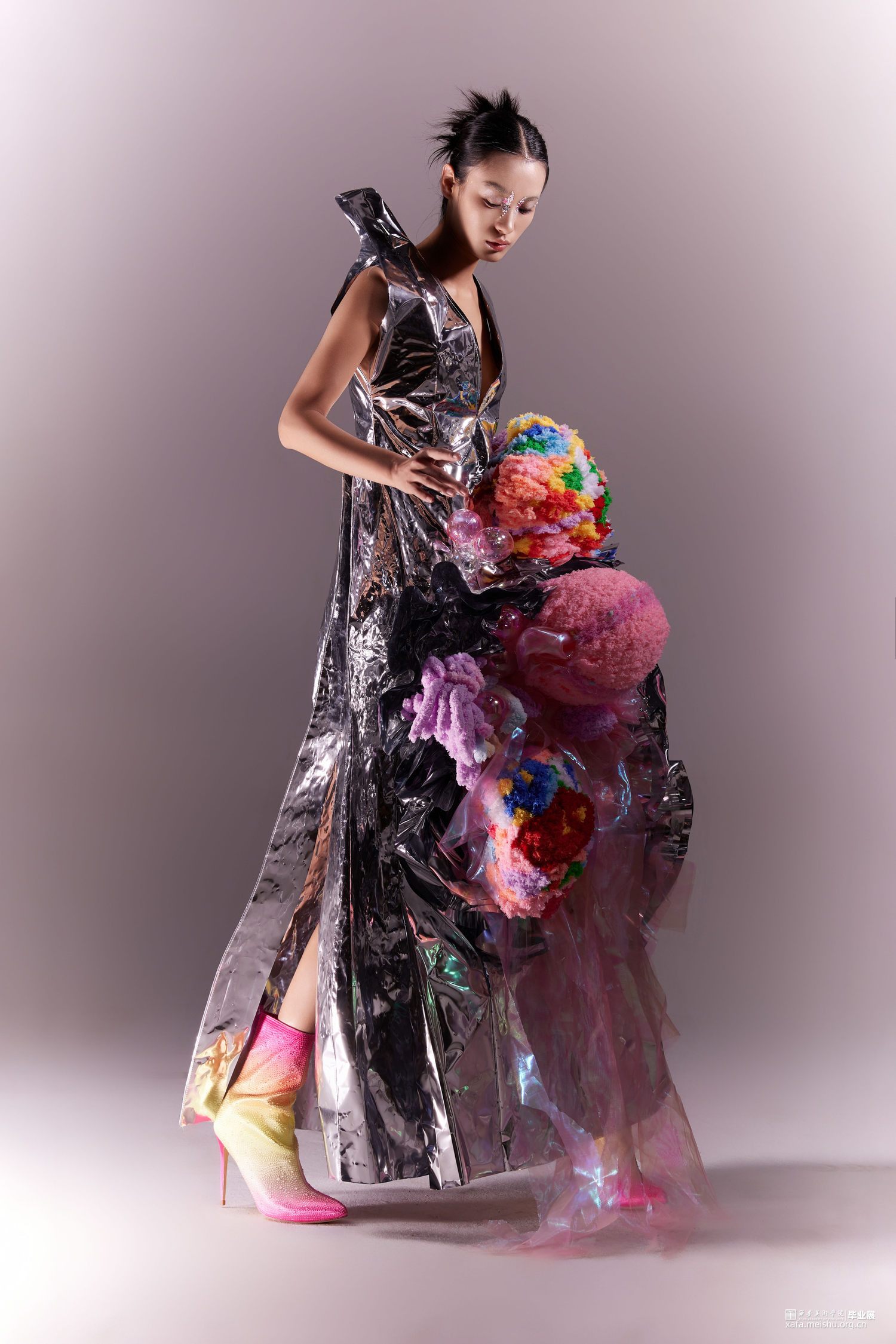 该作品以概念化的“膨胀”现象作具象化提取,用立体填充工艺作为主要表现方式,以填充改变服装廓形的形式来凸显出此种现象。