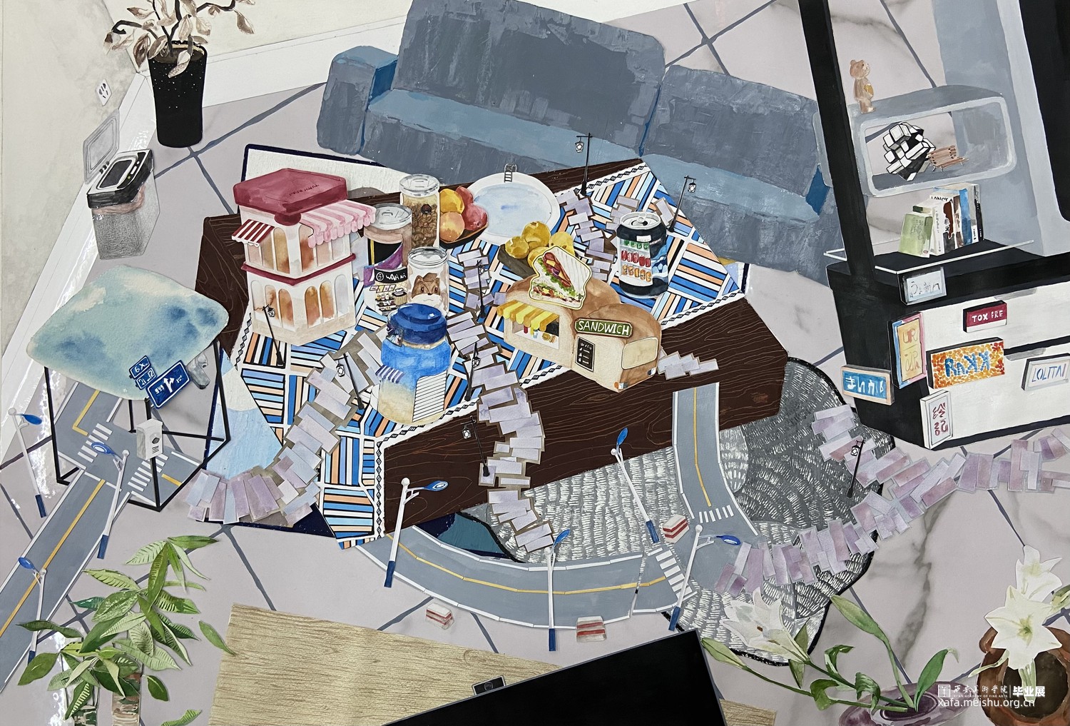 图一:画面中呈现的是作者家的客厅,将城市元素融入家具和生活用品,把画面中心的容器与食物改造成店铺与城市基础设施。再用周围的街道风景作为陪衬,让画面呈现出城市的效果。