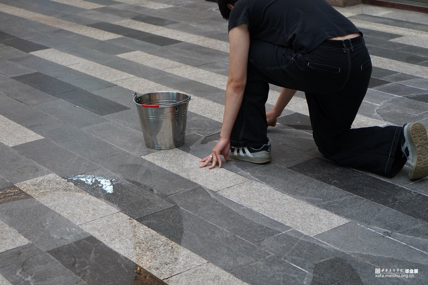 我选择了盐水作为媒介,反复书写和维持“2020-2024”这段数字。在行为过程中,水会不断的蒸发,最终在地面上行程一层结晶,如同汗水在身体上留下的汗渍一样。