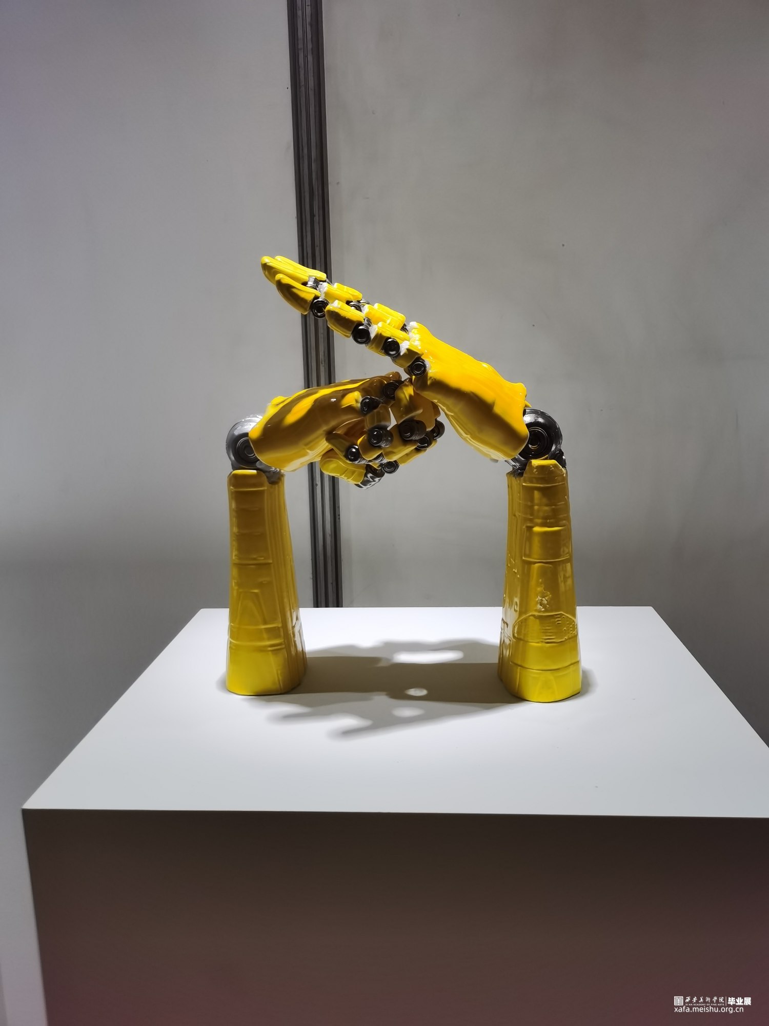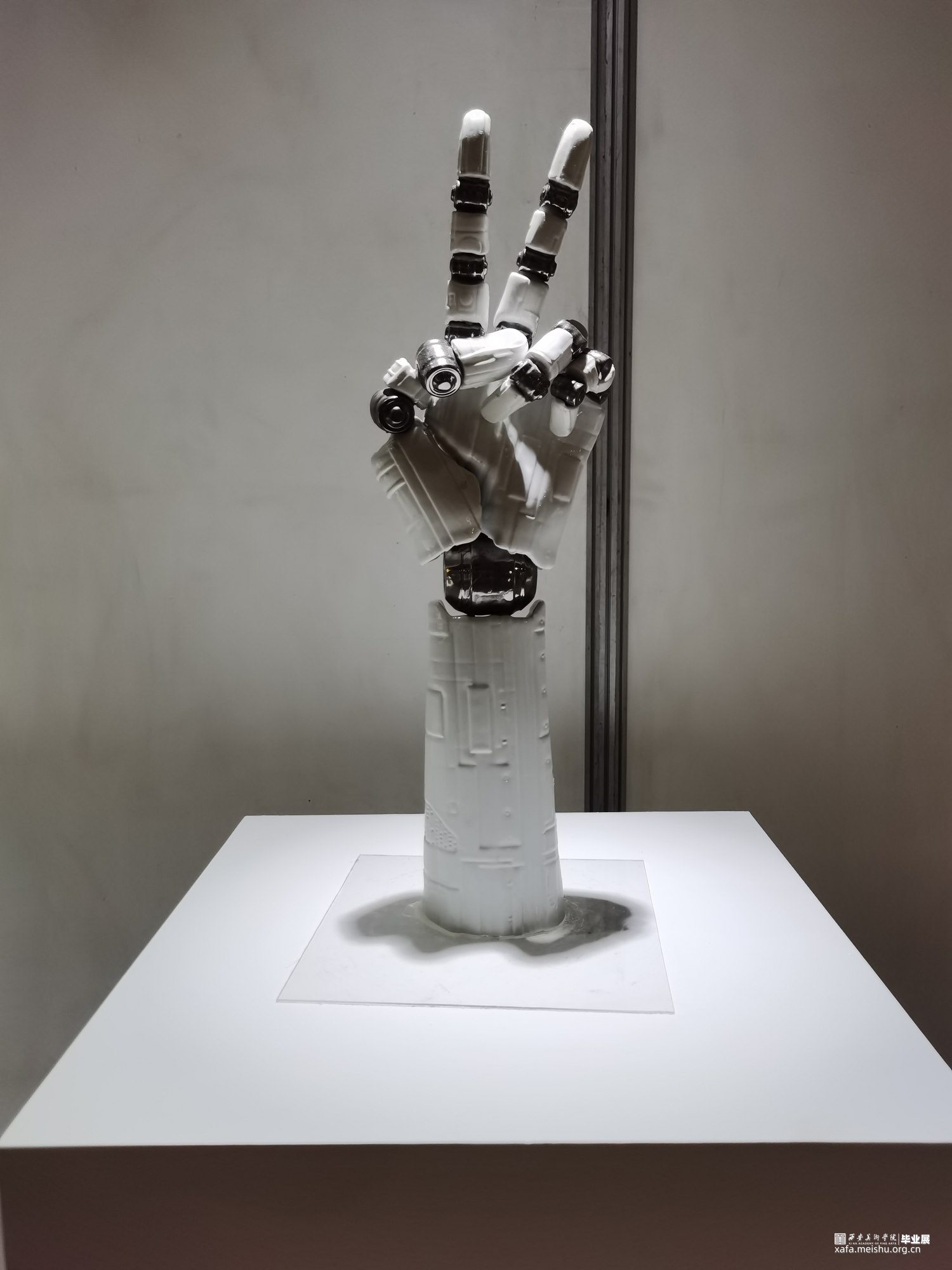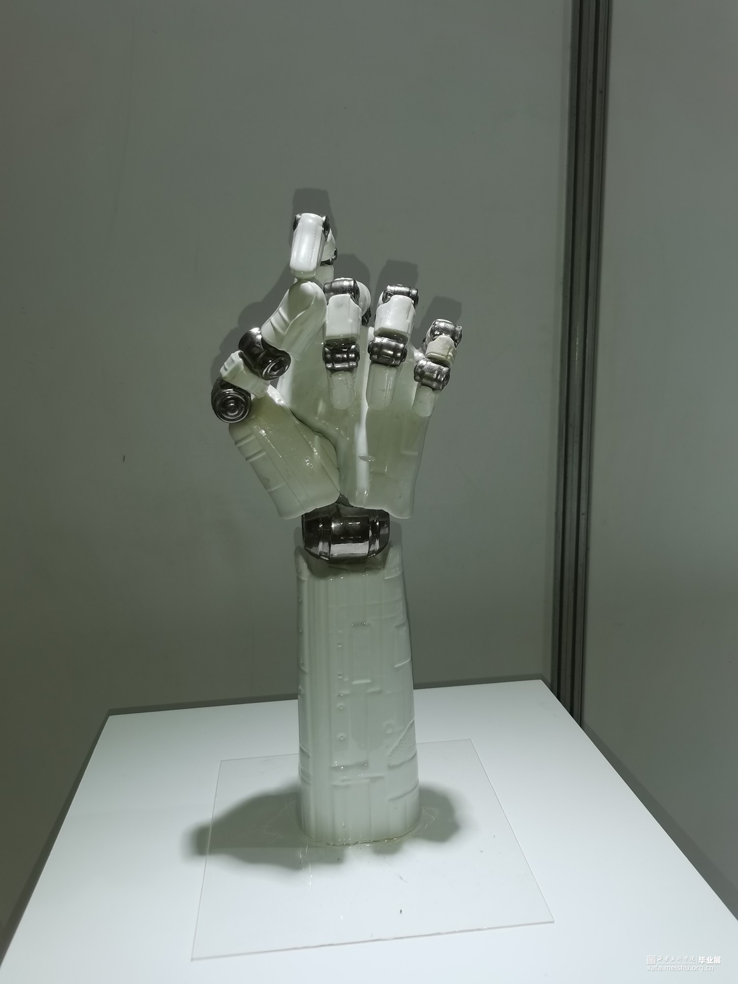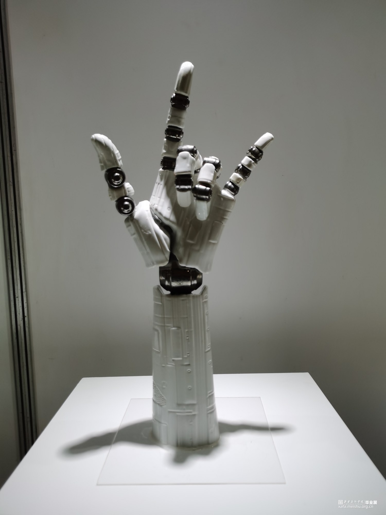随着时代的发展,艺术与科技的融合成为了一种趋势和潮流,更是一种创造力和创新力的结晶。该作品通过特殊的手势语言表达不同的意义:有“爱心“,有“胜利“,有“谢谢“和“点赞“,传递艺科融合下更需要人间温情或正能量的加持;该系列作品采用陶瓷模具注浆成型,附以颜色釉装饰后拼接而成;陶瓷材料虽冰冷,但手势却是温暖的。陶瓷手势符号的创意具有别具一格的新颖感和趣味性,陶瓷工艺严谨,增强了该系列作品所传达的科技、艺术与人性共融、并存的创作理念。