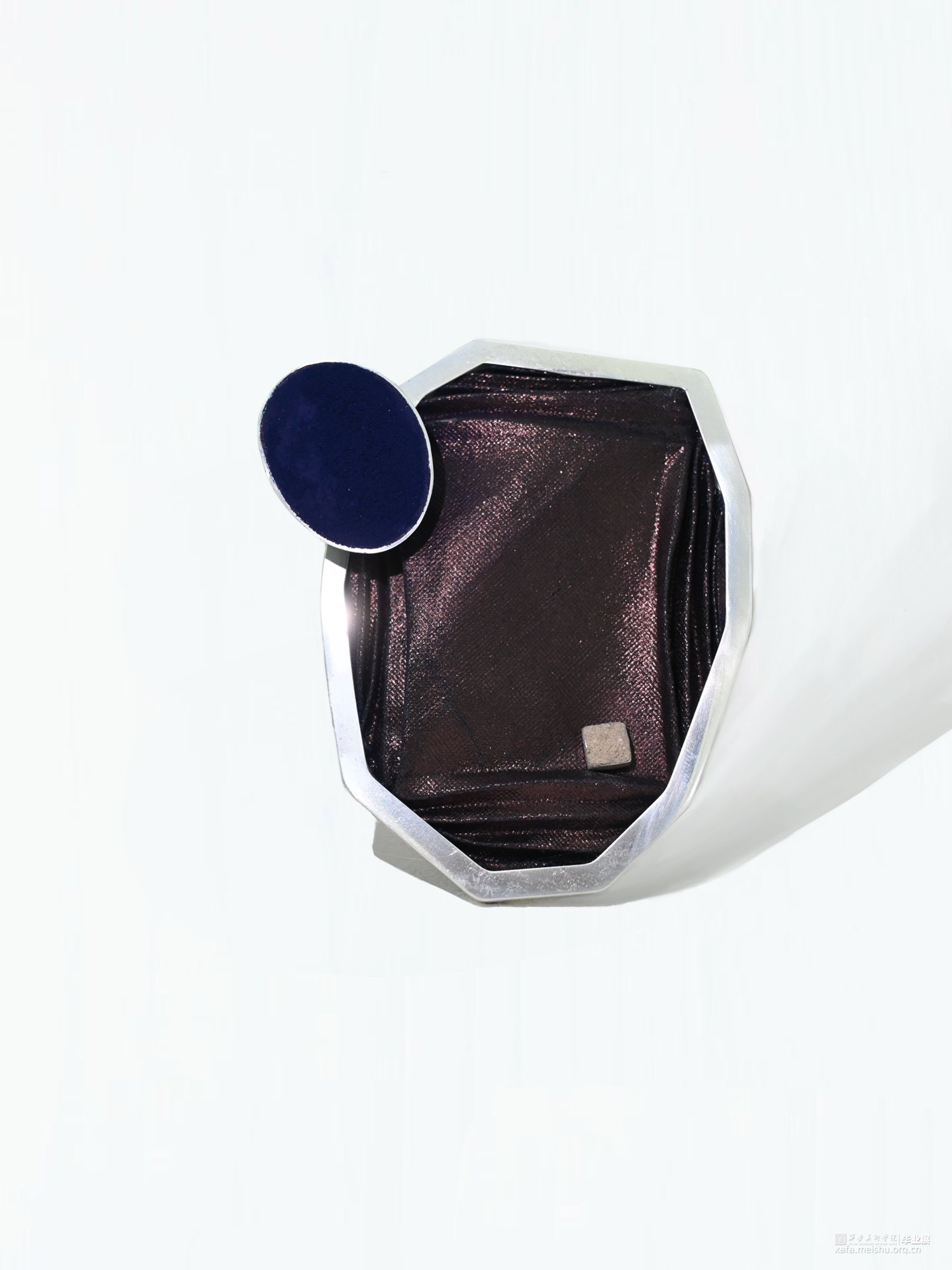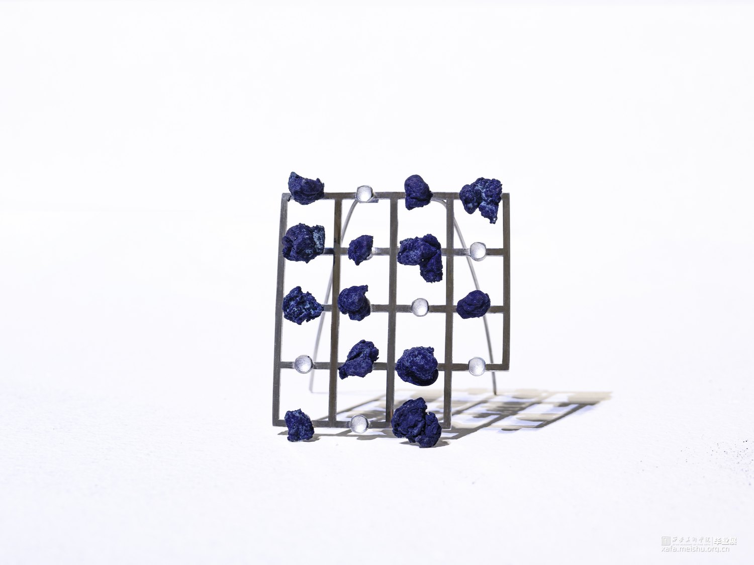 作品名称《青蓼》 作者姓名:嬴玉美 材料:蓝靛、银,檀木,纤维,牛皮胶 指导老师:高蕾,徐立乾,宋伟,孙鹤来,李喆 作品简介:这是一组运用侗族亮布材料以首饰形式呈现的作品,表现侗族人民尊重自然始终对小小的一块小布,一个饰物、一件服饰制作的用心,保持造物的虔诚,人和自然的共振,织履不止,靛染不停的一生诠释了“人一生,布一世”思想。将传统工艺材料与现代结合,感受材料独特的魅力,及其在工艺中流淌的生命的气息