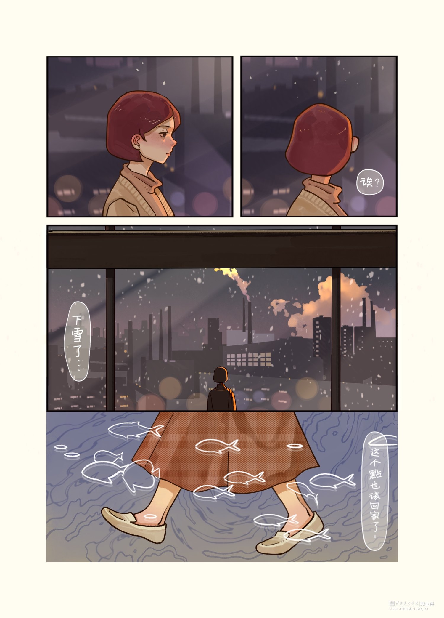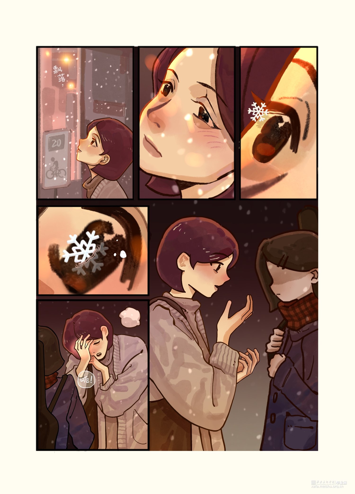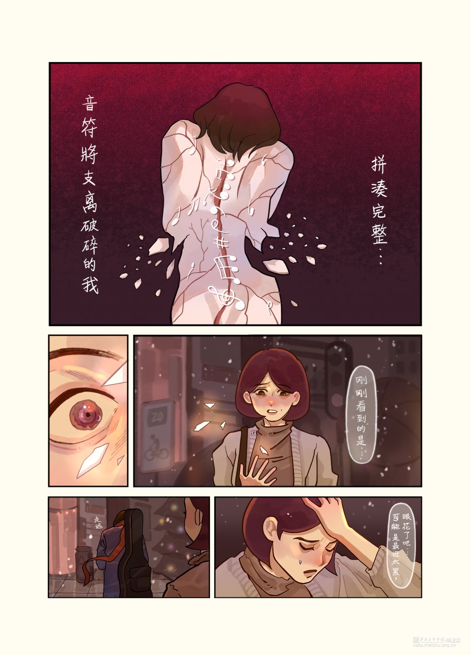 跟往日一样深夜加班后疲惫的主人公独自一个人走在繁华的街头,周围绚丽的一切与自己格格不入,天空突然飘起了零零散散的雪花,今年的雪下得格外早呢,主人公抬起头仰望雾蒙蒙的天空,这时一片形状奇特的雪花就这么不偏不倚的落入了主人公的眼睛,发呆之际身旁一个面色阴郁的高中少女不小心撞到了主人公,两人对视的一瞬间,有一种异样的感觉,主人公被拉入了少女的脑内世界,她看到少女挣脱了自卑、学校的烦恼以及同学的欺凌,勇敢的背起吉他追求自己的音乐梦想,闪闪发光的样子;