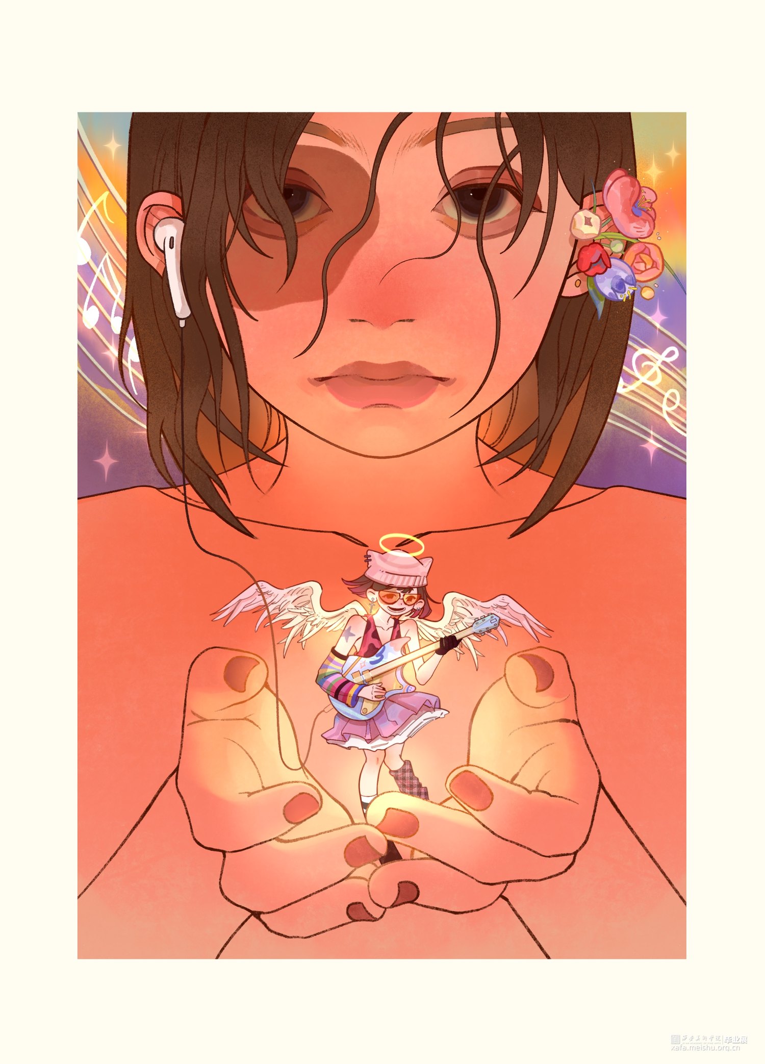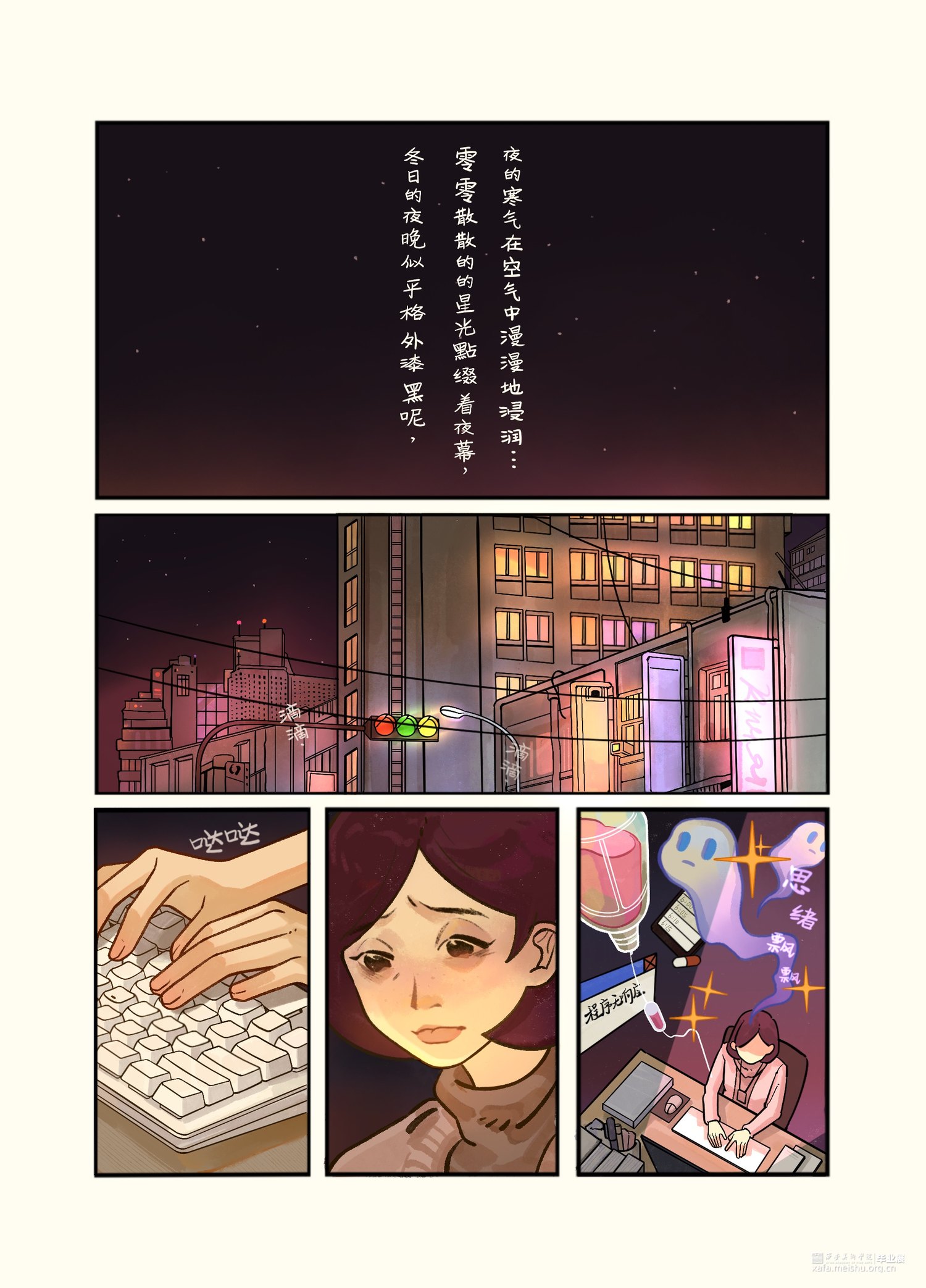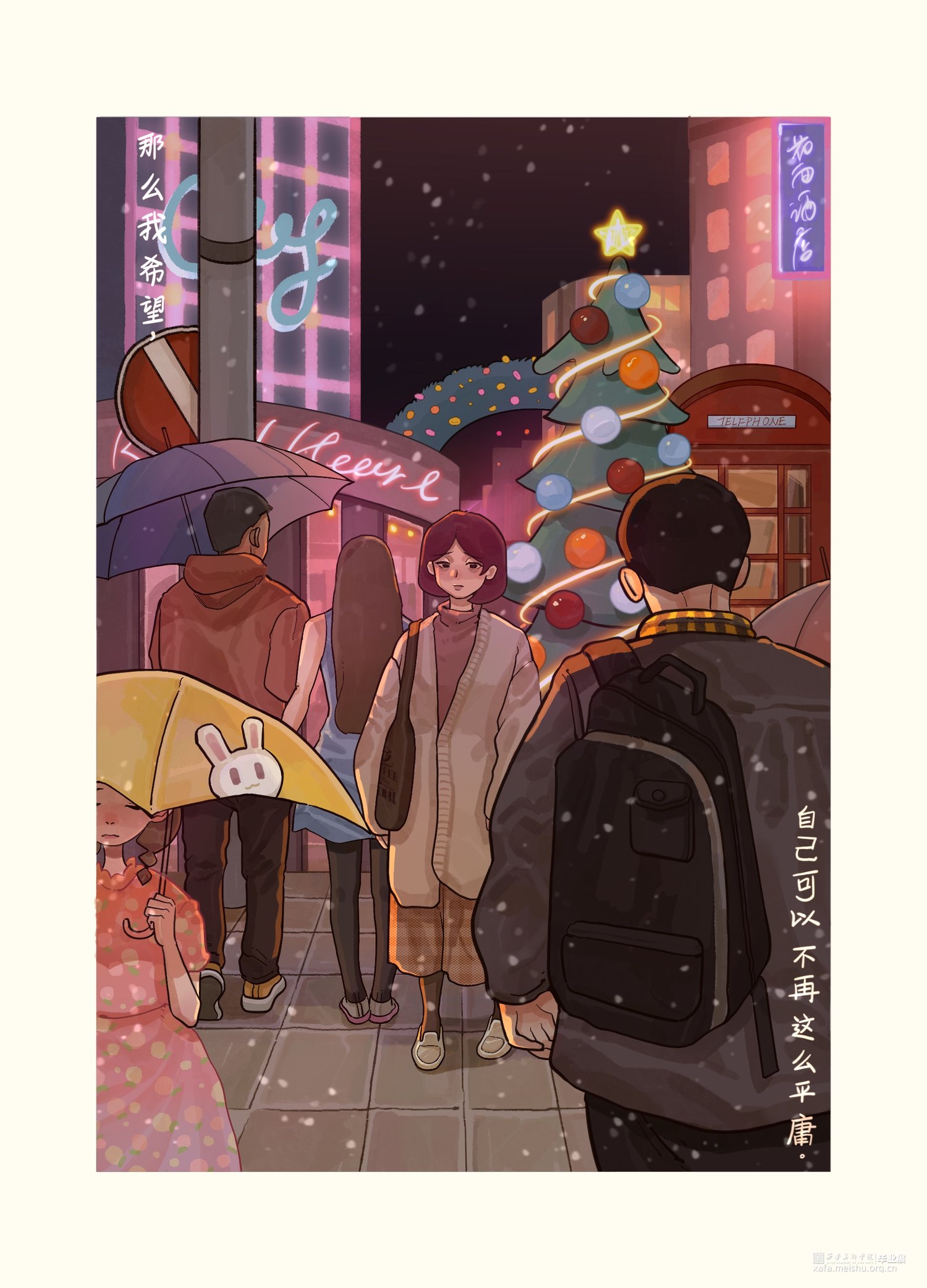跟往日一样深夜加班后疲惫的主人公独自一个人走在繁华的街头,周围绚丽的一切与自己格格不入,天空突然飘起了零零散散的雪花,今年的雪下得格外早呢,主人公抬起头仰望雾蒙蒙的天空,这时一片形状奇特的雪花就这么不偏不倚的落入了主人公的眼睛,发呆之际身旁一个面色阴郁的高中少女不小心撞到了主人公,两人对视的一瞬间,有一种异样的感觉,主人公被拉入了少女的脑内世界,她看到少女挣脱了自卑、学校的烦恼以及同学的欺凌,勇敢的背起吉他追求自己的音乐梦想,闪闪发光的样子;
