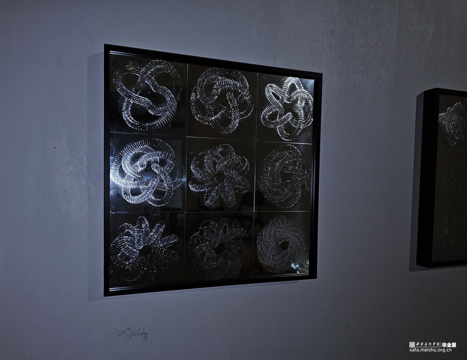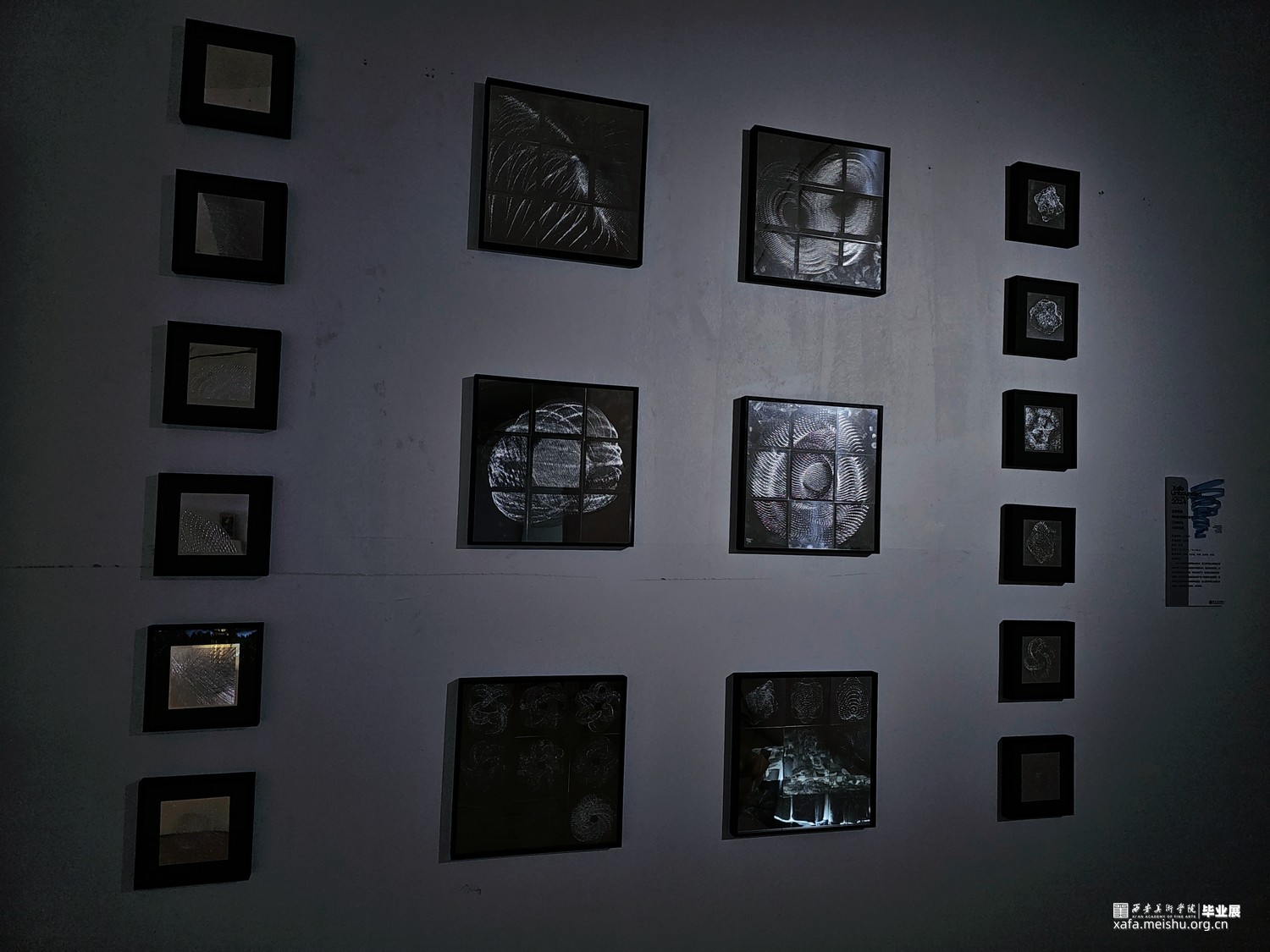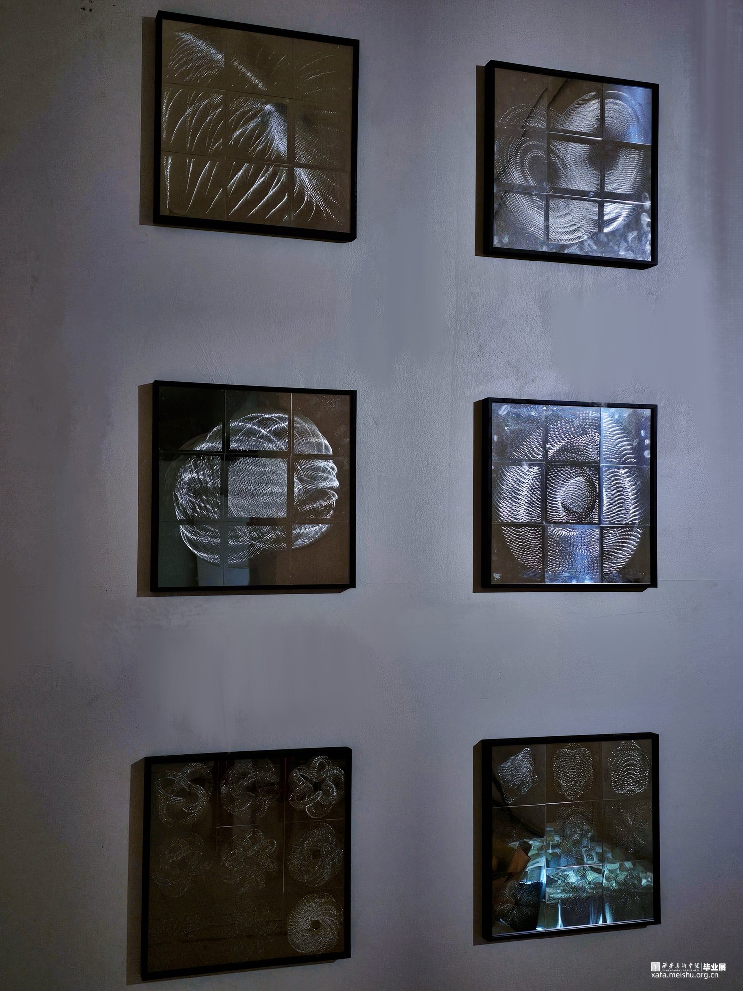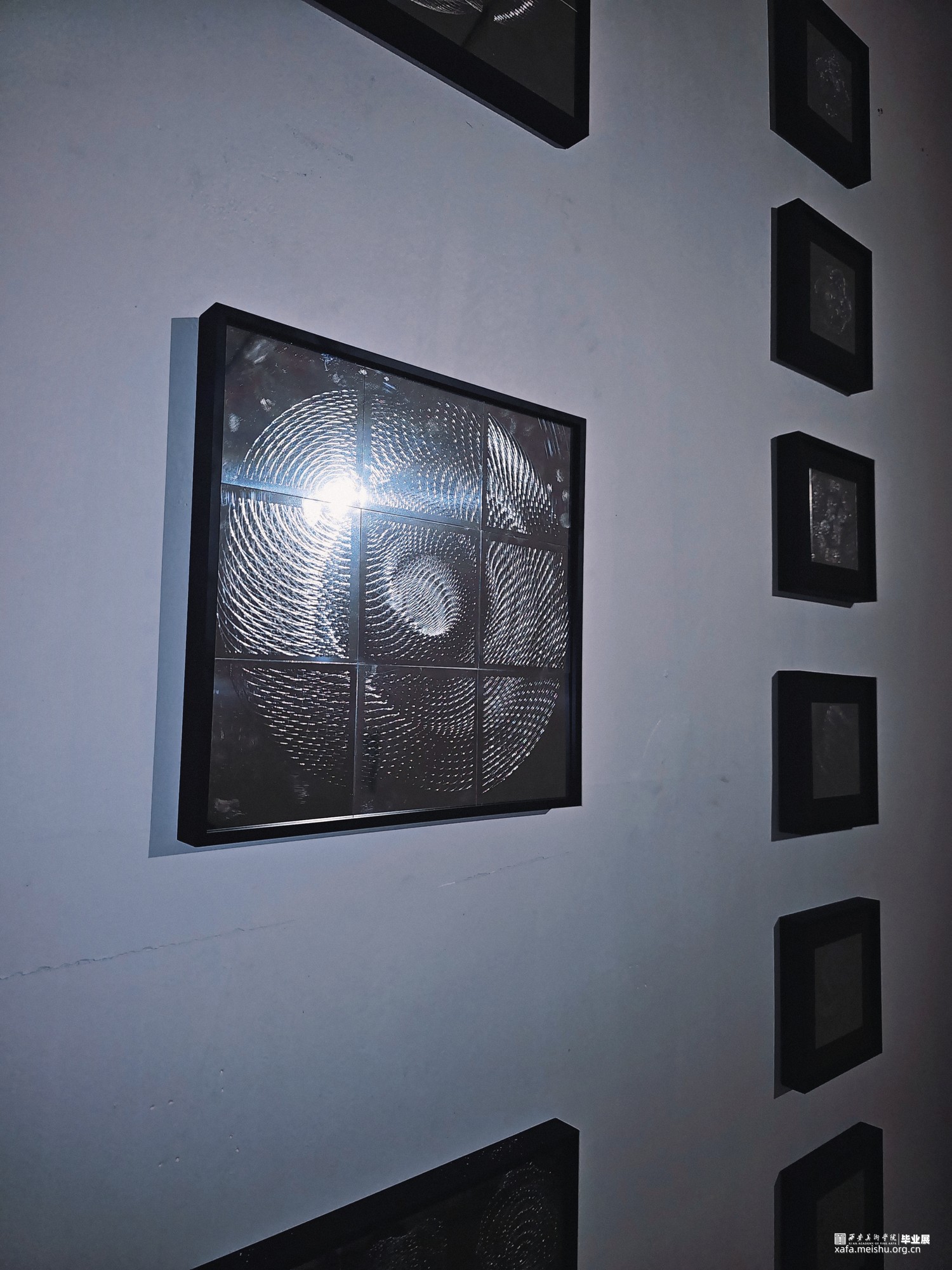 毕业创作《幻境》通过刮擦全息技术,在二维平面上创造出三维视觉效果。作品运用金属板作为成像材料,通过设计的刮痕,实现了图像的动态3D效果。在白光条件下,材料板上呈现出丰富的图像。因光在特定曲面反射时会产生一些值得关注的现象,利用高反光度金属划痕与光线形成反射,使人眼在平面上看到立体的影像。越黑暗光反射越强则效果越好。