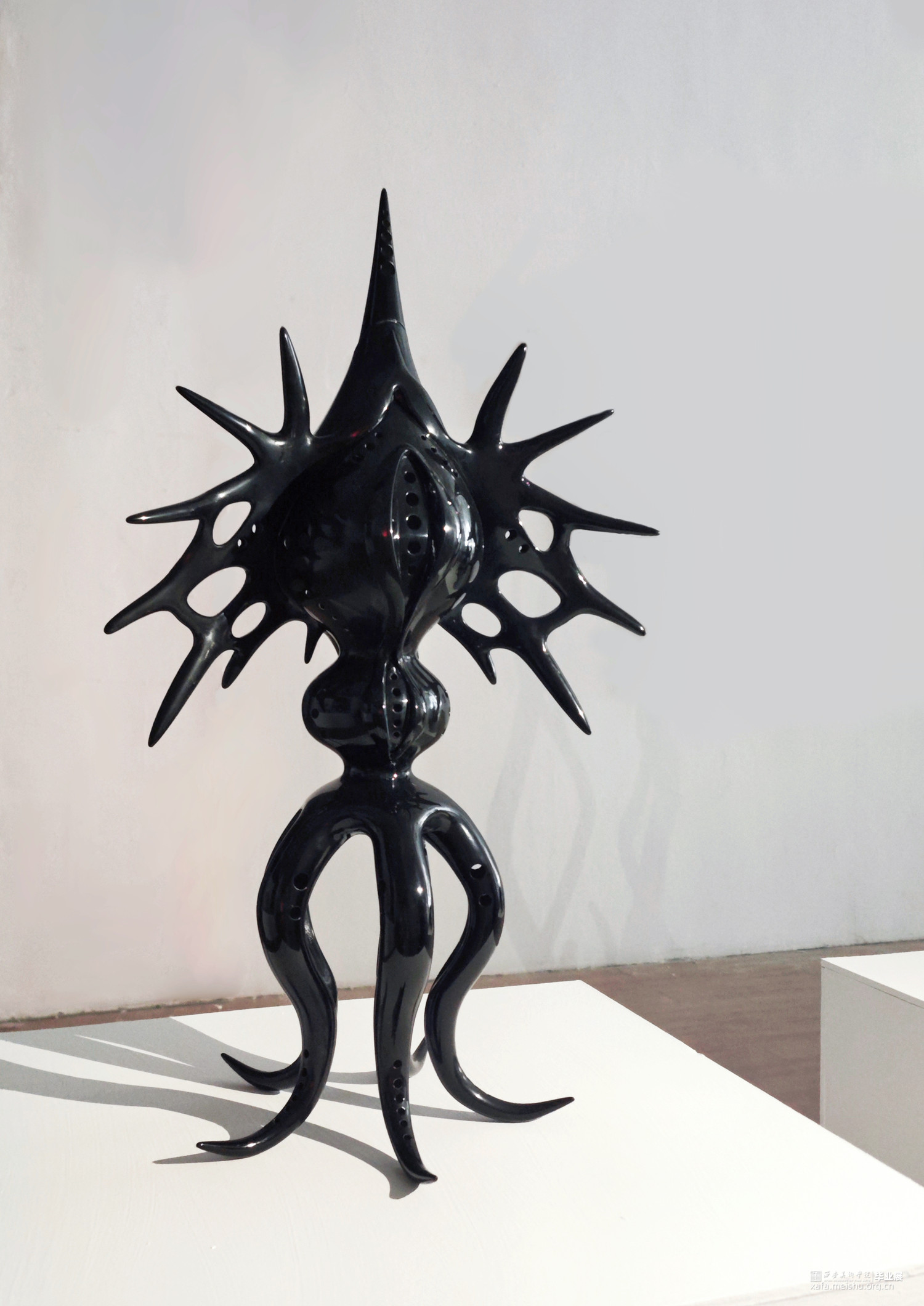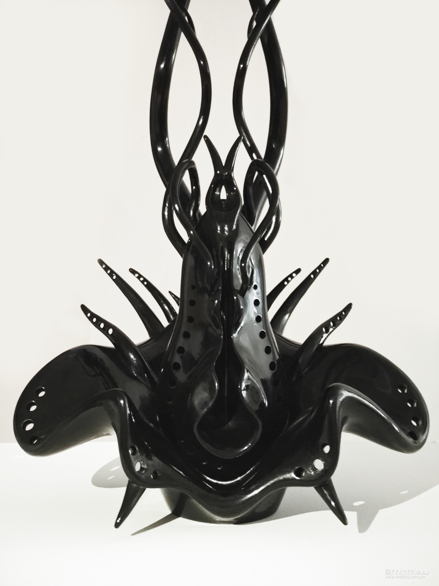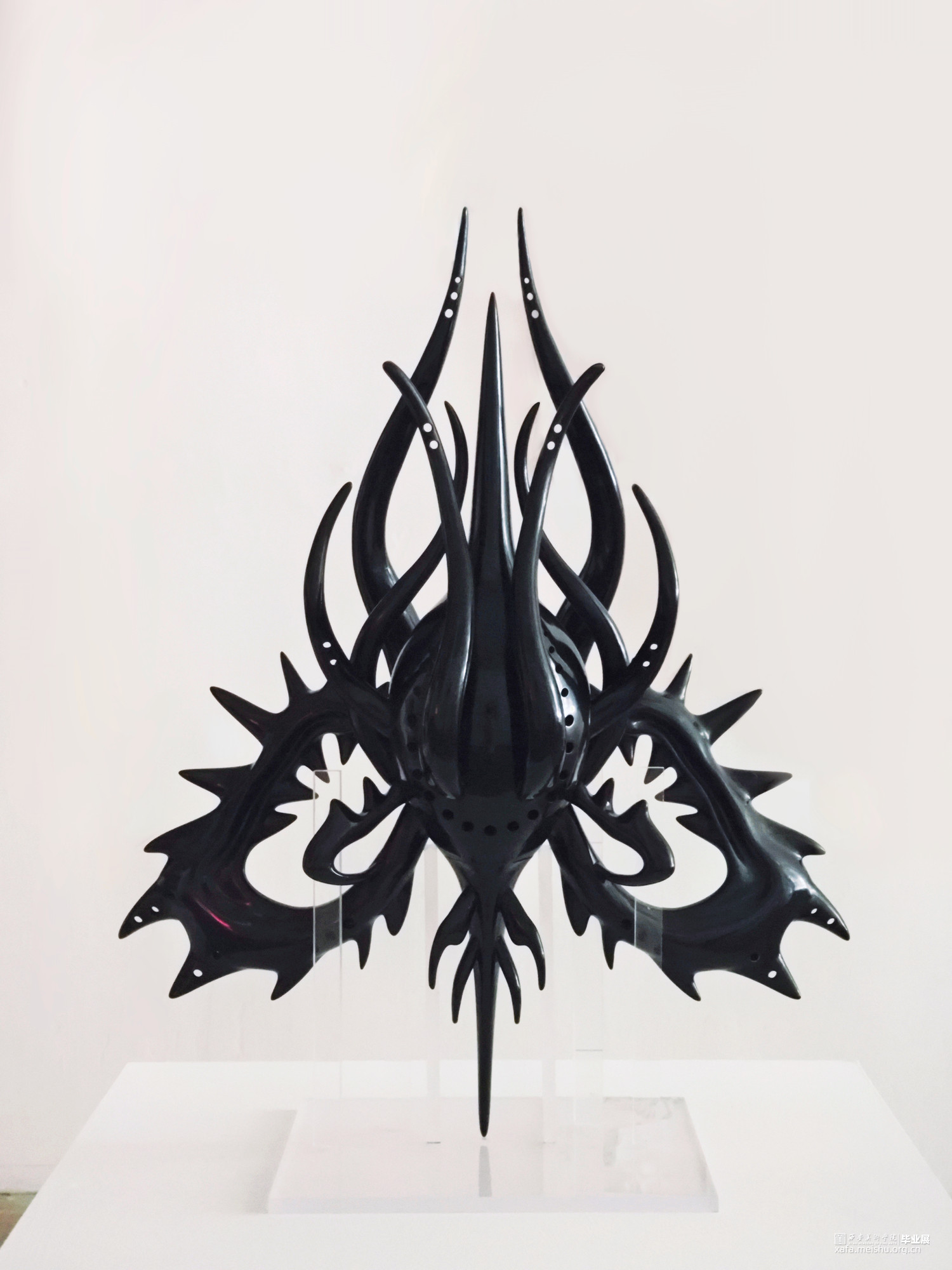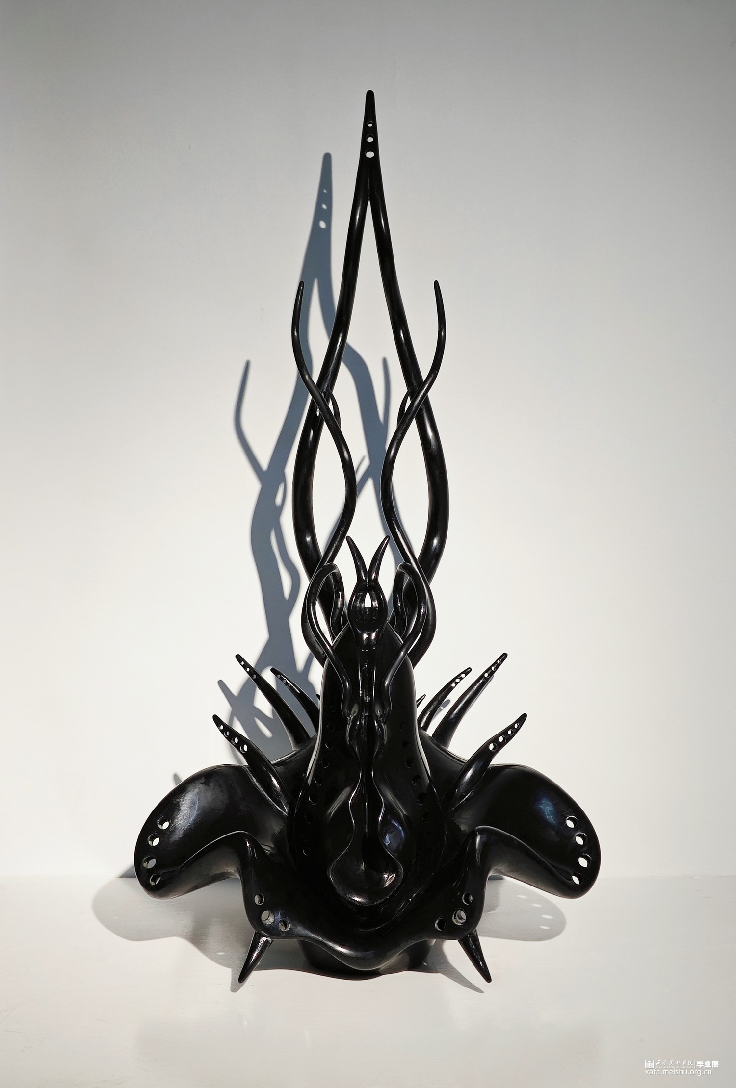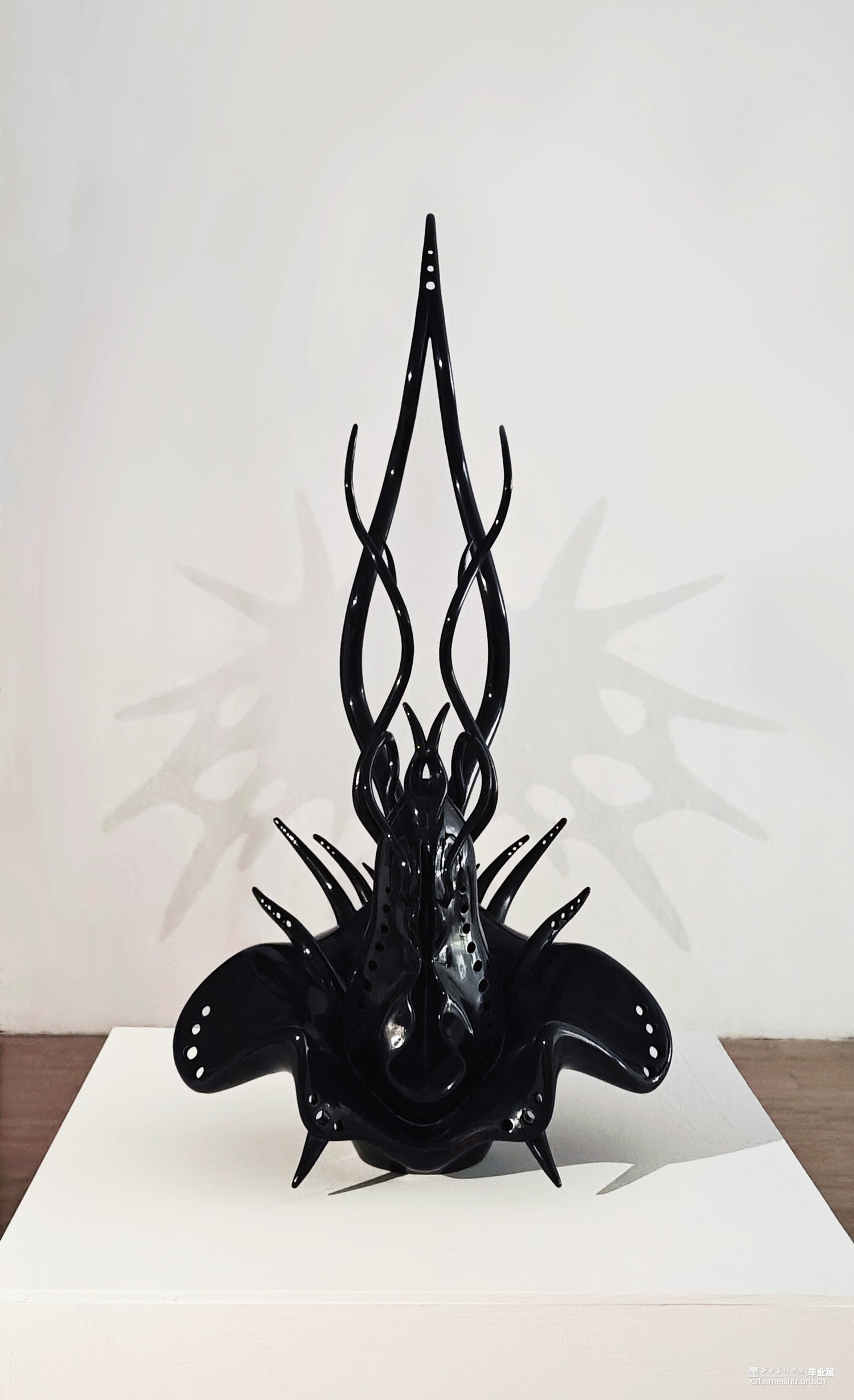 维持自然造物对称性的秩序,同时幻想变异系统演化的失衡。该作品以植物、骨骼与深海生物造型为灵感结合而成,漆色之黑为其披上了一层神秘气息,也赋予其温润的光泽感。表现对于未知生物的组合与想象、生命与机械化形态共生的思考,具有仿生感而“缺失”具体的眼、鼻、口——这正是其生存之道。或许它们中的一员,正于世界的某个角落悄然诞生。