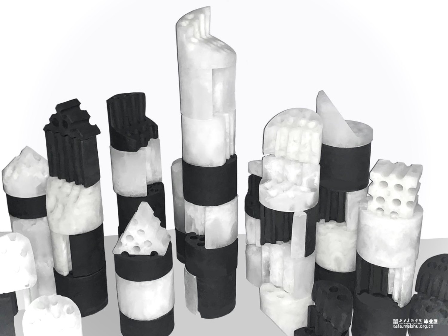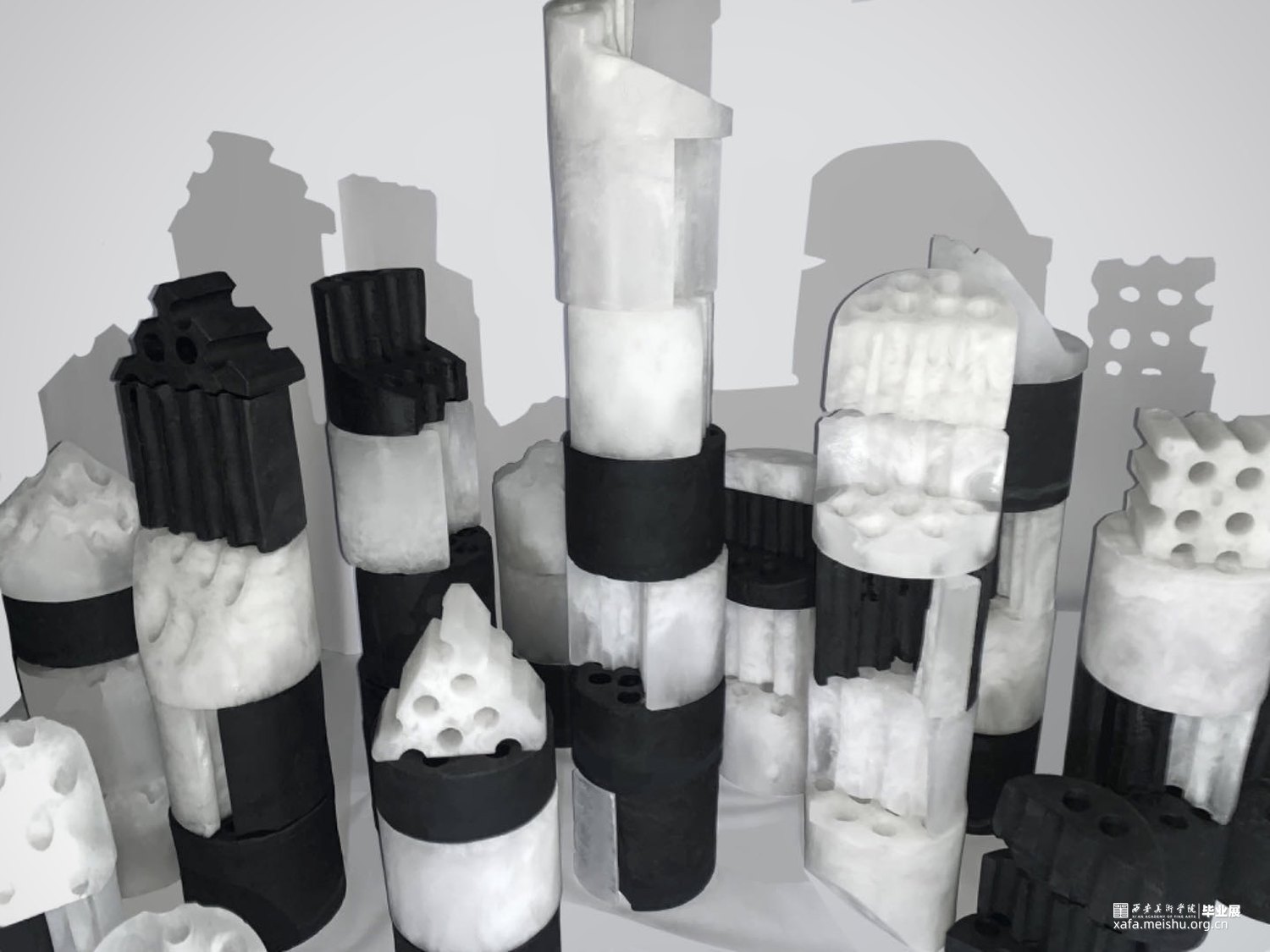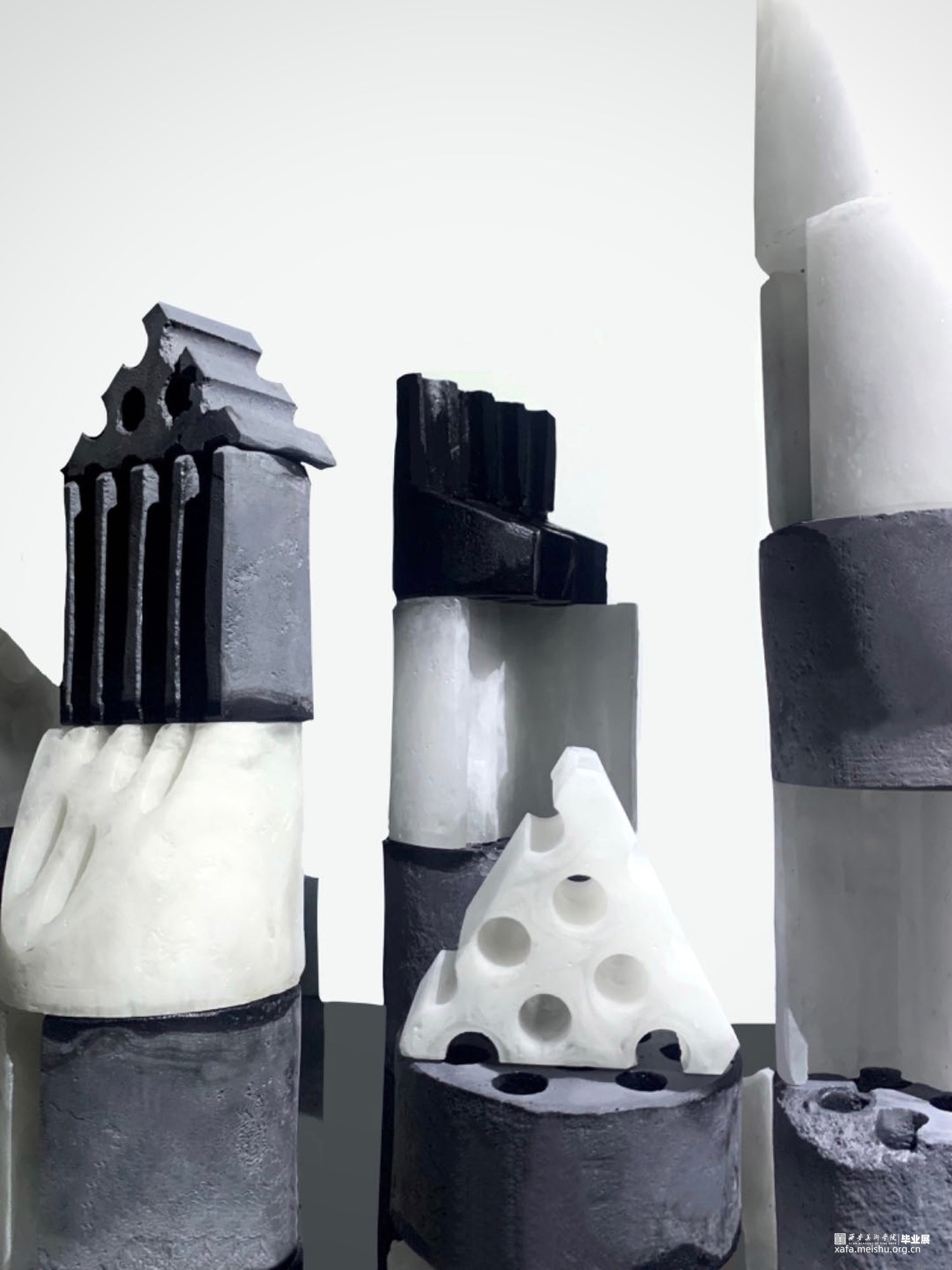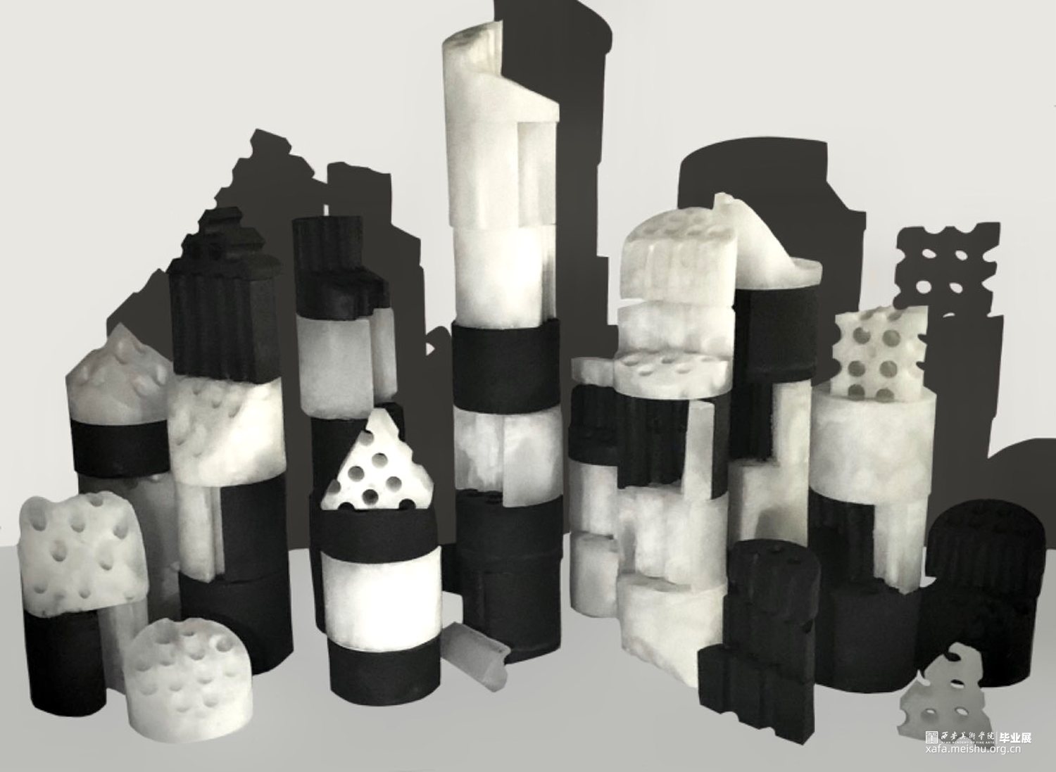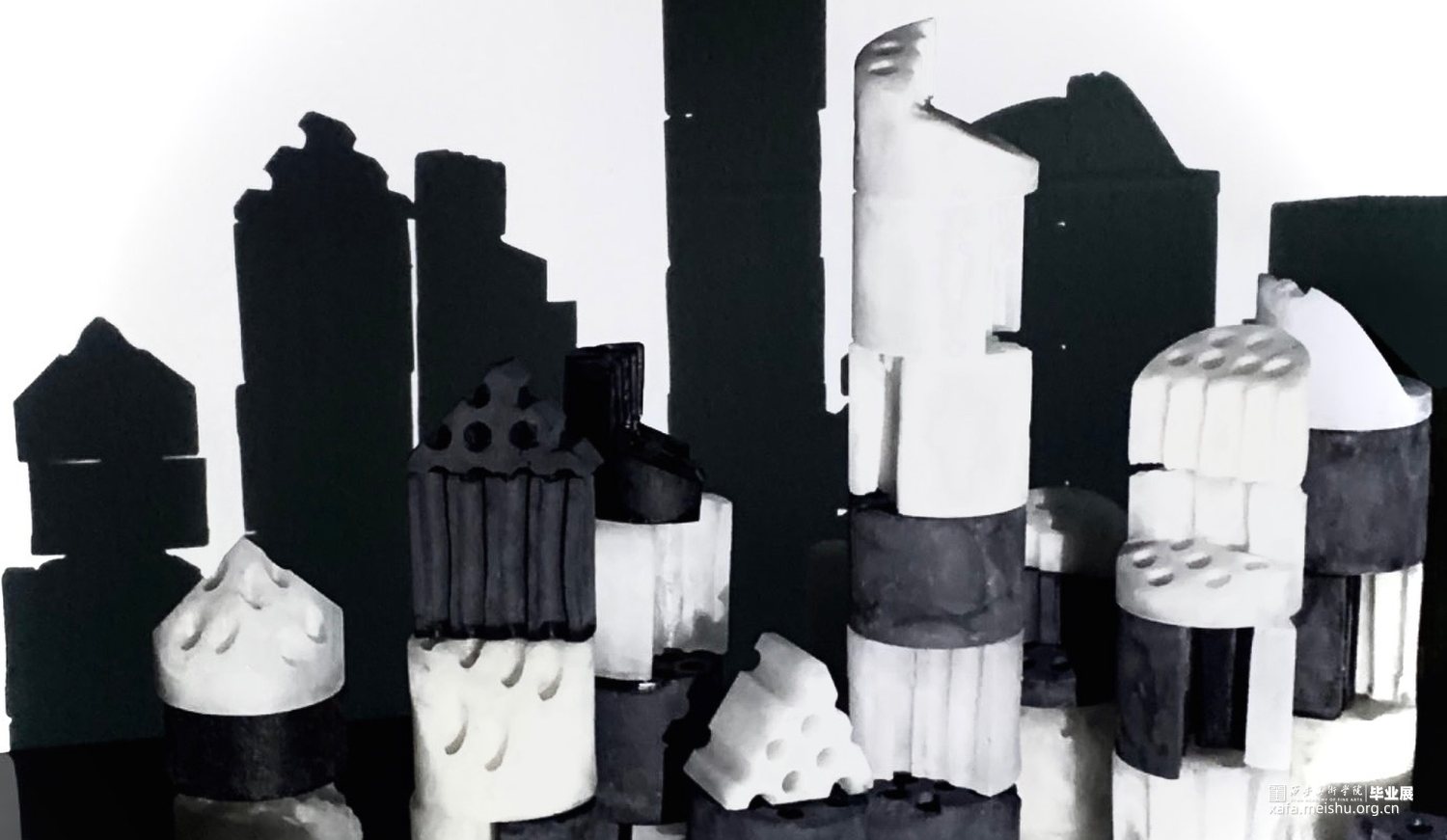 在当今快速发展的社会背景下,城市化进程不断加速,建筑形态日益多样化。然而,这种快速变化也带来了一系列问题,如建筑风格的趋同、历史文化的消逝等。蜂窝煤作为一种传统的燃料,曾经是家庭生活中不可或缺的一部分。然而,随着社会的进步和能源结构的转变,蜂窝煤逐渐被淘汰,成为了一个时代的记忆。我选择了以玻璃制作的蜂窝煤作为切入点,将这种传统元素与现代设计理念相结合,通过解构与重组的方式,旨在唤起人们对于过去与未来的思考。这组作品不仅继承了煤的质朴和厚重,更在火焰的洗礼中获得了玻璃独特的光泽与色彩。采用了解构切割的手法,将蜂窝煤玻璃拆解成形状各异的碎片。每一片玻璃都像是承载着一段故事,这些碎片被重新拼接组合,形成了宛如建筑废墟一般的形态,粉烧玻璃的独特质感和建筑废墟的意象在作品中完美融合,光影打在上面呈现出建筑群的剪影,构成了一幅既深刻又动人的画面。既是一种对过往岁月的回忆,又是对未来可能性的探索。无论是蜂窝煤还是玻璃,无论是废墟还是建筑,都是人类文明发展的产物,都承载着我们的智慧与情感。当我们以全新的视角和手法去解构、重构这些元素时,便可以创造出前所未有的美学体验。