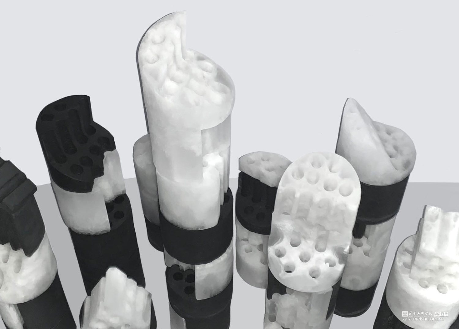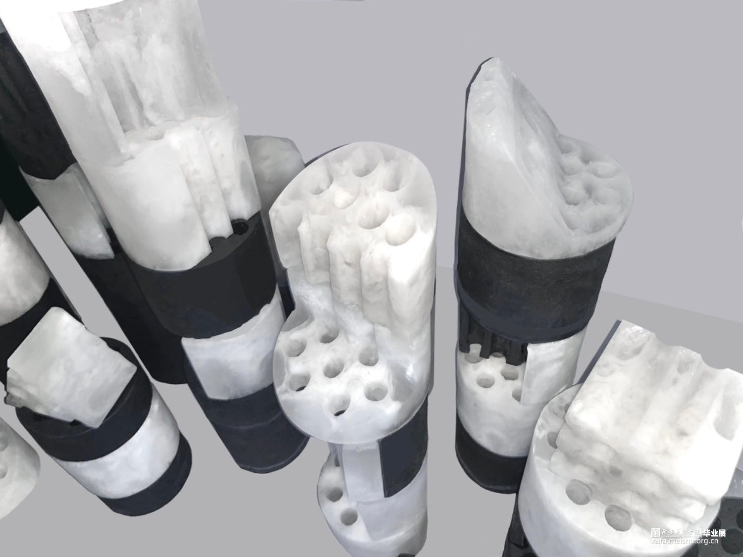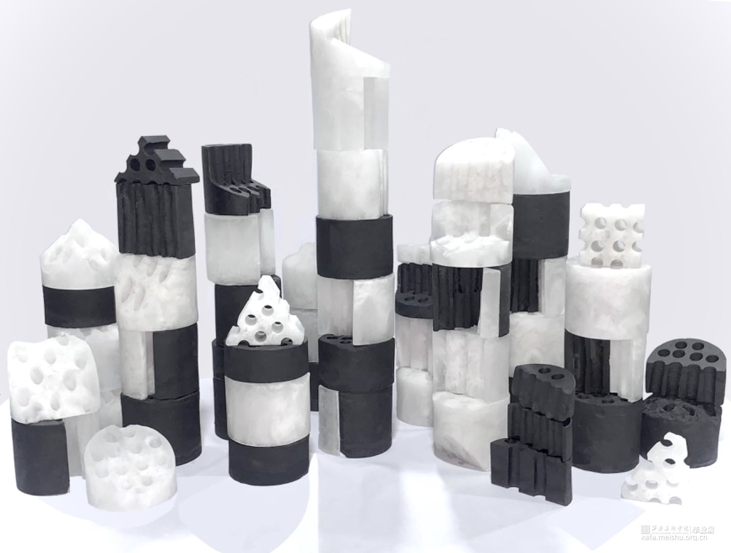 当今快速发展的社会背景下,城市化进程不断加速,建筑形态日益多样化。这种快速变化也带来了一系列问题,如建筑风格的趋同、历史文化的消逝等。蜂窝煤作为一种传统的燃料,曾经是家庭生活中不可或缺的一部分,但也随着社会的进步和能源结构的转变逐渐被淘汰,成为了一个时代的记忆。以玻璃制作的蜂窝煤作为切入点,将这种传统元素与现代设计理念相结合,通过解构与重组的方式,旨在唤起人们对于过去与未来的思考。这组作品不仅继承了煤的质朴和厚重,更在火焰的洗礼中获得了玻璃独特的光泽与色彩,粉烧玻璃的独特质感和建筑废墟的意象在作品中完美融