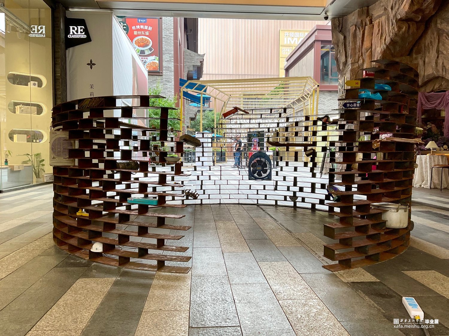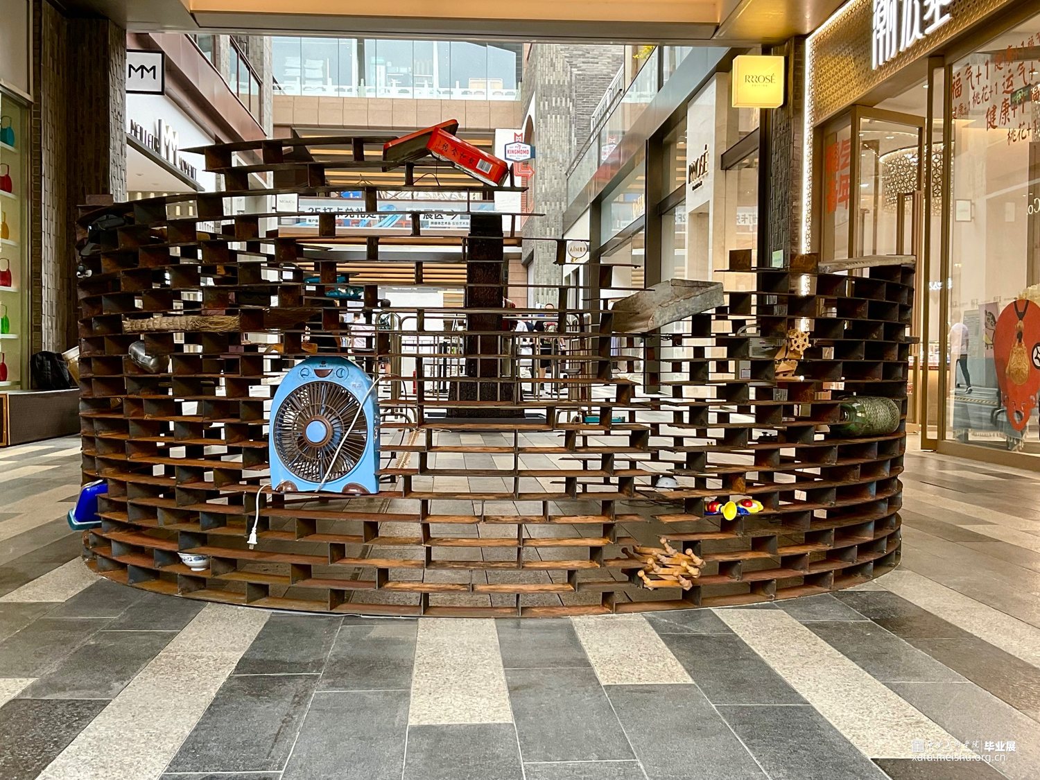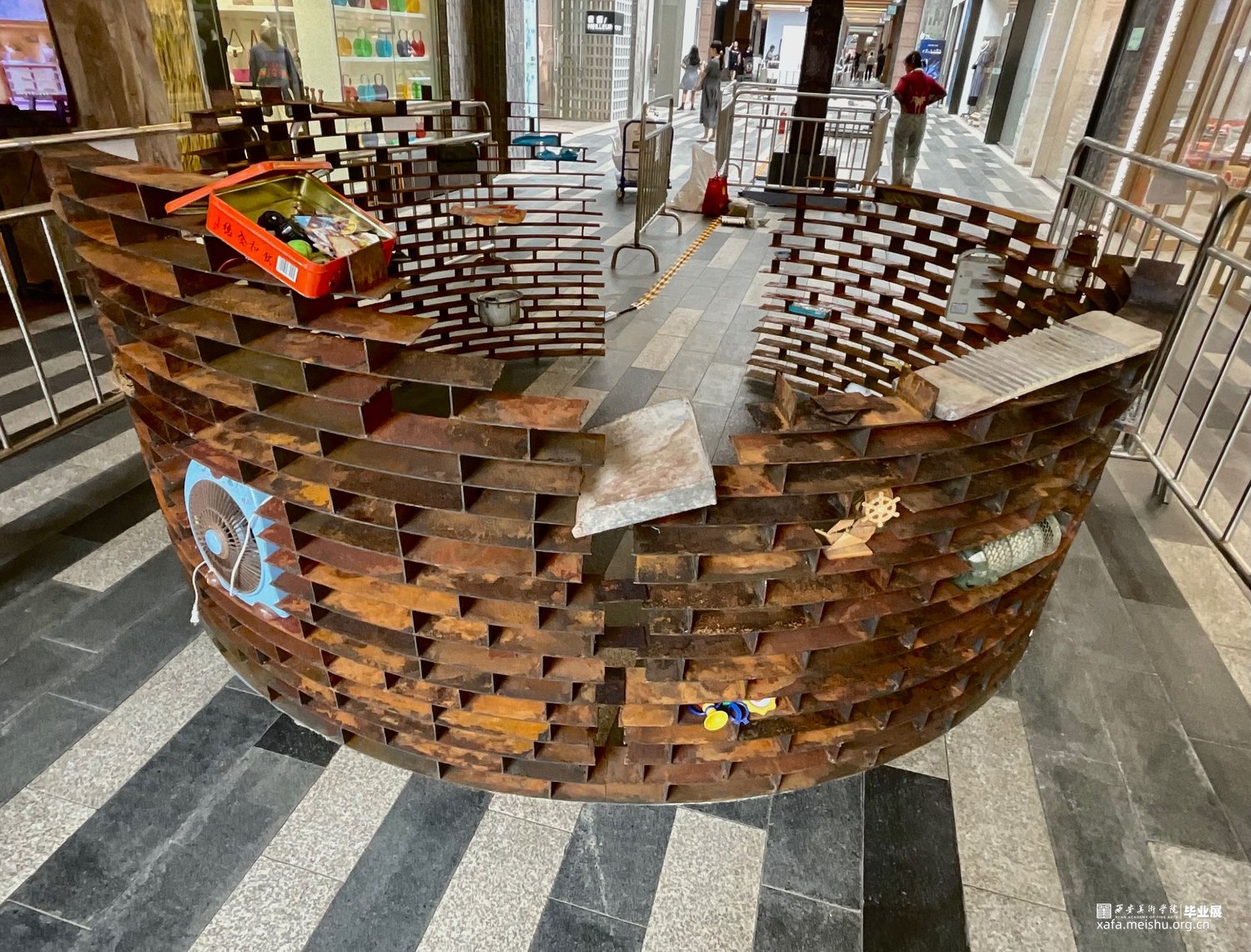 该作品灵感来⾃于⽼家旧屋迁拆,幼时的记忆会随年龄增⻓逐渐退化直⾄被消解。作品旨在重塑过去的记忆,将家乡拆掉的旧砖与⽼物件⽤破败围屋的建造⽅式在现代化的公共空间重新转化,构成时间和记忆的当代含义。但作品并为展示砖块,⽽是⽤砖块的造型作为主要表达,这也是与现代⼯业化下的城市发展有关。其中声⾳部分也是来⾃农村地区⽣活化场景,观者可以进入作品中间进行体验。