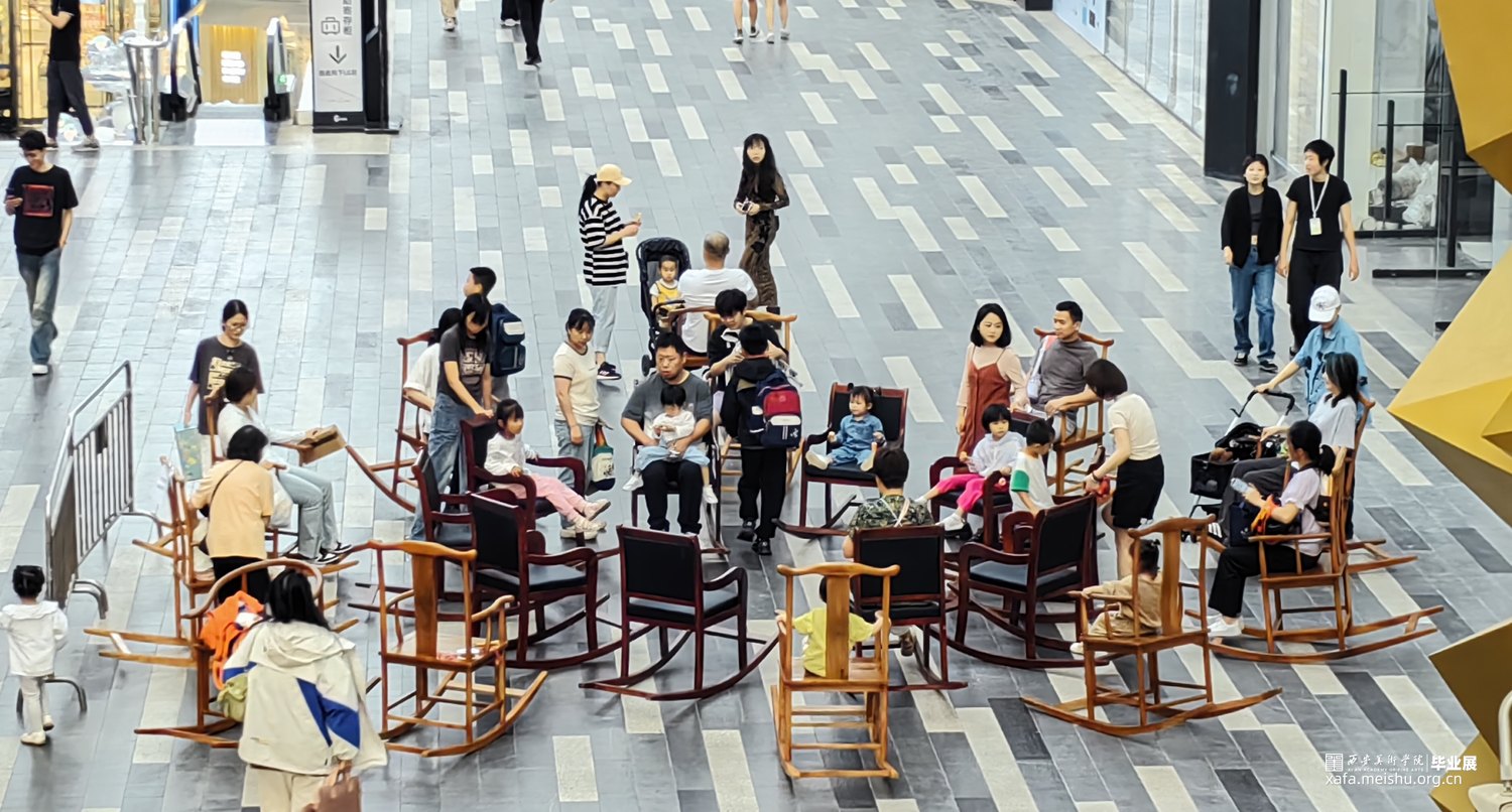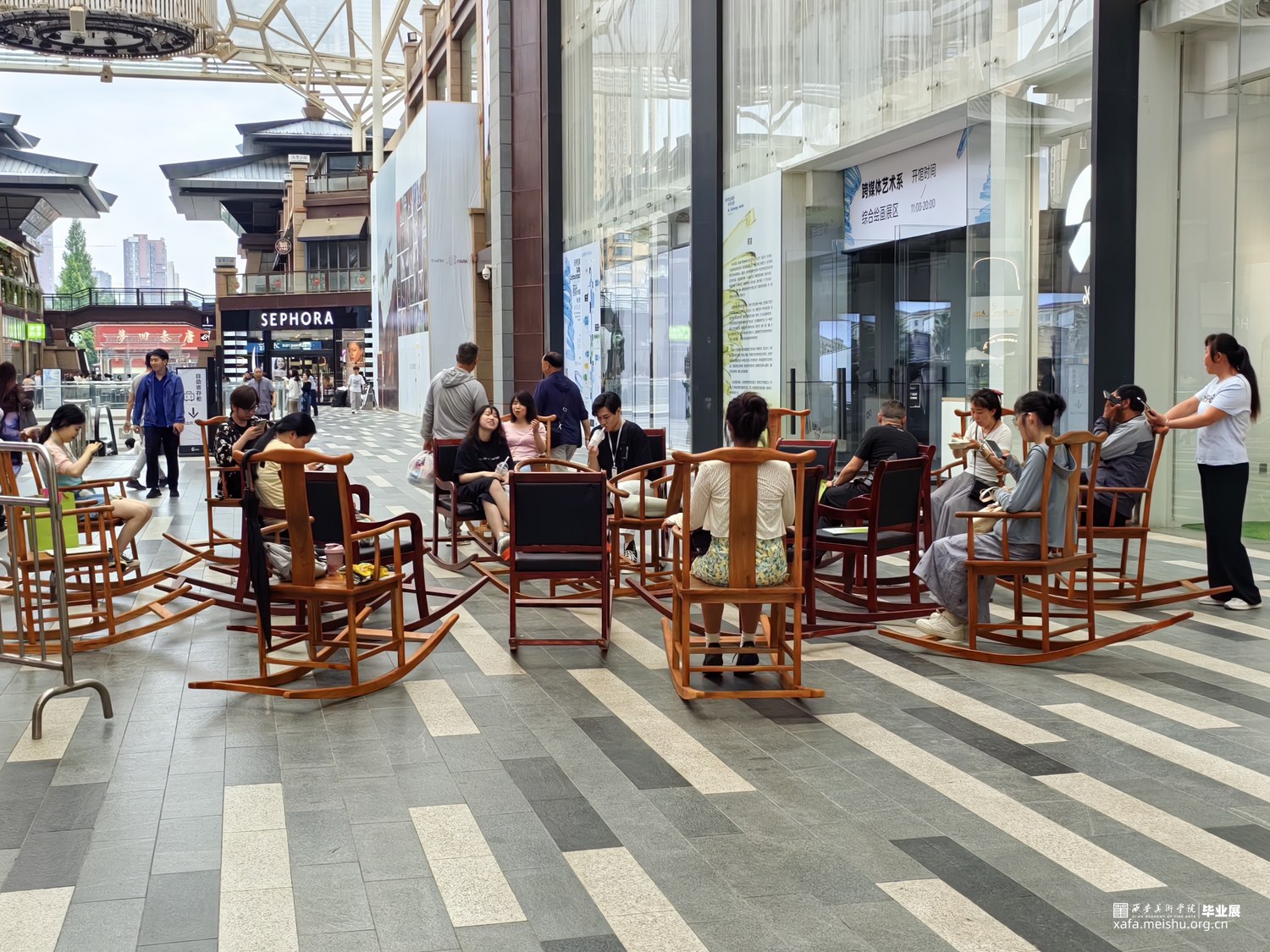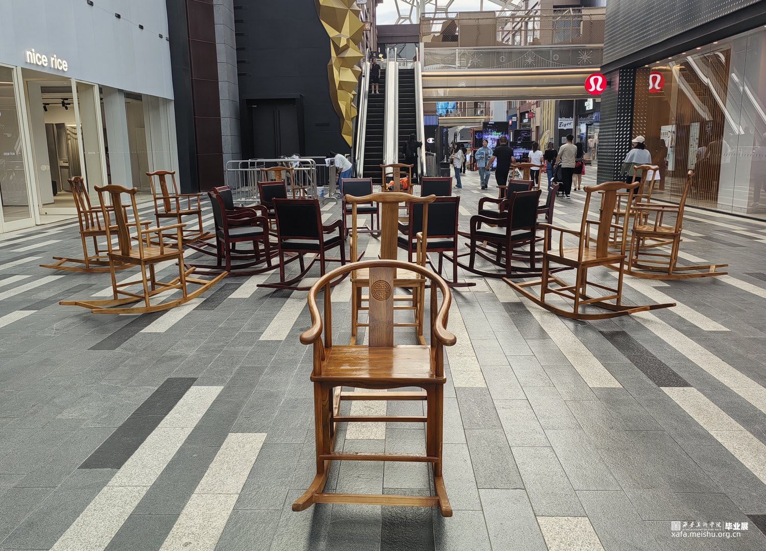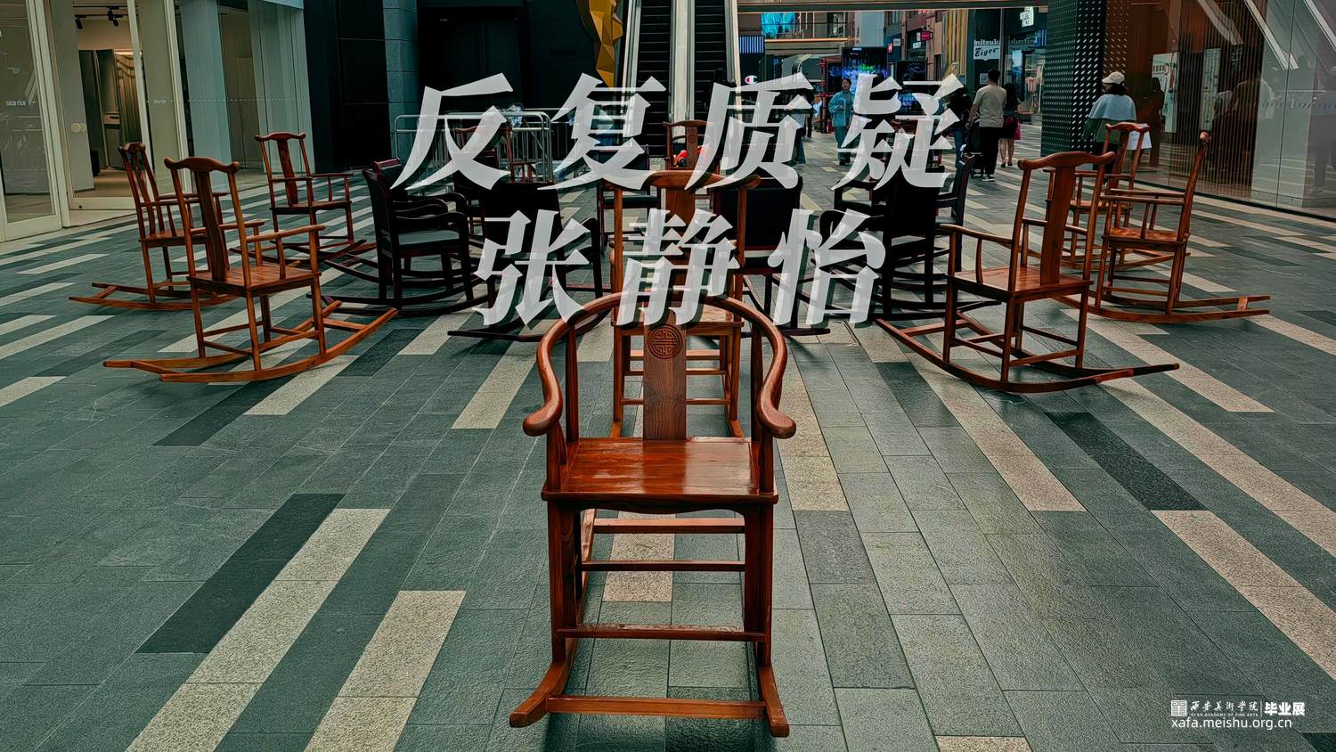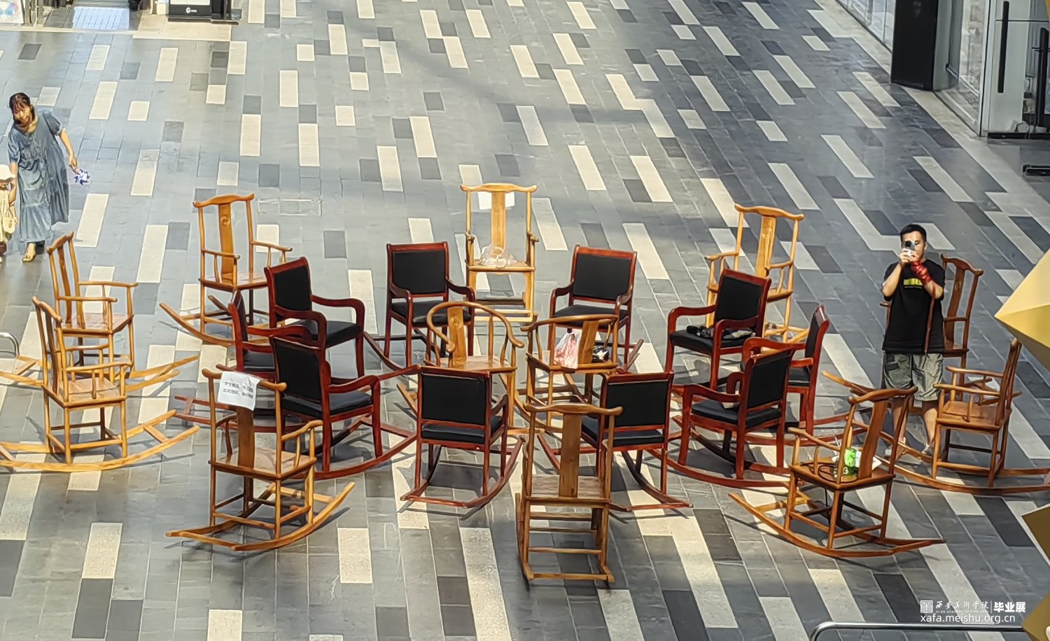 将原本隐含身份的椅子变为观众参与、娱乐的方式,打破平衡、稳定性的同时消解椅子固有的身份属性。反复的摇晃,反复的质疑,圆环阵列排布下,椅子与椅子错落、交响,摇曳的体感与游戏变成了一种作为质疑的方式。