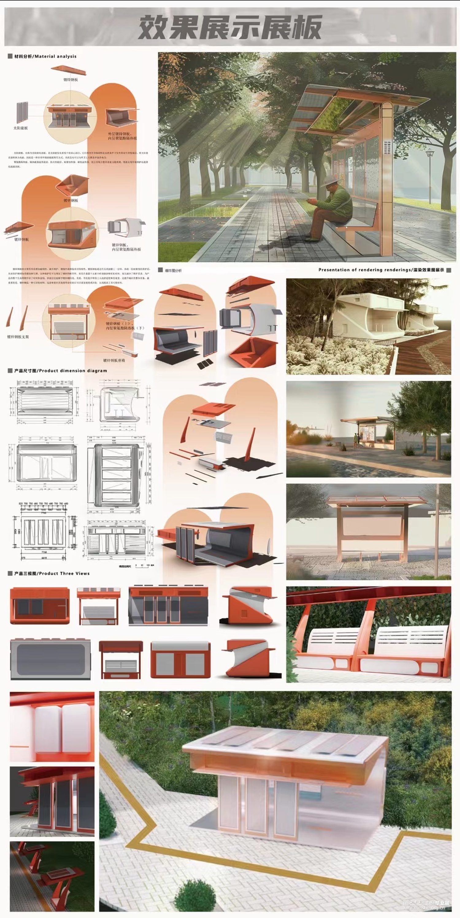 本作品共包括三件城市街具:带顶的亭子、休息盒子和展示亭。这些街具采用橙白配色,给城市增添了一抹亮丽的色彩,同时圆润的造型也更具亲和力。