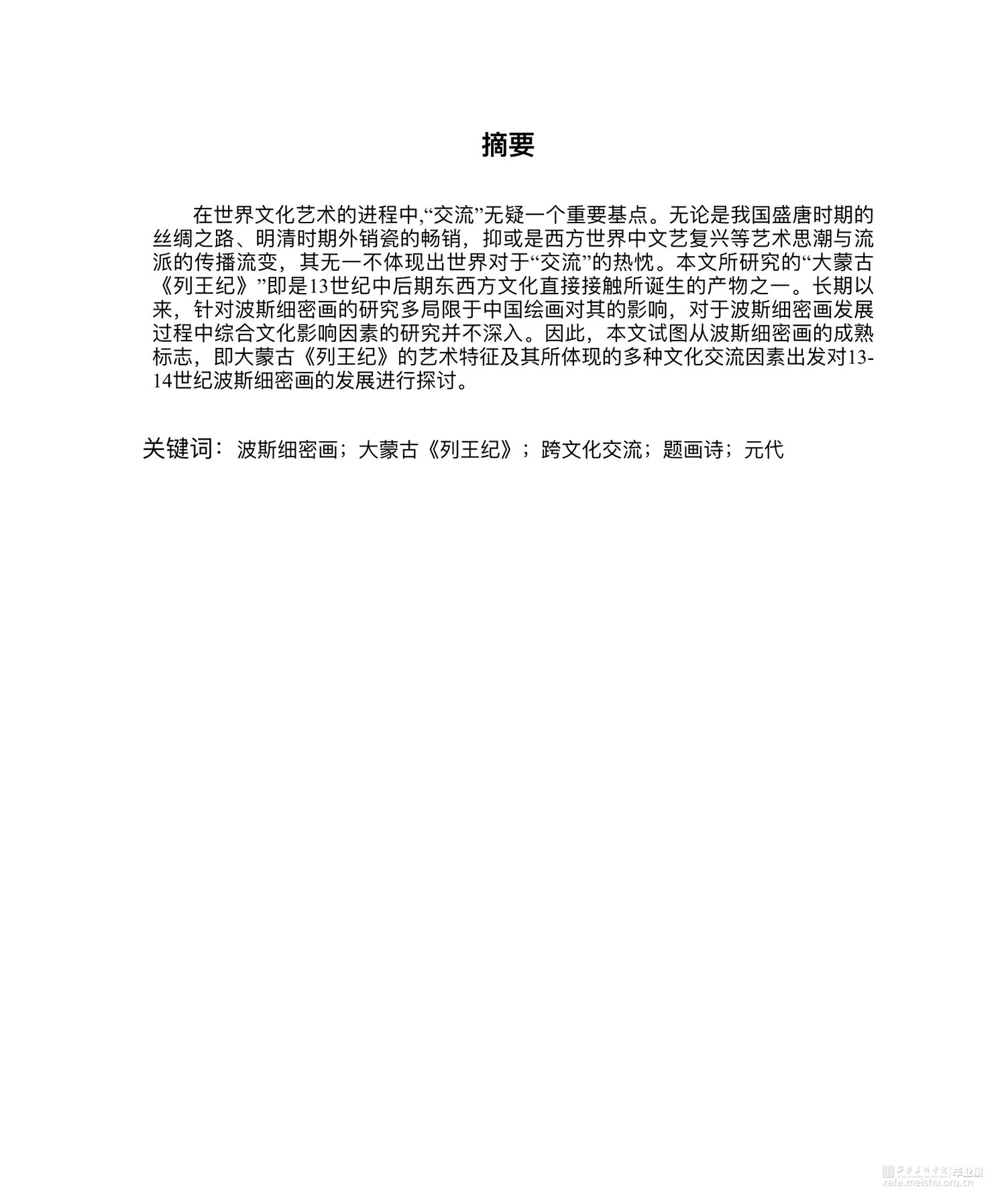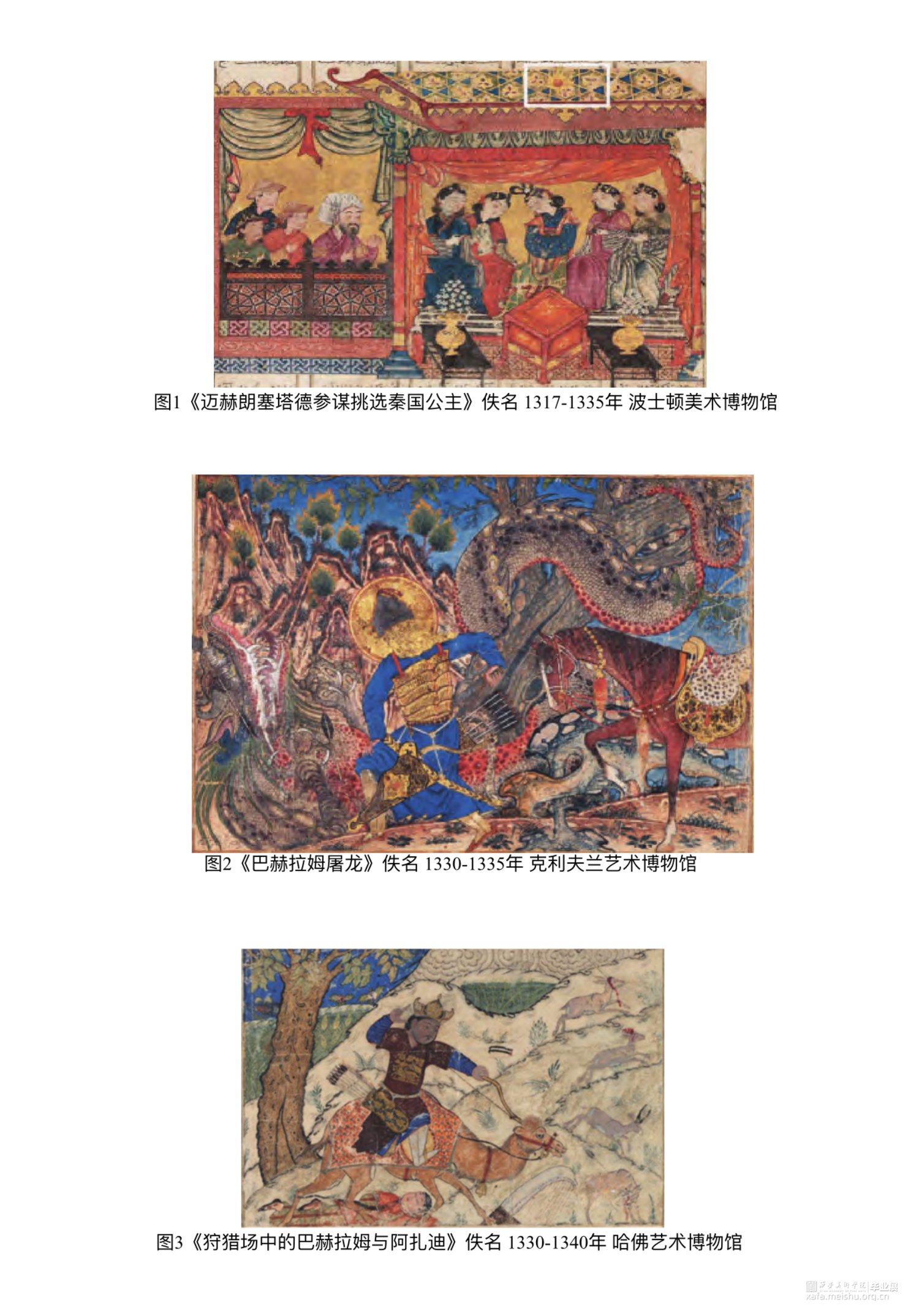 在世界文化艺术的进程中,“交流”无疑一个重要基点。无论是我国盛唐时期的丝绸之路、明清时期外销瓷的畅销,抑或是西方世界中文艺复兴等艺术思潮与流派的传播流变,其无一不体现出世界对于“交流”的热忱。本文所研究的“大蒙古《列王纪》”即是13世纪中后期东西方文化直接接触所诞生的产物之一。长期以来,针对波斯细密画的研究多局限于中国绘画对其的影响,对于波斯细密画发展过程中综合文化影响因素的研究并不深入。因此,本文试图从波斯细密画的成熟标志,即大蒙古《列王纪》的艺术特征及其所体现的多种文化交流因素出发对13-14世纪波斯