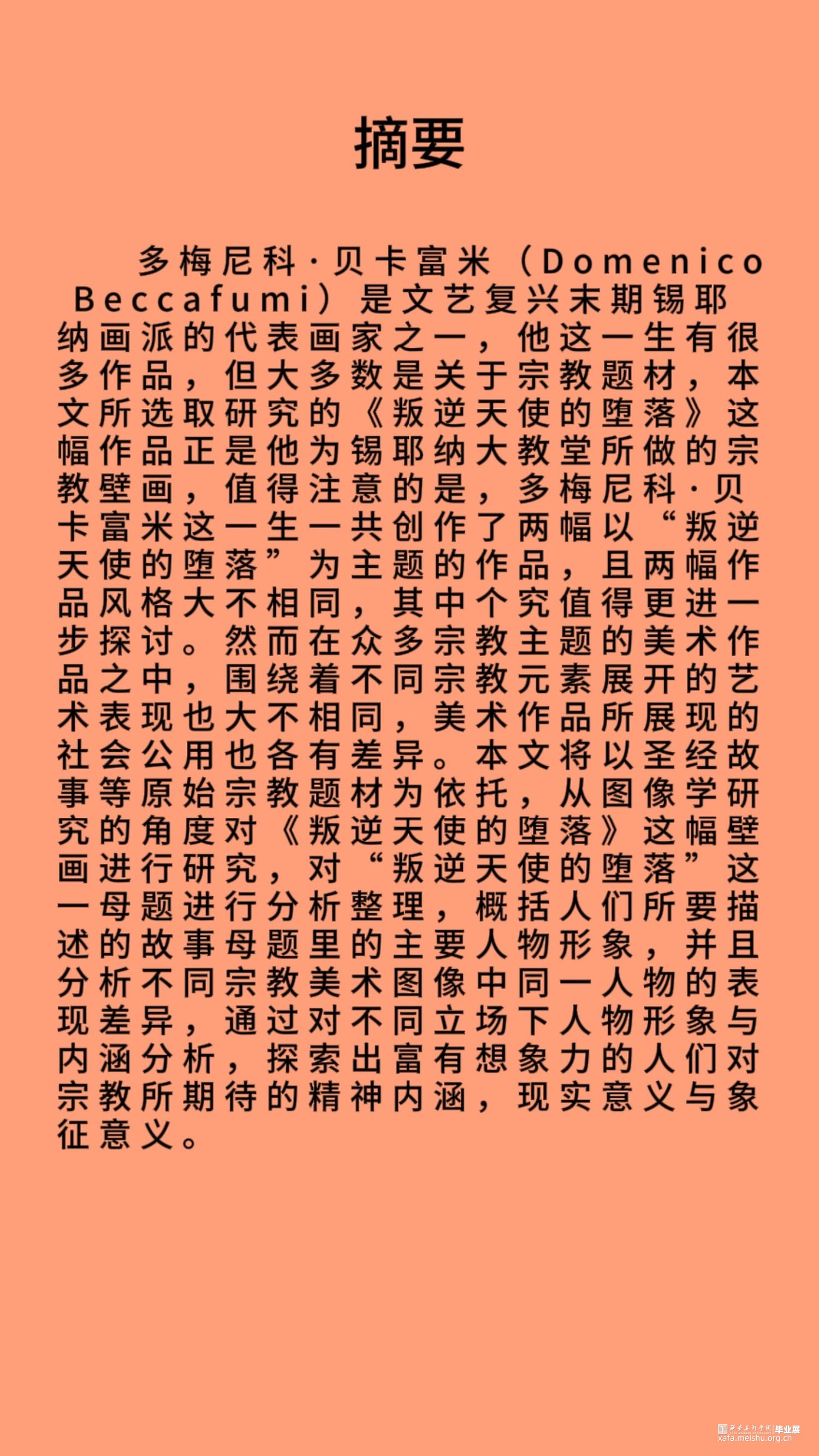 多梅尼科·贝卡富米(Domenico Beccafumi)是文艺复兴末期锡耶纳画派的代表画家之一,他这一生有很多作品,但大多数是关于宗教题材,本文所选取研究的《叛逆天使的堕落》这幅作品正是他为锡耶纳大教堂所做的宗教壁画,值得注意的是,多梅尼科·贝卡富米这一生一共创作了两幅以“叛逆天使的堕落”为主题的作品,且两幅作品风格大不相同,其中个究值得更进一步探讨。然而在众多宗教主题的美术作品之中,围绕着不同宗教元素展开的艺术表现也大不相同,美术作品所展现的社会公用也各有差异。本文将以圣经故事等原始宗教题材为依托,从图像学研究的角度对《叛逆天使的堕落》这幅壁画进行研究,对“叛逆天使的堕落”这一母题进行分析整理,概括人们所要描述的故事母题里的主要人物形象,并且分析不同宗教美术图像中同一人物的表现差异,通过对不同立场下人物形象与内涵分析,探索出富有想象力的人们对宗教所期待的精神内涵,现实意义与象征意义。