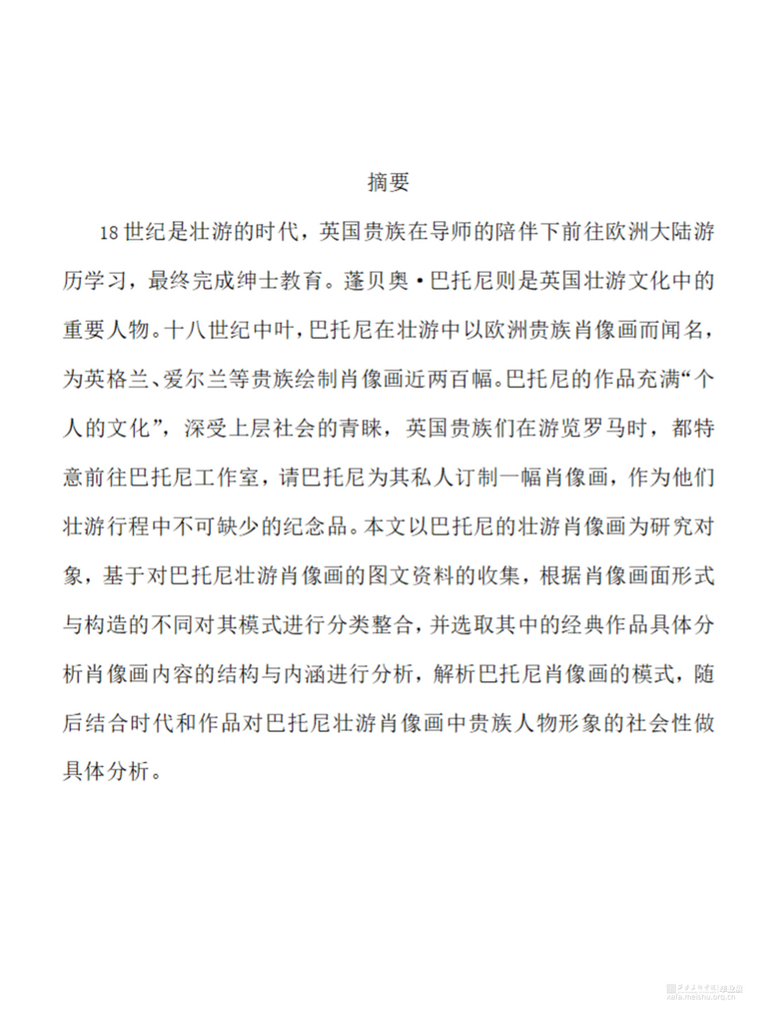 本文主要采用图像学研究法和文献研究法,巴托尼肖像画除去被私人收藏的作品,其余大部分被藏于欧洲各个博物馆、美术馆中,通过对现有图像资料的充分收集,建立起相关资料库,从而对肖像画的画面结构等进行结构分析,这里同时也结合了归纳总结法进行研究。文献分析法是通过图书馆等渠道查阅与壮游和巴托尼肖像画有关的各类资料,阅读查询大量论文、期刊等,在分类整合的基础之上围绕研究主体进行深入思考,为本文研究奠定理论基础。