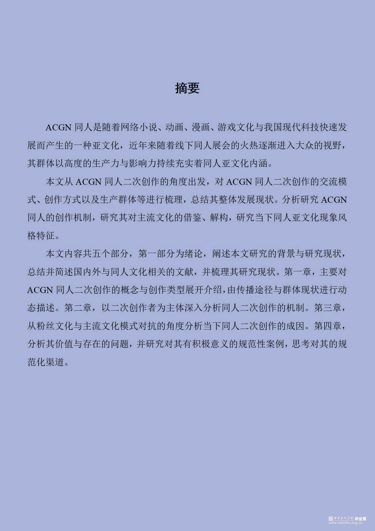 随着自媒体产业的快速发展,中国的动漫与游戏产业进入了蓬勃发展的阶段,伴随着各类动漫与游戏产生的爱好者群体也在不断地扩大。这类群体在网络信息高度发展的条件下,为自己喜欢的动漫与游戏作品进行二次衍生创作并且传播,这类依据ACGN原作品进行衍生创作的行为被称为同人创作。在网络媒介的高速发展下,同人创作的传播变得十分迅速与便利,同人圈内的知名创作者发布作品数小时内,就可以获得数千甚至上万的转发与阅读量,全国各地也纷纷开展诸多线下同人展会,部分同人作品的交易量能达到数千,由此可见,ACGN同人在国内将愈发普及,是十分具有活力与发展潜力的行业。同时,ACGN同人在发展中也伴随诸多问题,例如爱好者群体盲目跟风、同人作品版权得不到保护、部分同人作品有低俗化倾向等。